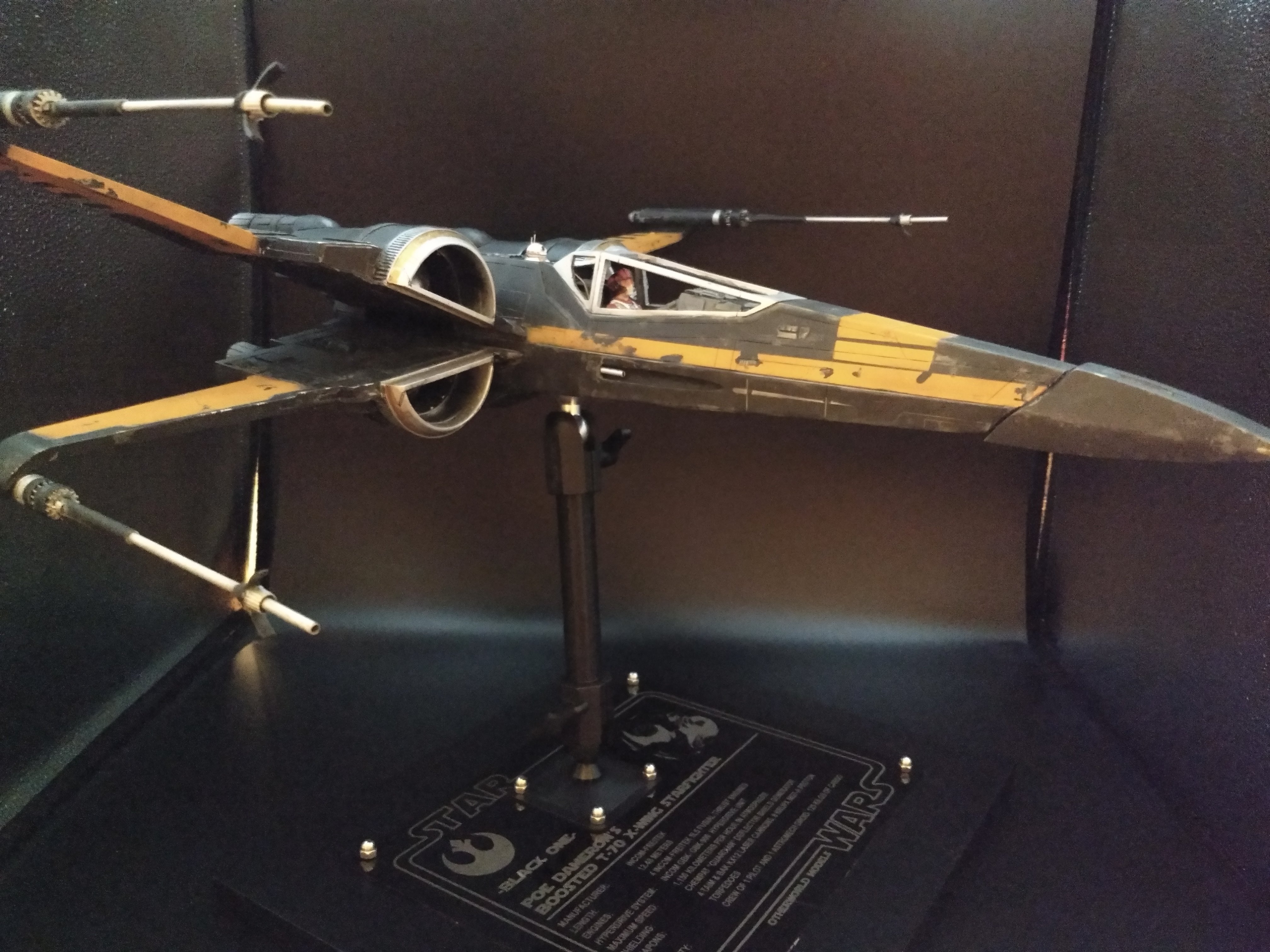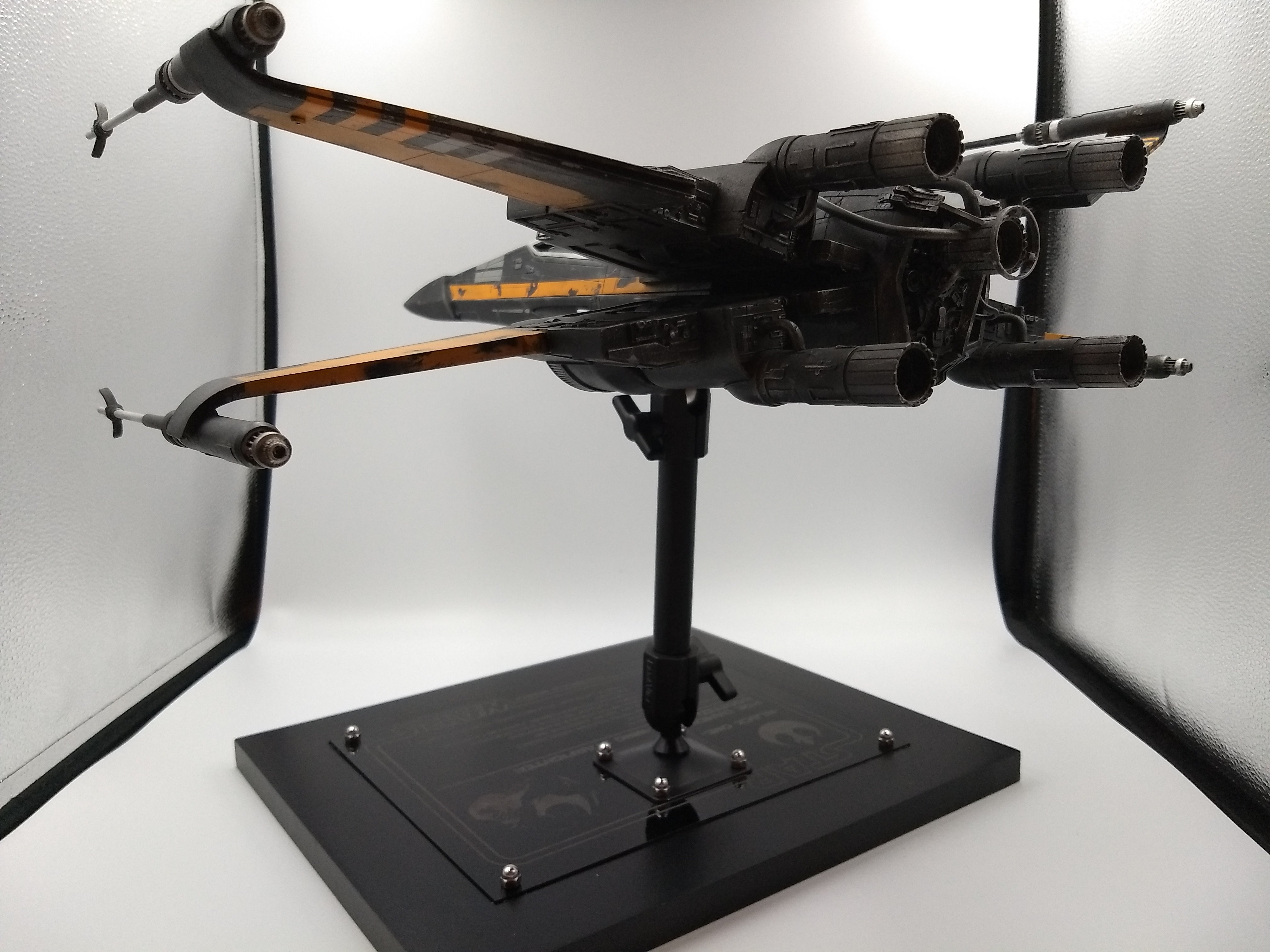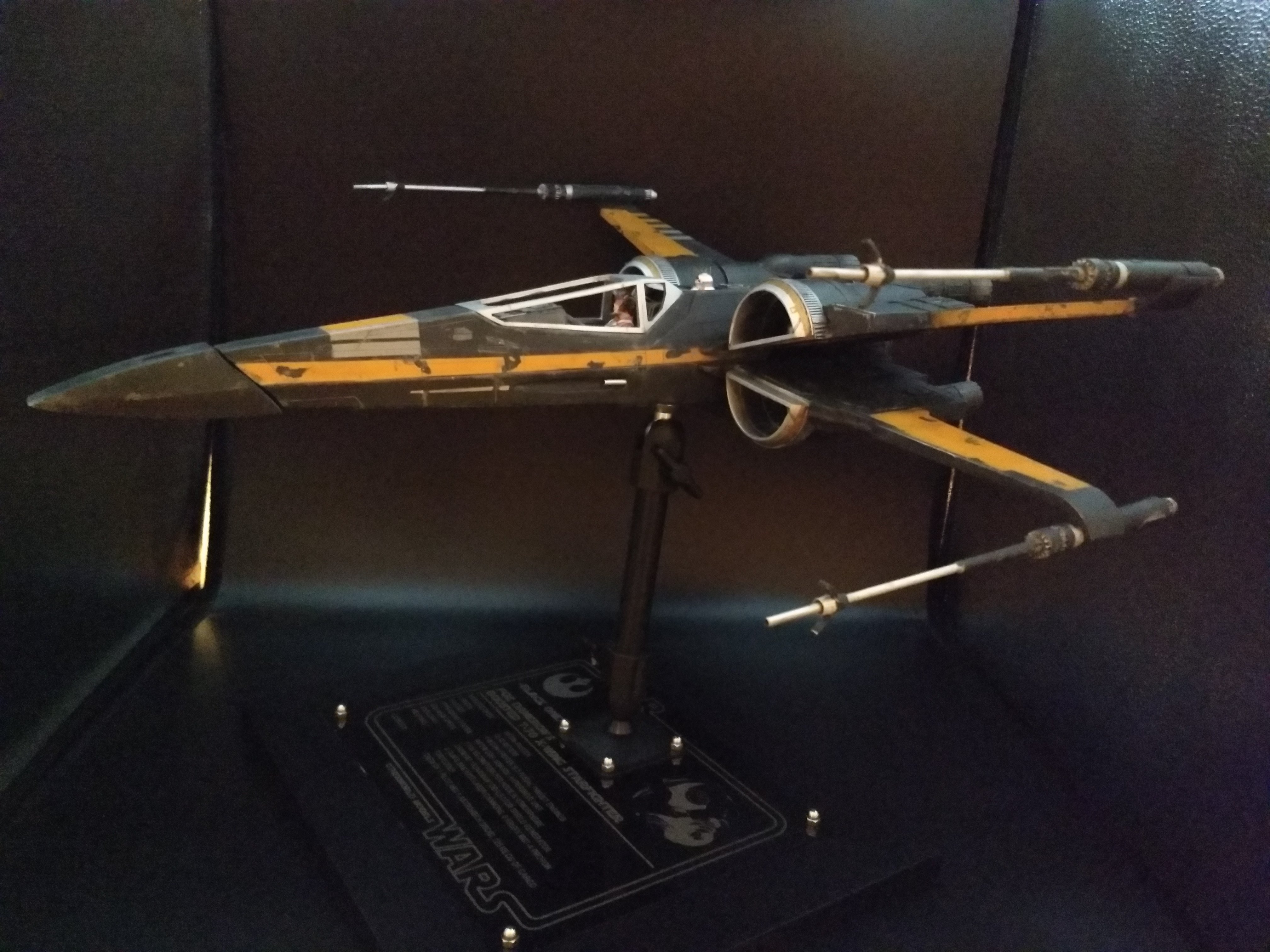 This is the Poe Dameron “Boosted Engine” 1/24 X-Wing from The Last Jedi. It was built from the amazing KORBANTH Kit! The plaque is engraved by Laserfire creations and mounted to the base by myself. I added the rods in the torpedo tubes and extended the lasers by an inch and a half. I also made my own decals for BB8, Poe’s helmet markings, and the rings around the intakes.