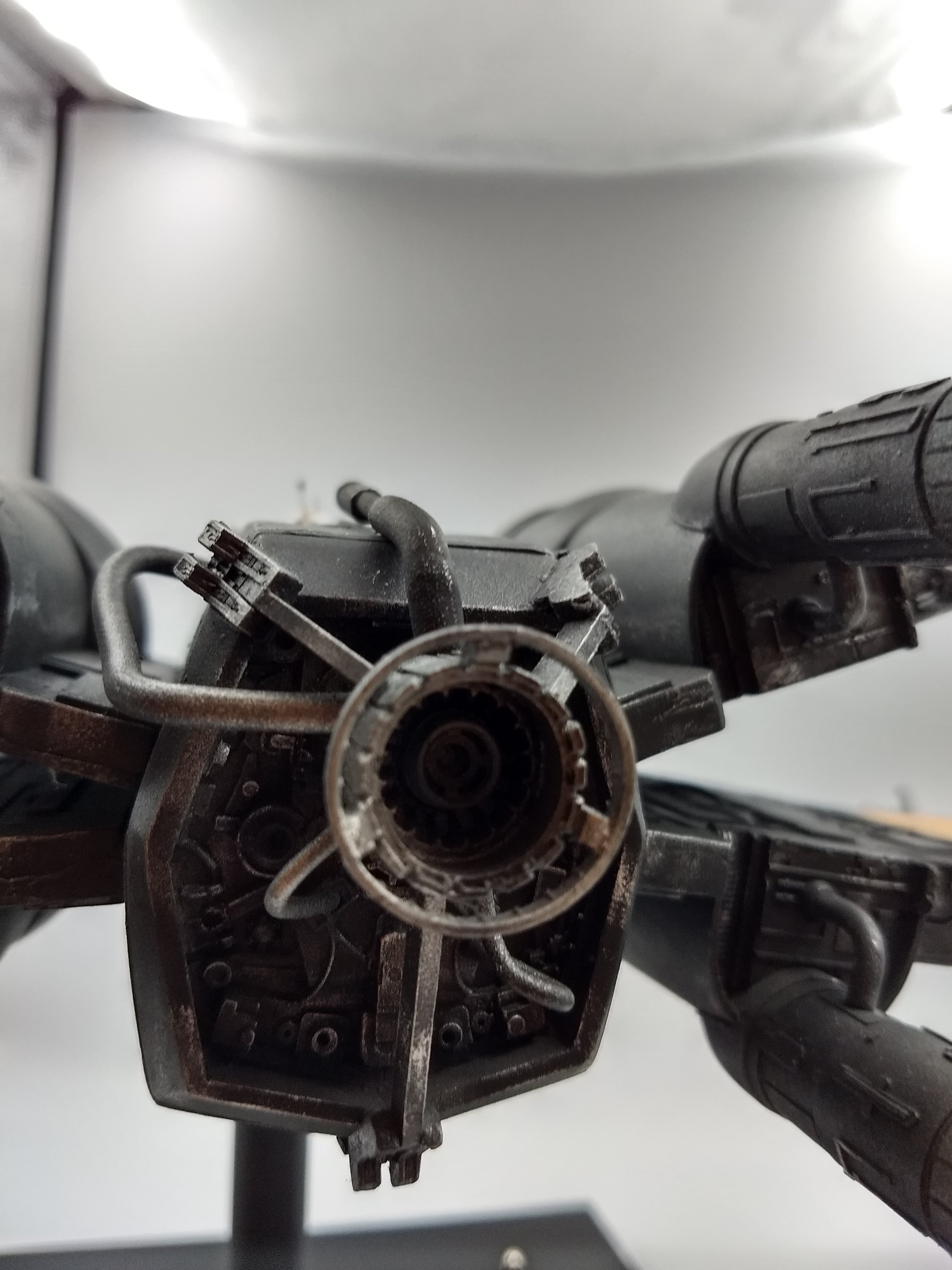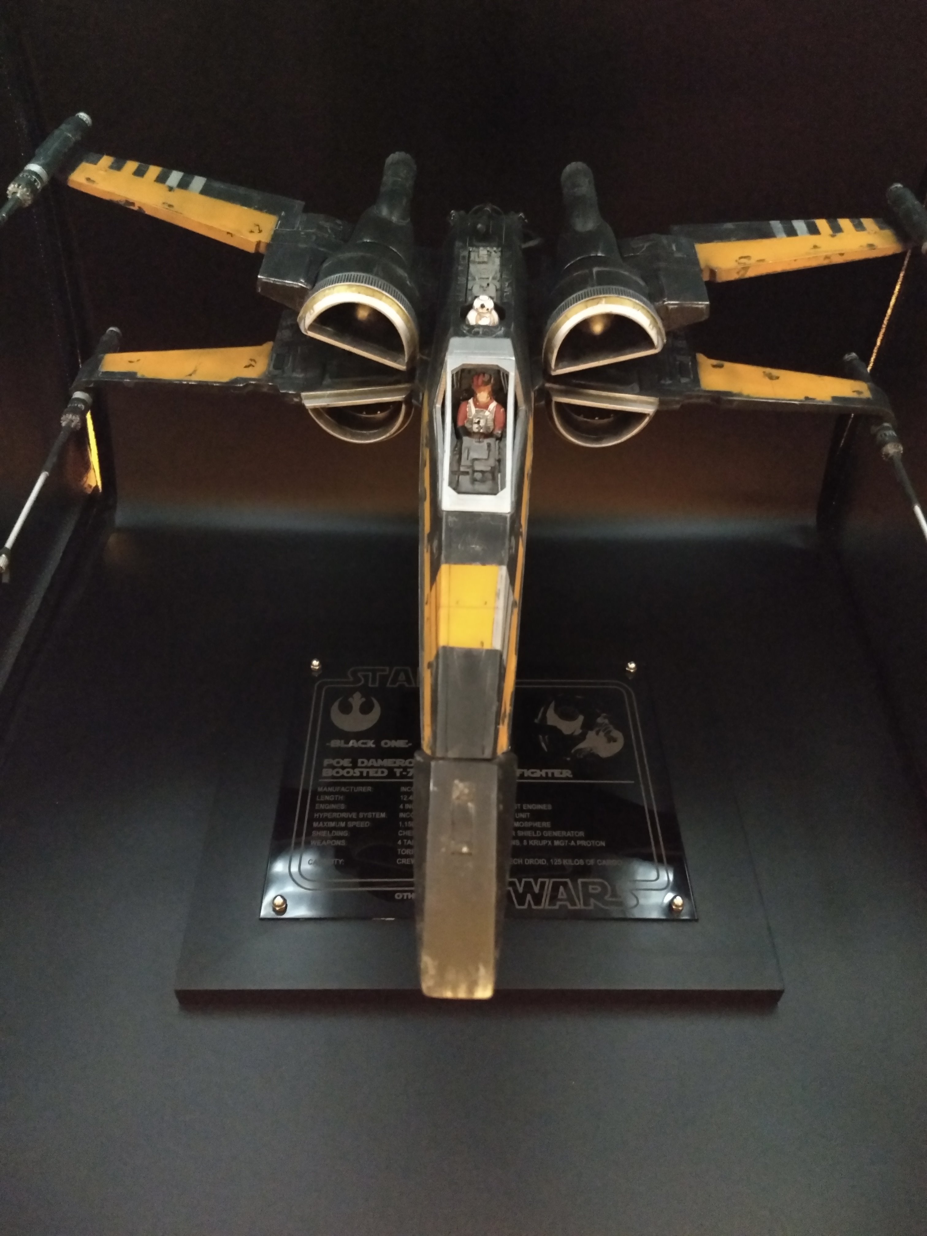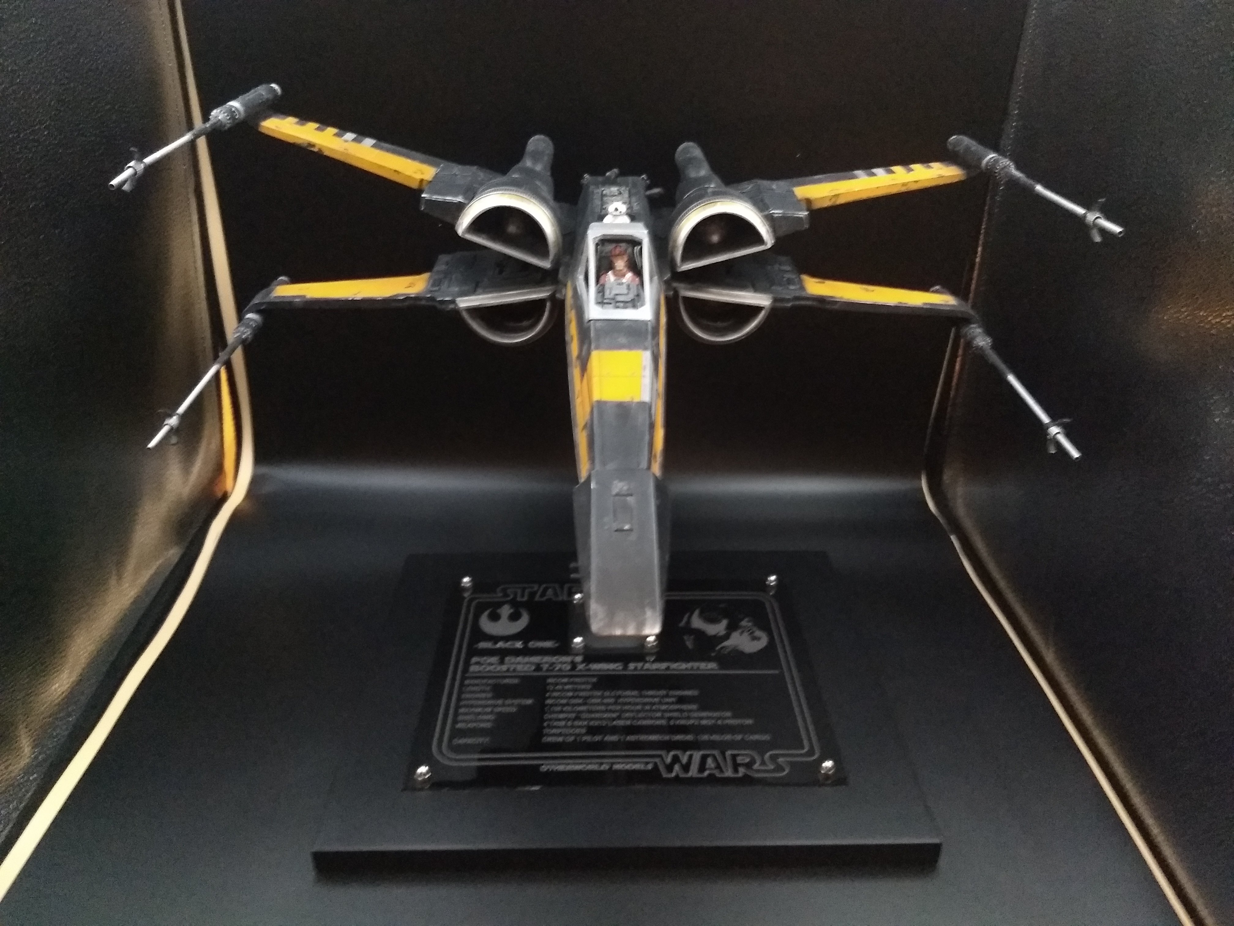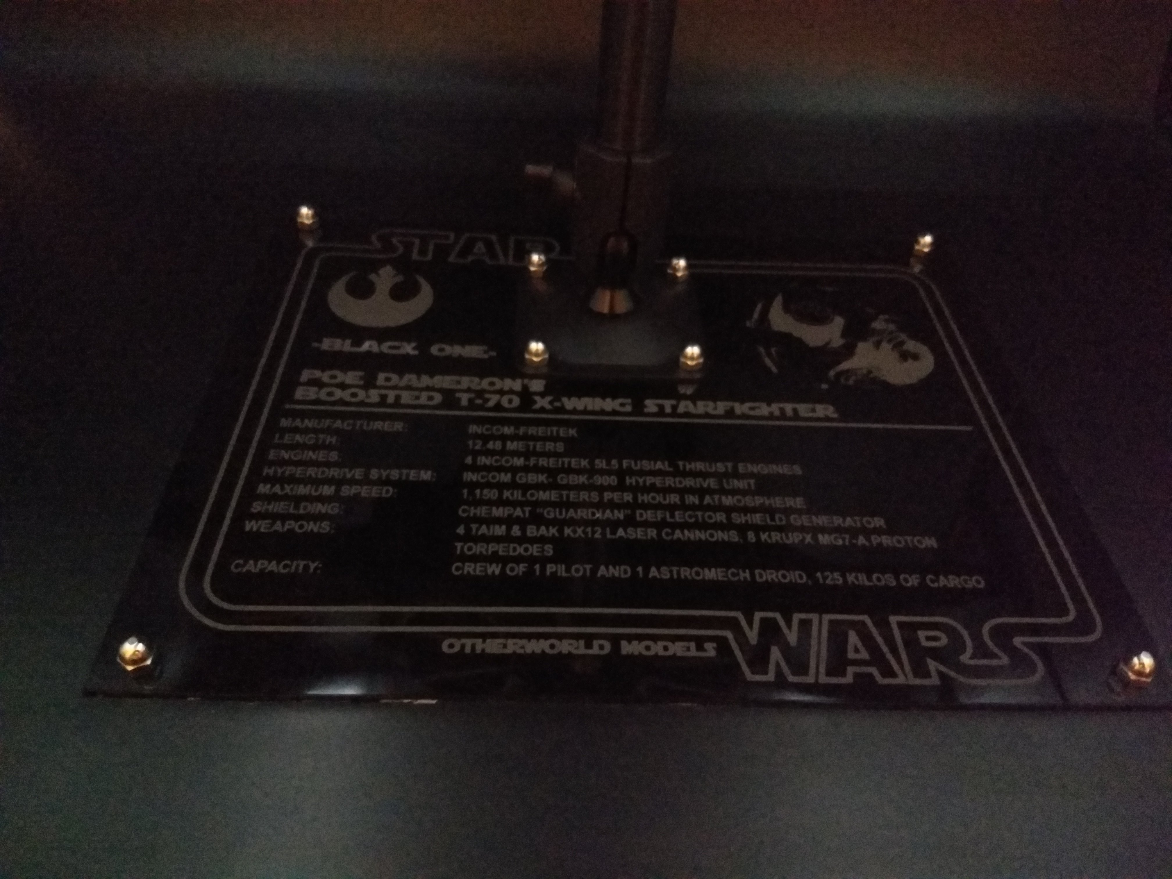 This is the Poe Dameron “Boosted Engine” 1/24 X-Wing from The Last Jedi. It was built from the amazing KORBANTH Kit! The plaque is engraved by Laserfire creations and mounted to the base by myself. I added the rods in the torpedo tubes and extended the lasers by an inch and a half. I also made my own decals for BB8, Poe’s helmet markings, and the rings around the intakes.