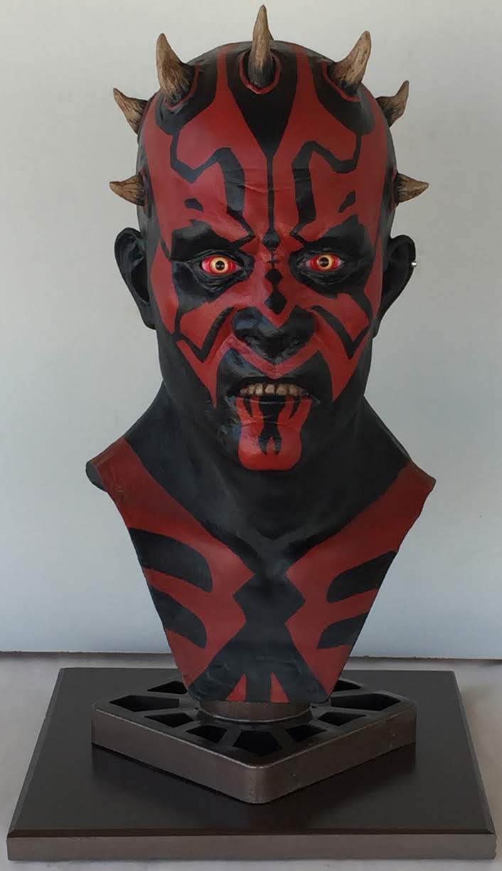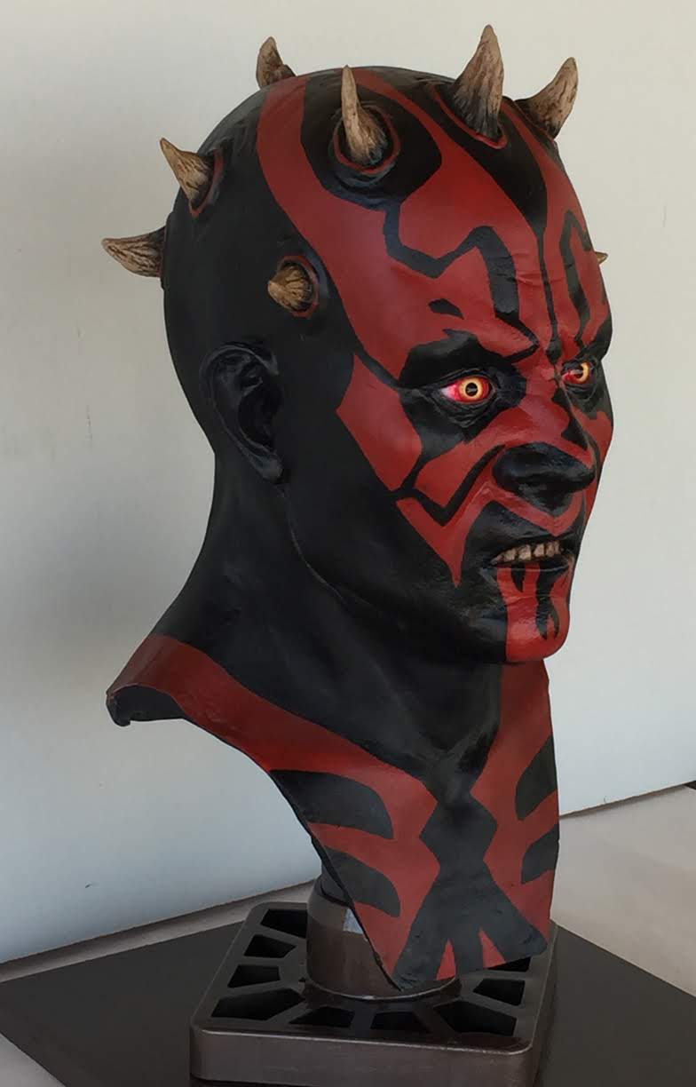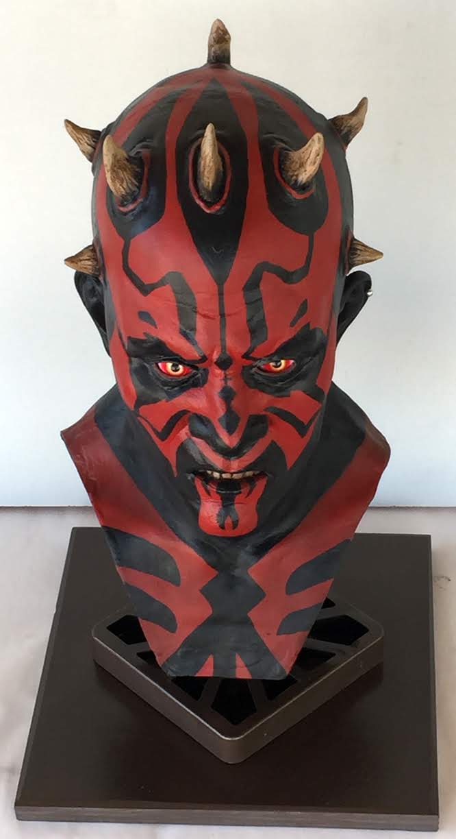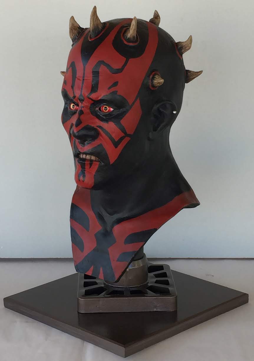 This is a Life Sized Bust of Darth Maul. It is a hollow resin/fiberglass bust with custom painted “glass” (actually acrylic) eyes. The bust is about 17″ tall from front of chest to top of horn. On the stand it is about 20″ tall. See the photos of the actual item for condition details. This was a custom bust kit offered right around the time The Phantom Menace came out. I had it in storage since then and I recently took it out, painted and finished it this past week. The stand in the photos is included. The stand is wood and plastic with a PVC pipe. The bust is resting on the stand and is not permanently attached. Any questions let me know. Note: This is NOT from Sideshow.