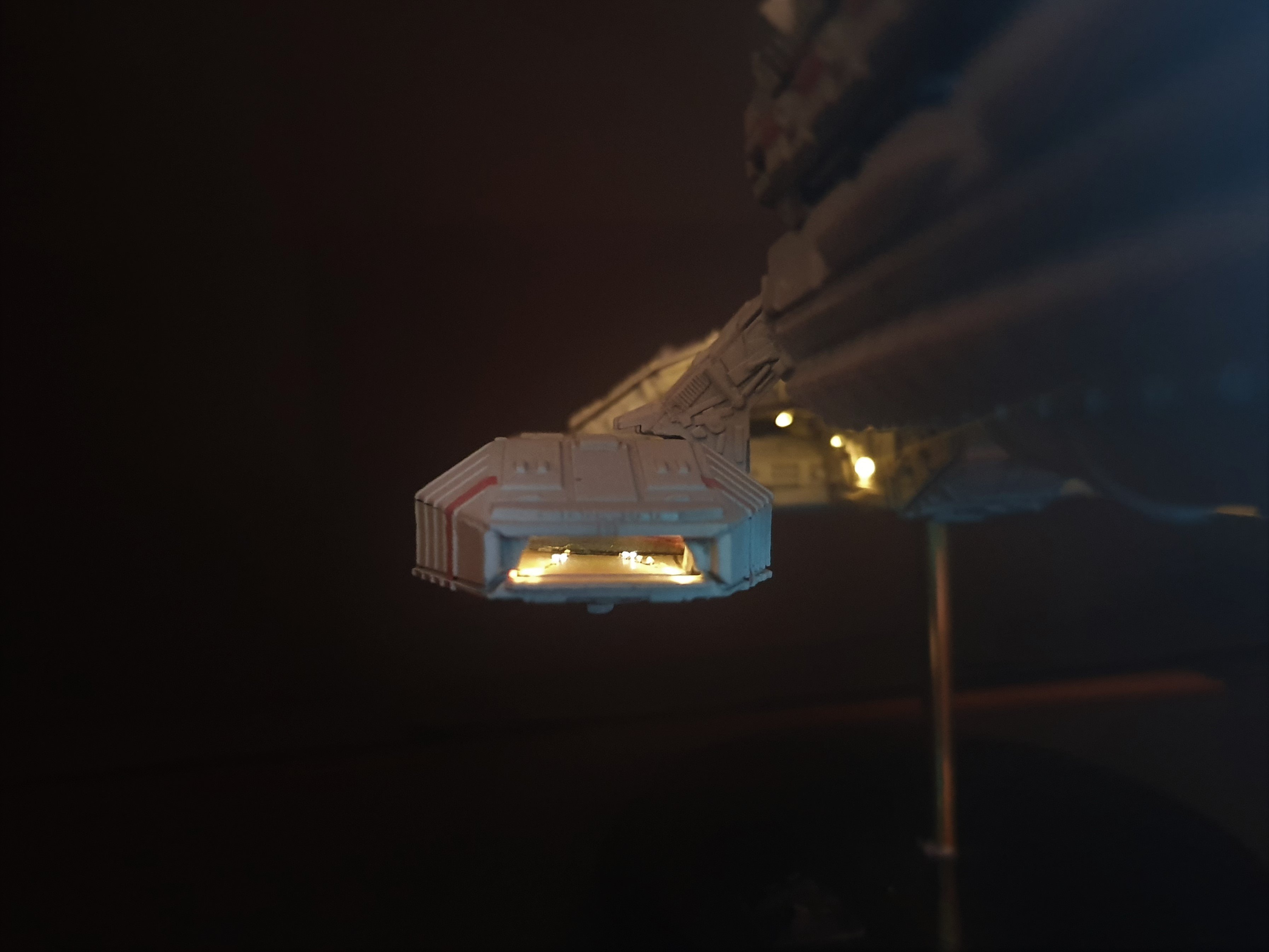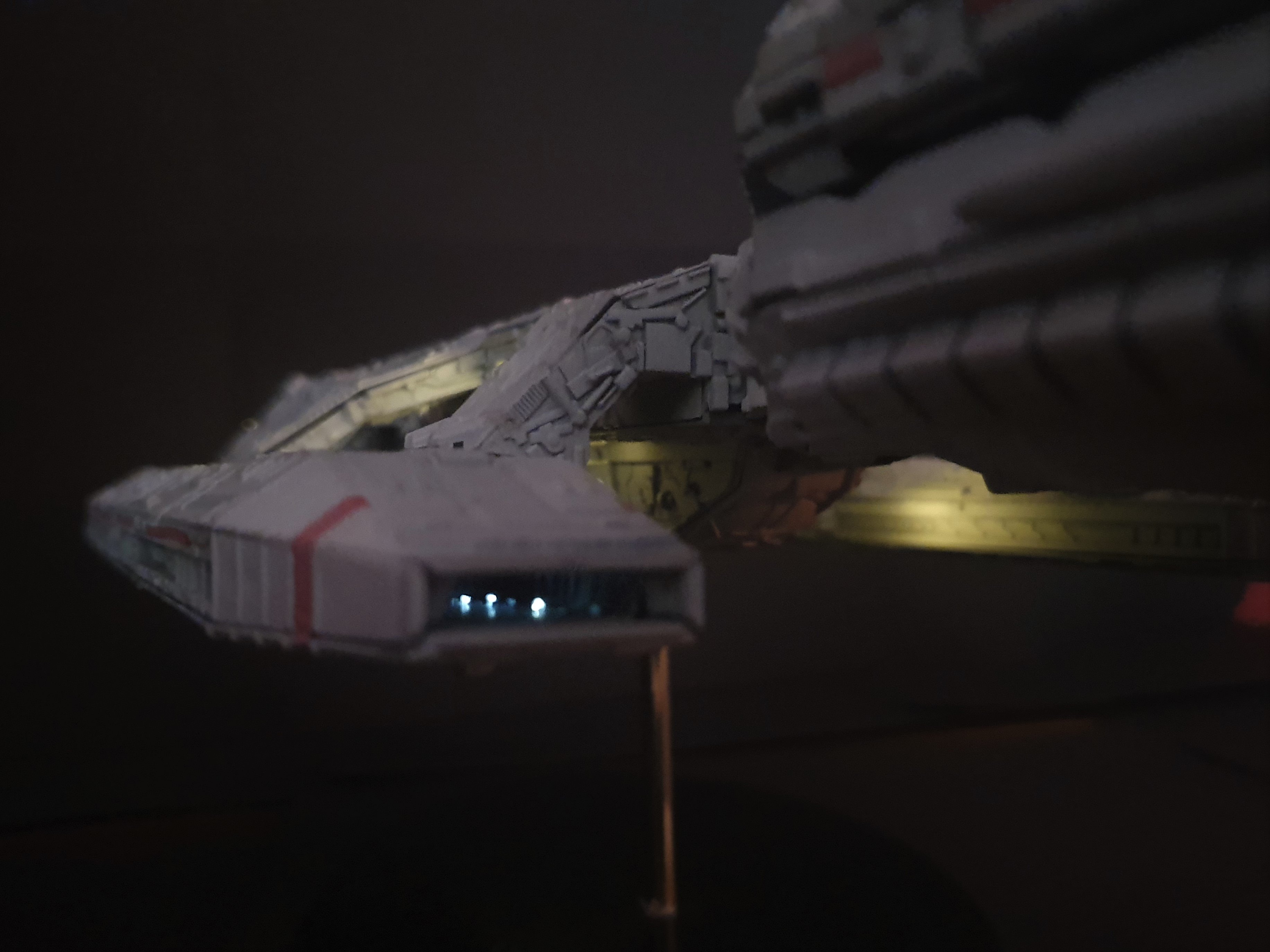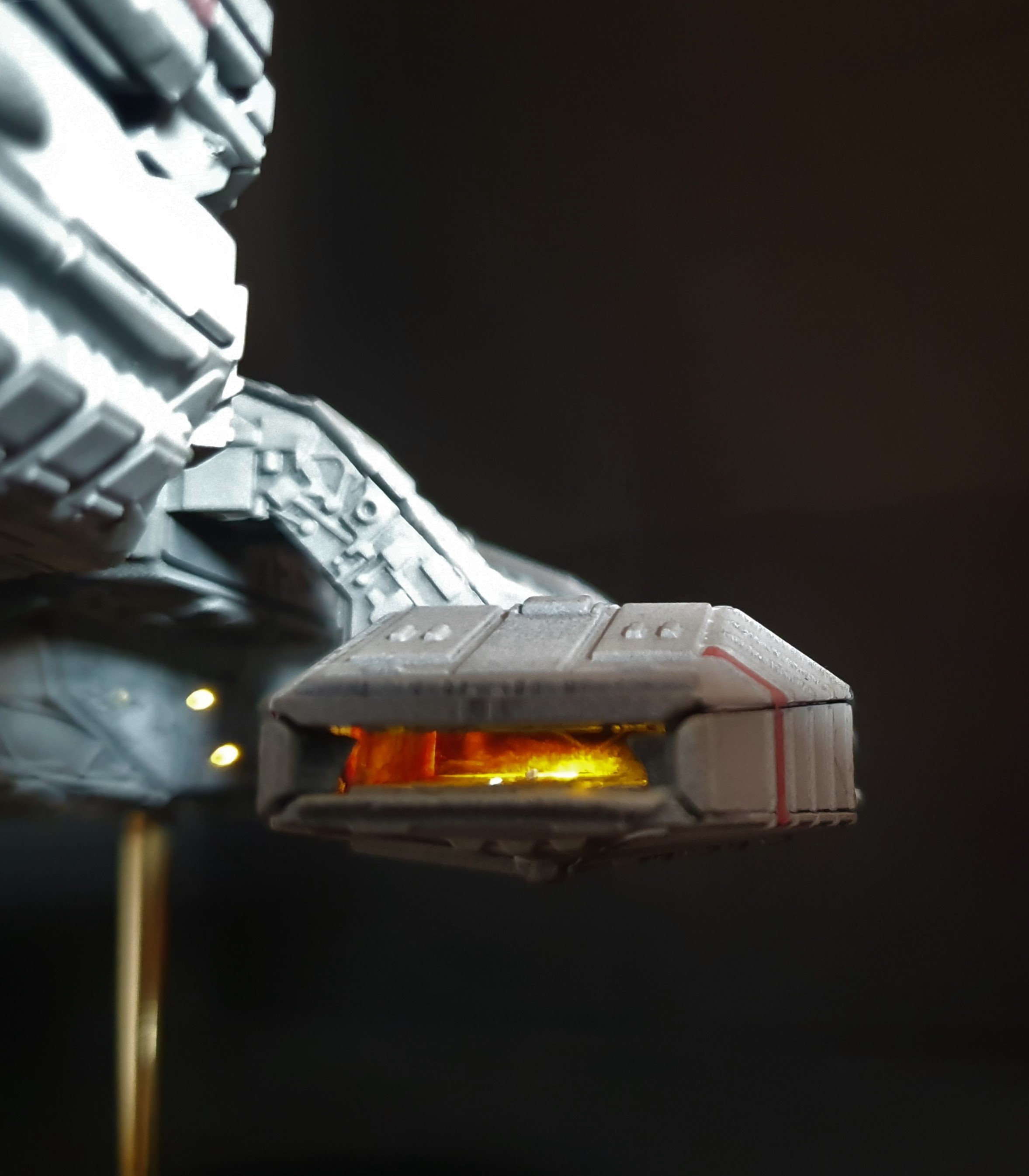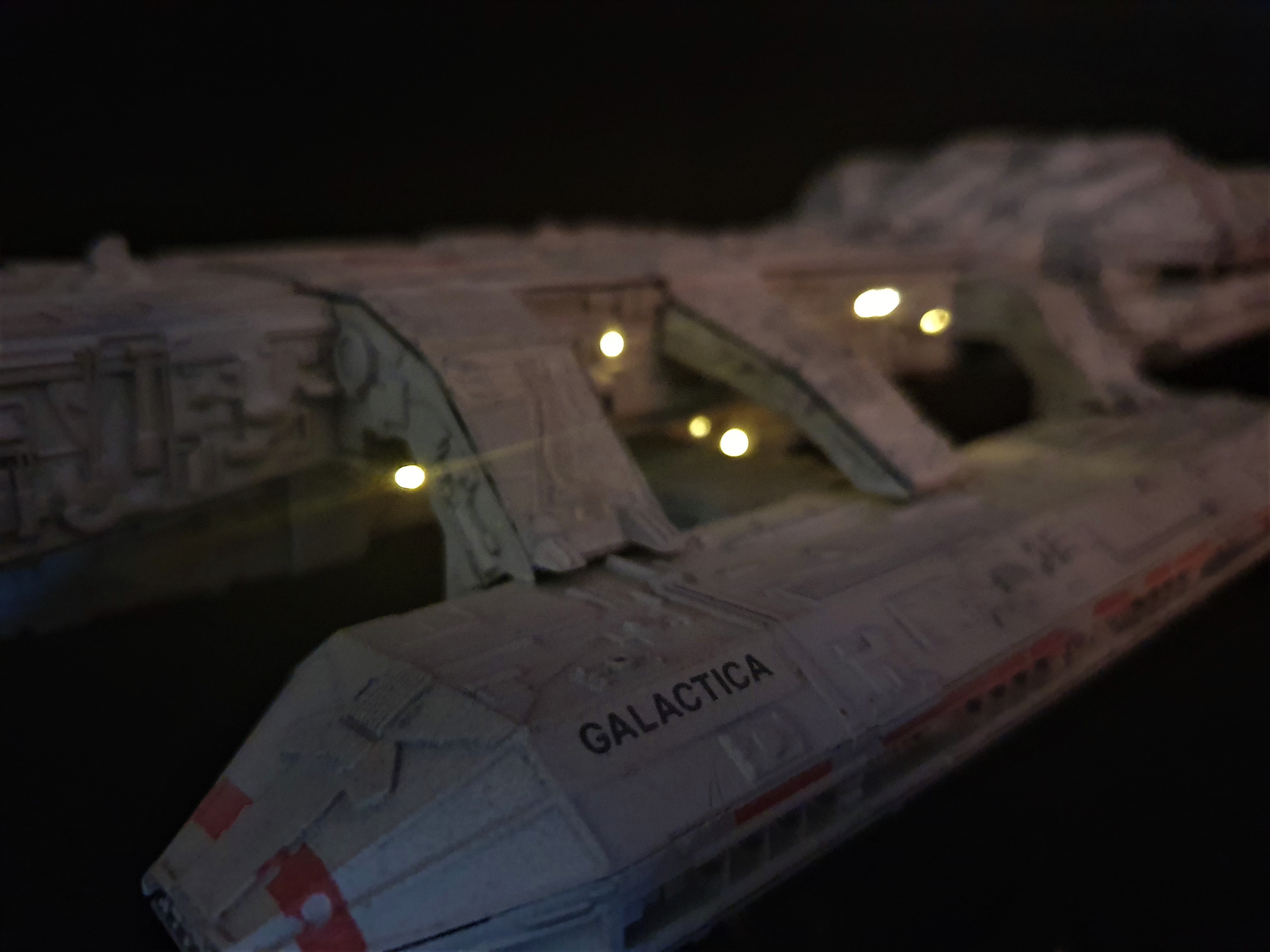 This is an old build up I did that I have just got around to finishing. It’s the Moebius Galactica. Of course this is fully lit and also has scratch built landing bays (in forced perspective) and 0.25mm fiber optics that are connected to a chaser circuit in the base. These light up in sequence simulating the landing bay lights. The lighting can be switched between just the landing bay lights and the landing lights. The main lights are also separate and there is a dimmer switch in the base to turn the intensity of the lights down should anyone wish.