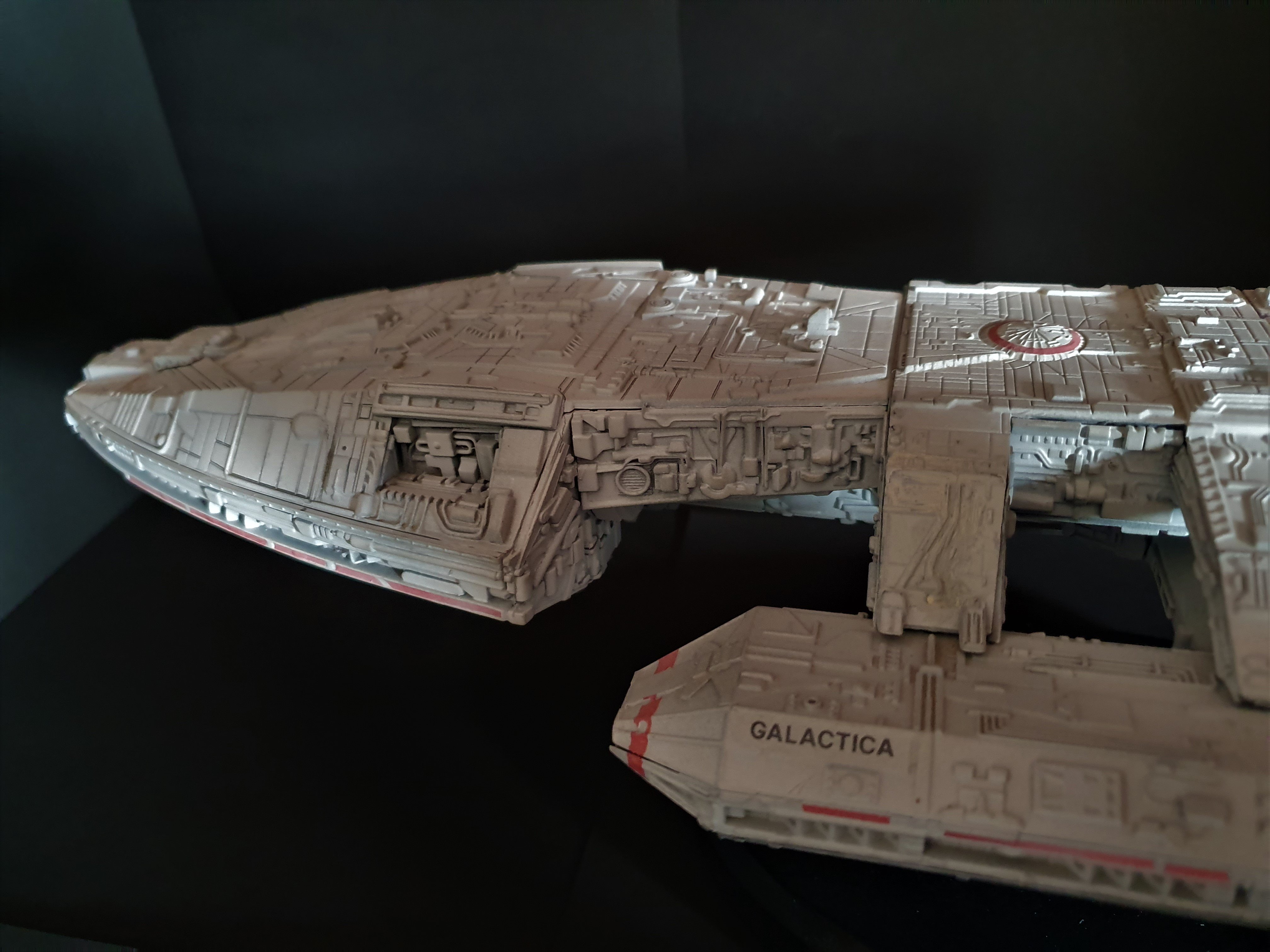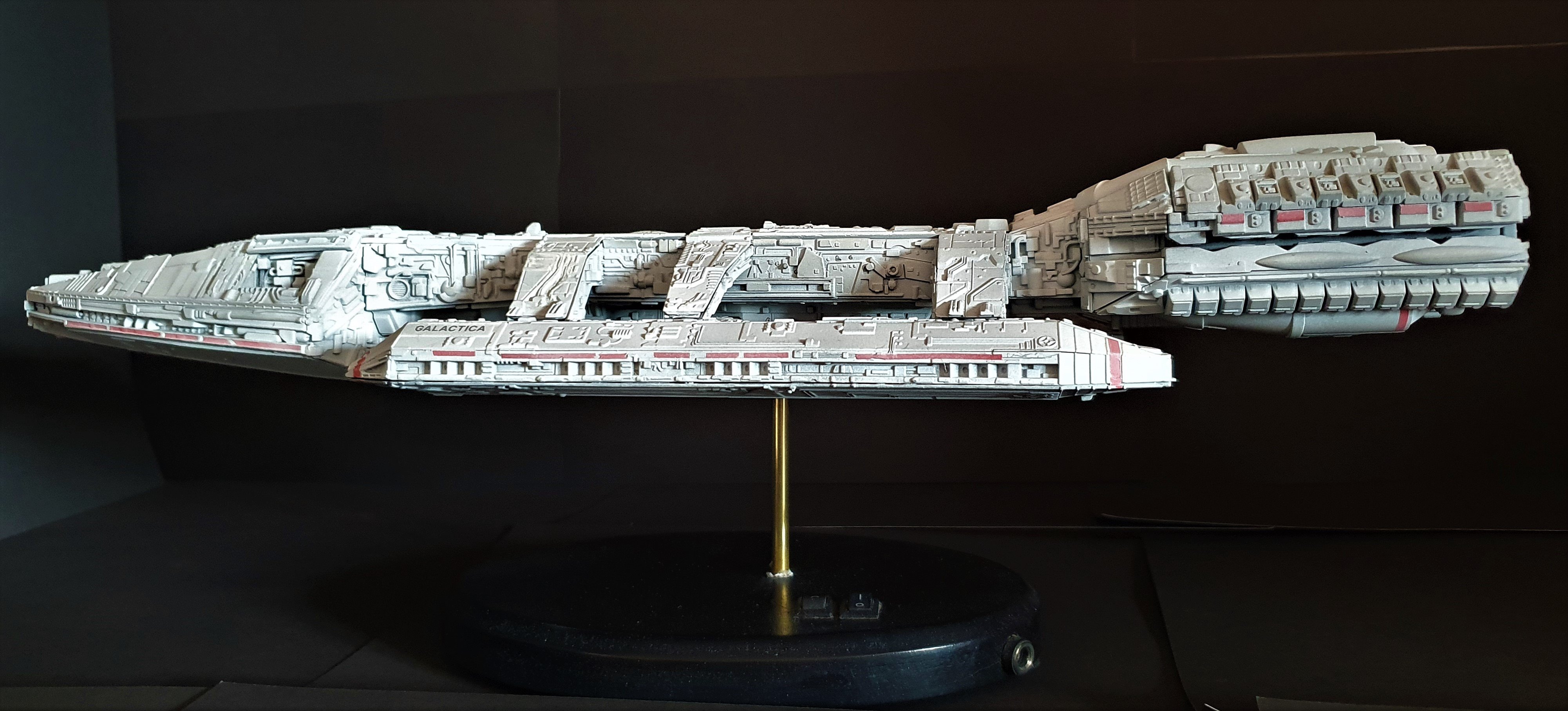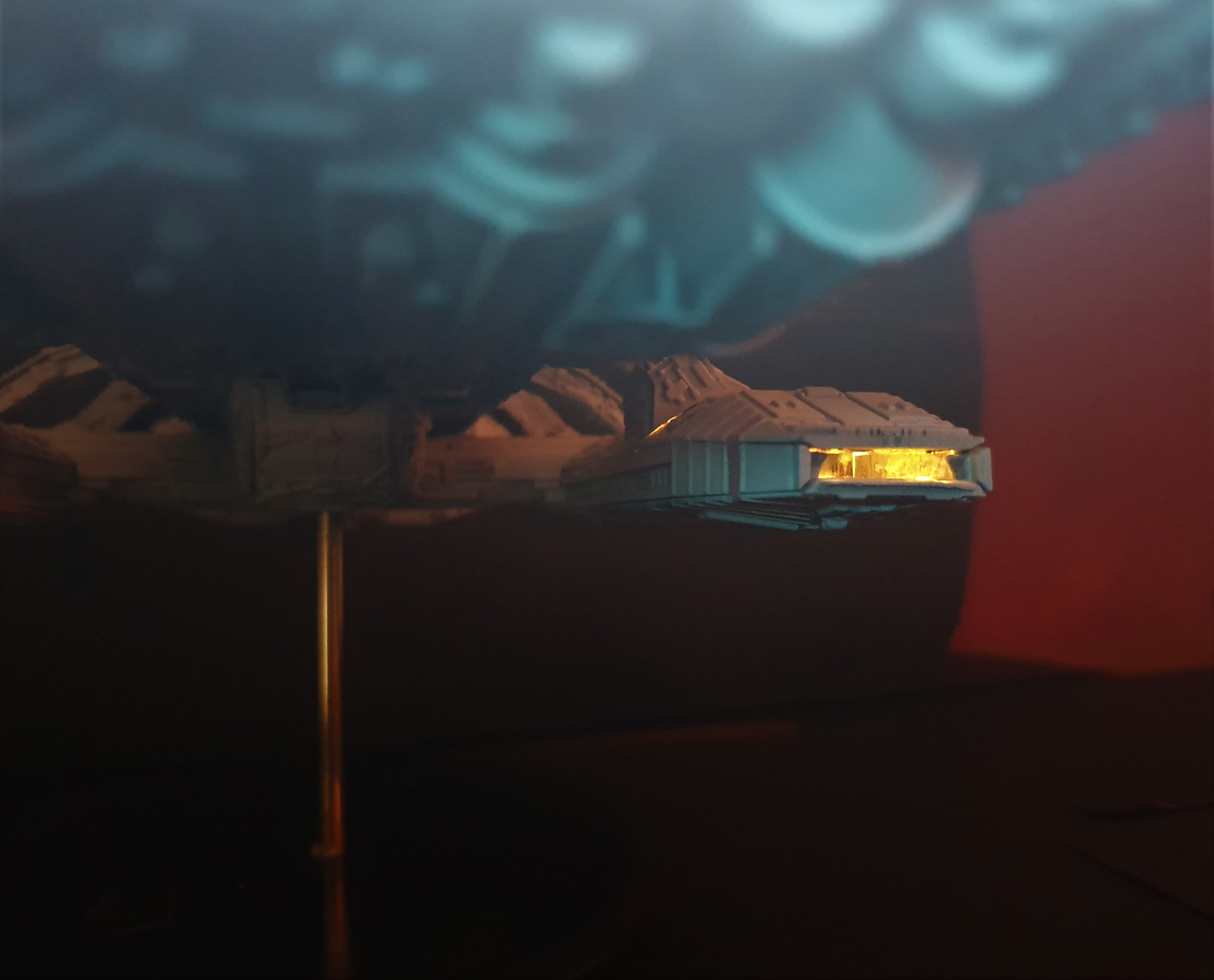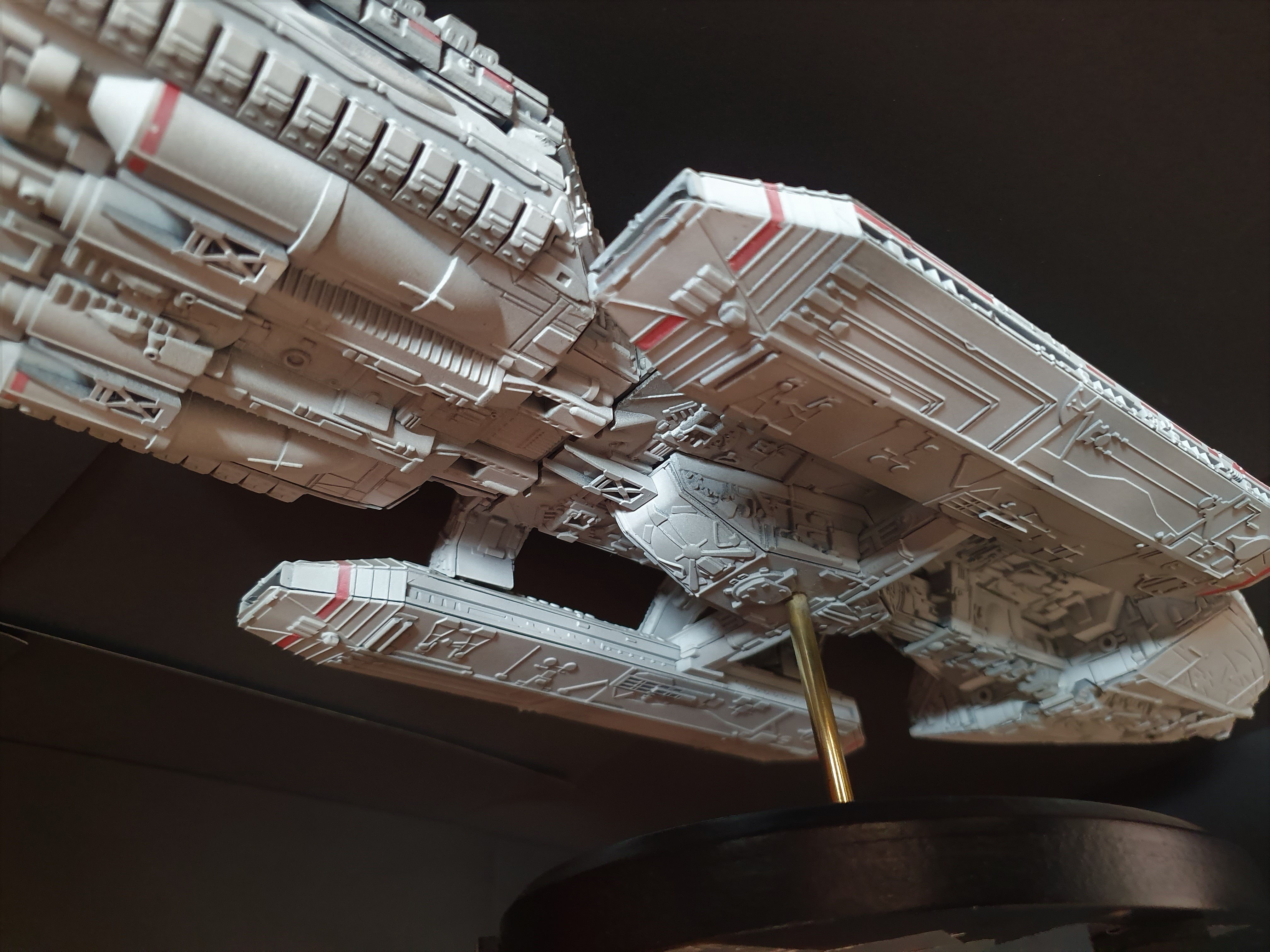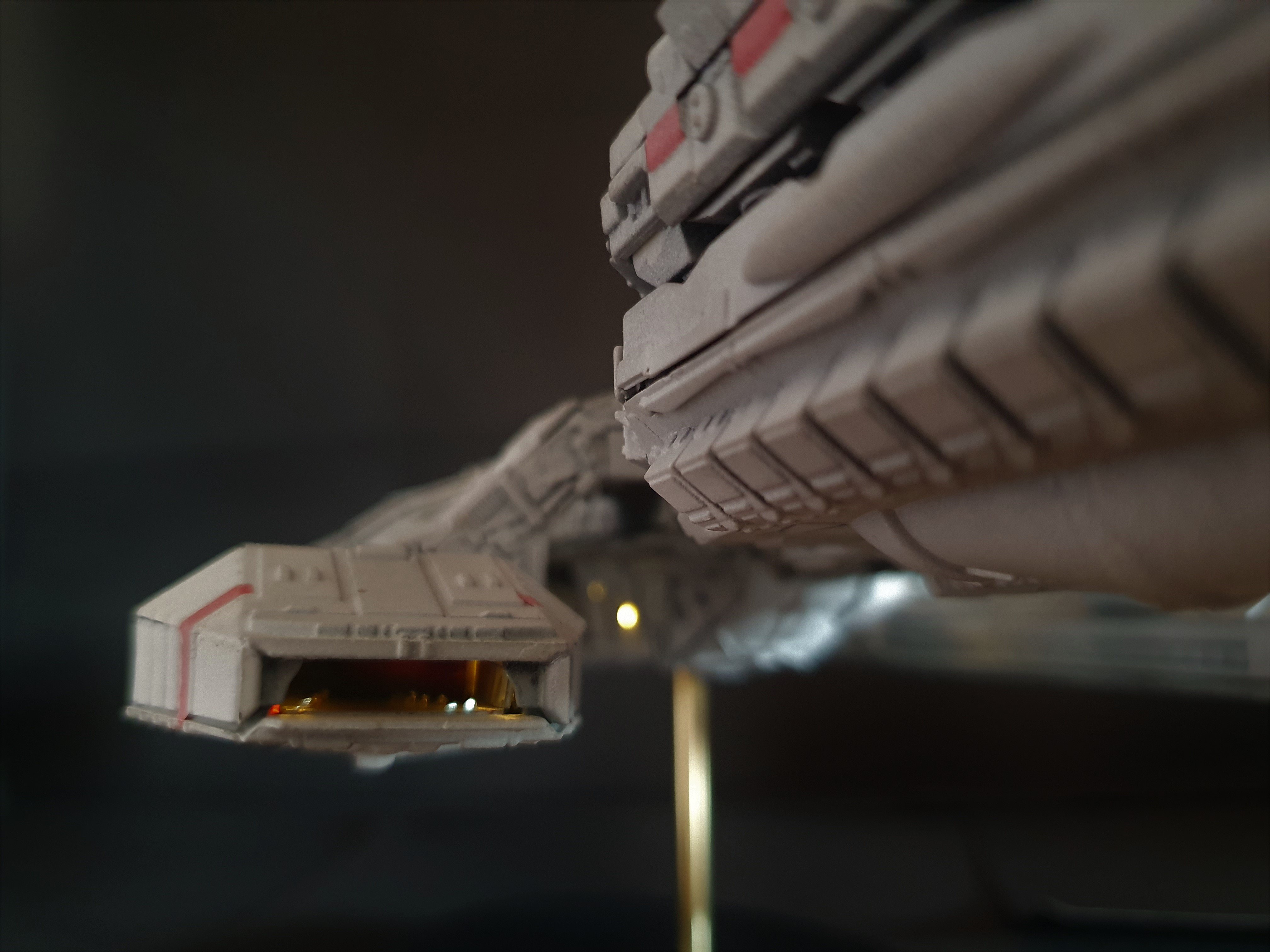 This is an old build up I did that I have just got around to finishing. It’s the Moebius Galactica. Of course this is fully lit and also has scratch built landing bays (in forced perspective) and 0.25mm fiber optics that are connected to a chaser circuit in the base. These light up in sequence simulating the landing bay lights. The lighting can be switched between just the landing bay lights and the landing lights. The main lights are also separate and there is a dimmer switch in the base to turn the intensity of the lights down should anyone wish.