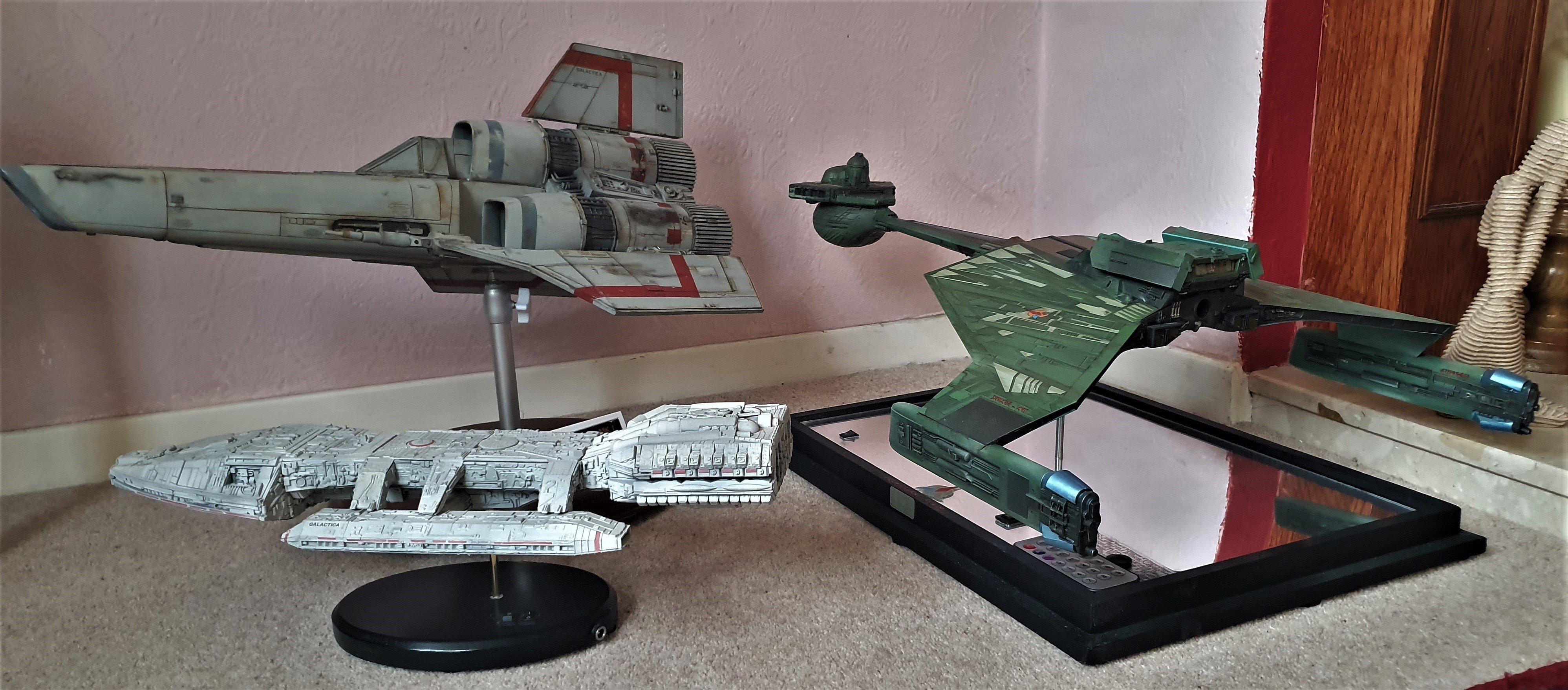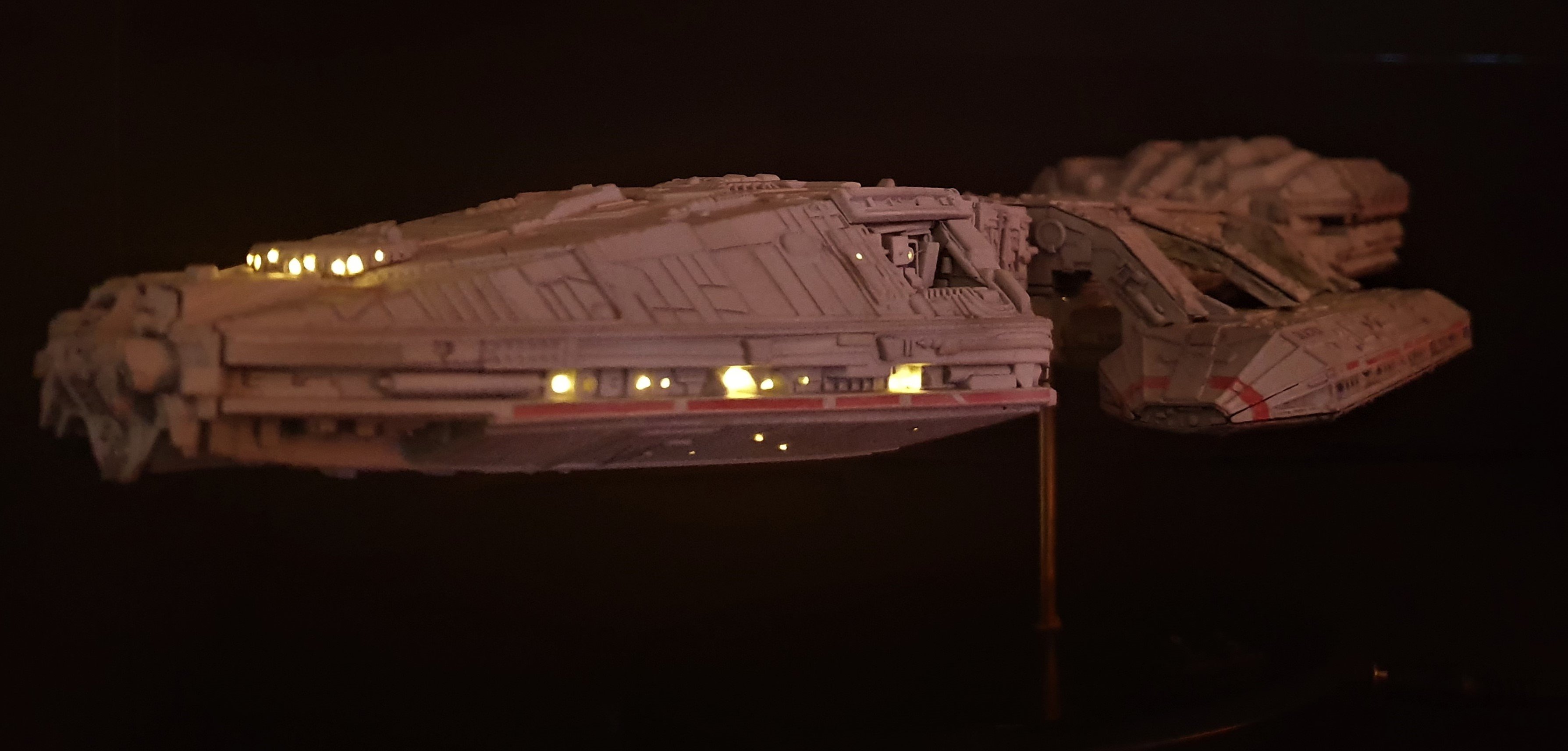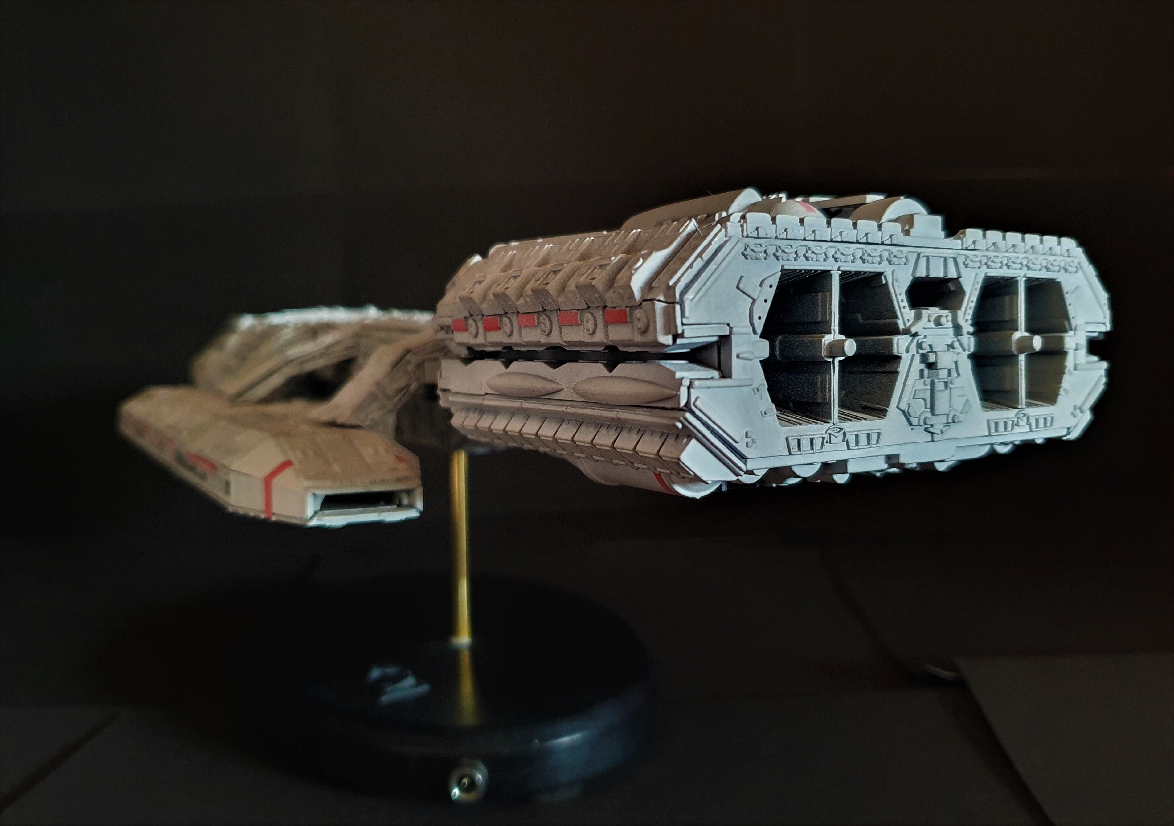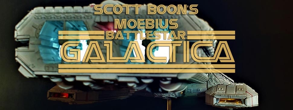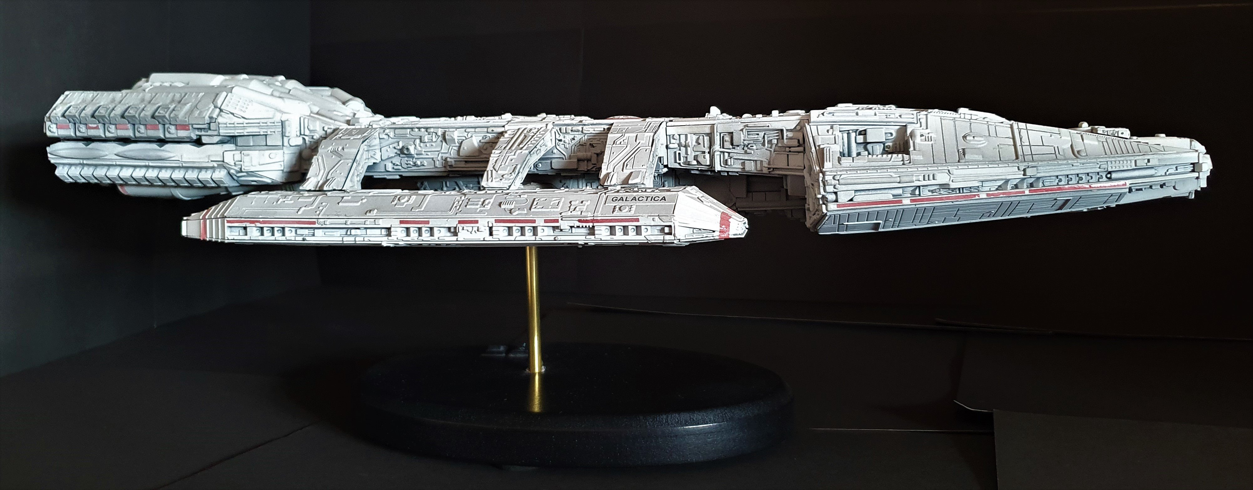This is an old build up I did that I have just got around to finishing. It’s the Moebius Galactica. Of course this is fully lit and also has scratch built landing bays (in forced perspective) and 0.25mm fiber optics that are connected to a chaser circuit in the base. These light up in sequence simulating the landing bay lights. The lighting can be switched between just the landing bay lights and the landing lights. The main lights are also separate and there is a dimmer switch in the base to turn the intensity of the lights down should anyone wish.