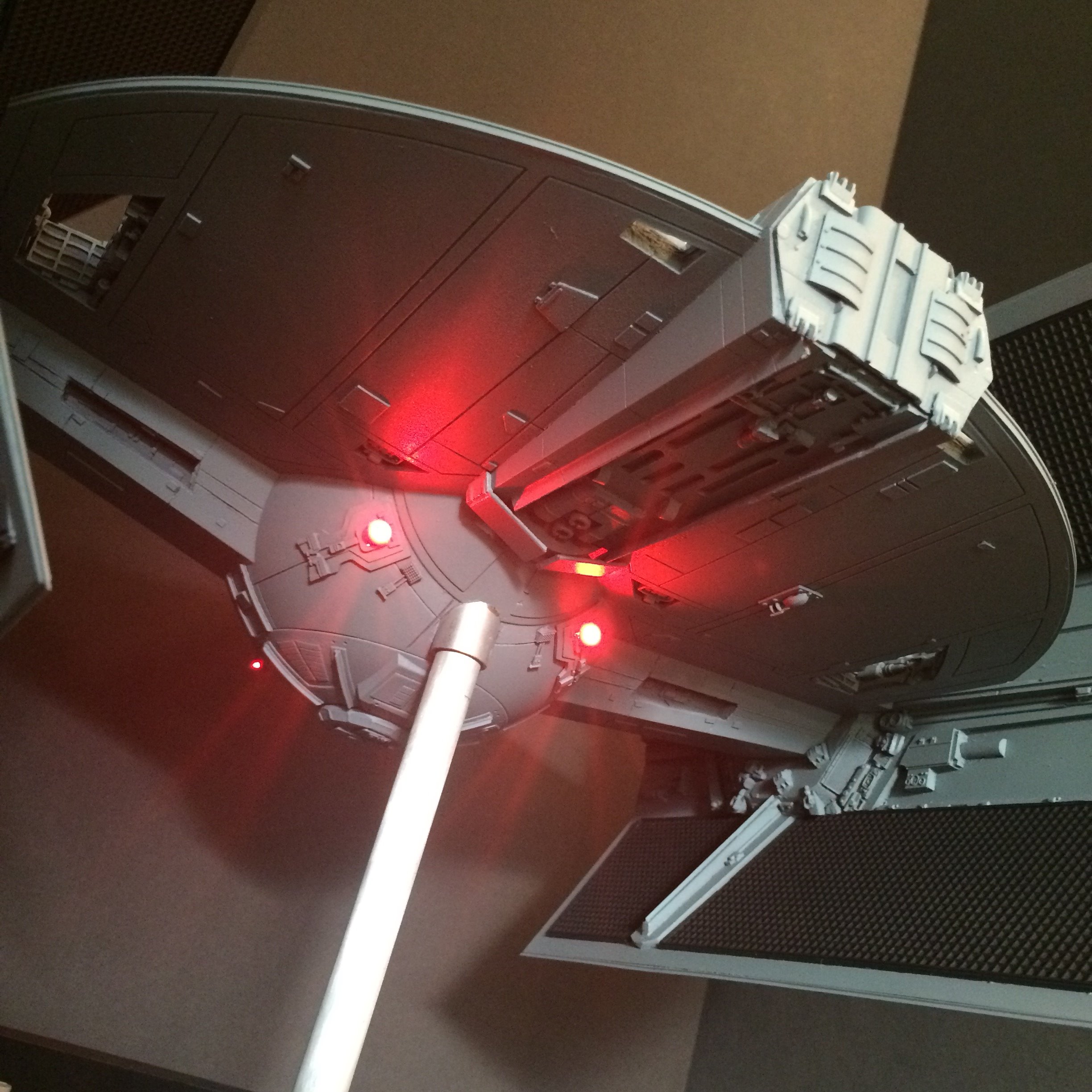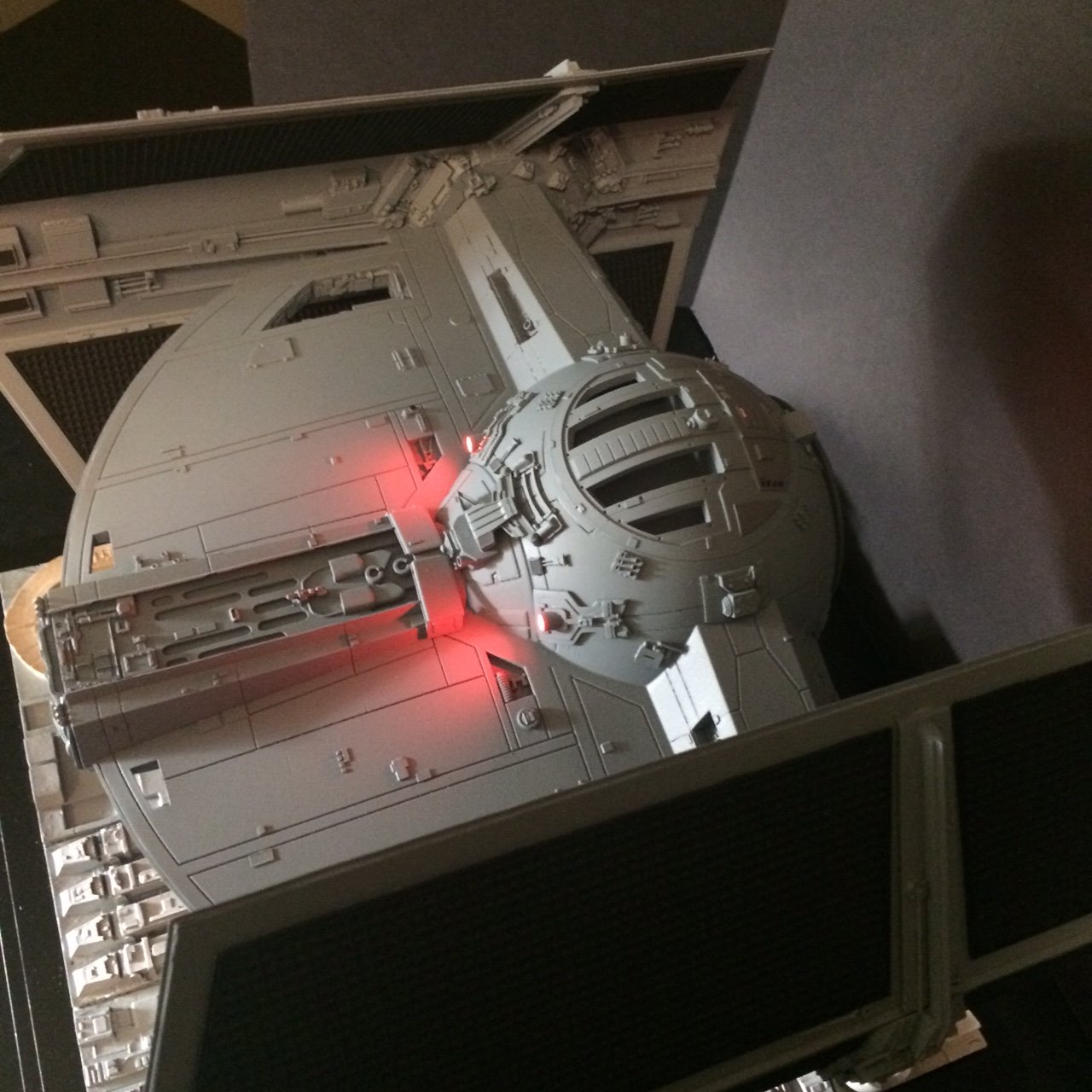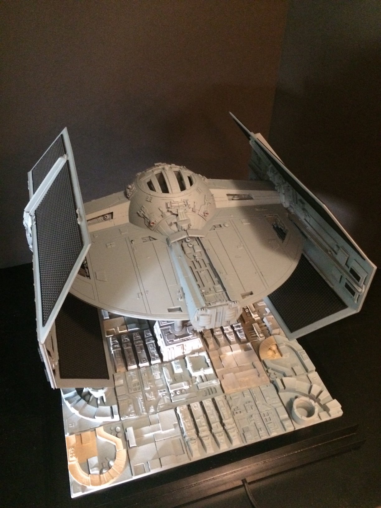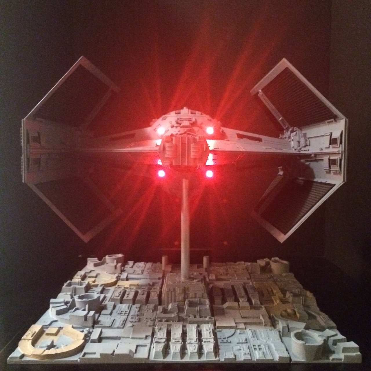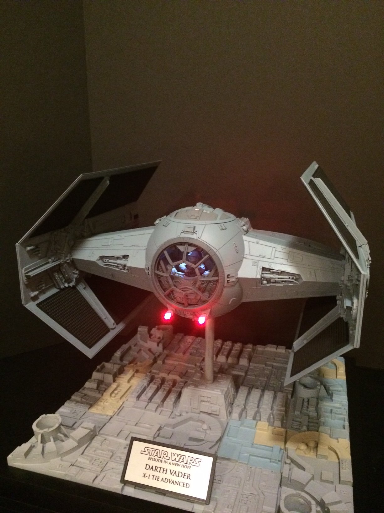 The model is lit and includes the power cord. It’s a color match to the eFX TIE Fighter, so it would make a handsome companion for that replica! Or, if anyone is interested, I’m currently building an Studio Scale TIE Fighter with the original brass Kool Shade that will totally rock. If anyone is interested they can contact me through my email.