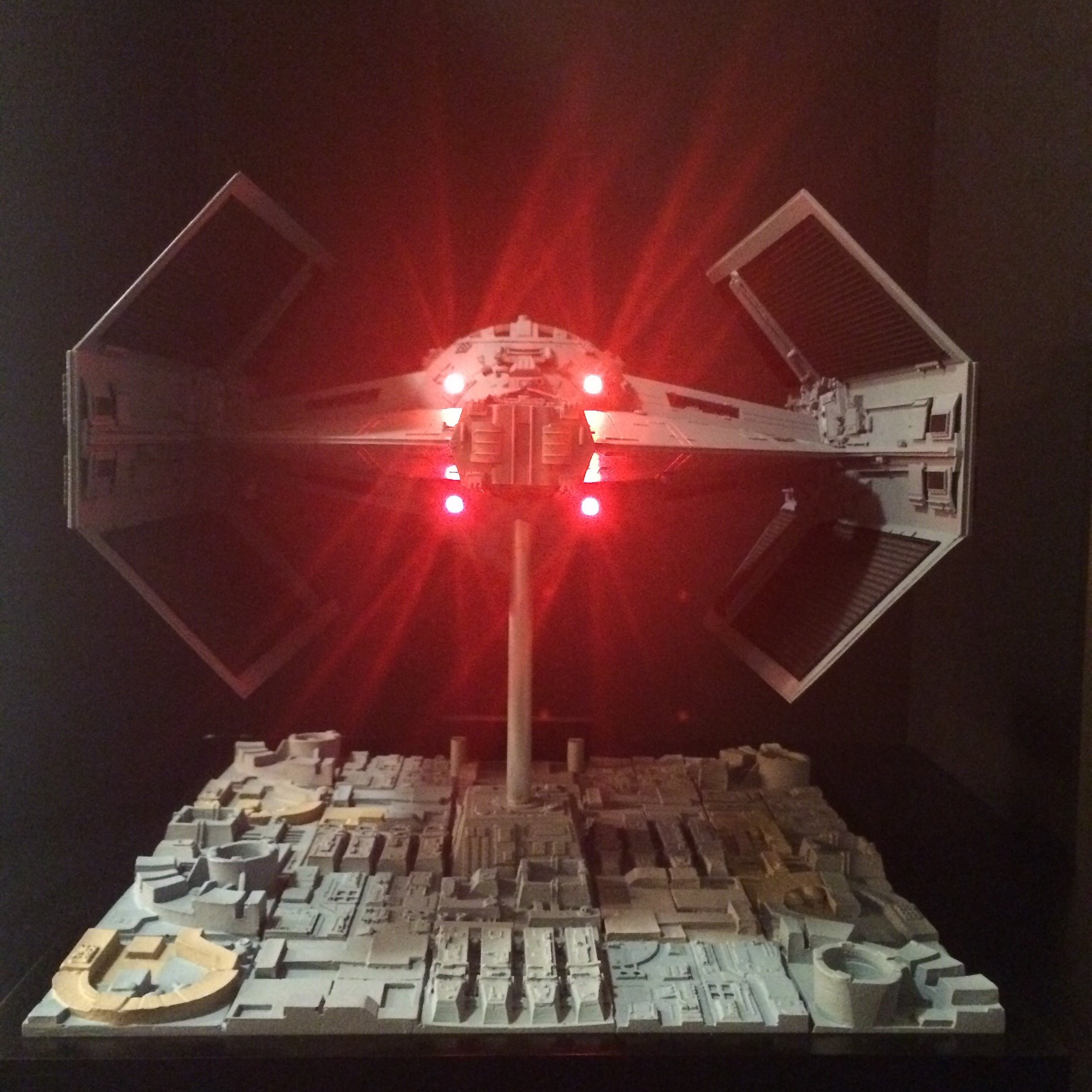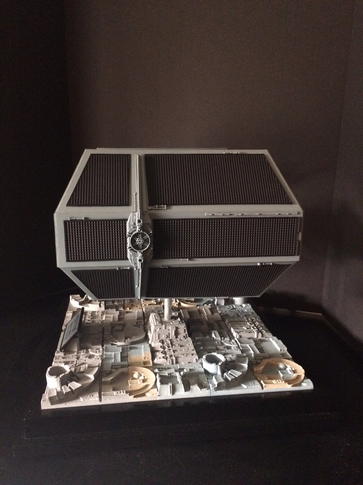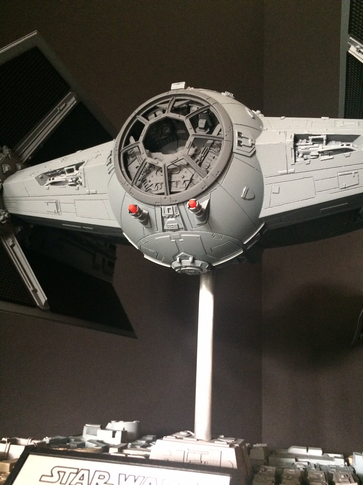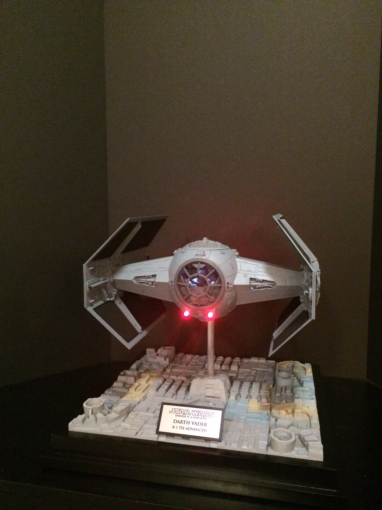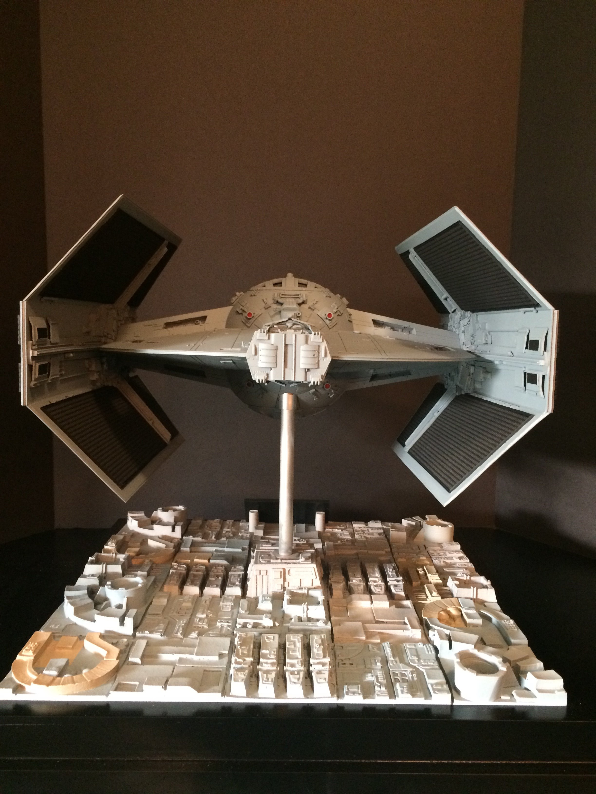 The model is lit and includes the power cord. It’s a color match to the eFX TIE Fighter, so it would make a handsome companion for that replica! Or, if anyone is interested, I’m currently building an Studio Scale TIE Fighter with the original brass Kool Shade that will totally rock. If anyone is interested they can contact me through my email.