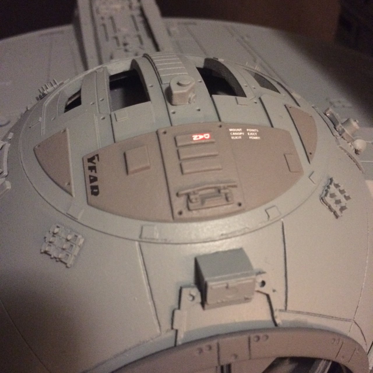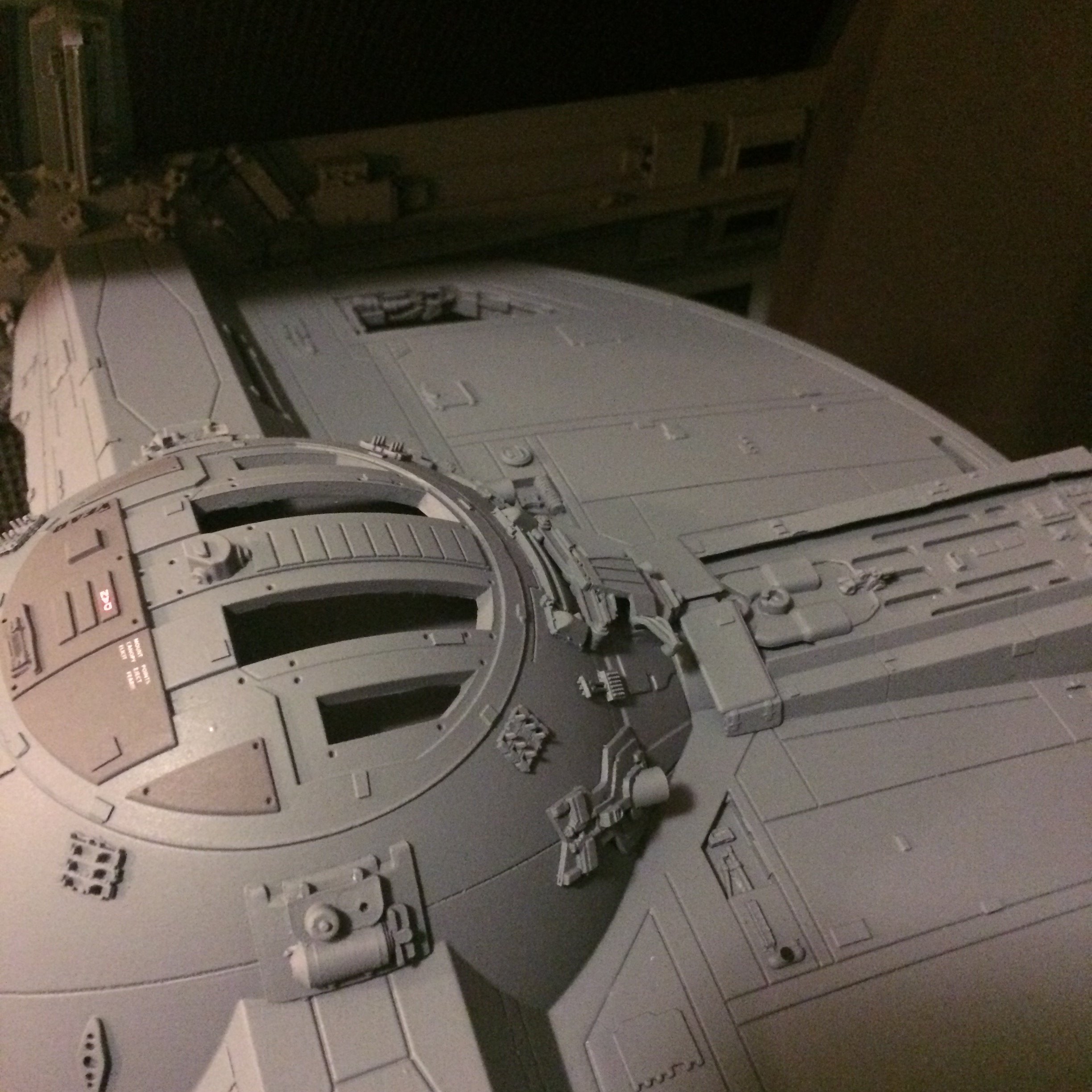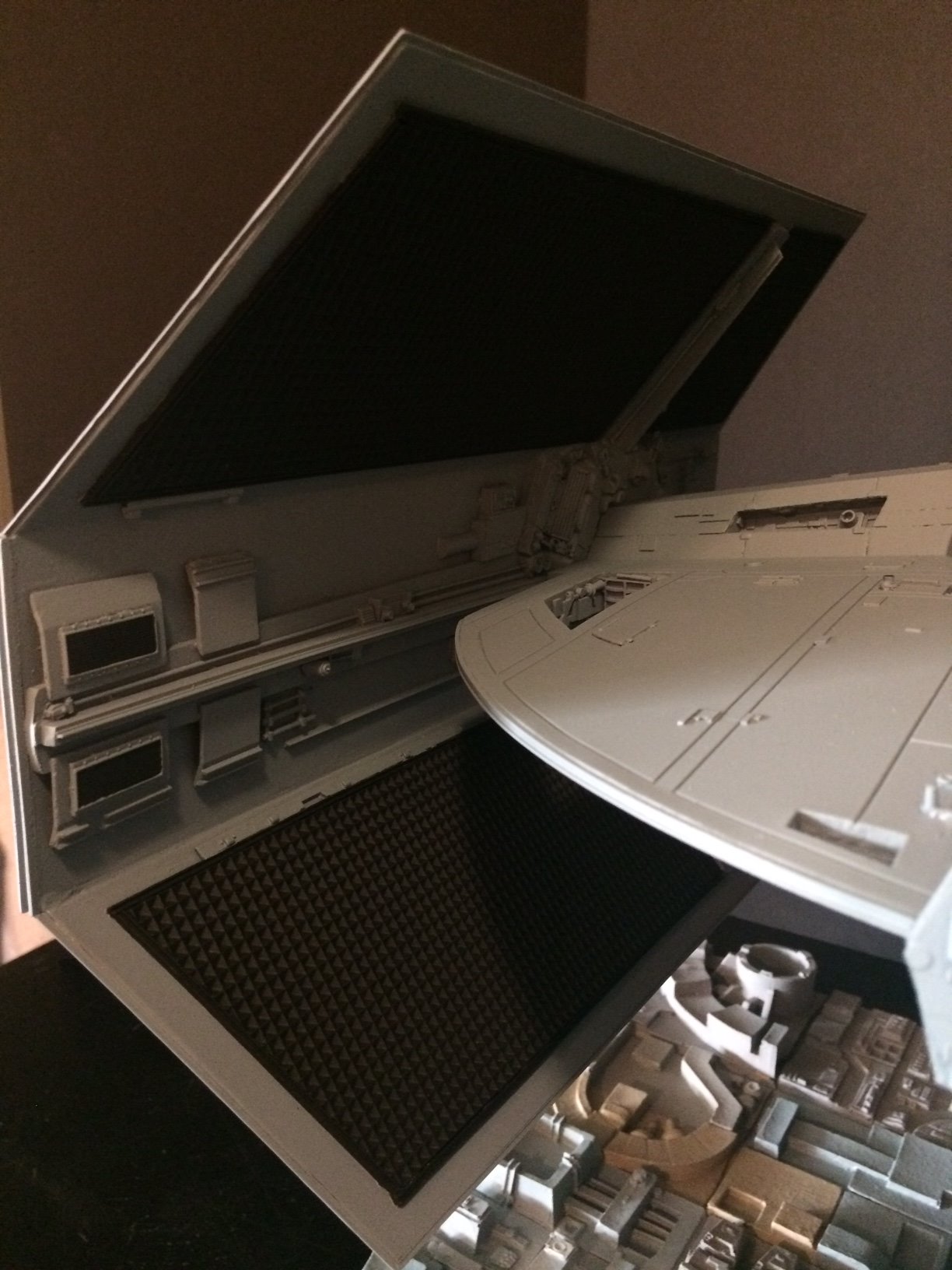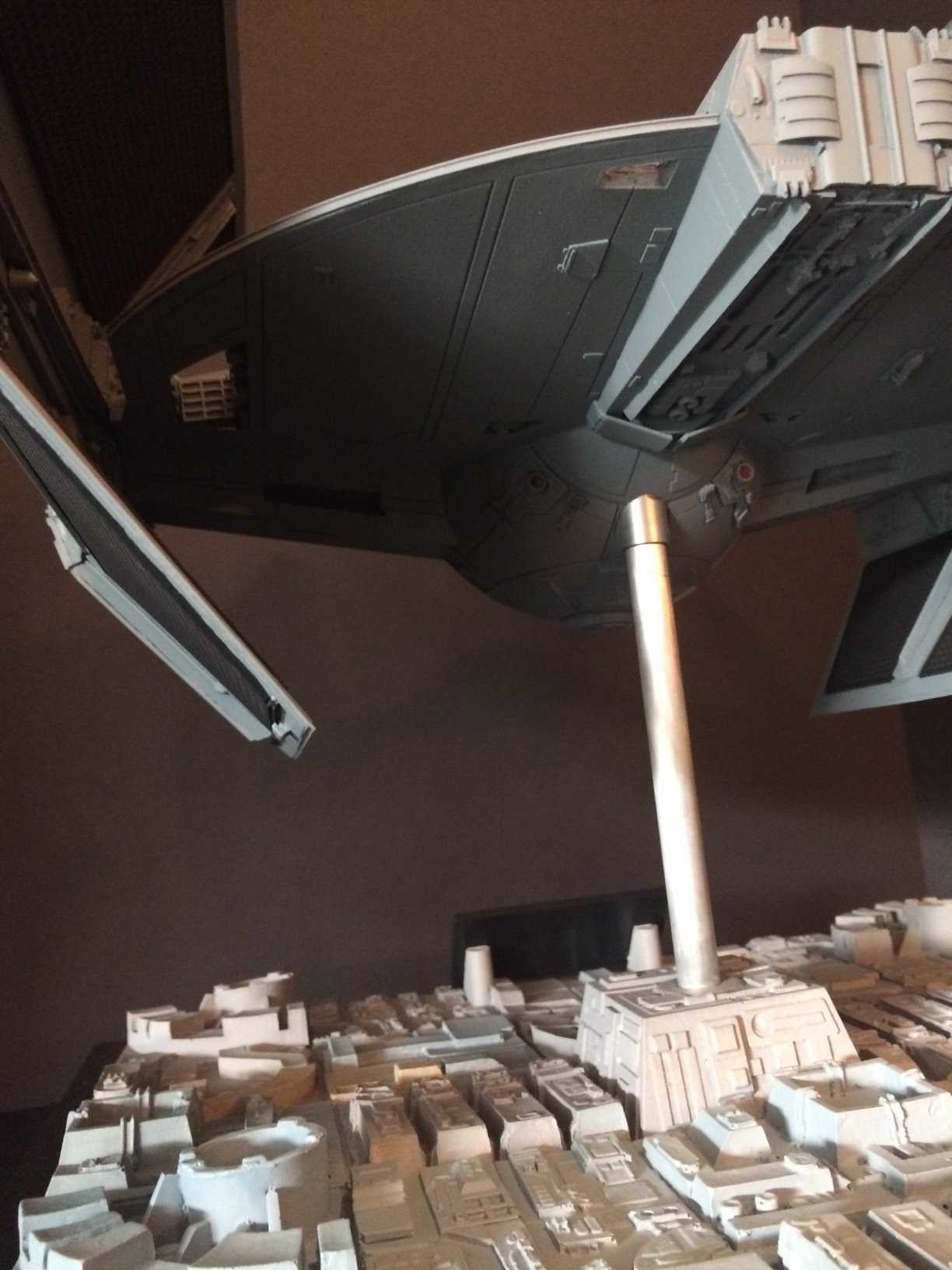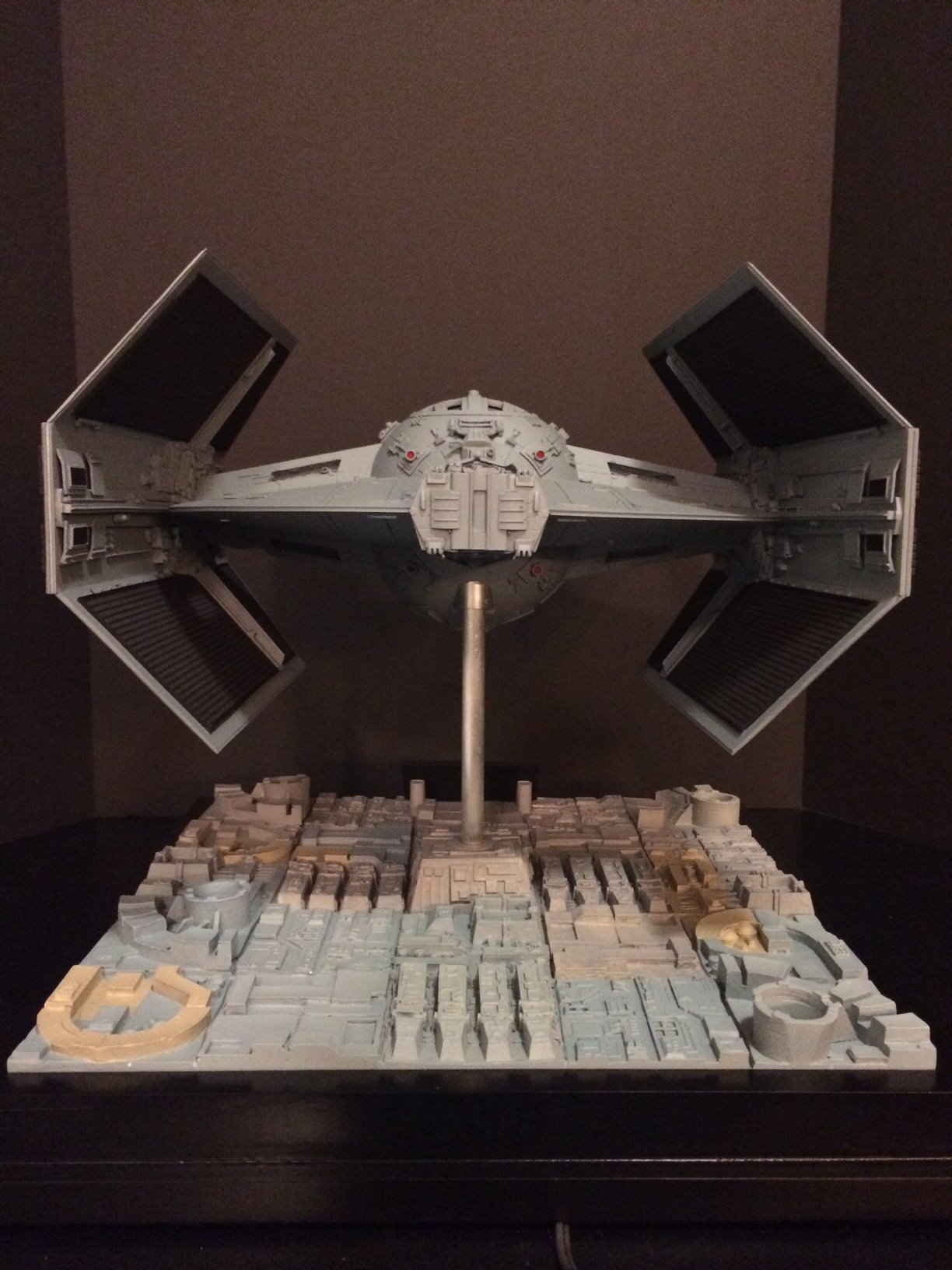 The model is lit and includes the power cord. It’s a color match to the eFX TIE Fighter, so it would make a handsome companion for that replica! Or, if anyone is interested, I’m currently building an Studio Scale TIE Fighter with the original brass Kool Shade that will totally rock. If anyone is interested they can contact me through my email.