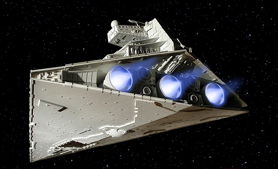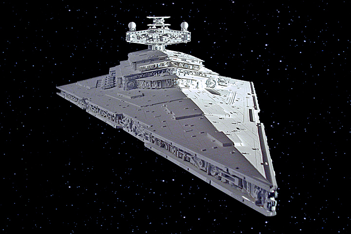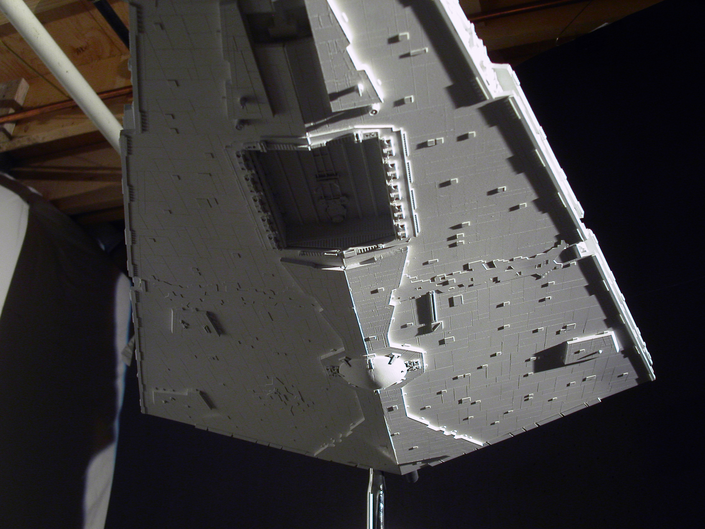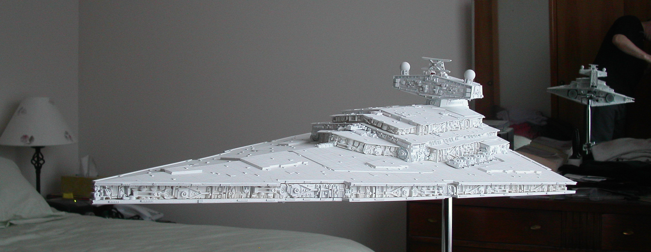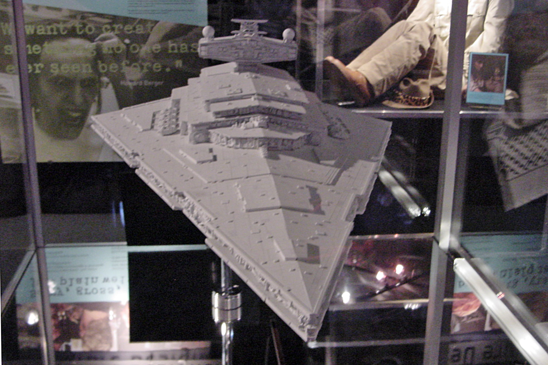 The model was originally built by me as a learning experience in model making in 2004. It was my second attempt at a Star Destroyer. It was never meant to be an exact replica of the original, just a clean, firm build. It is 34 inches long. It has a wood internal frame around an aluminum tube. The main hull is made of Sintra. The bridge and superstructure is built up with sheet styrene. It is detailed with kit bashed parts, resin copied parts, styrene, and found objects. The model and the museum exhibit are mentioned in my book Building Dreams.