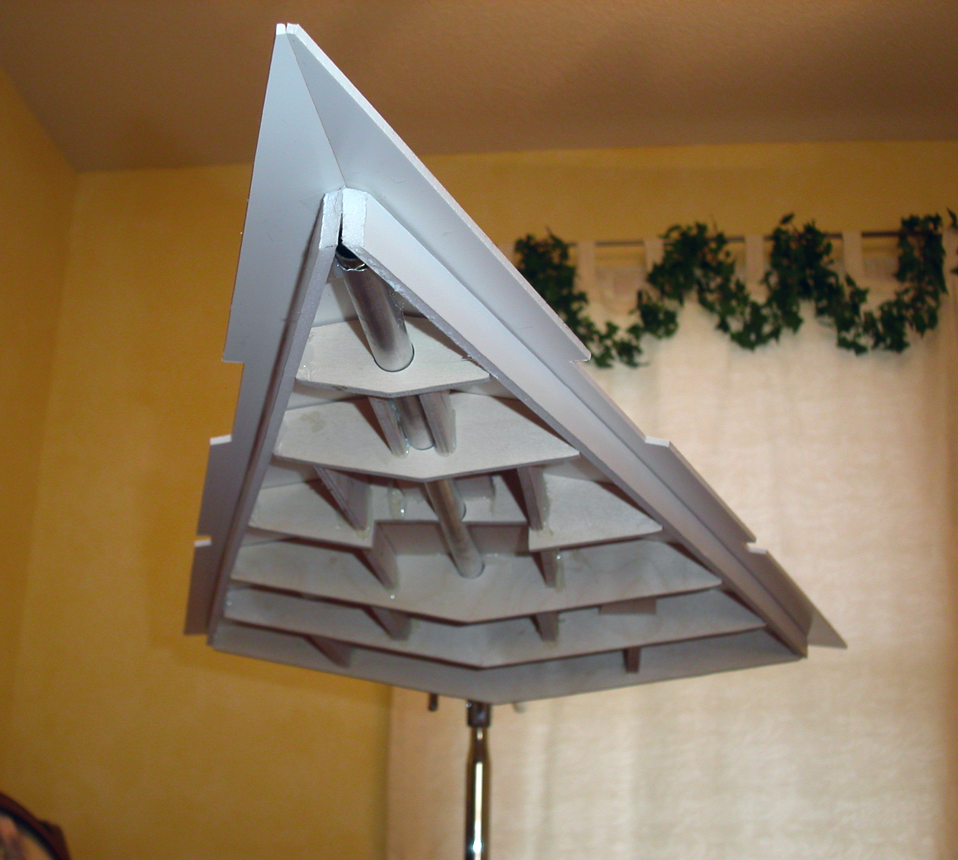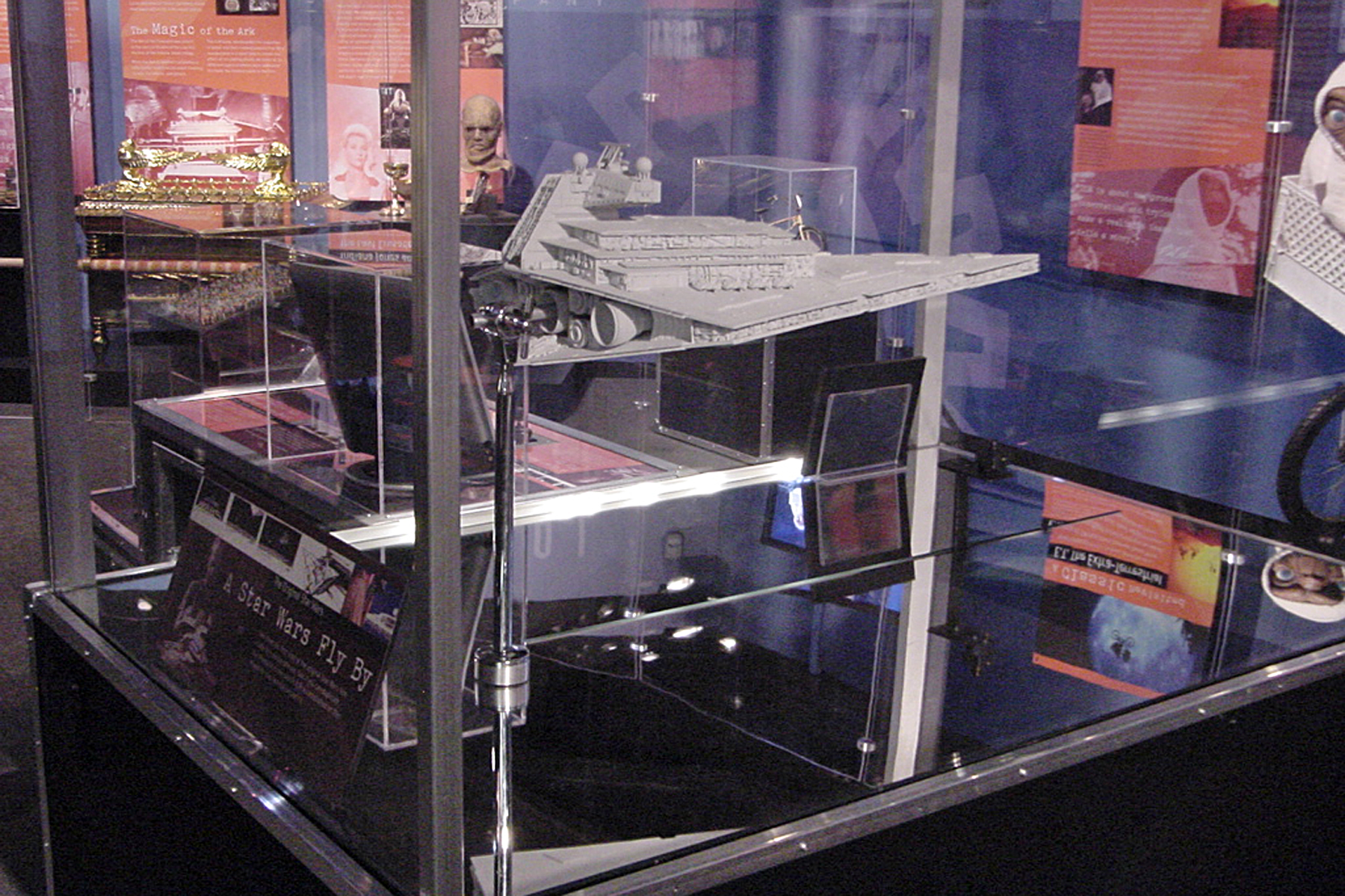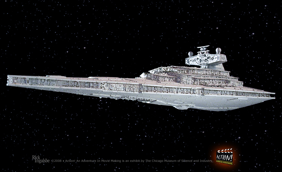 This is the second Star Destroyer I scratch-built. This model was on loan to the Chicago Museum of Science and Industry for four years (2005 – 2009) for an exhibit about movie-making. The exhibit was called Action: And Adventure in Movie-Making. It featured models, props and costumes from a wide variety of sci-fi and action movies. The exhibit began with the original Star Destroyer filming model from Star Wars: A New Hope. Lucasfilm decided to reassign that model for another museum exhibit exclusively about Star Wars. This model, now for sale, replaced the original Star Destroyer in the exhibit for touring. It appeared at the Liberty Science Center, NJ, then to the Carnegie Science Center in Pittsburgh, PA, and finally the Discovery Place in Charlotte, NC. It was displayed in an interactive booth where visitors to the exhibit could learn how motion control filming works; A joystick moved a small camera under the model to recreate the opening scene of Star Wars on a monitor. This model was displayed with such movie icons as the Arch of The Covenant from Raiders of the Lost Arch, the largest Snow Walker model from ESB, the Red October filming model, a full-sized Speeder Bike fro ROTJ, and much more. This Star Destroyer was seen and approved by ILM for use in the exhibit.