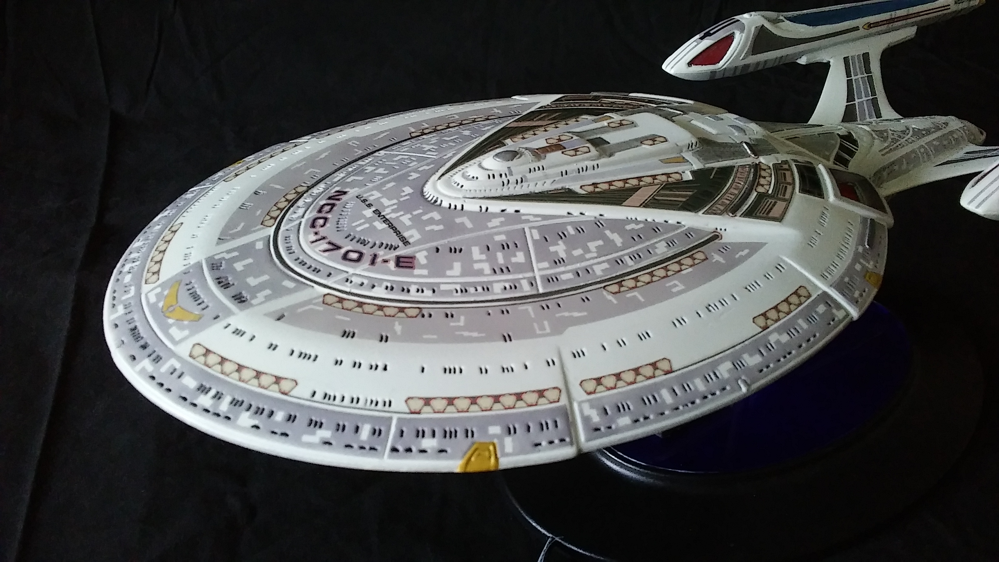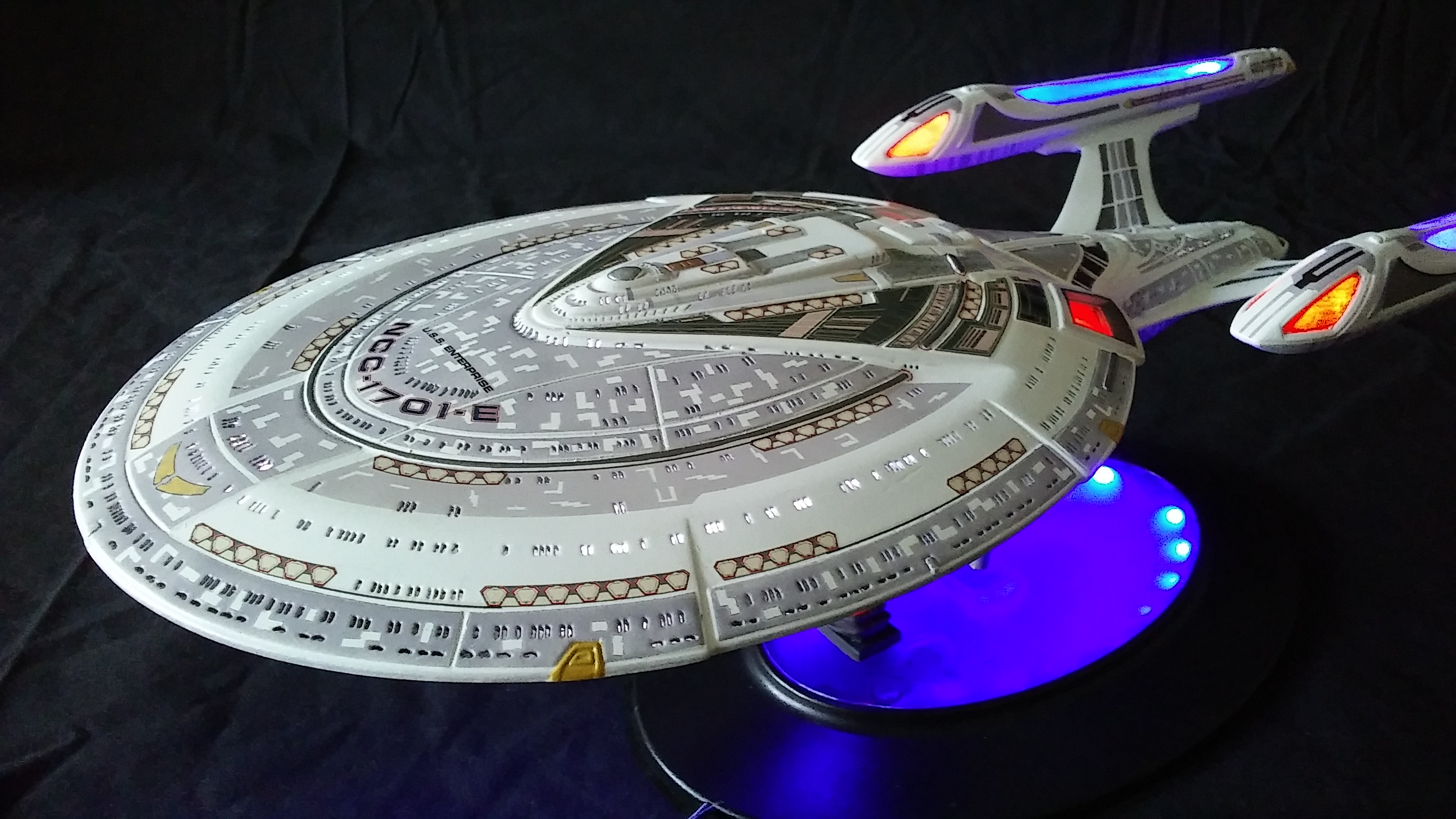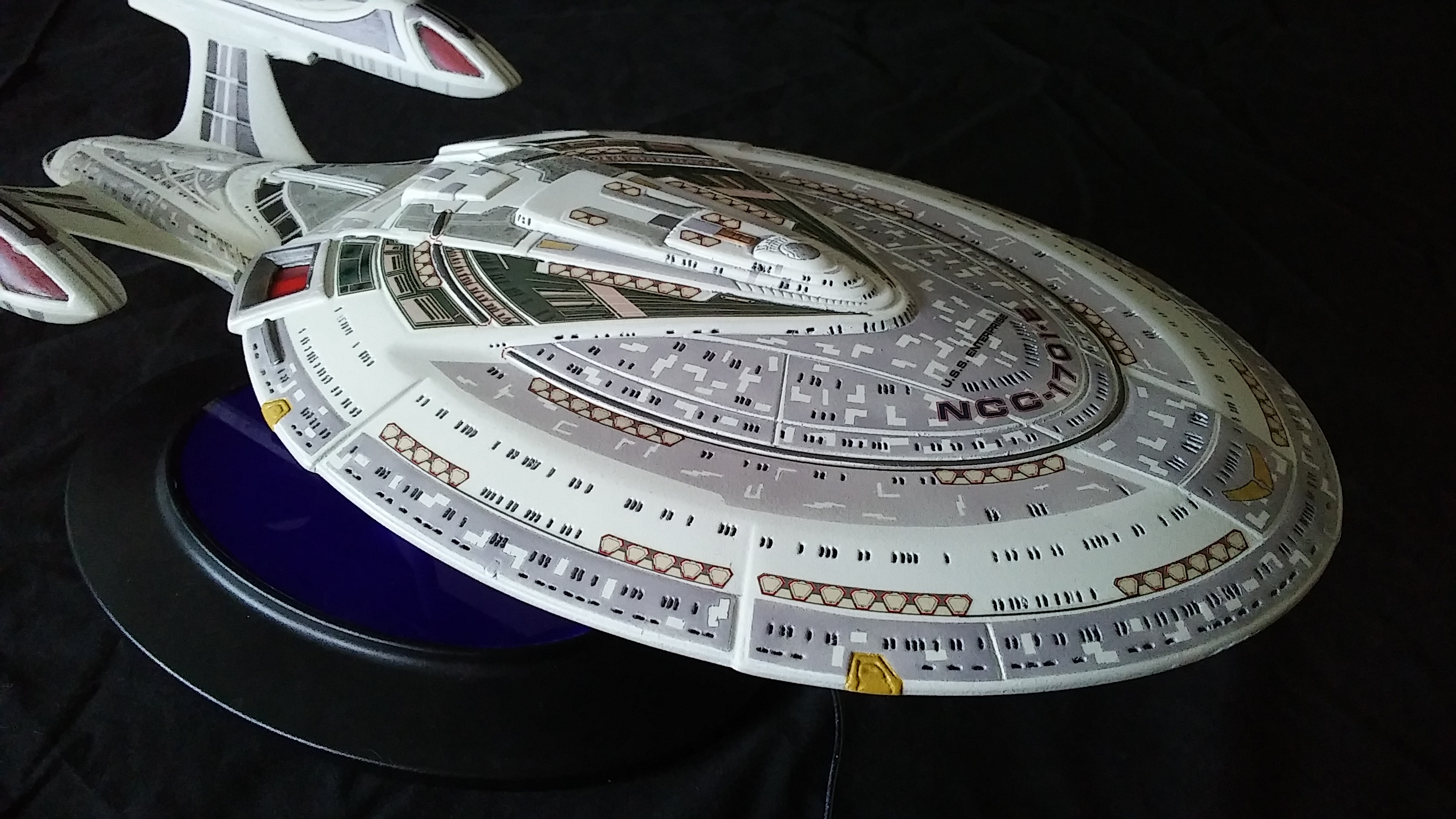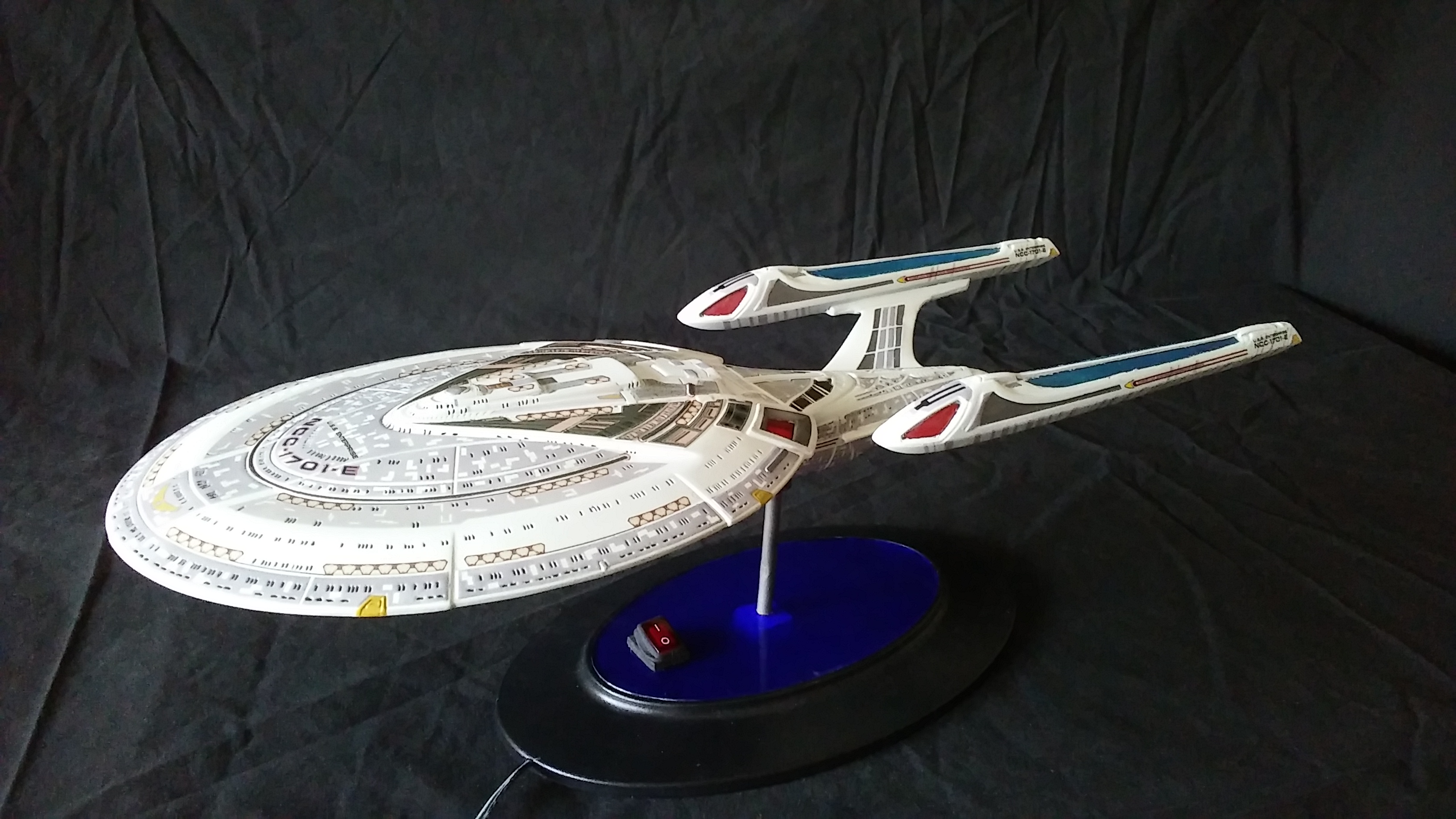 This is another build of the USS Enterprise 1701-E from Unique Model Creations. It is the first actual build of this model that I have done. The first time I didn’t light it, and since that first build, it has been refurbished 2x over. The Aztec-ing on the model was all hand-done using masking tape cut outs, painstakingly applied and painted.
