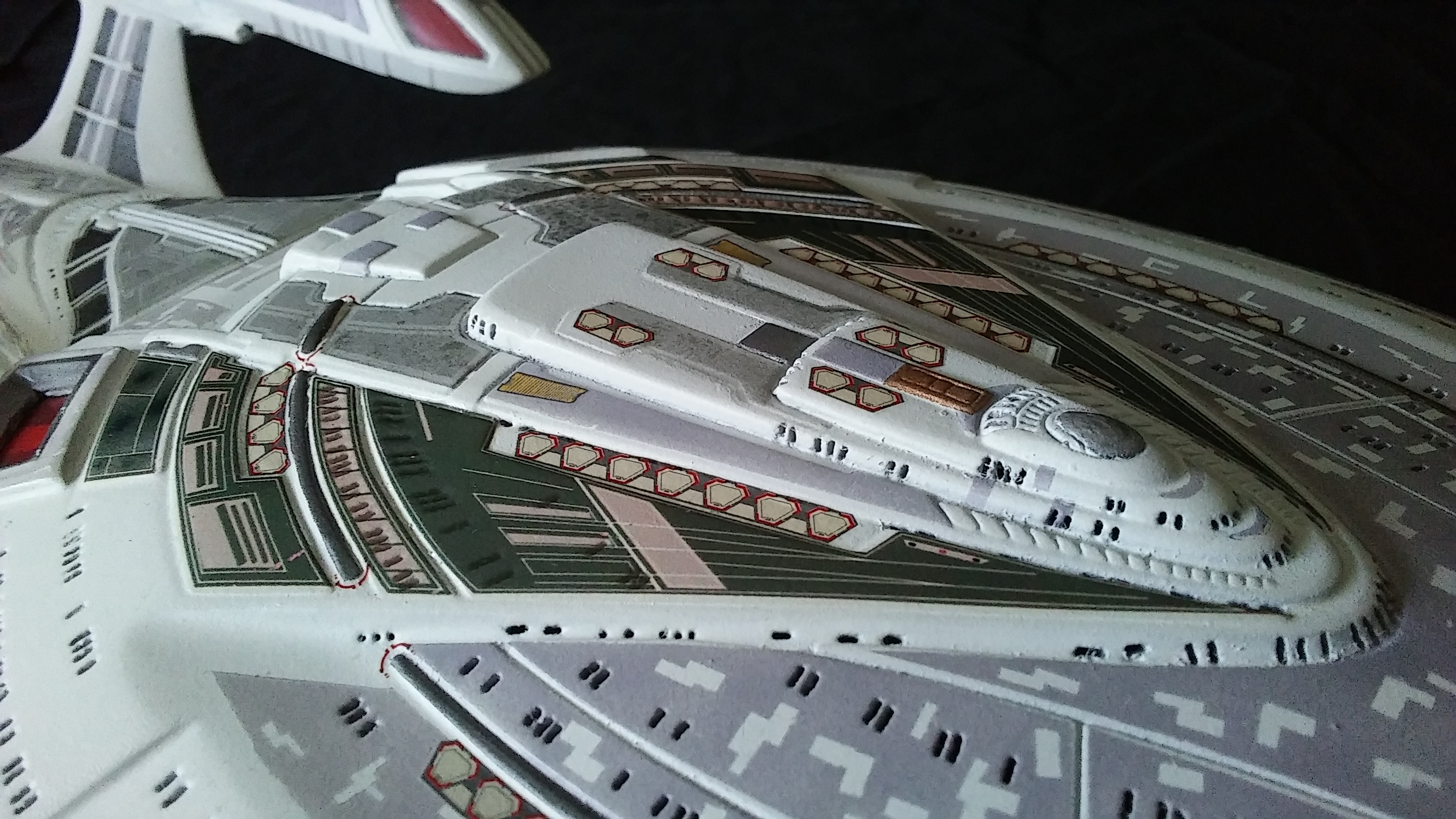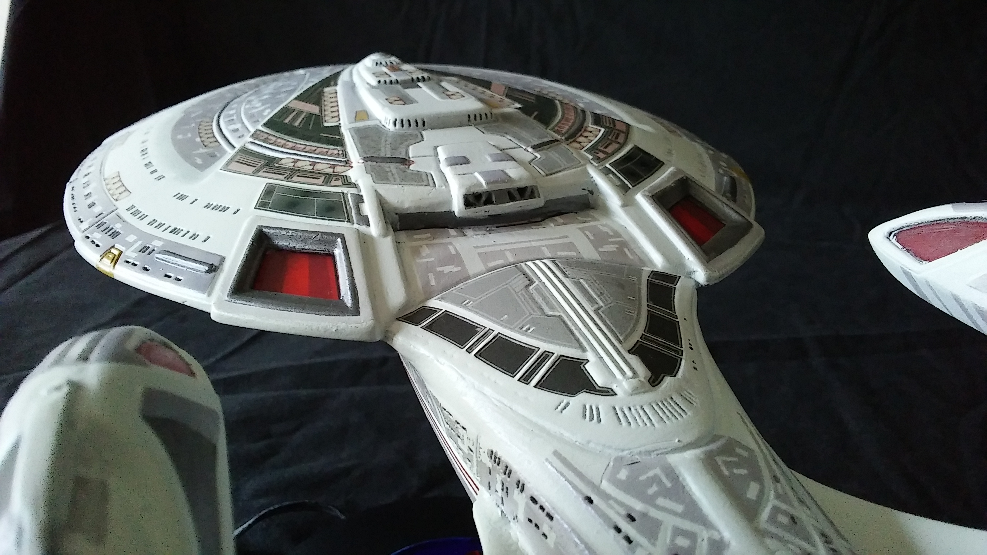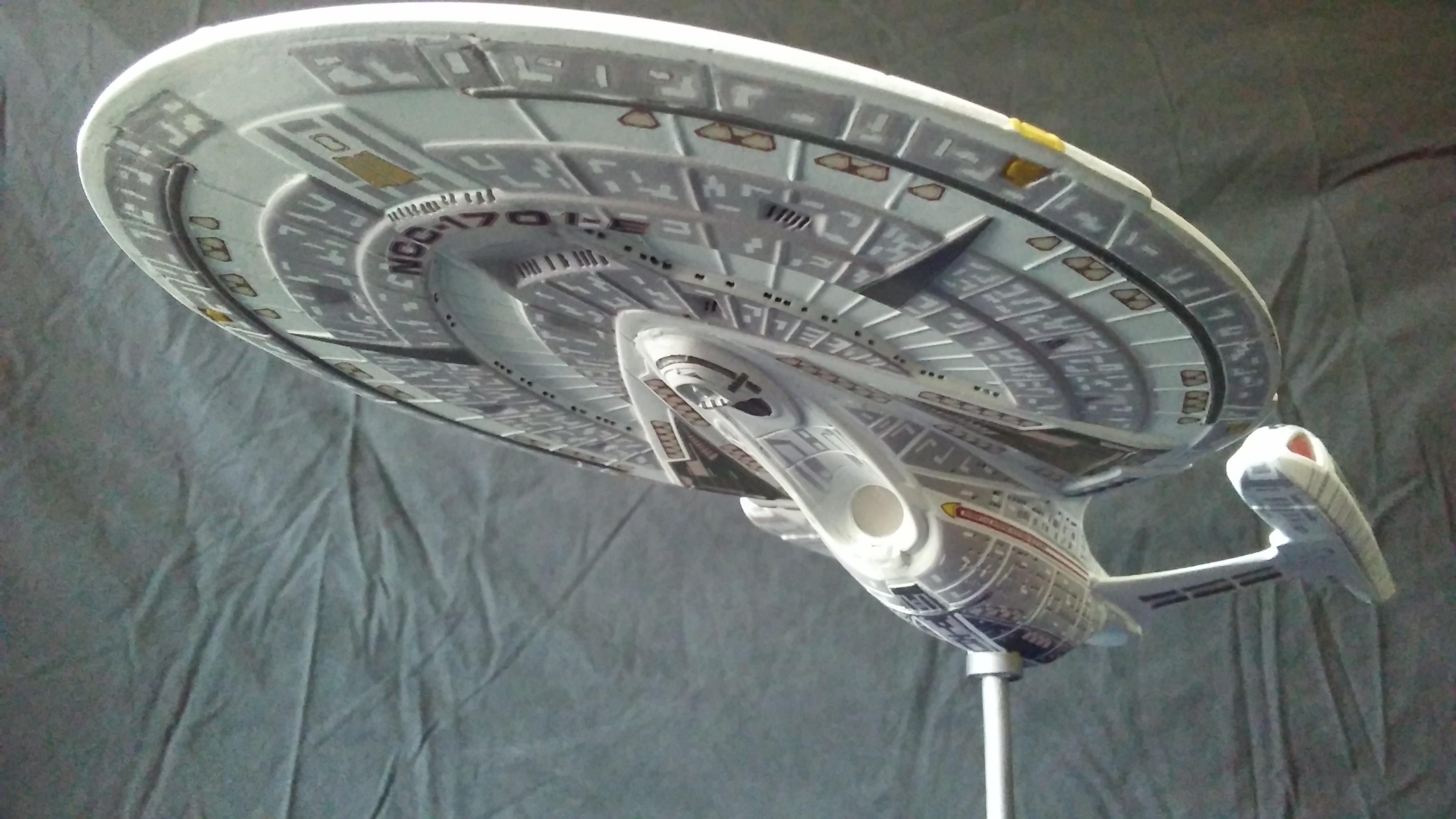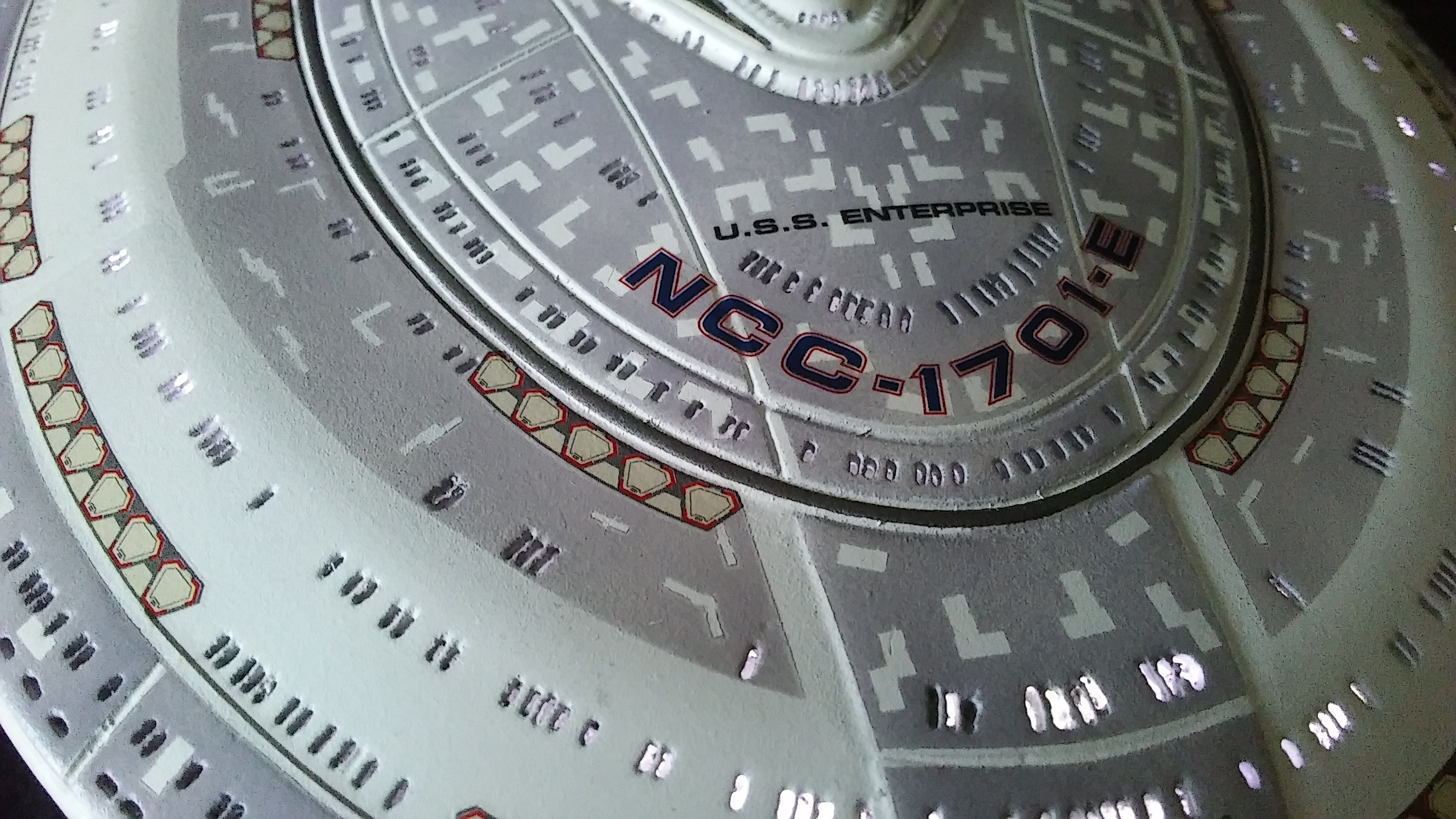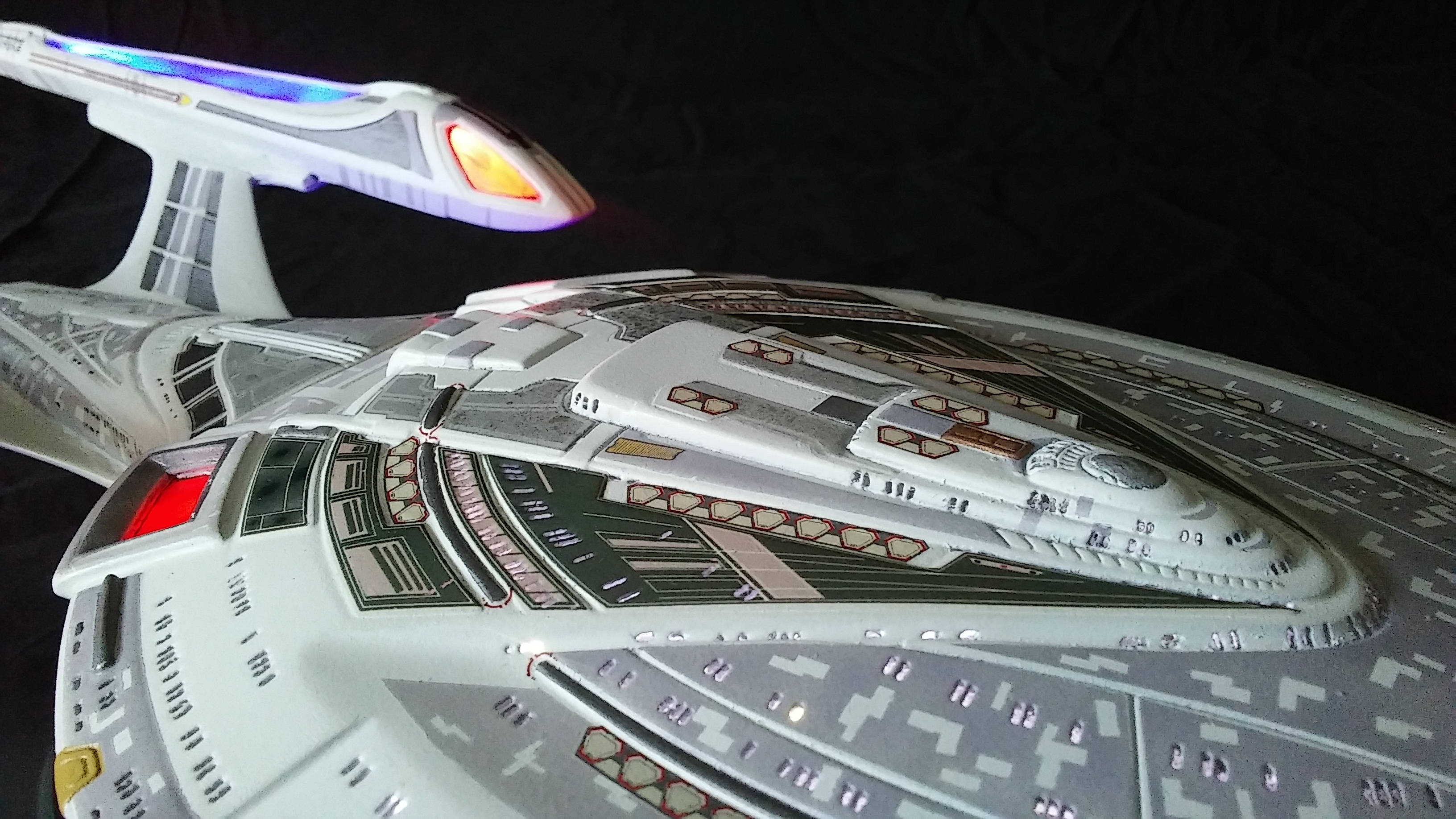This is another build of the USS Enterprise 1701-E from Unique Model Creations. It is the first actual build of this model that I have done. The first time I didn’t light it, and since that first build, it has been refurbished 2x over. The Aztec-ing on the model was all hand-done using masking tape cut outs, painstakingly applied and painted.