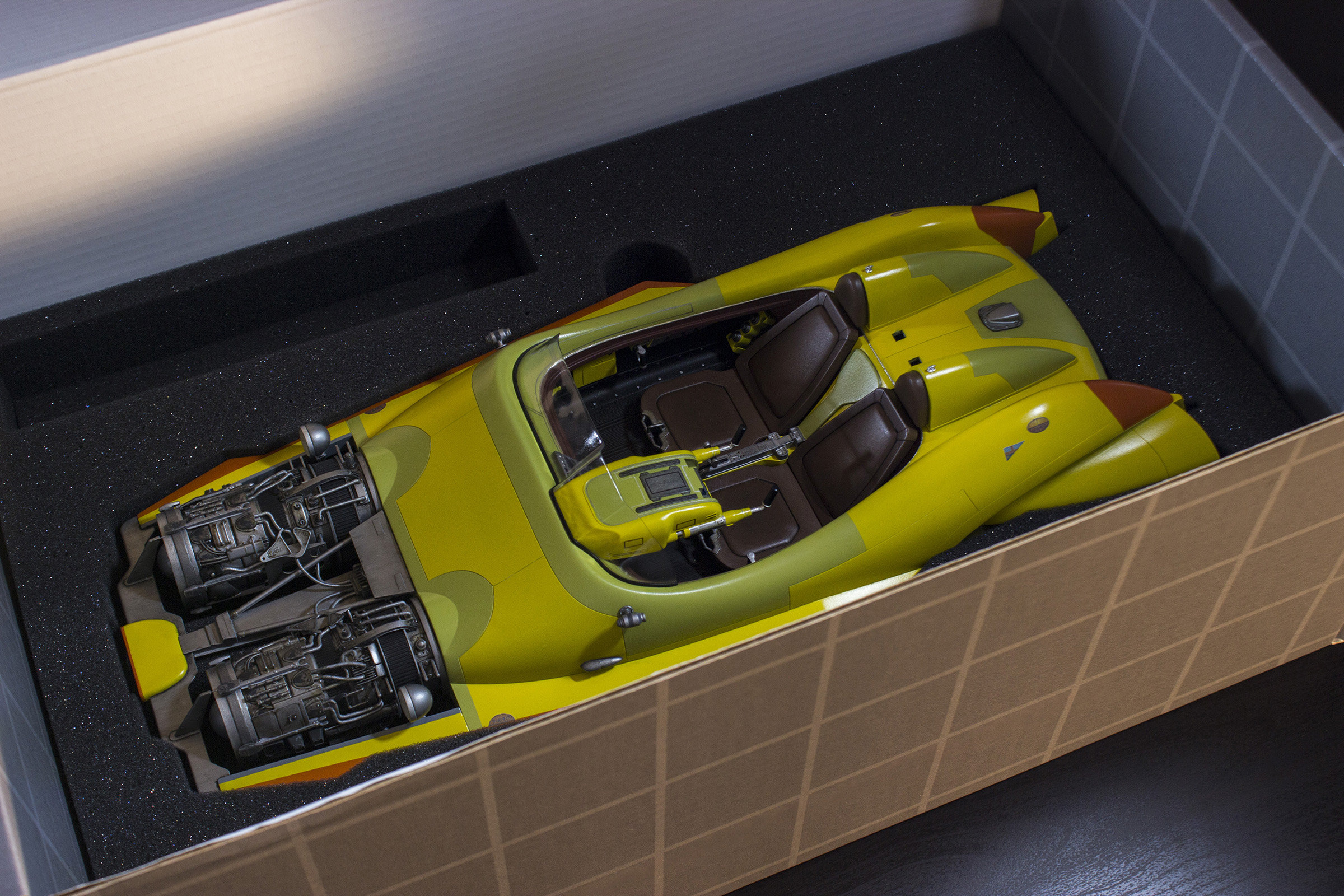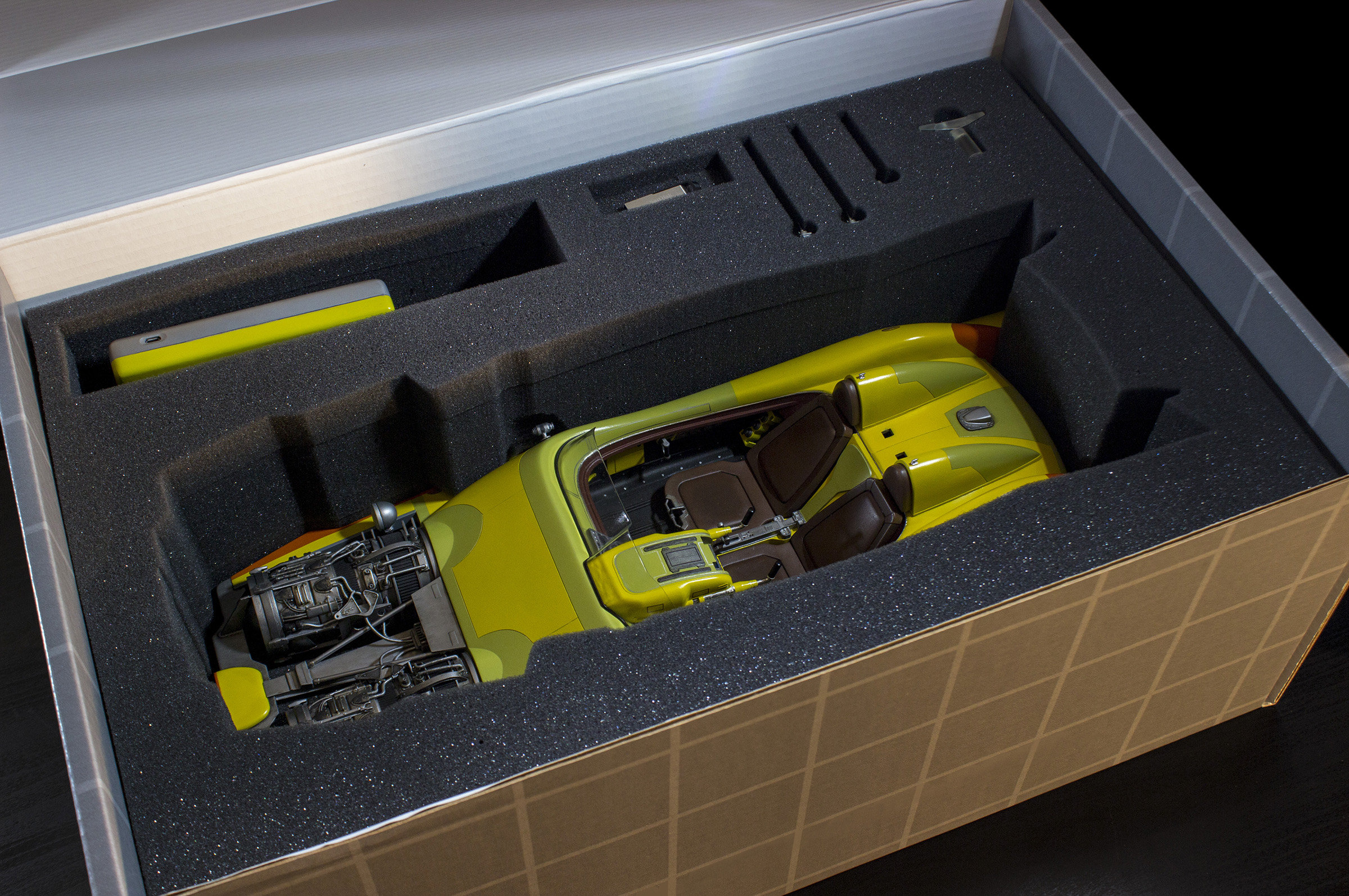 Shipping: USA Only. The speeder has a printed box with custom-cut foam and spots for the accessories. The acrylic cover and the base will be shipped in another box and then the remote control in another since it has a rechargeable lithium battery.