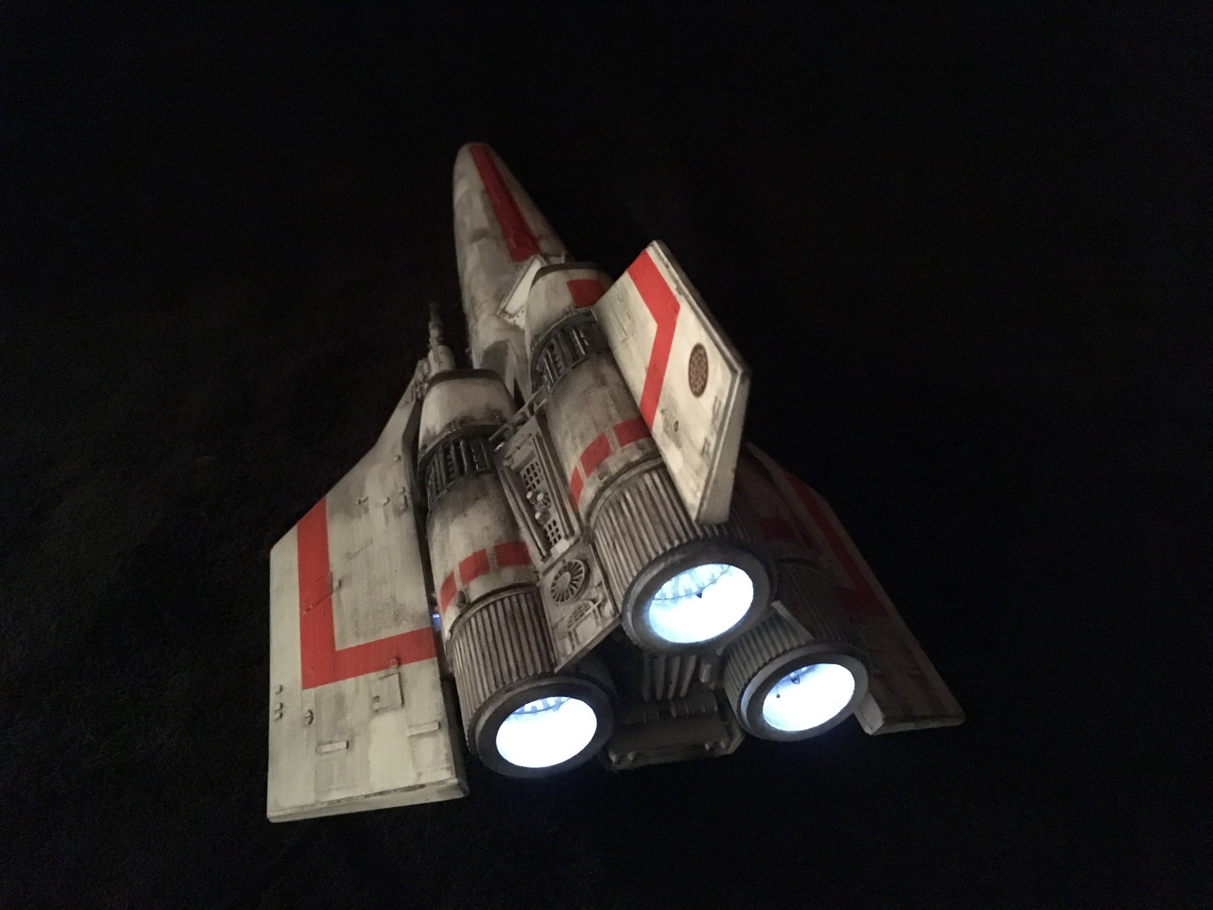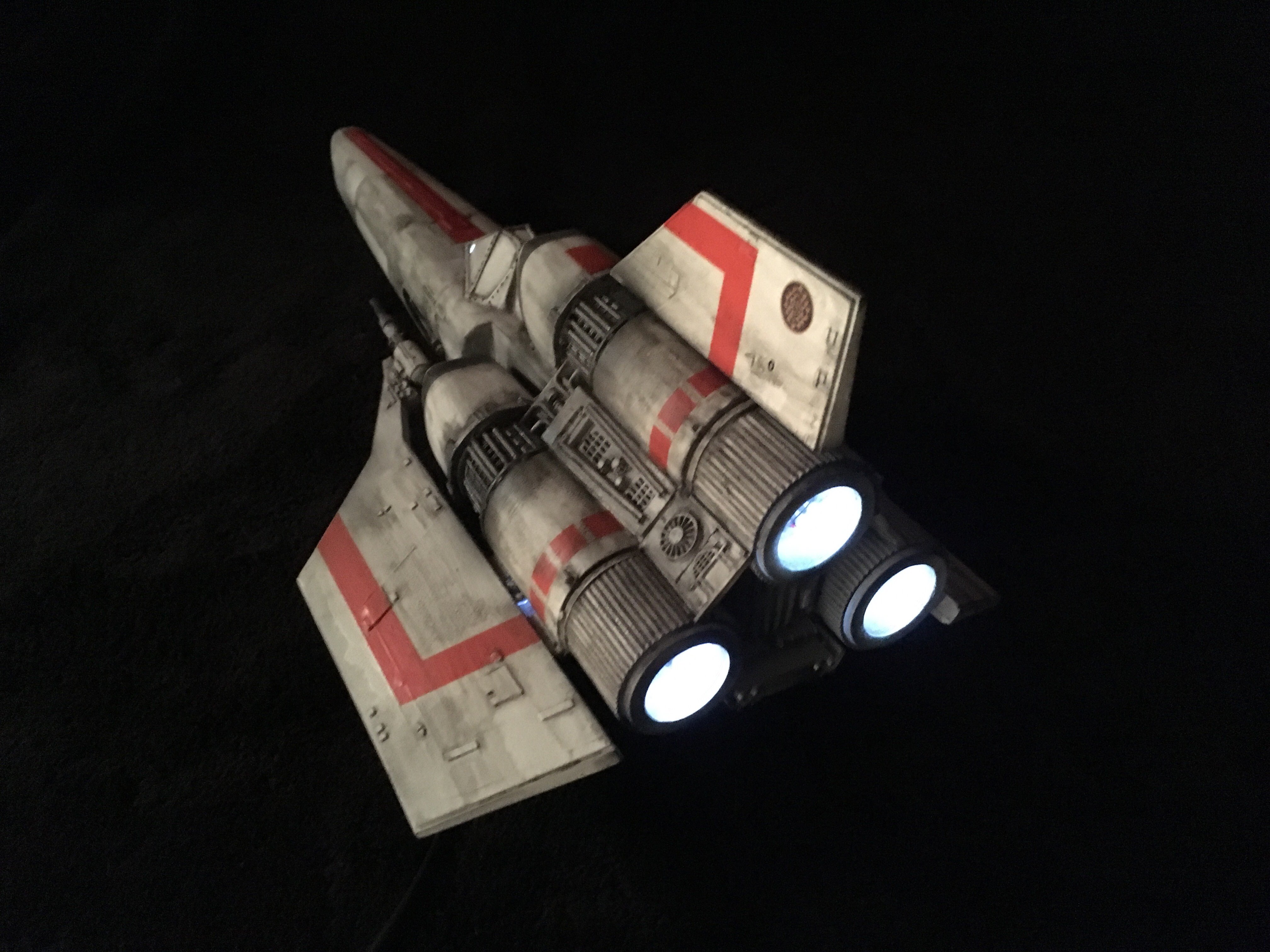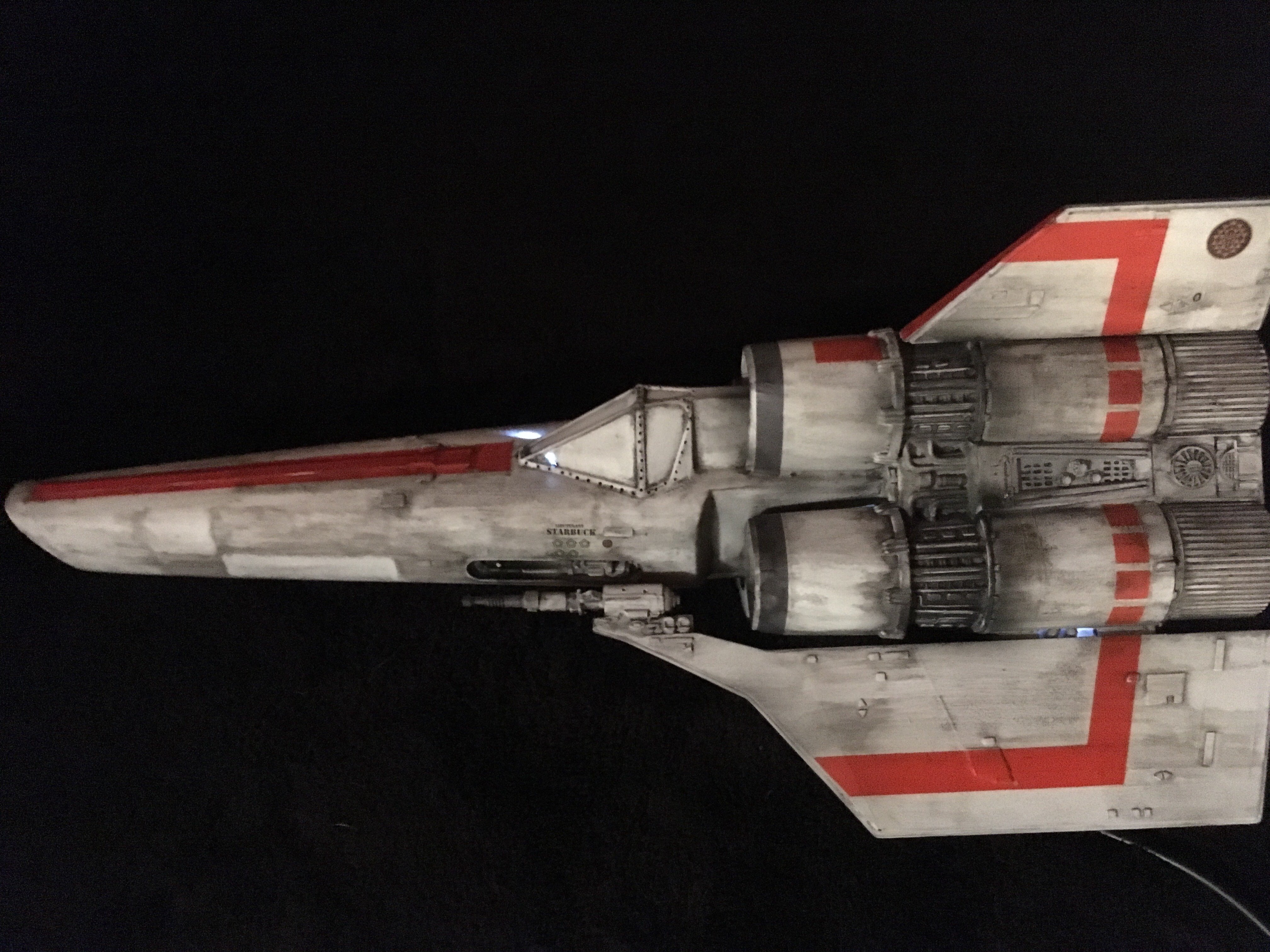 Here is another finished another Colonial Viper. This time I made this one from the Mine Scene when Starbuck and Apollo go into the minefield to clear a path for the Galactica and the Rag Tag Fleet in the original three hour premiere. I have two cracks in the canopy where it was burning through Blast Sheild of Starbuck’s canopy that protected Starbuck from the Nova Madagon. The Viper’s Blasters fire with the countdown on the computer, just like in the movie, and of course the engines pulsate and also have sound effects . I accept PayPal only. (Modeler Magic Always Recommends Using PAYPAL for BOTH Purchaser and Seller Protection). Shipping is $29.95 USD for USA and $49.95 USD for World-Wide.
