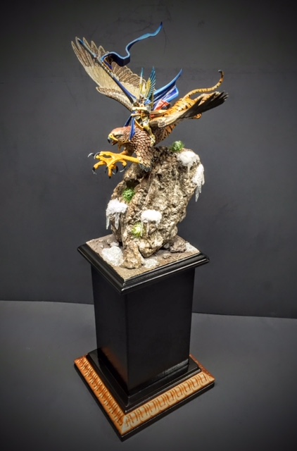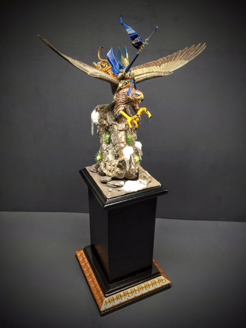 This is my High Elf Griffon Miniature Build up. This is from Warhammer Games Work Shop. The model consists of the Griffon and the Elf Knight rider. The rock and pedestal base is. My own design and construction. The rock is hand carved from foam board and painted using an acrylic paint layering process with the addition of snow and Ice and miniature shrubs. The display sits on a wood pedestal painted in satin black and accented in copper trim around the bottom. This would be a handsome piece to add in any true collector’s show case. I think the detail is truly exceptional. Thanks again!