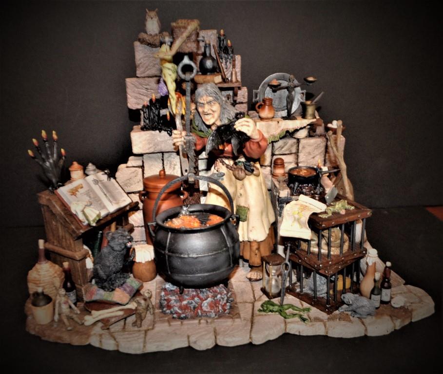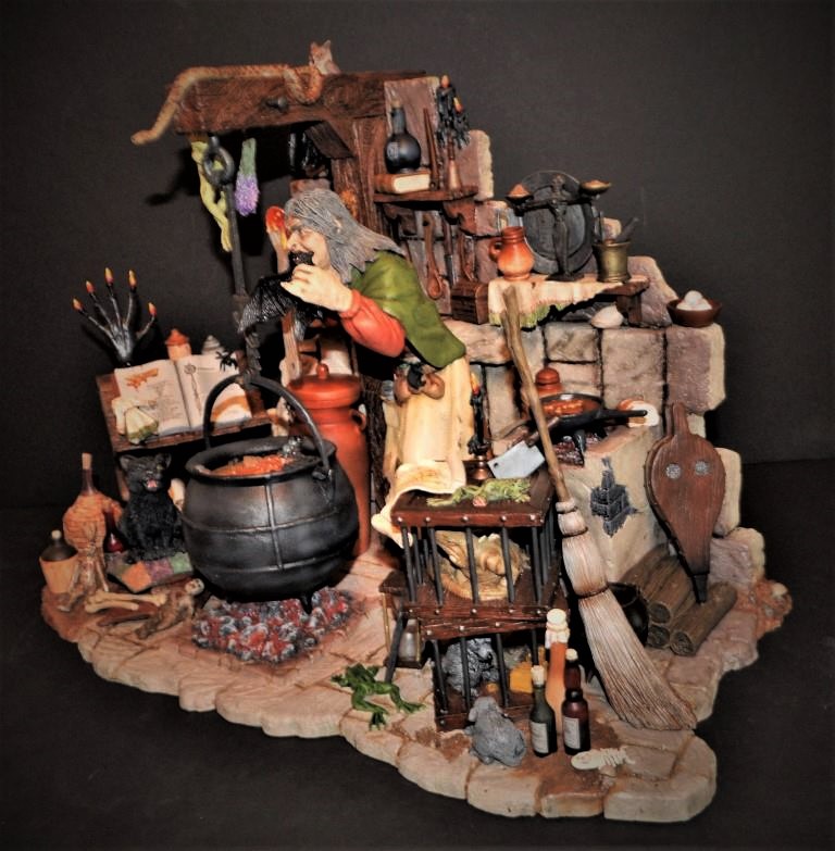 *Kit Description: This is 1 of 50 resin kits of a classic and researched witch in her abode with all the extras. Todd from Tweeterhead only produced 50 about 12 years back and I was fortunate to get one. There are many hours of work in this and I picked up new techniques and turned out a professional quality kit. It features all the traditional items a classic witch would have in her hovel and is loaded with detail. It is about 19″ wide, 12″ deep, and 15″ tall. It is fairly heavy being of resin and I will have FedEx pack and ship it which will be somewhat costly. Local pickup can also be done.