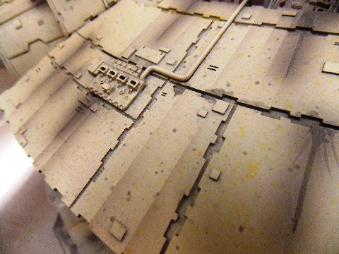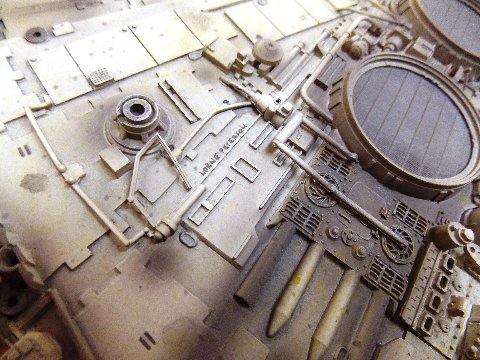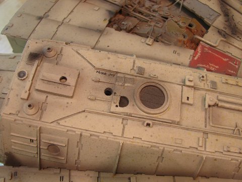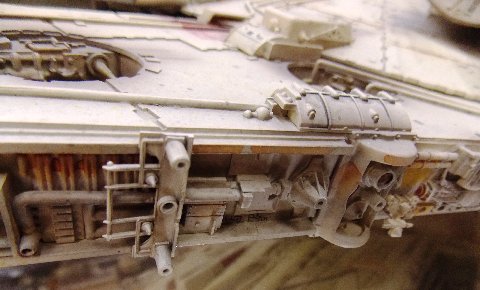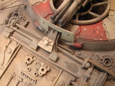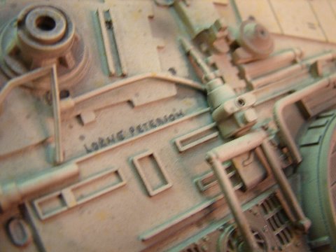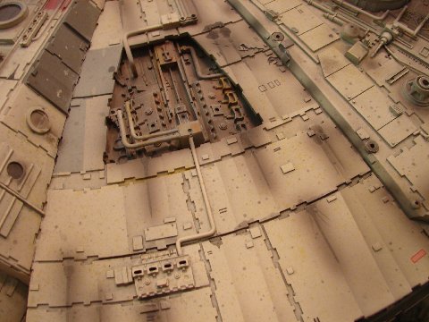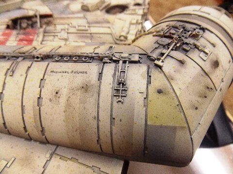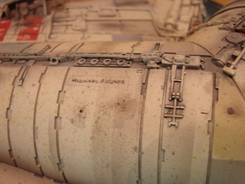-The original model was also covered in an extensive “spatter pattern” done in three different colors (tan, gray, and yellow). The MR model has some of it, but I repainted it to match as exactly as practical. It is interesting to note that the spatter doesn’t appear in most photos I have seen on-line, as it usually gets washed out by the lighting, but when you see the model very-up-close, it is readily apparent. I also matched all of the weathering as closely as-possible. I worked on one section at a time, noting and adding each streak, stain, and the various markings in that section before moving onto the next section. So using all of this info, I spent over 70 hours completely repainting and re-working the MR model. I am not aware of anyone else who has used this combination of the very-