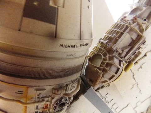 -Lucasfilm would also not allow us to put any “English text” on any of the MR replicas. But the original filming model was covered in names from the various ILM artists and in-jokes. I had extensively photographed all of these, and I added them to my model; some in rapidograph pen, some in pencil. I carefully matched the writing styles; one was even in Korean! Some markings are down in crevices, so unless you had hands-on access like I did, you wouldn’t even know there were there.