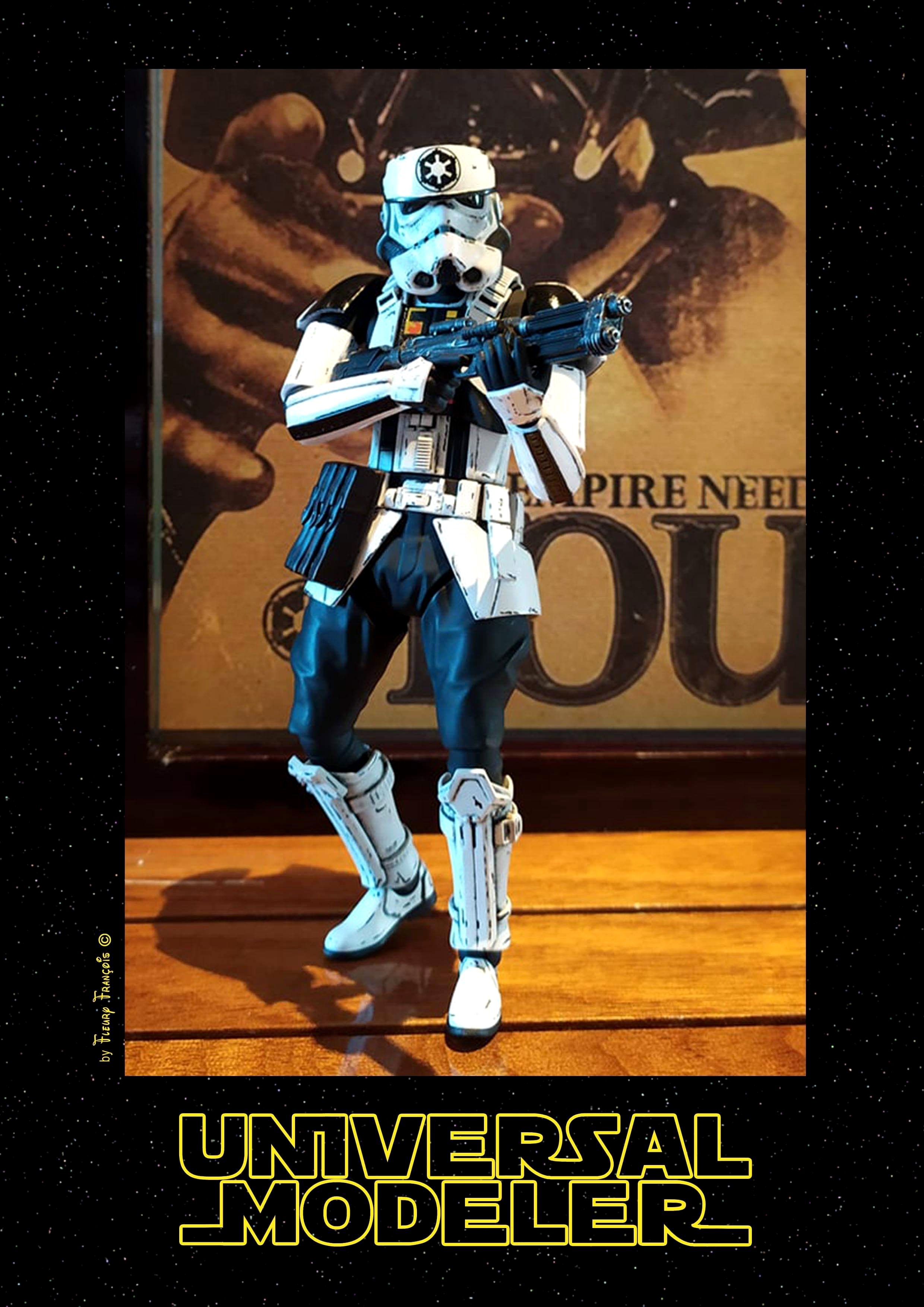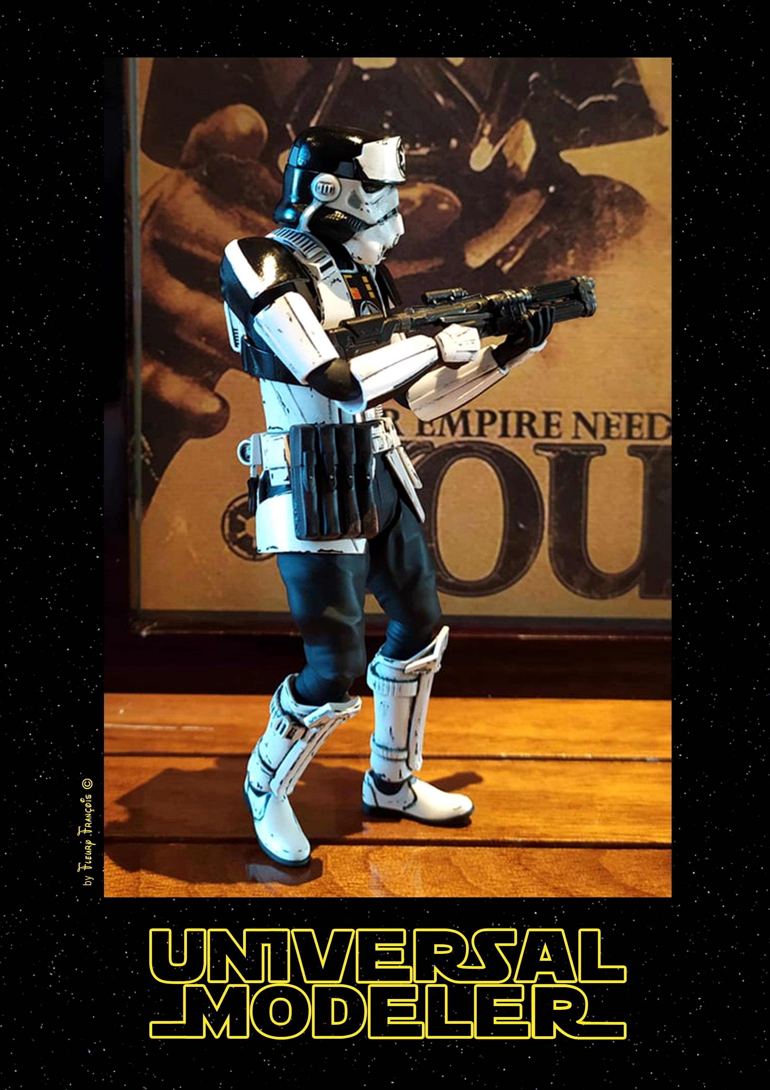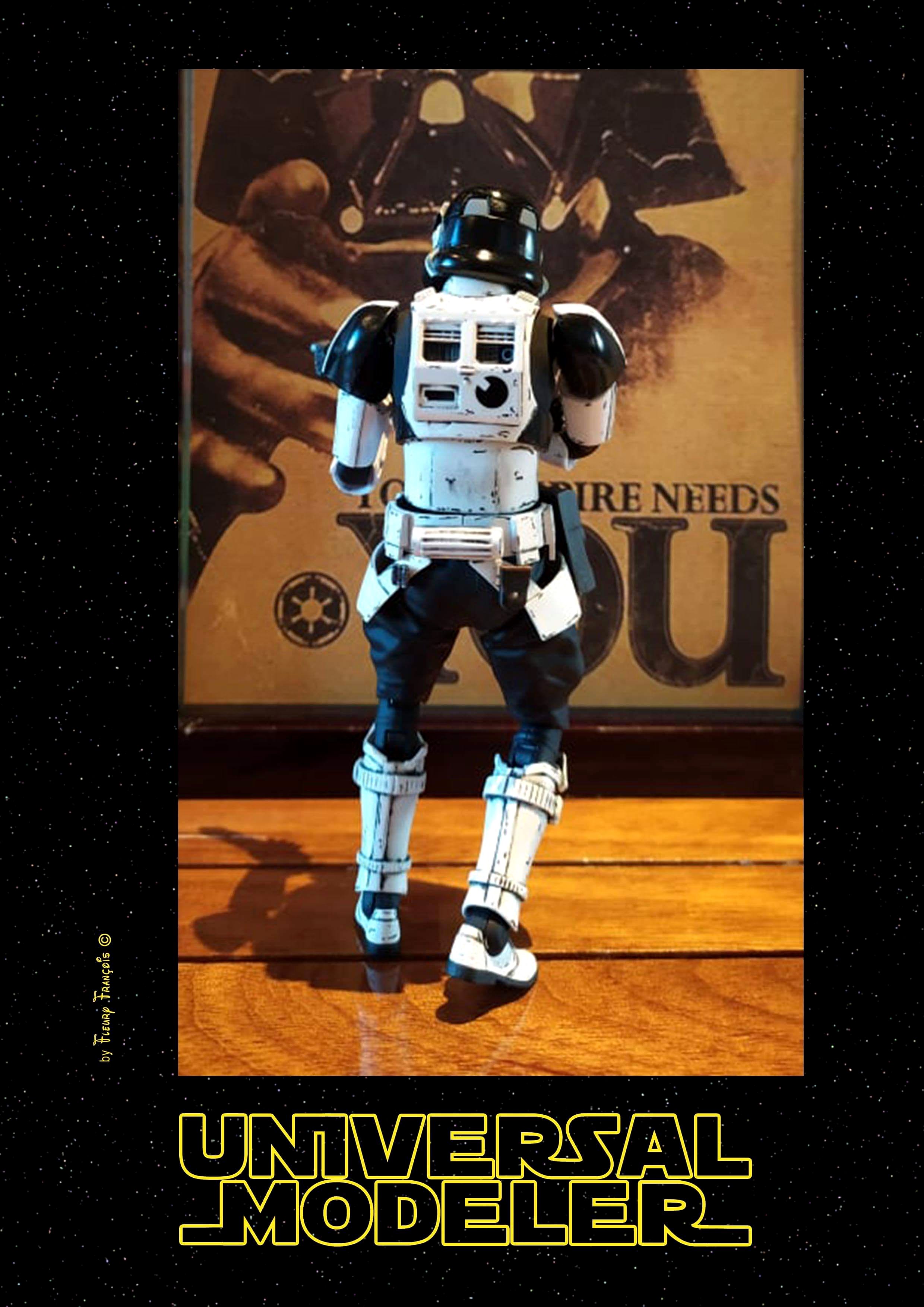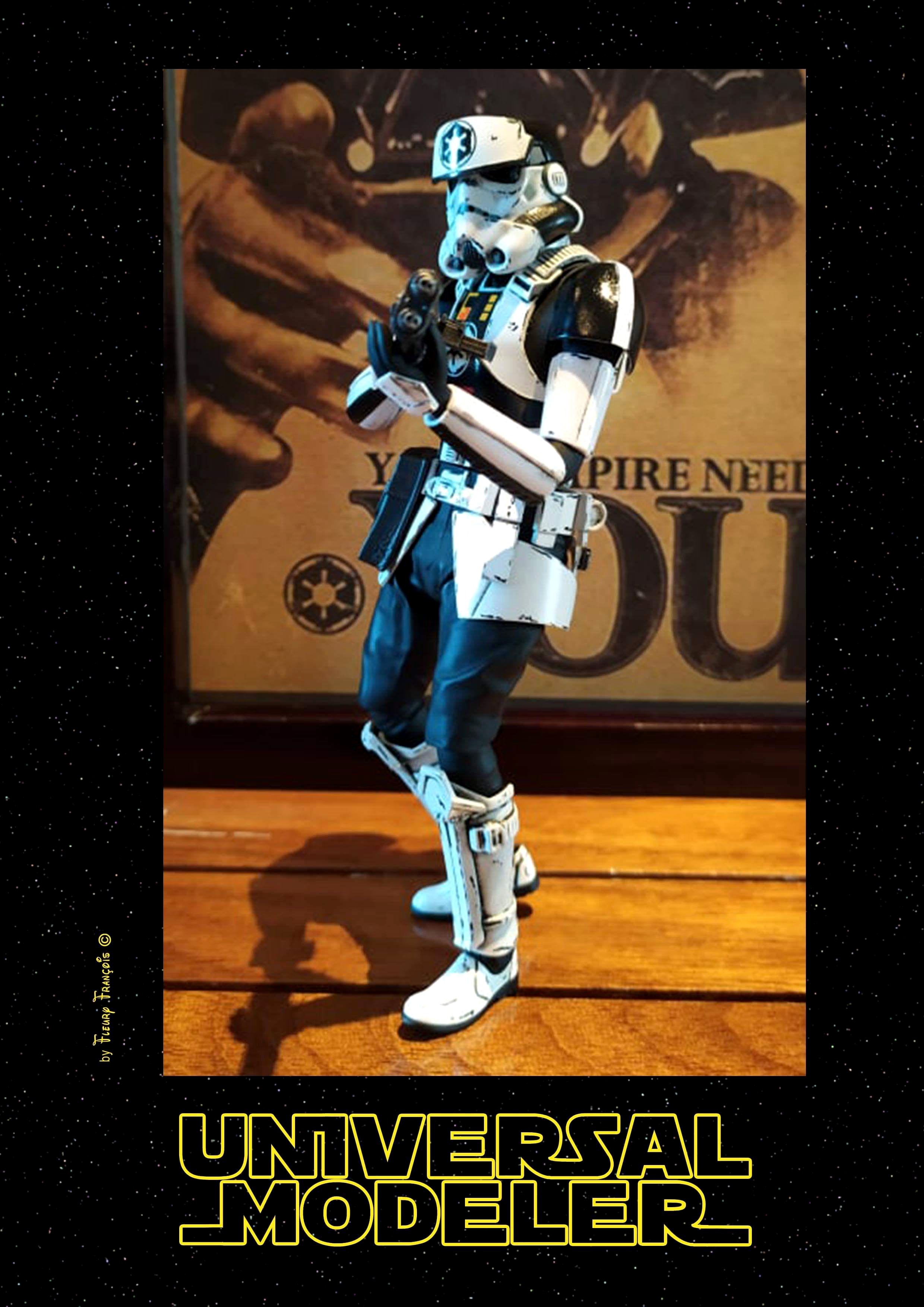 France artist François Fleury (aka Universal Modeler) has done beautiful work on this 1/12 Bandai Trooper… a Shoretrooper and Stormtrooper mix! He call this Trooper “Coptrooper”. I love it!