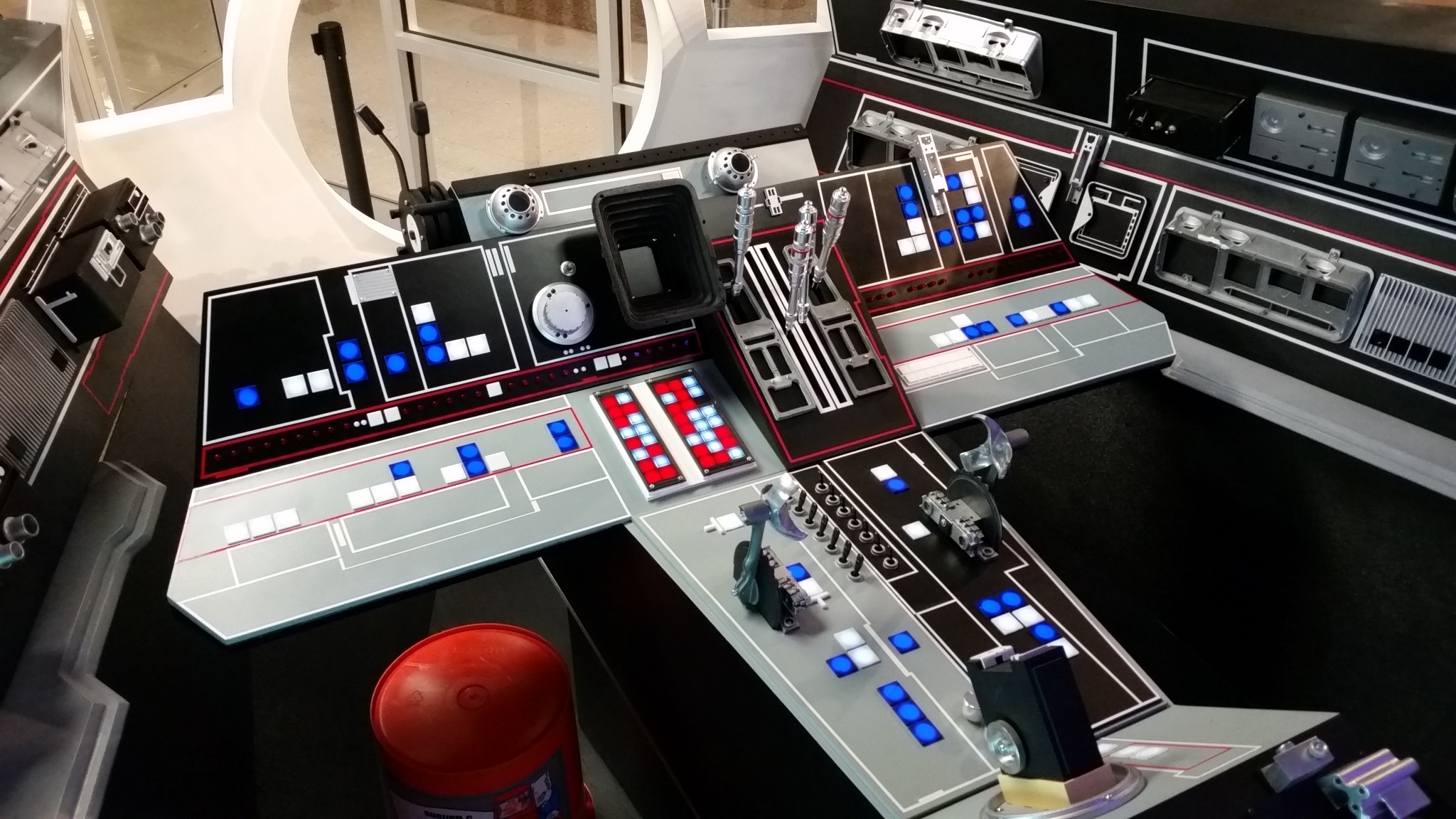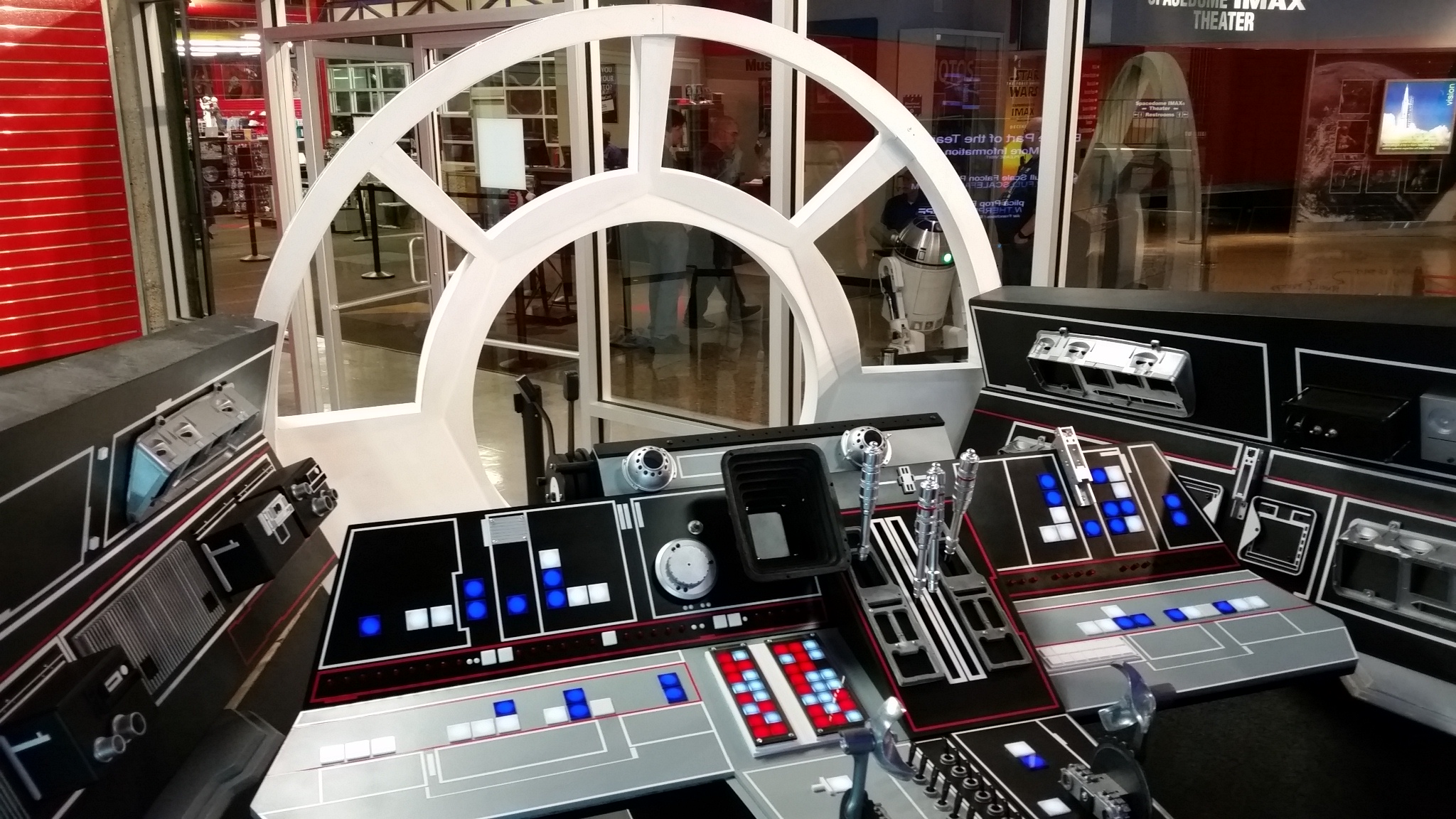 Just thought I would send a few photos of the updated Full Scale Falcon Project. In short, the team was invited to display the project at the Huntsville Space & Rocket Center during the premiere of EP VII. With only 4 weeks until the premiere, long and sleepless nights were spent getting the cockpit wired up with the 1200+ LEDs and sounds. At one point there were 20+ people working on the cockpit panels to get her ready for the big reveal! We were even able to get the cockpit entrance finished up and painted.