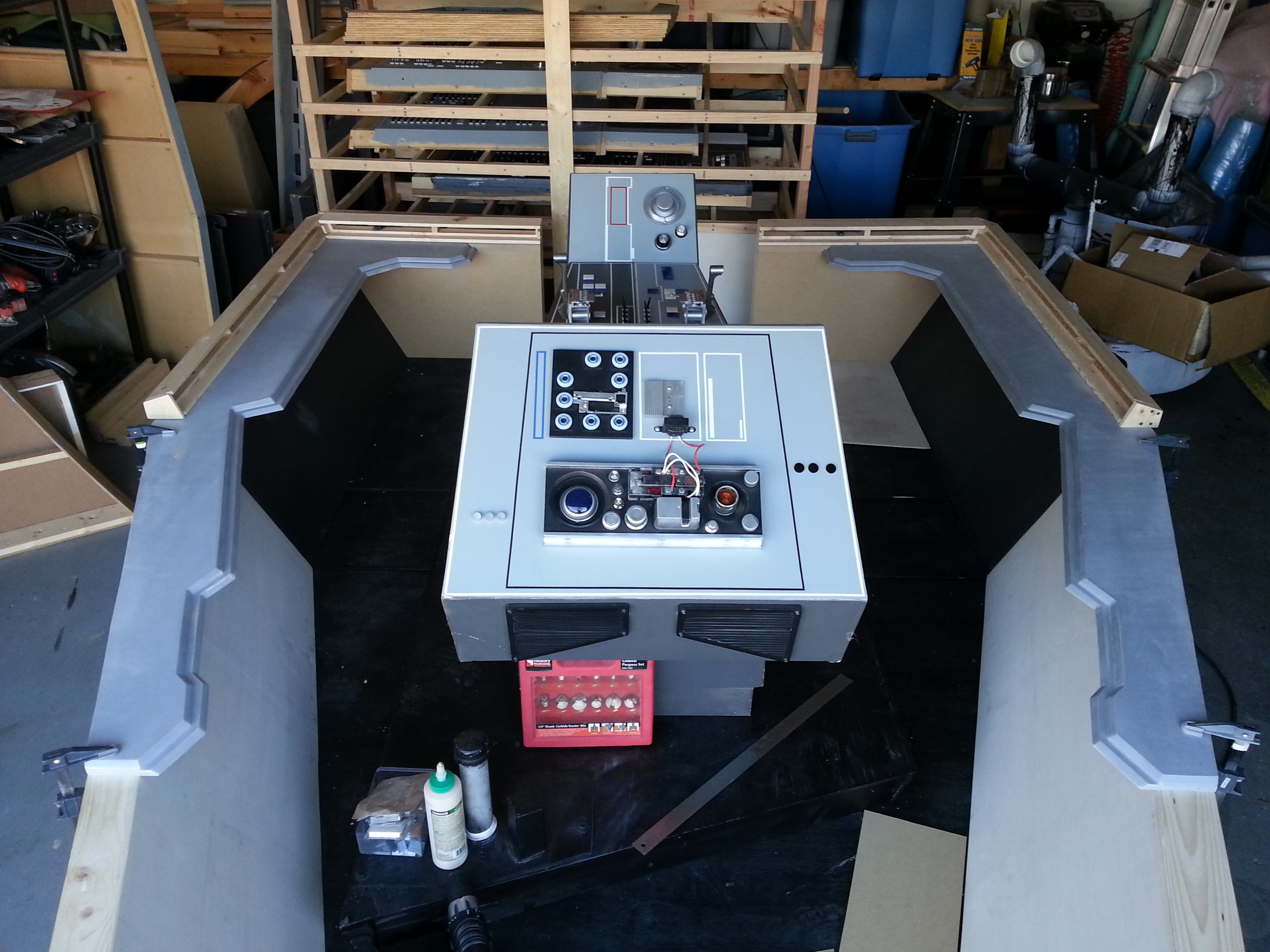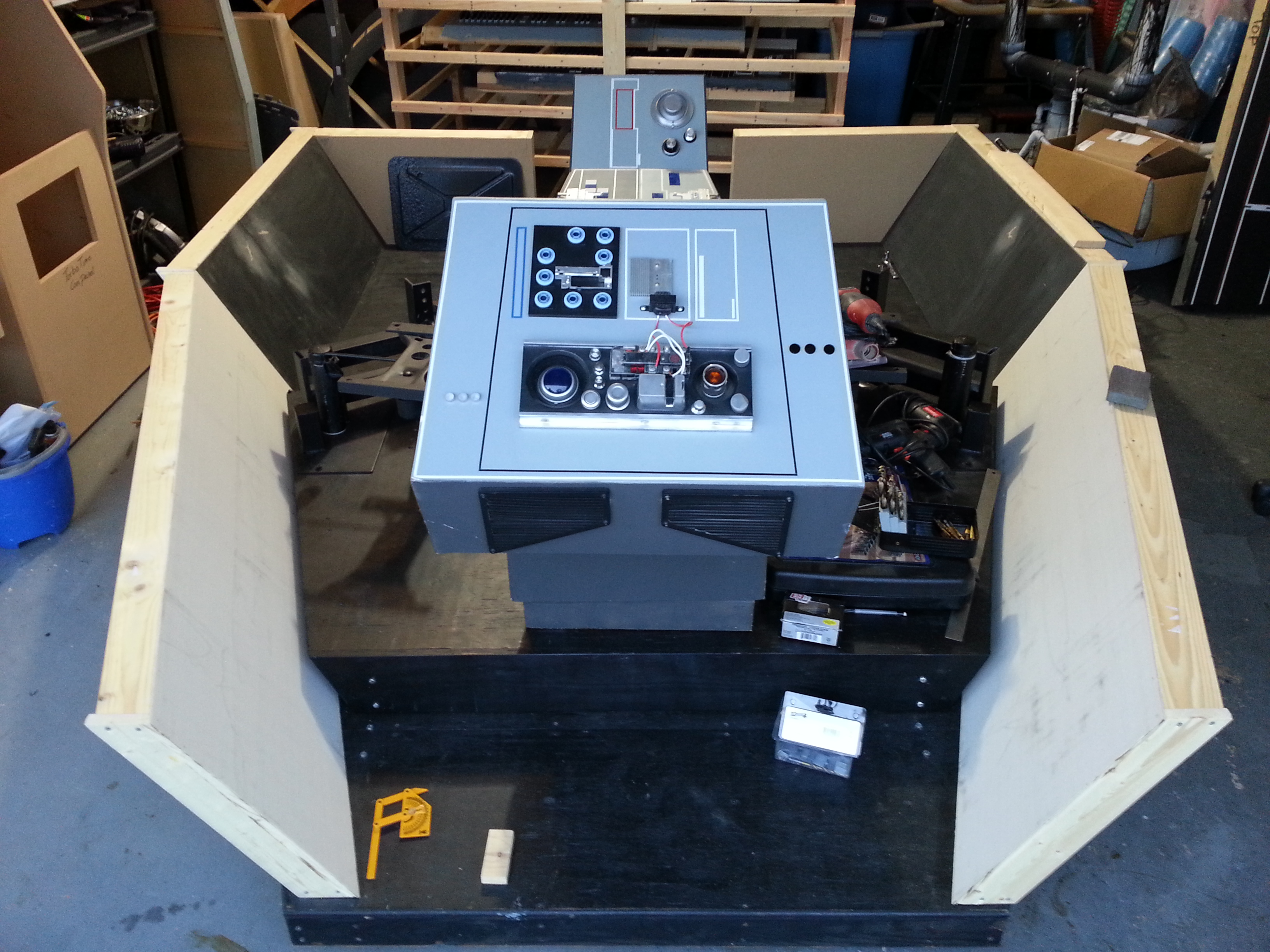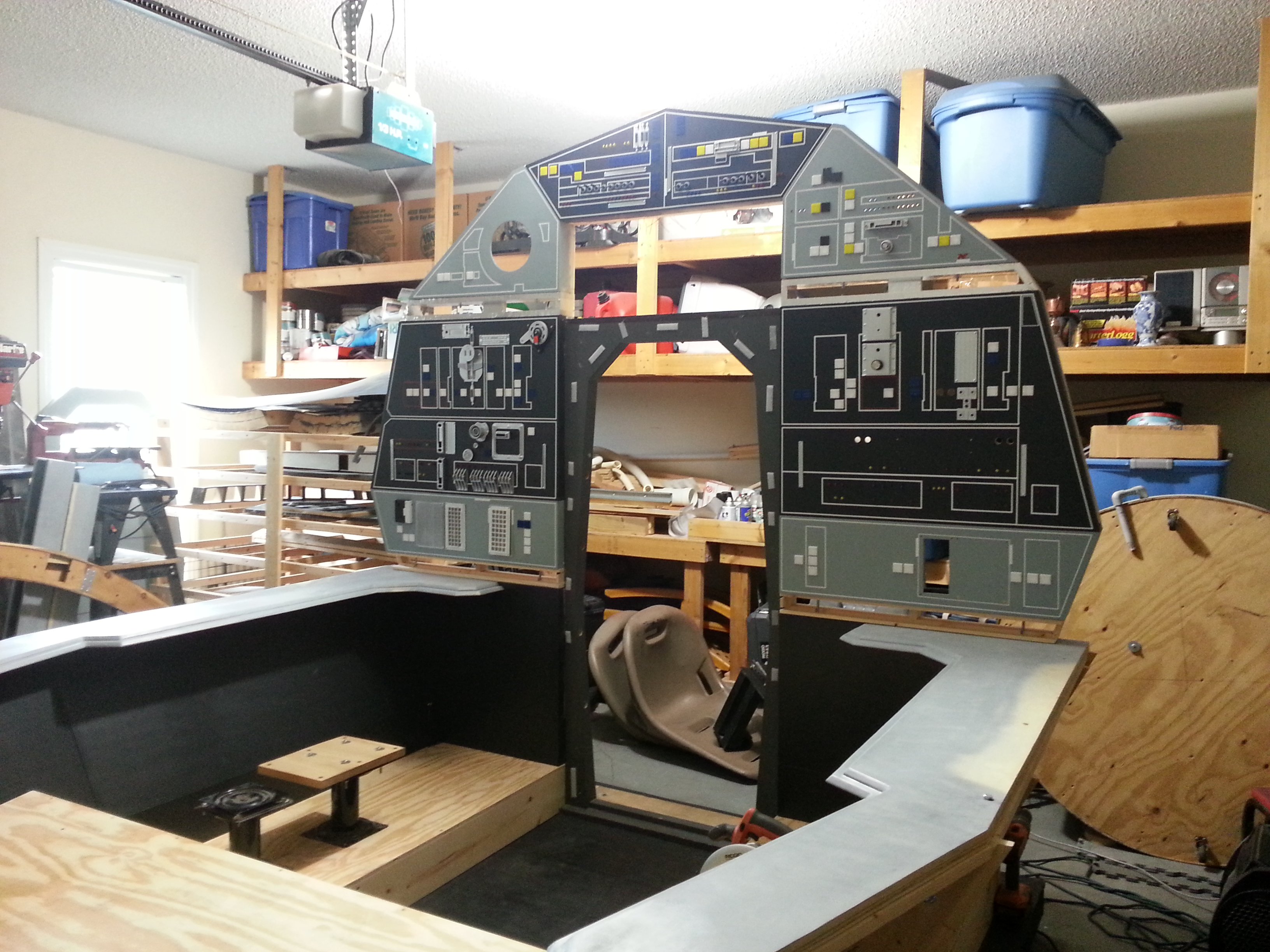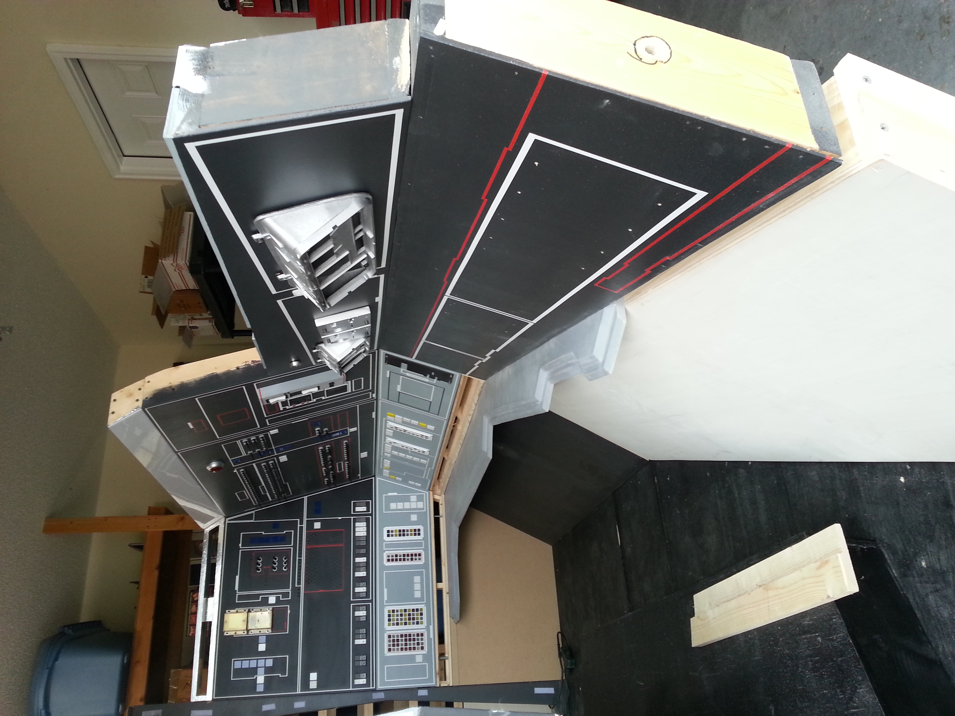 After our last big show, the team sat down and, after seeing how well the backlit tiles looked, decided to go ahead and make a screen accurate reproduction or the ESB cockpit. Most of us were not happy with a hybrid ANH/ESB cockpit. We also felt it was time to replace the aging center console with a CNC version. So we opened the books, scanned the internet and started looking for as many reference pics as we could find. Another HUGE change was the decision to go ahead and add the 12″ I originally removed from the bottom of the cockpit – just so it would fit in the garage! We’ll make it fit!