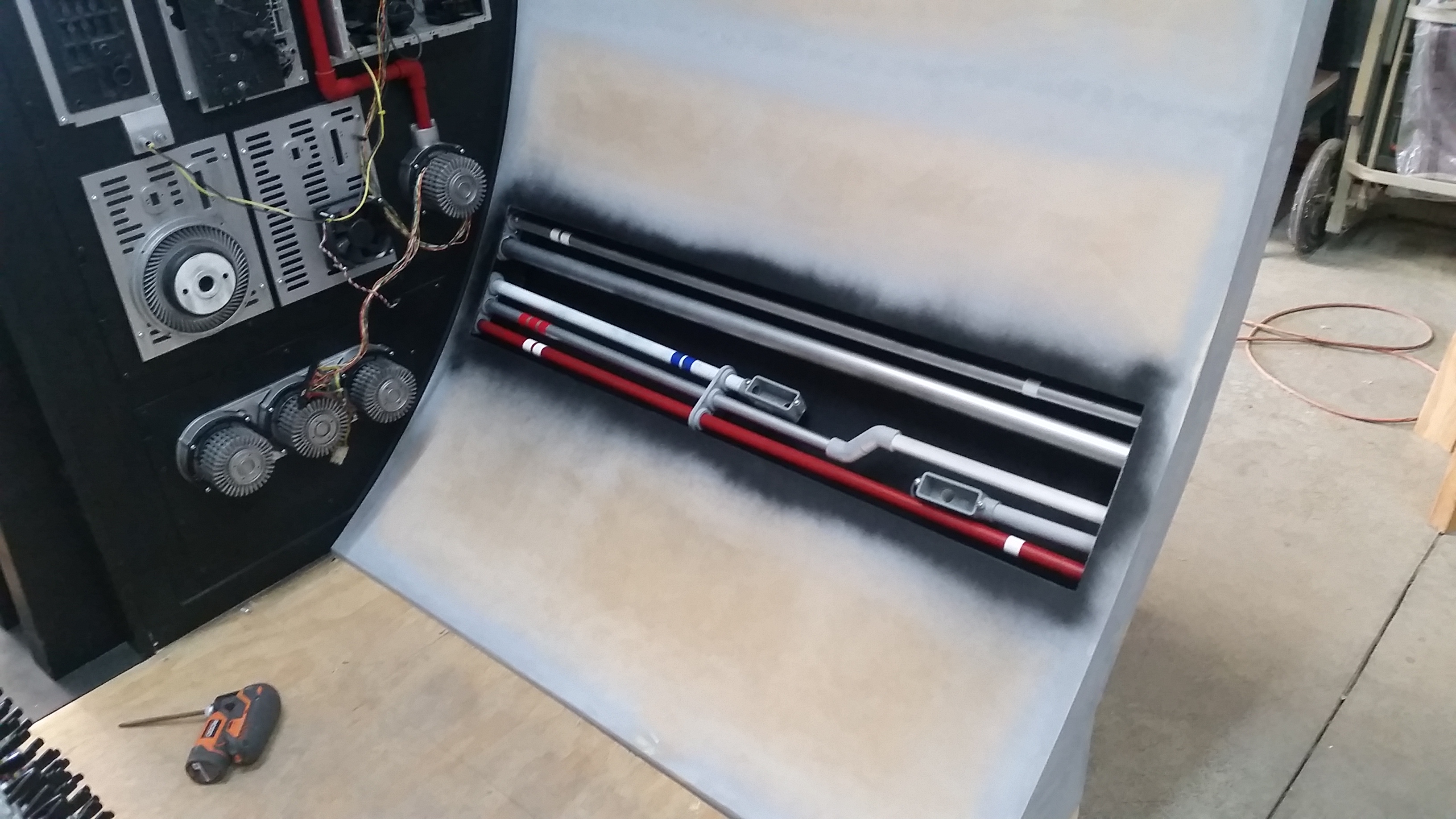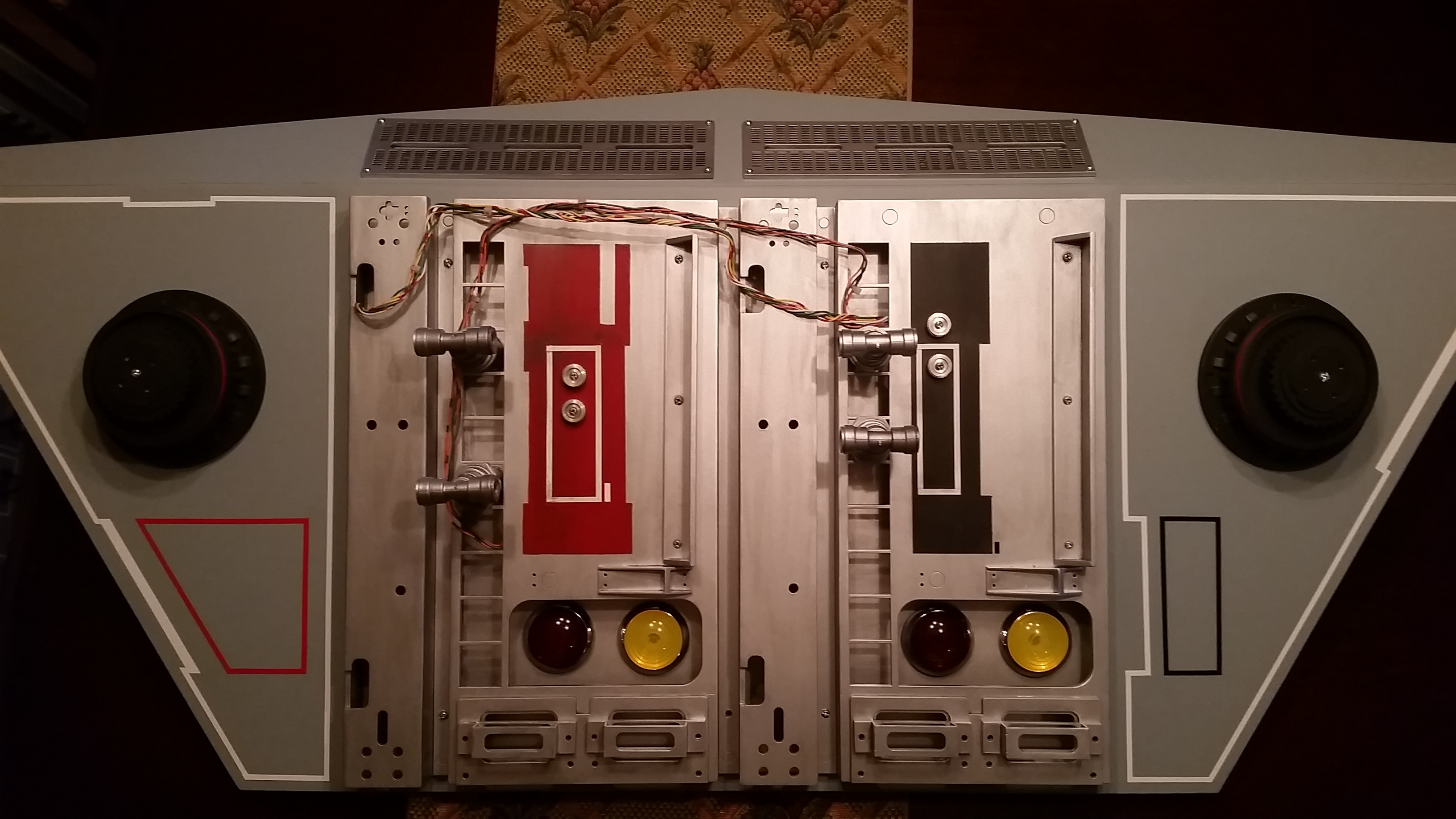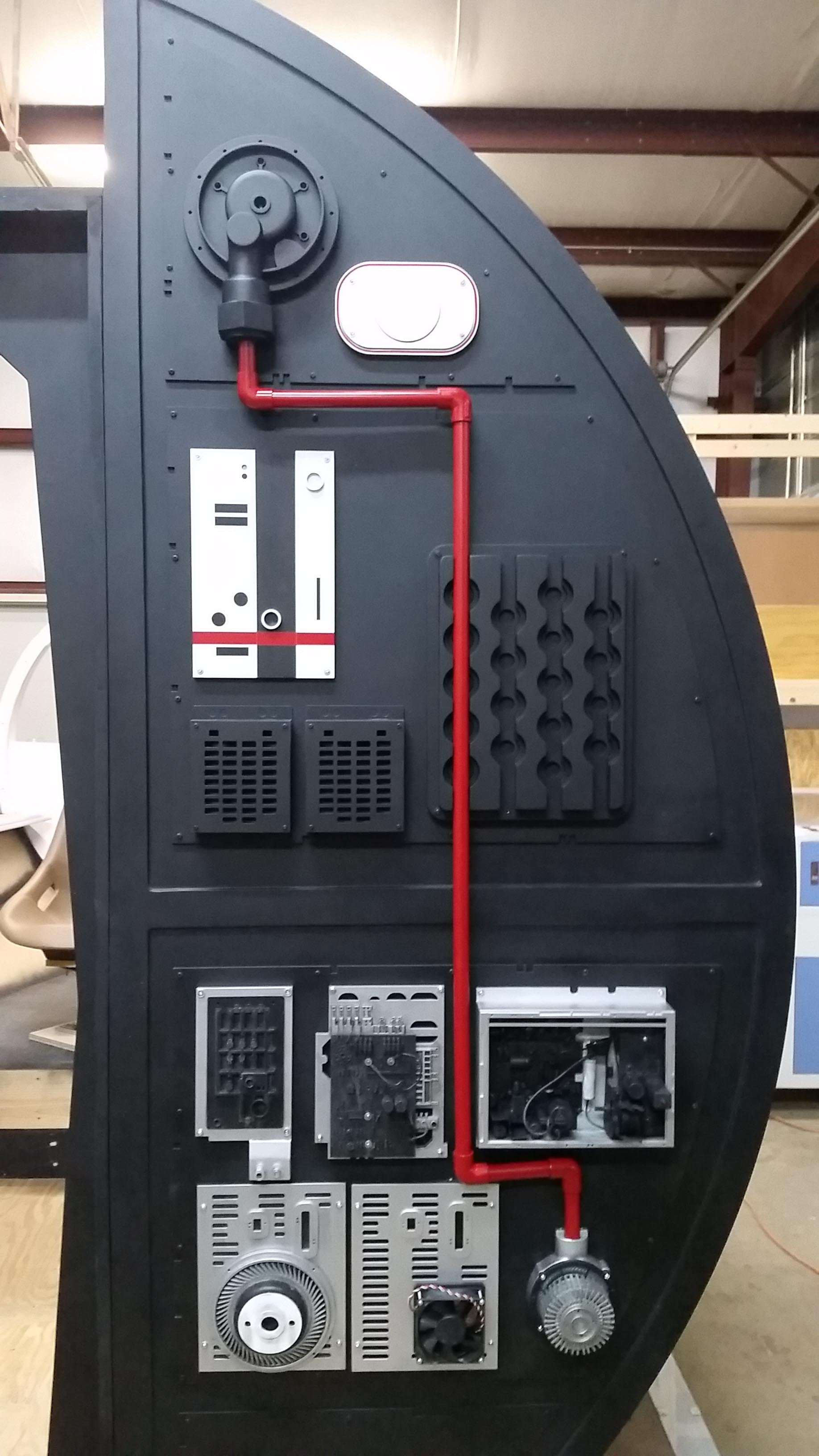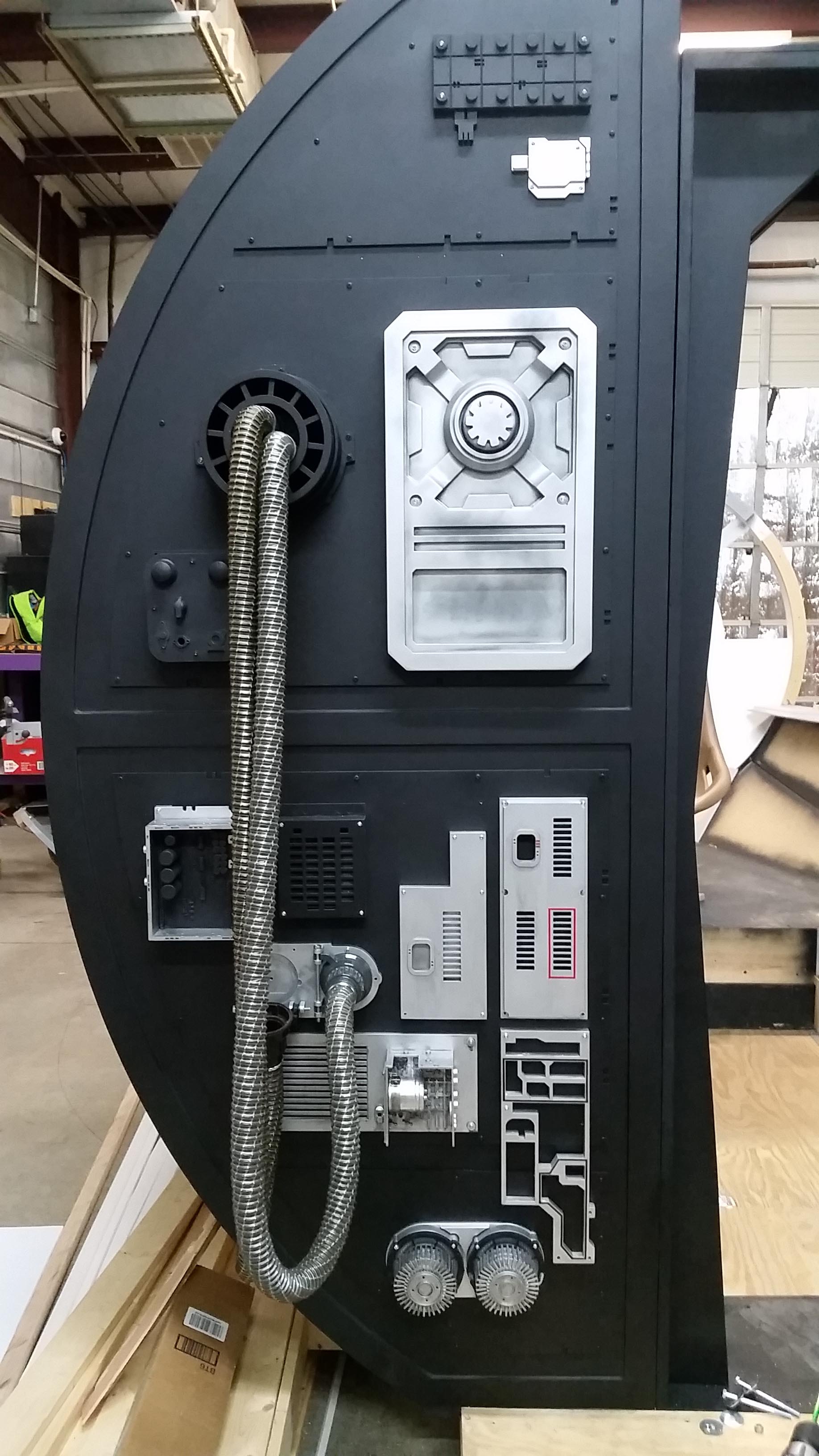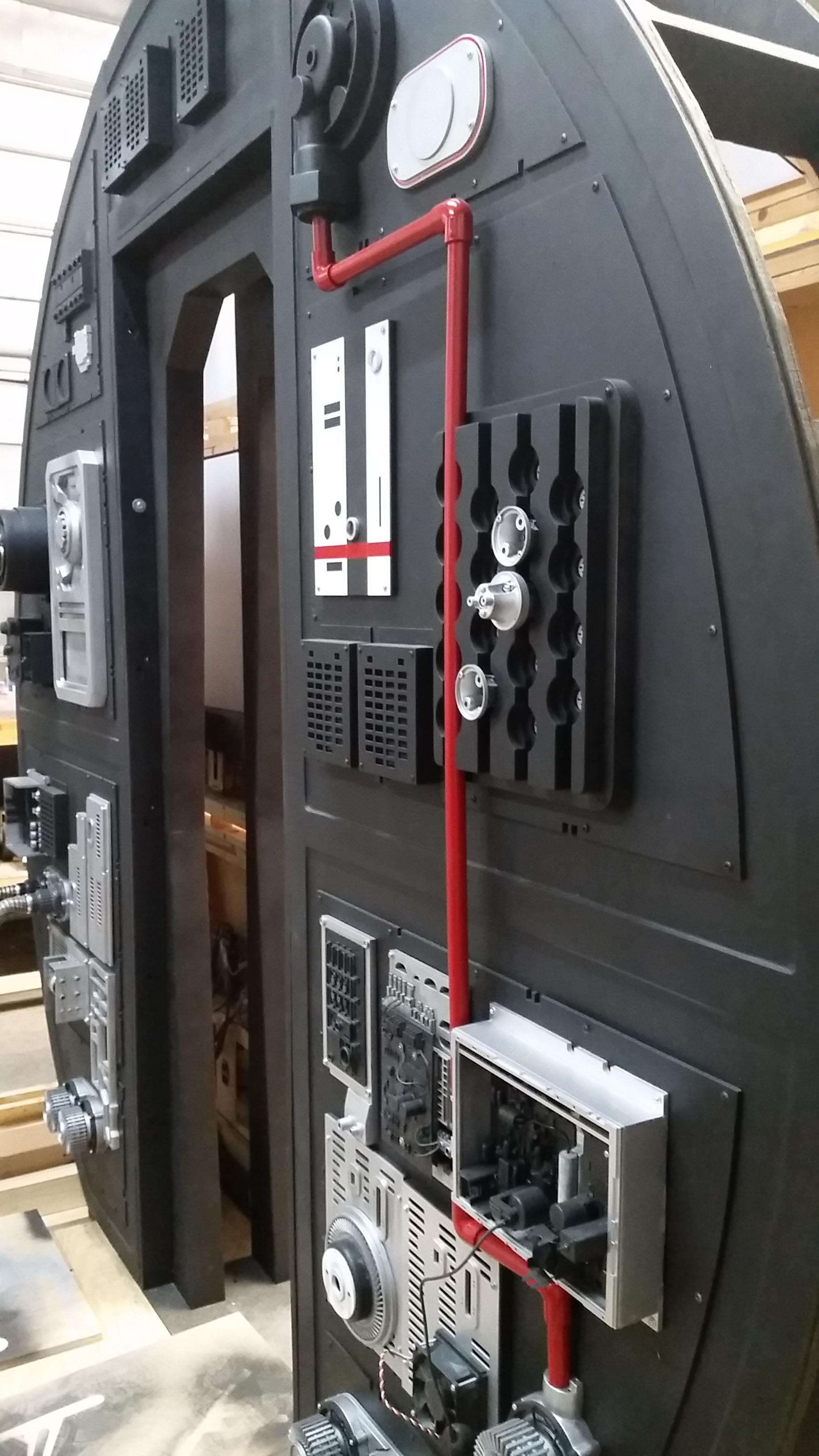 The Full Scale Falcon Project is still moving forward and we’re slowly approaching our 5th year! There have been a LOT of changes and updates to the cockpit since our last update/posting. With the addition of the cockpit entrance (large black wall), I spent and an incredible amount of time and effort recreating all the different greeblies attached to the entrance wall. We’ve built a small portion of the corridor with a “half wall” and exposed panels showing pipes and wiring. I’m strongly considering making a complete corridor ring giving the full effect of being in the corridor.