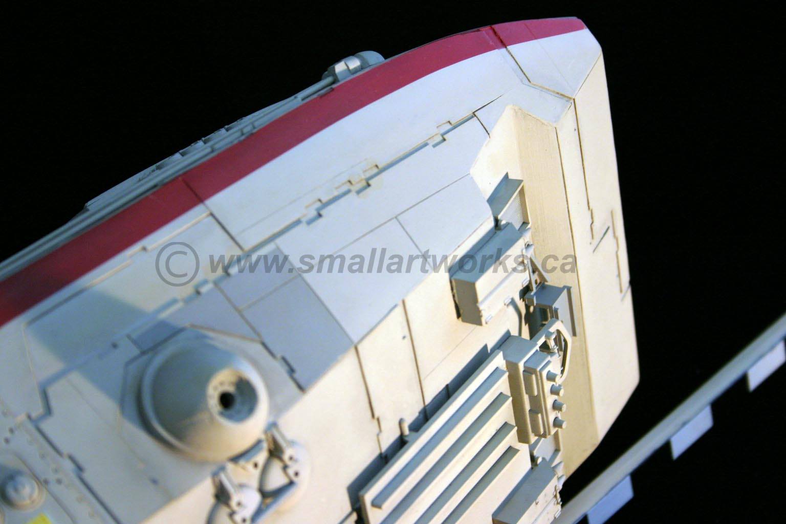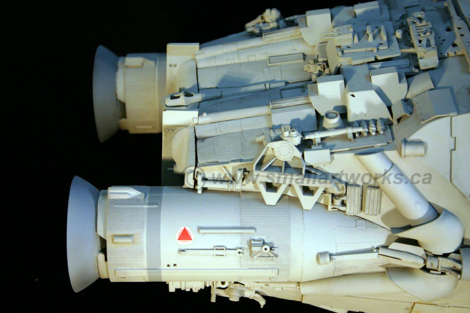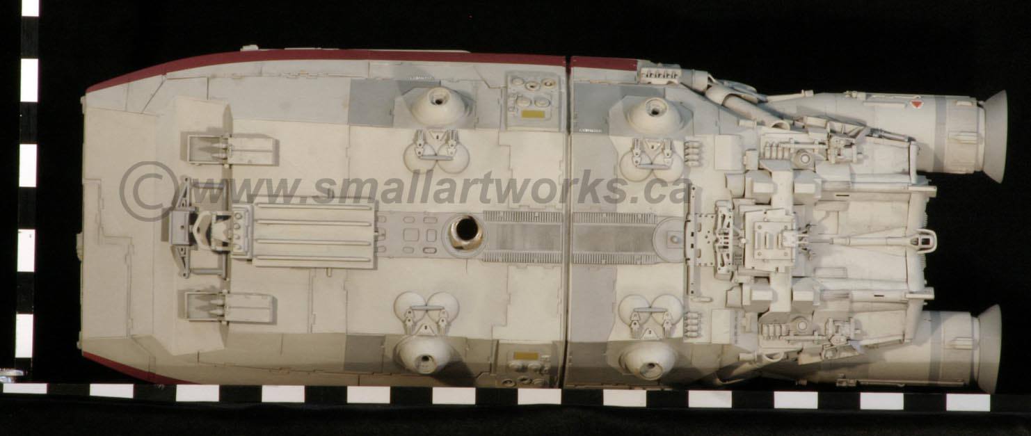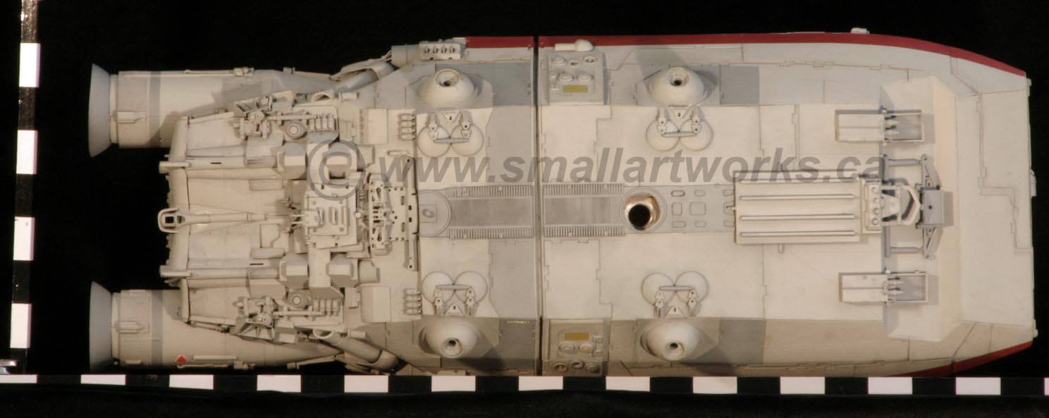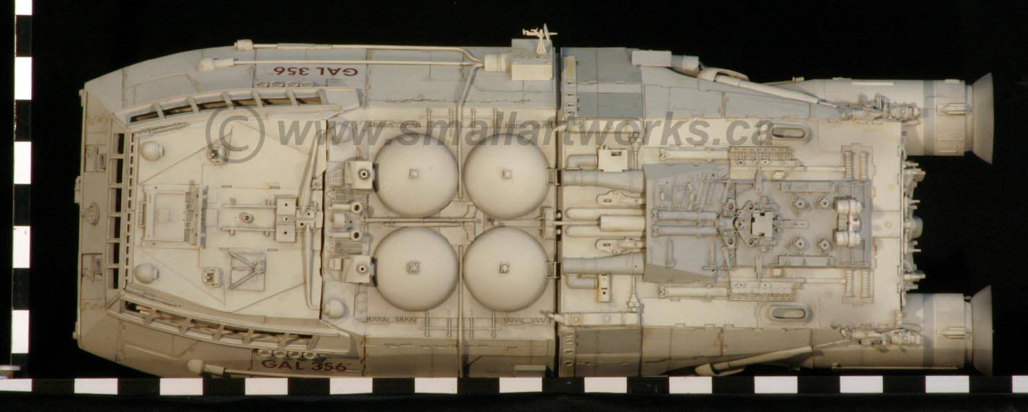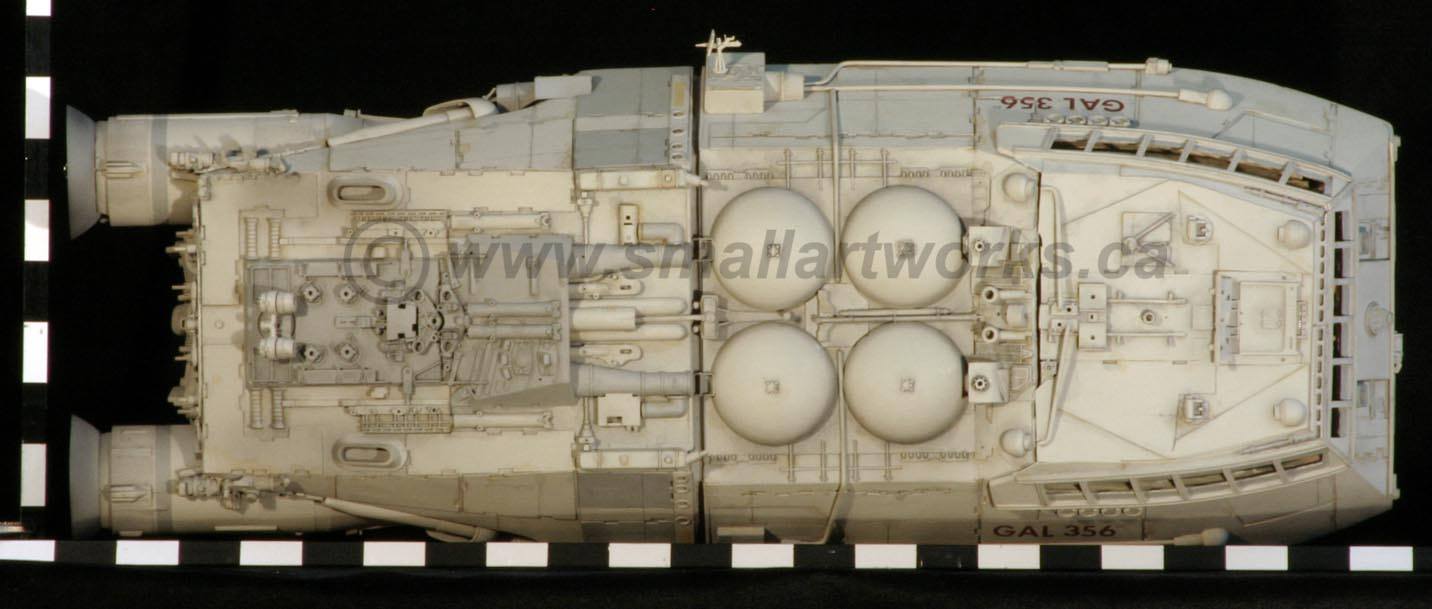 I shot these pictures of the original shuttle in 2008. It was carved from urethane foam clad in sheet plastic and detailed with hundreds of model kit parts. The model was restored a few years earlier by Ed Miarecki who had to re-dress it and repaint it after it had been used in Buck Rogers with a different paint scheme. Several parts on the model are not likely original as a result. However, these are by far the most extensive photos ever taken of the original model. Nobody else has shot it in this much detail at that time. Enjoy.