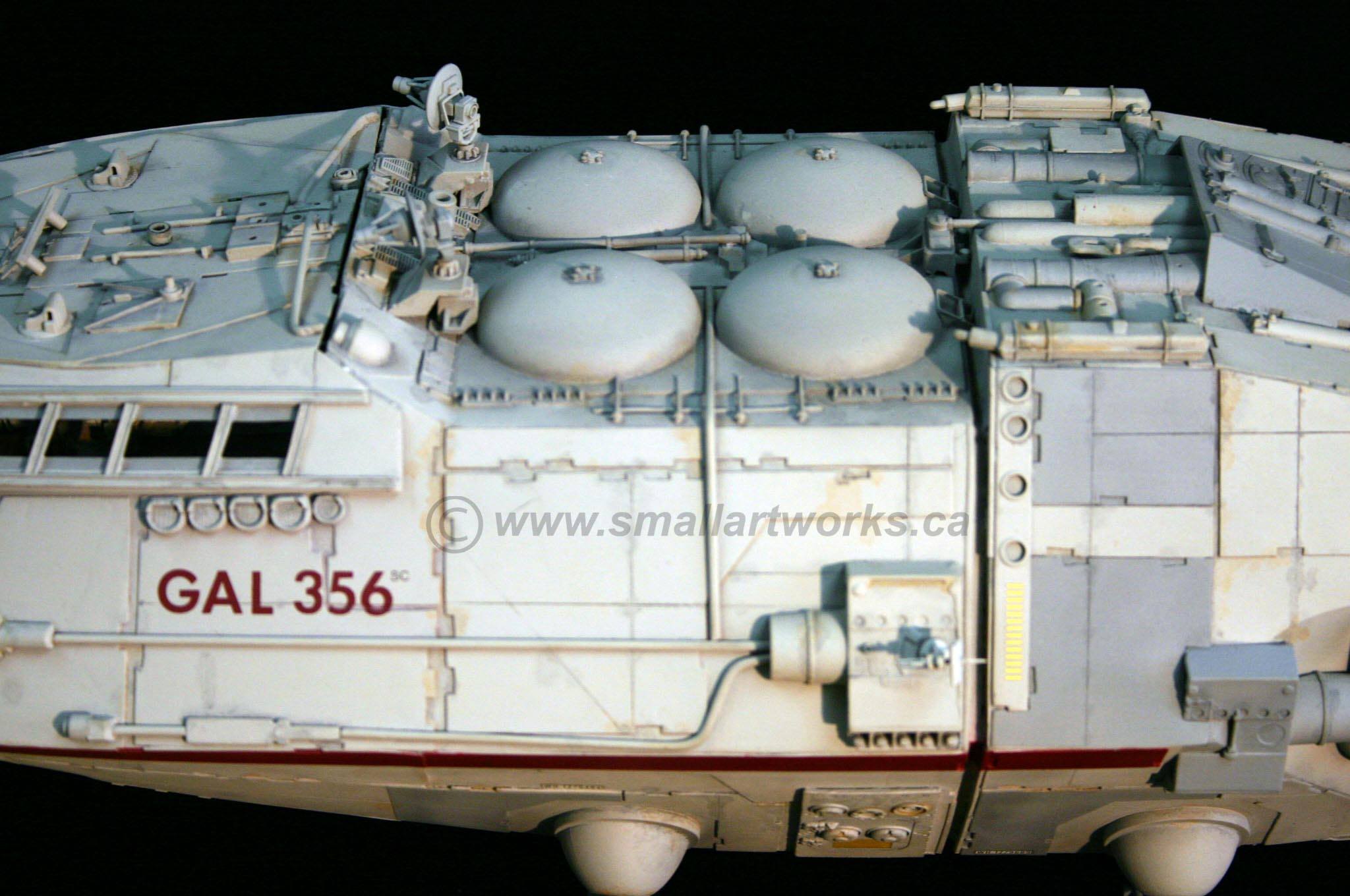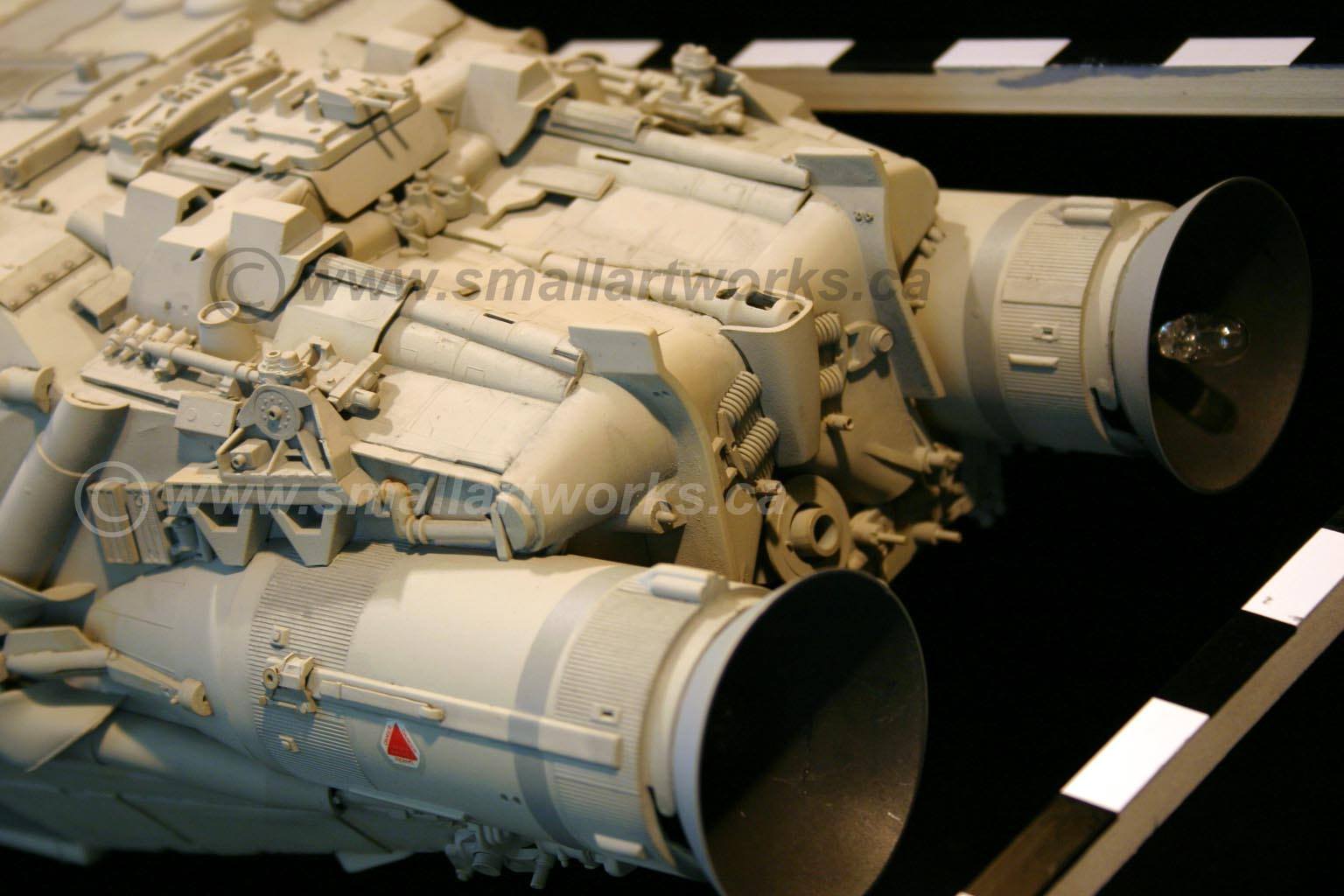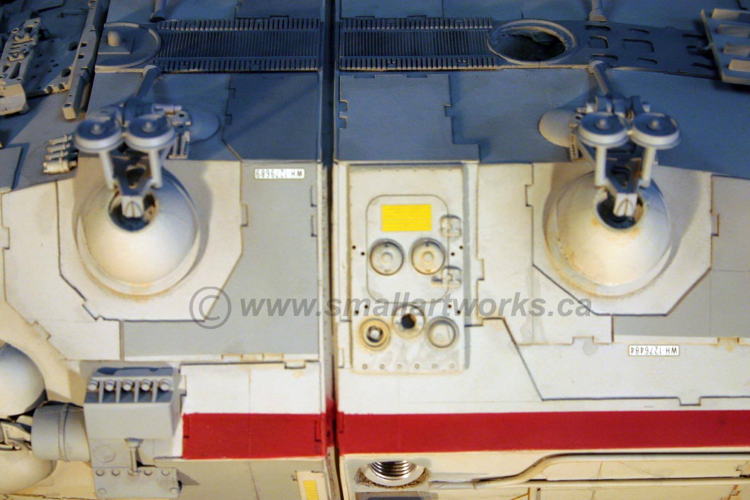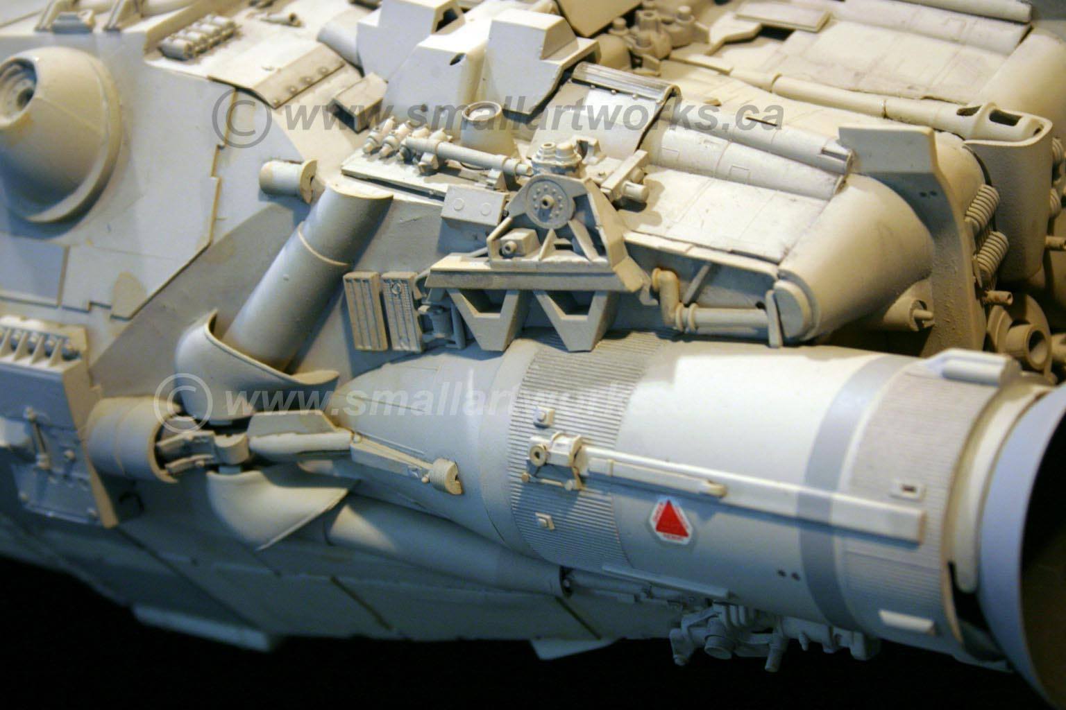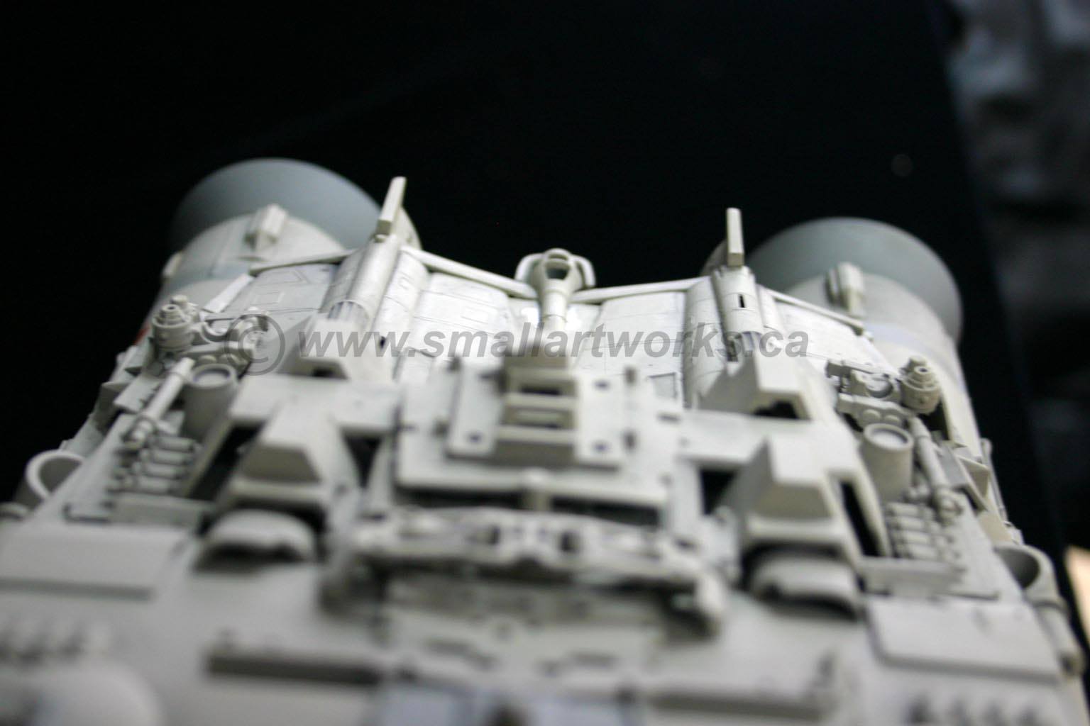 I shot these pictures of the original shuttle in 2008. It was carved from urethane foam clad in sheet plastic and detailed with hundreds of model kit parts. The model was restored a few years earlier by Ed Miarecki who had to re-dress it and repaint it after it had been used in Buck Rogers with a different paint scheme. Several parts on the model are not likely original as a result. However, these are by far the most extensive photos ever taken of the original model. Nobody else has shot it in this much detail at that time. Enjoy.
