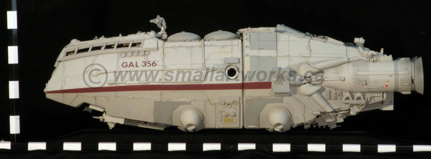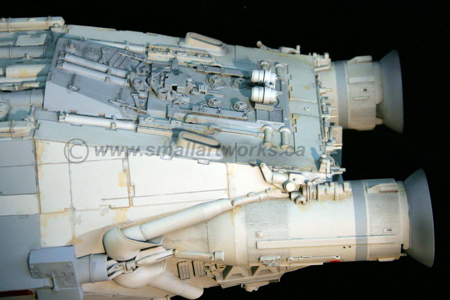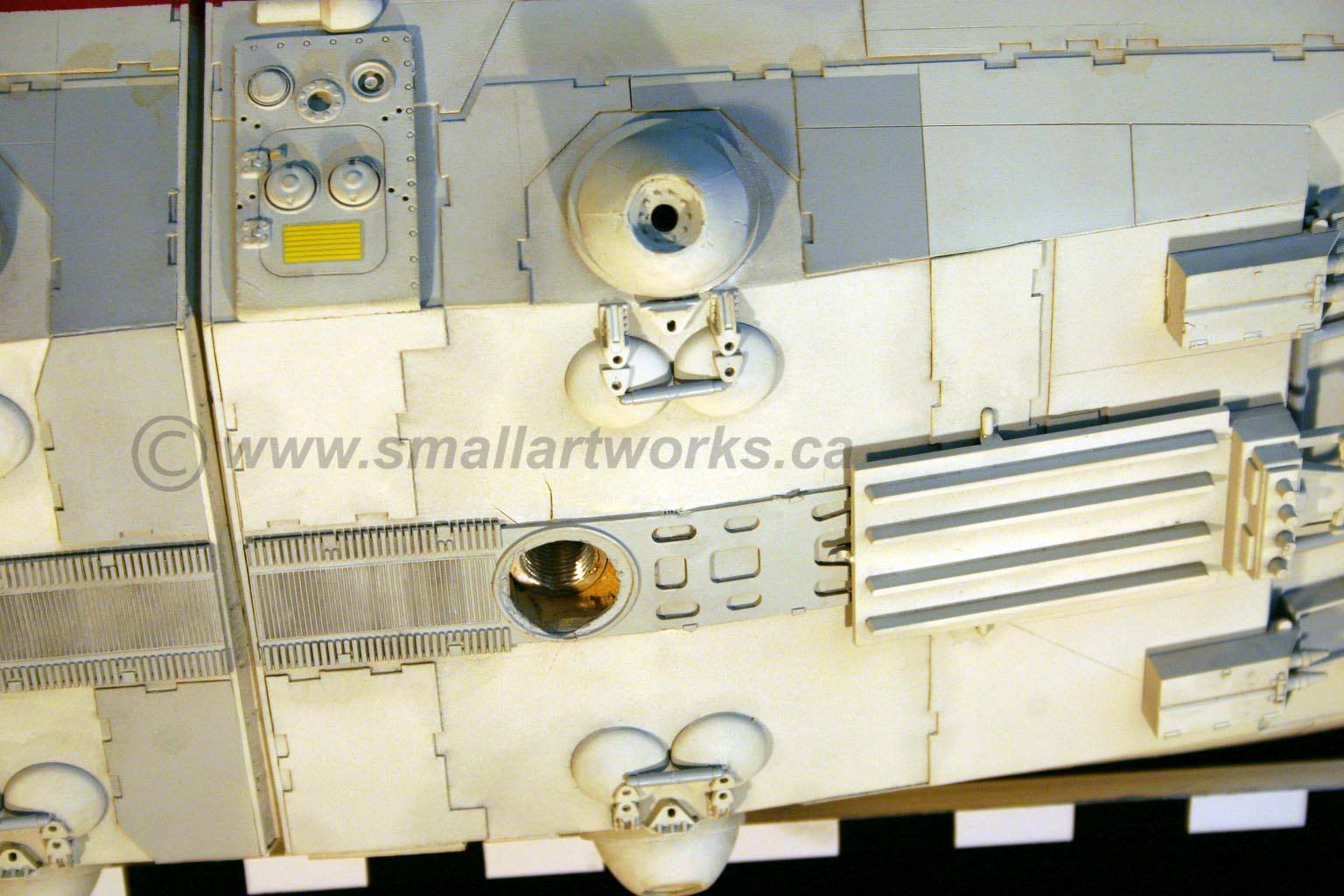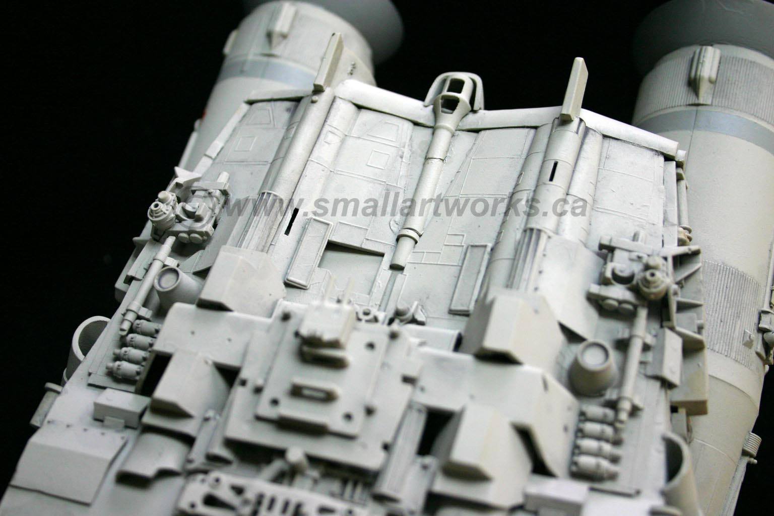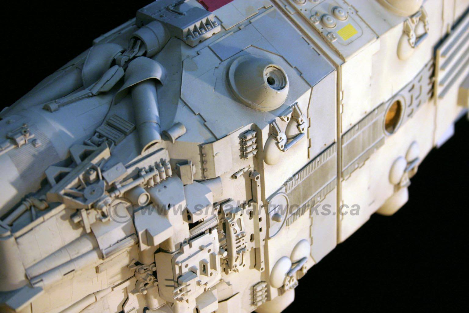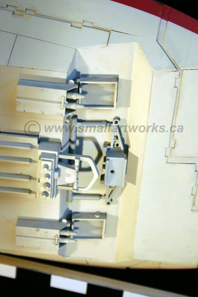 I shot these pictures of the original shuttle in 2008. It was carved from urethane foam clad in sheet plastic and detailed with hundreds of model kit parts. The model was restored a few years earlier by Ed Miarecki who had to re-dress it and repaint it after it had been used in Buck Rogers with a different paint scheme. Several parts on the model are not likely original as a result. However, these are by far the most extensive photos ever taken of the original model. Nobody else has shot it in this much detail at that time. Enjoy.