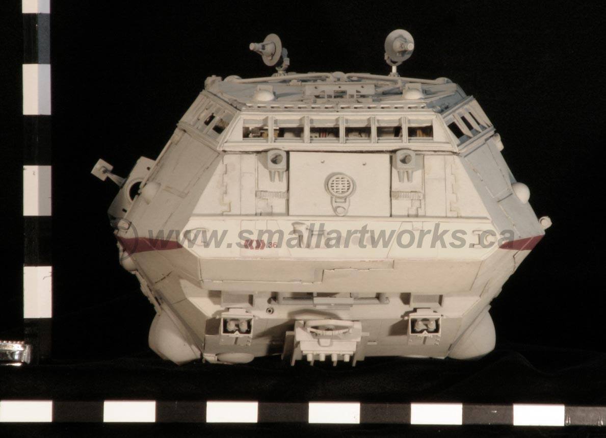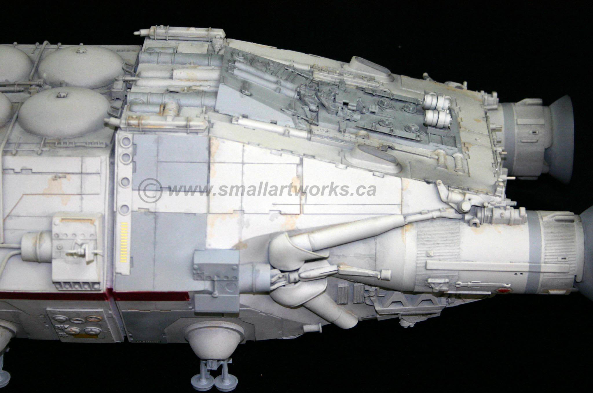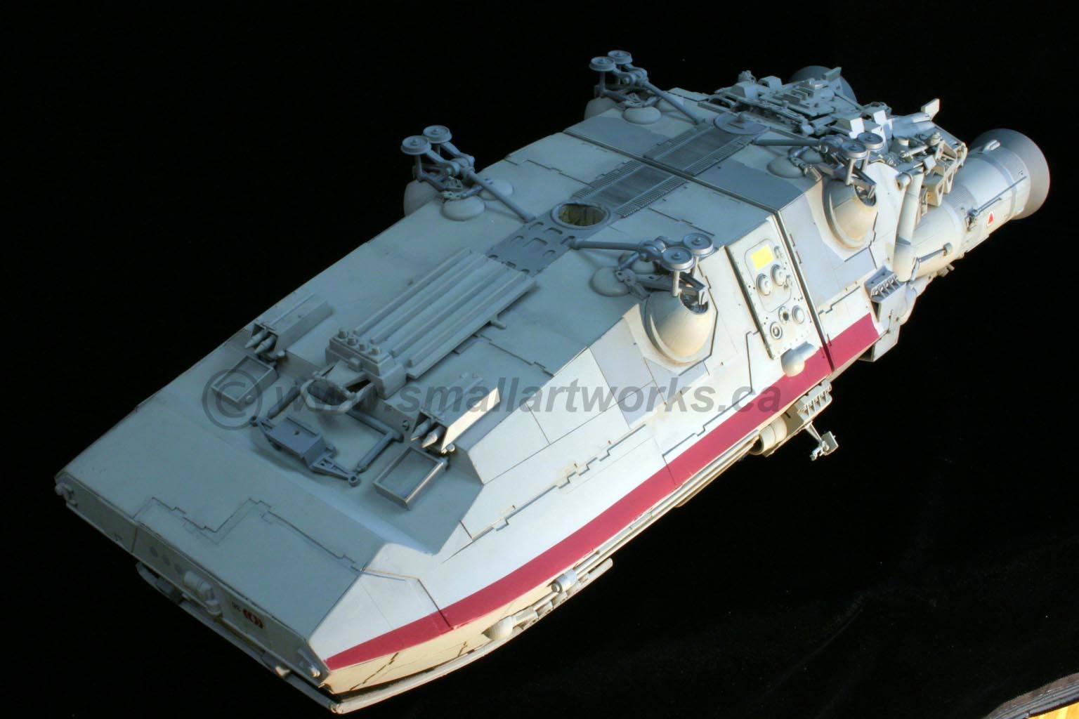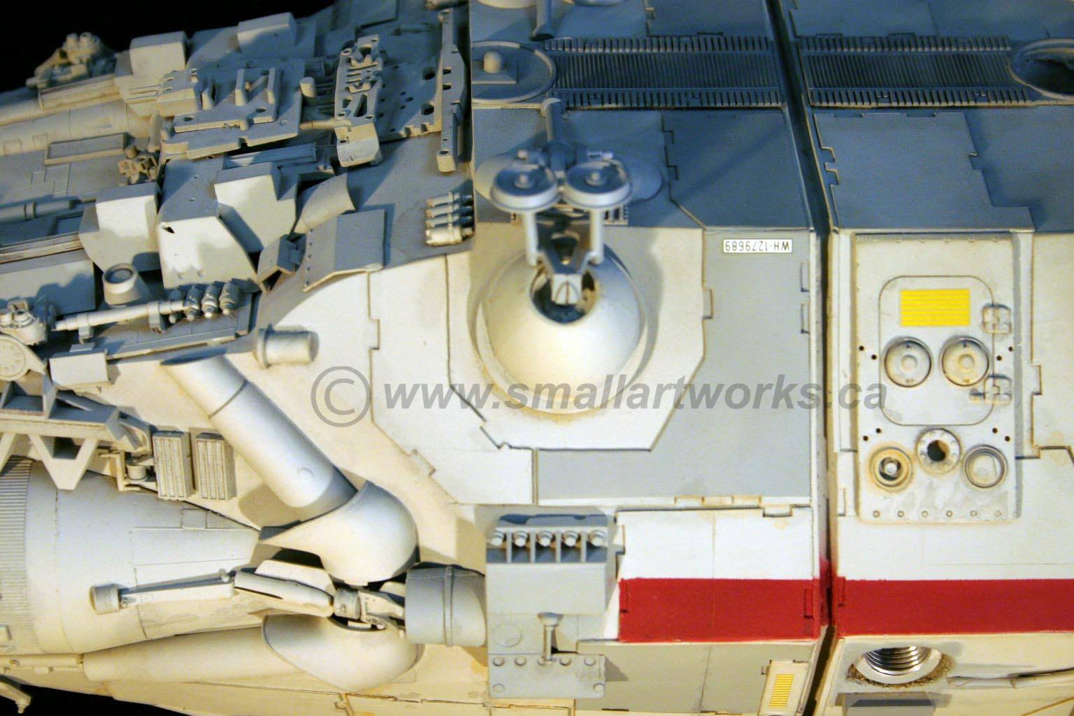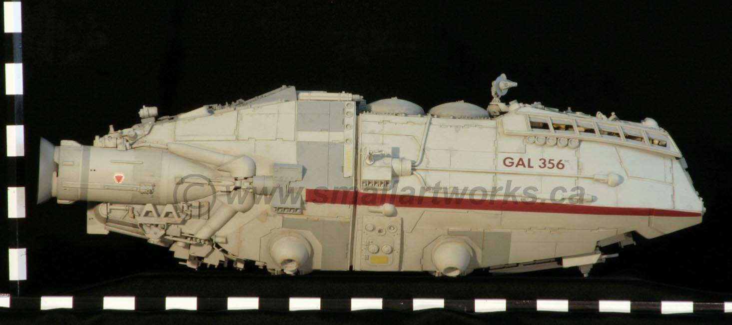 I shot these pictures of the original shuttle in 2008. It was carved from urethane foam clad in sheet plastic and detailed with hundreds of model kit parts. The model was restored a few years earlier by Ed Miarecki who had to re-dress it and repaint it after it had been used in Buck Rogers with a different paint scheme. Several parts on the model are not likely original as a result. However, these are by far the most extensive photos ever taken of the original model. Nobody else has shot it in this much detail at that time. Enjoy.