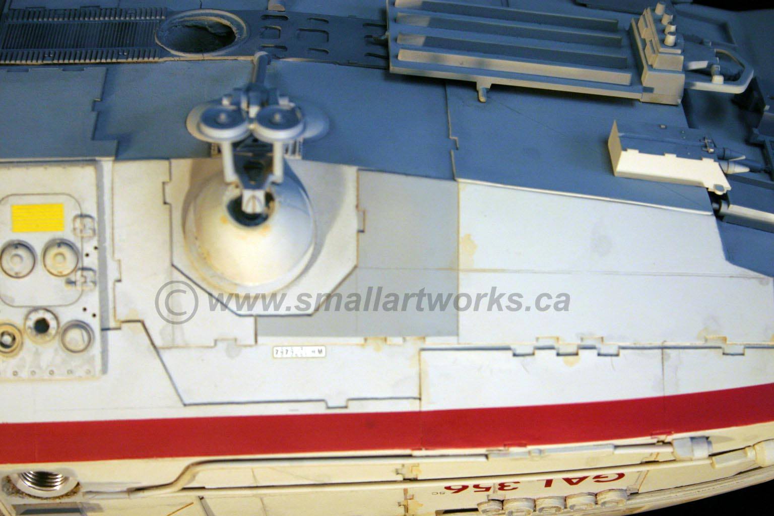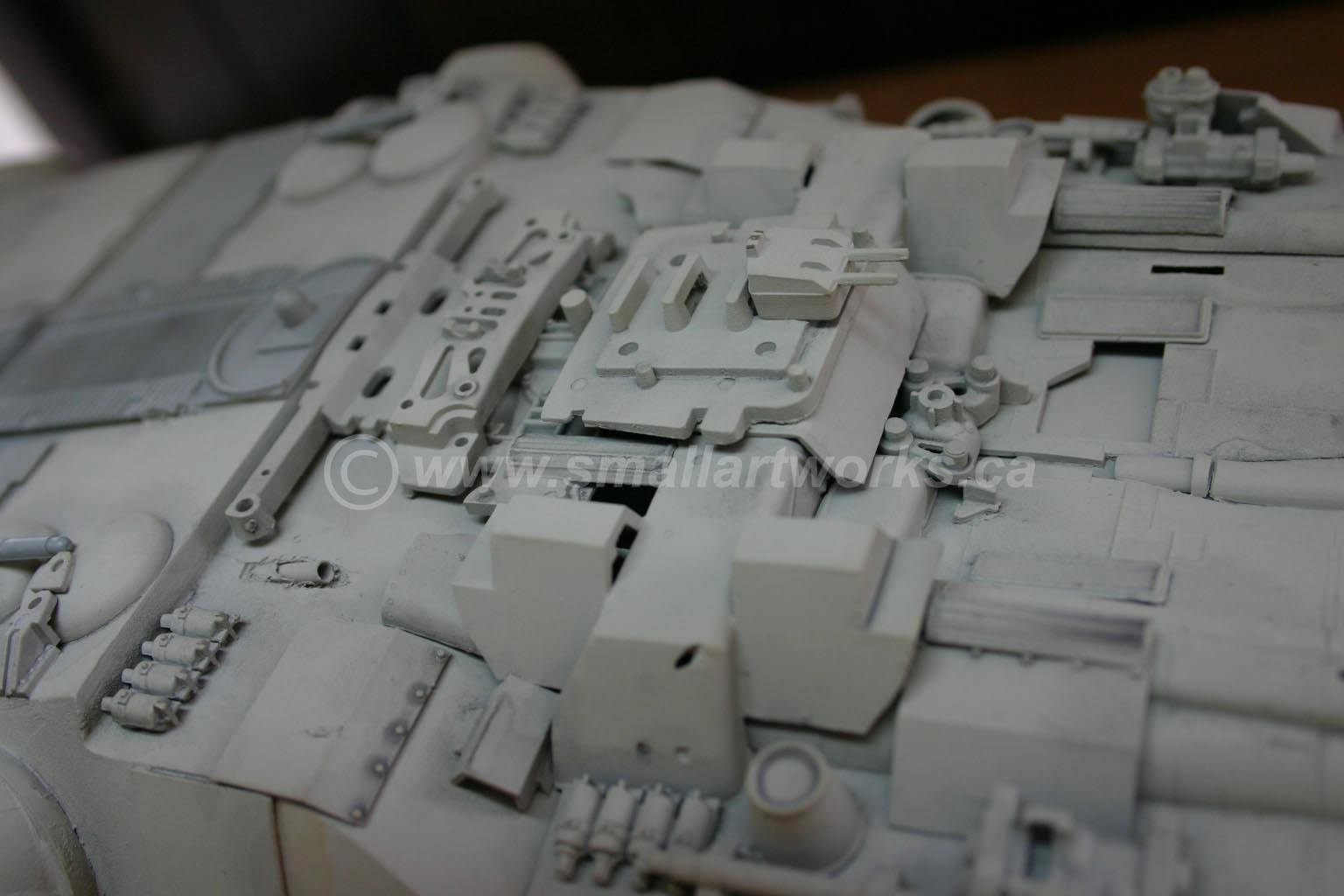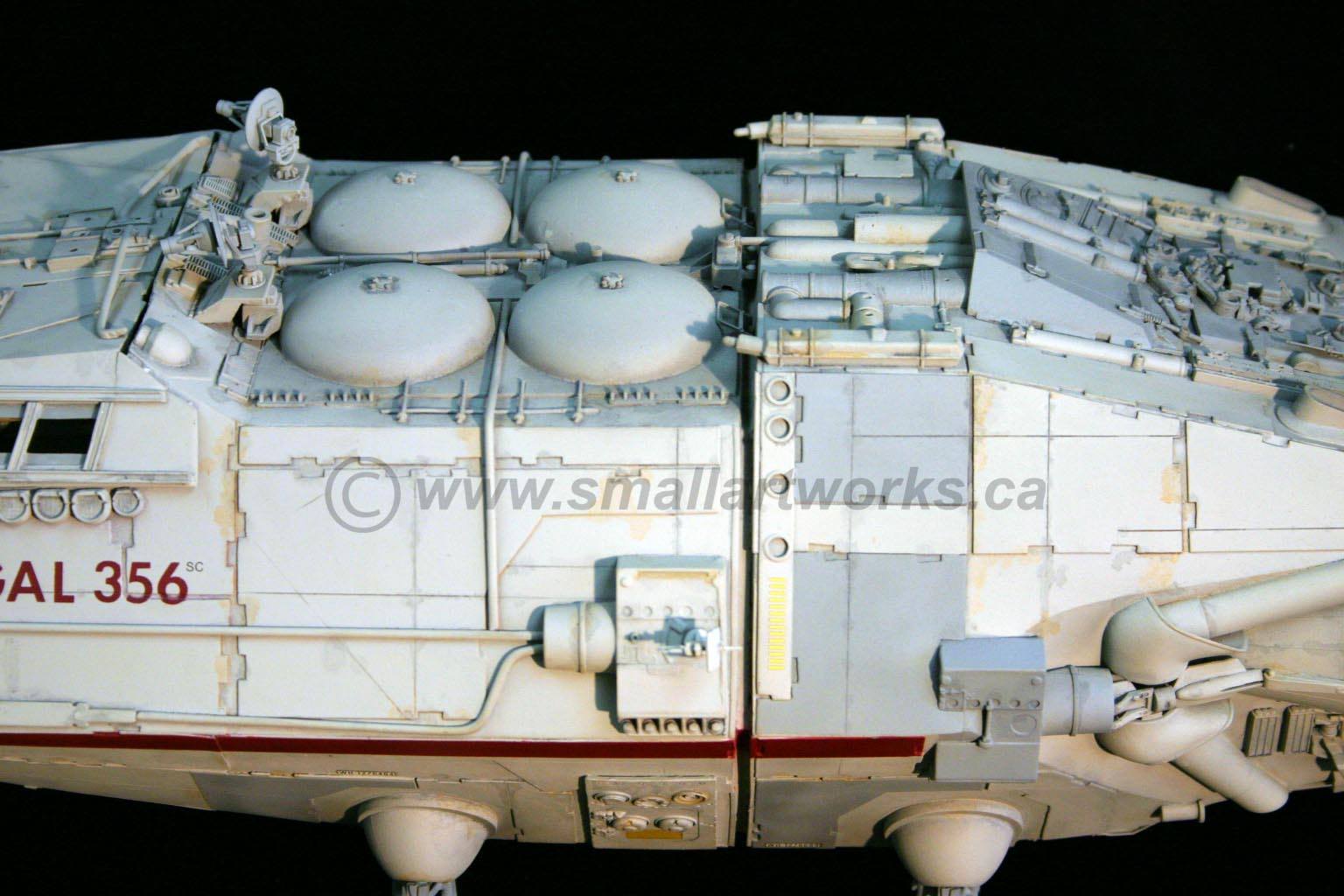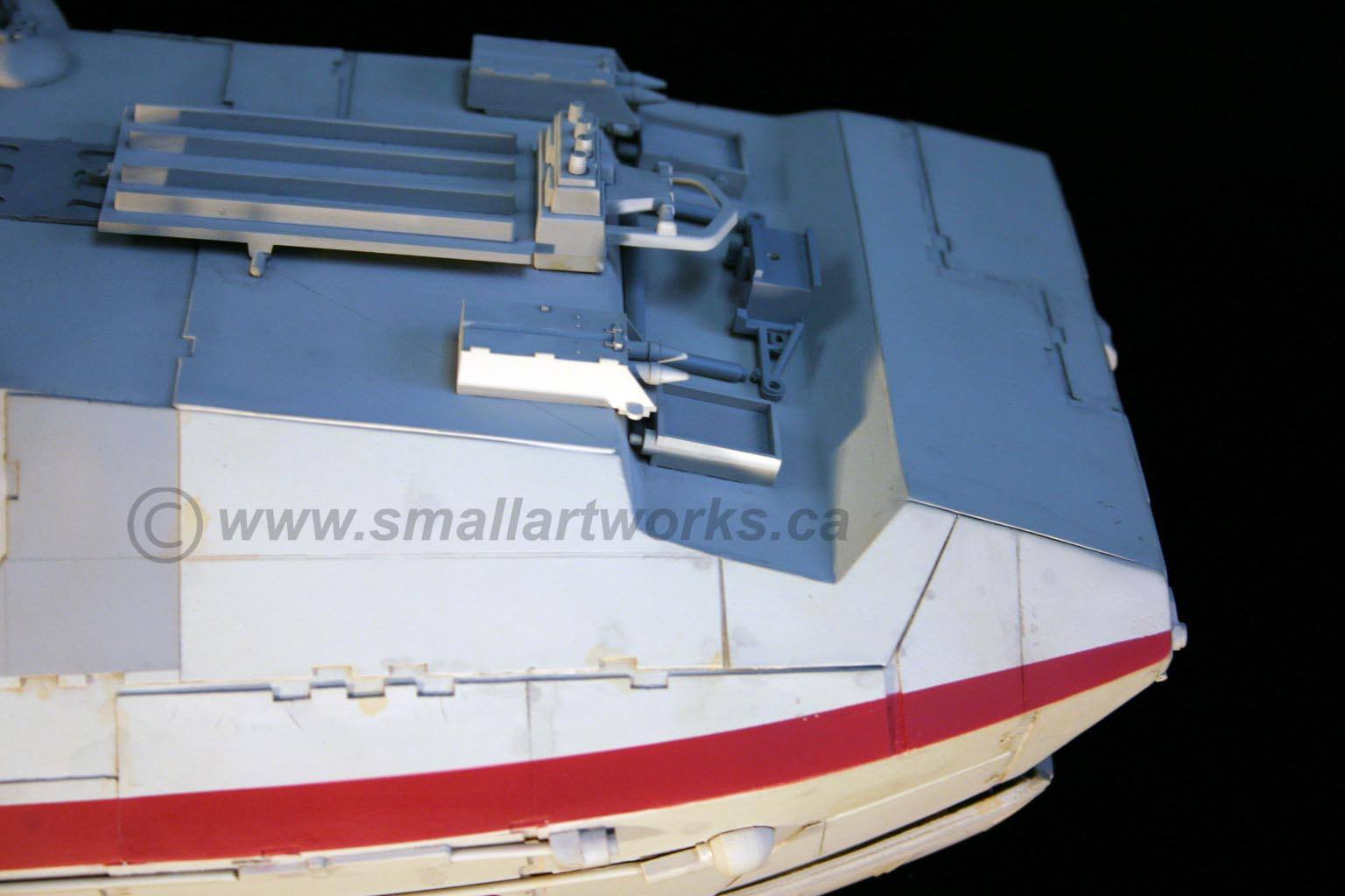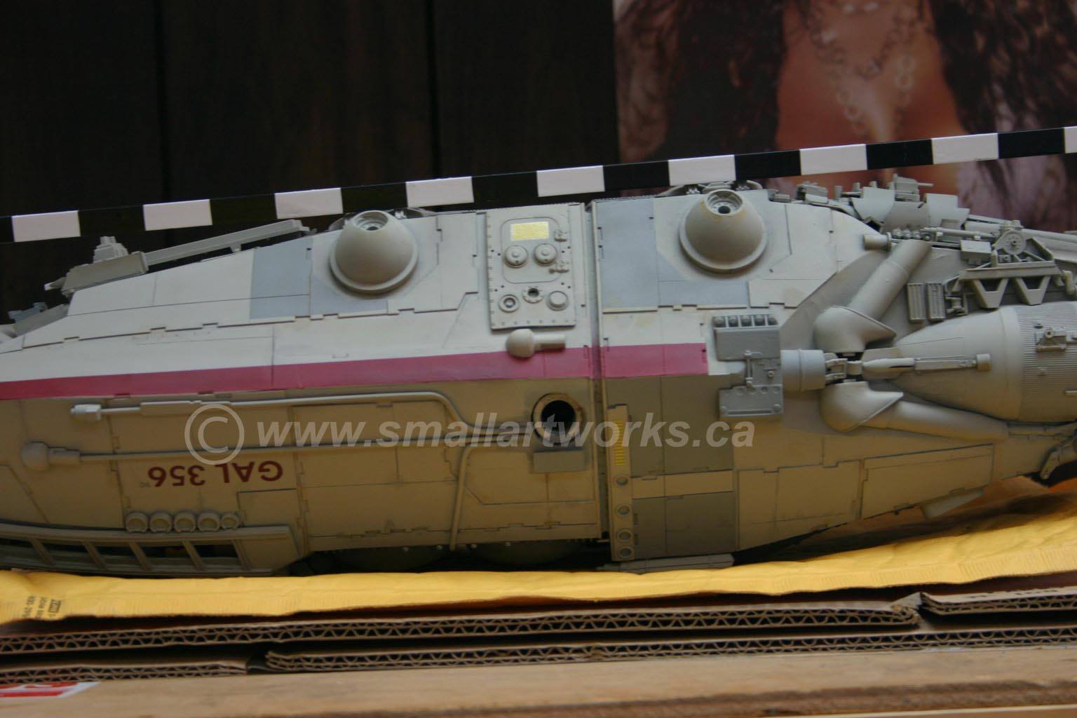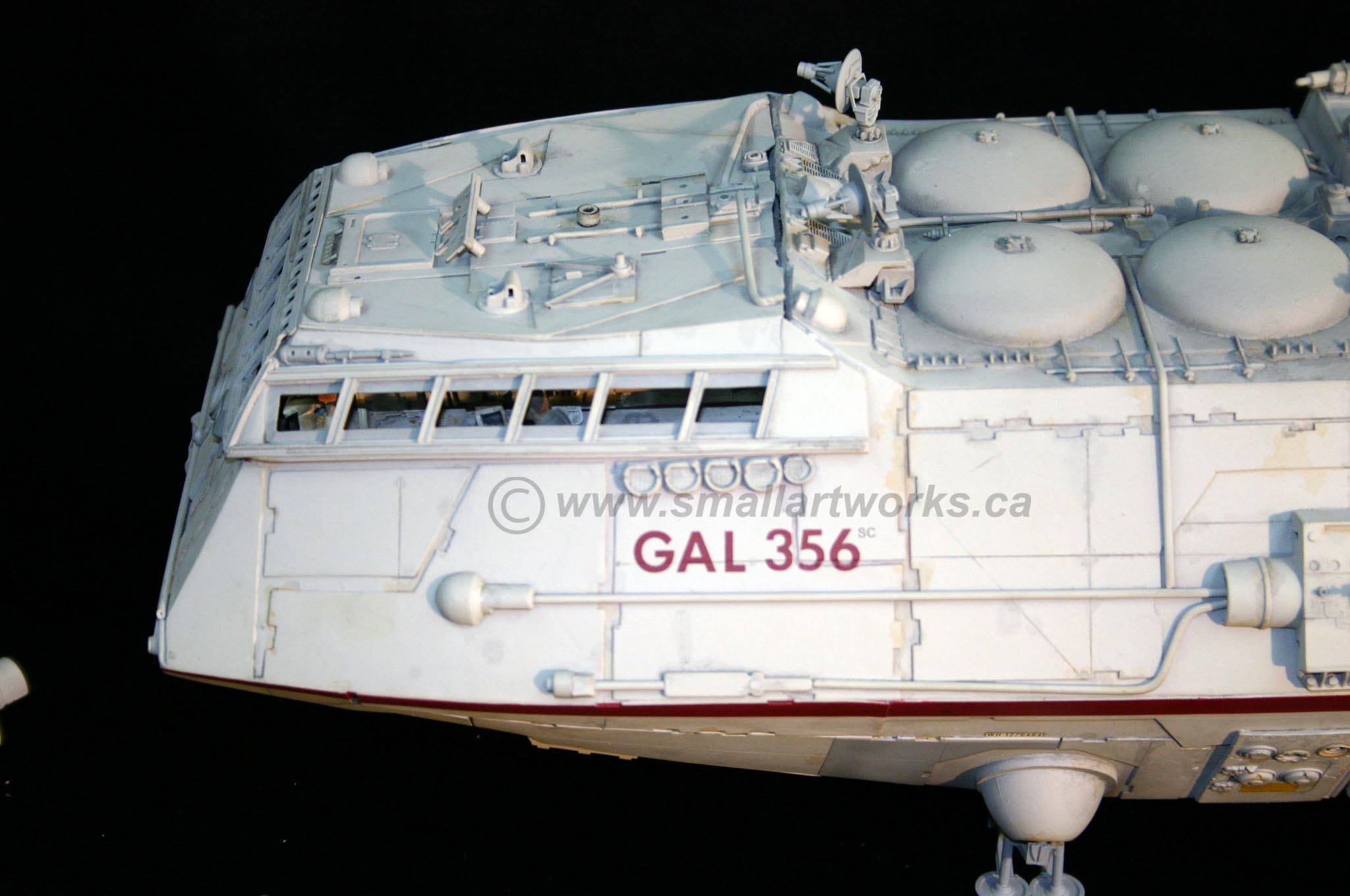 I shot these pictures of the original shuttle in 2008. It was carved from urethane foam clad in sheet plastic and detailed with hundreds of model kit parts. The model was restored a few years earlier by Ed Miarecki who had to re-dress it and repaint it after it had been used in Buck Rogers with a different paint scheme. Several parts on the model are not likely original as a result. However, these are by far the most extensive photos ever taken of the original model. Nobody else has shot it in this much detail at that time. Enjoy.