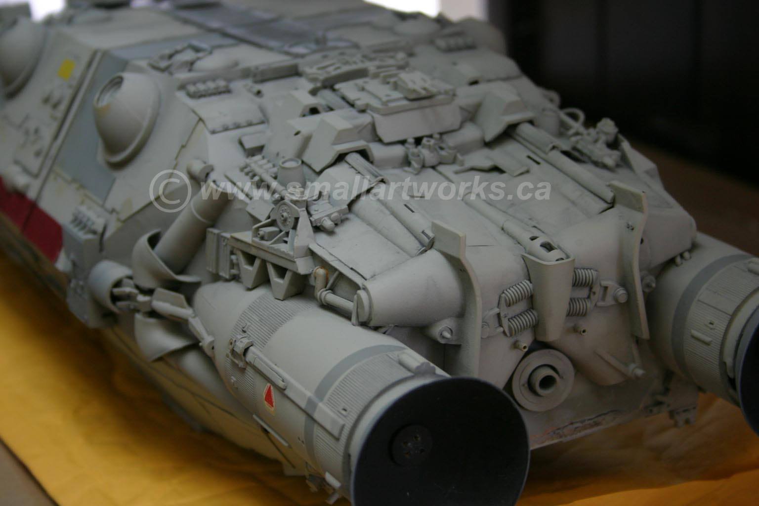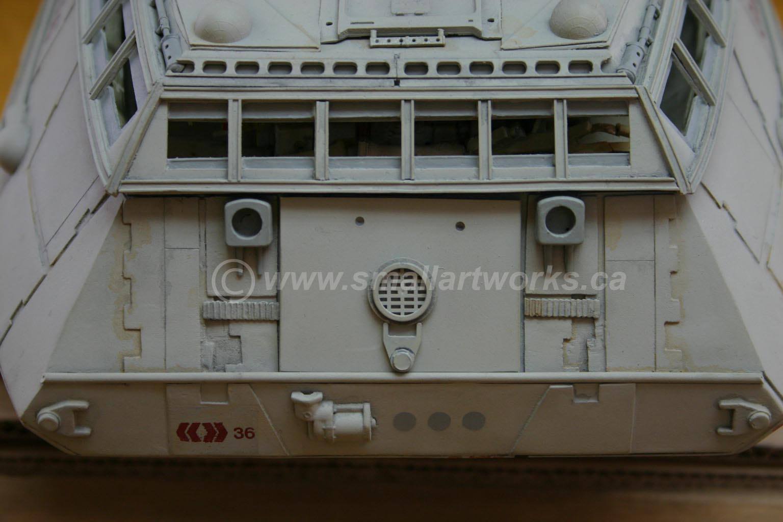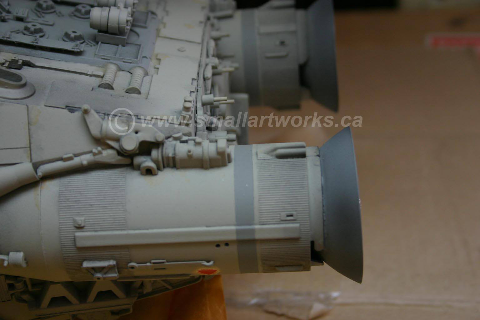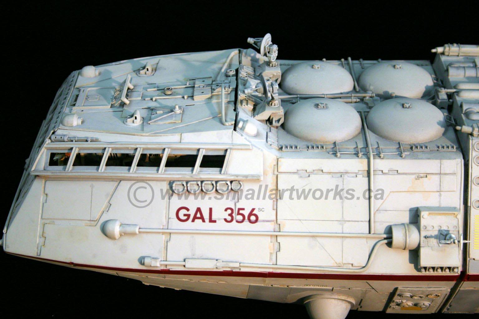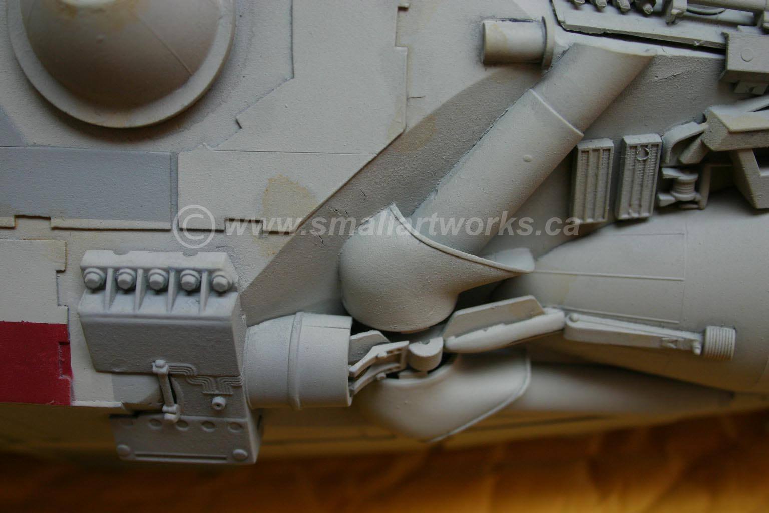 I shot these pictures of the original shuttle in 2008. It was carved from urethane foam clad in sheet plastic and detailed with hundreds of model kit parts. The model was restored a few years earlier by Ed Miarecki who had to re-dress it and repaint it after it had been used in Buck Rogers with a different paint scheme. Several parts on the model are not likely original as a result. However, these are by far the most extensive photos ever taken of the original model. Nobody else has shot it in this much detail at that time. Enjoy.
