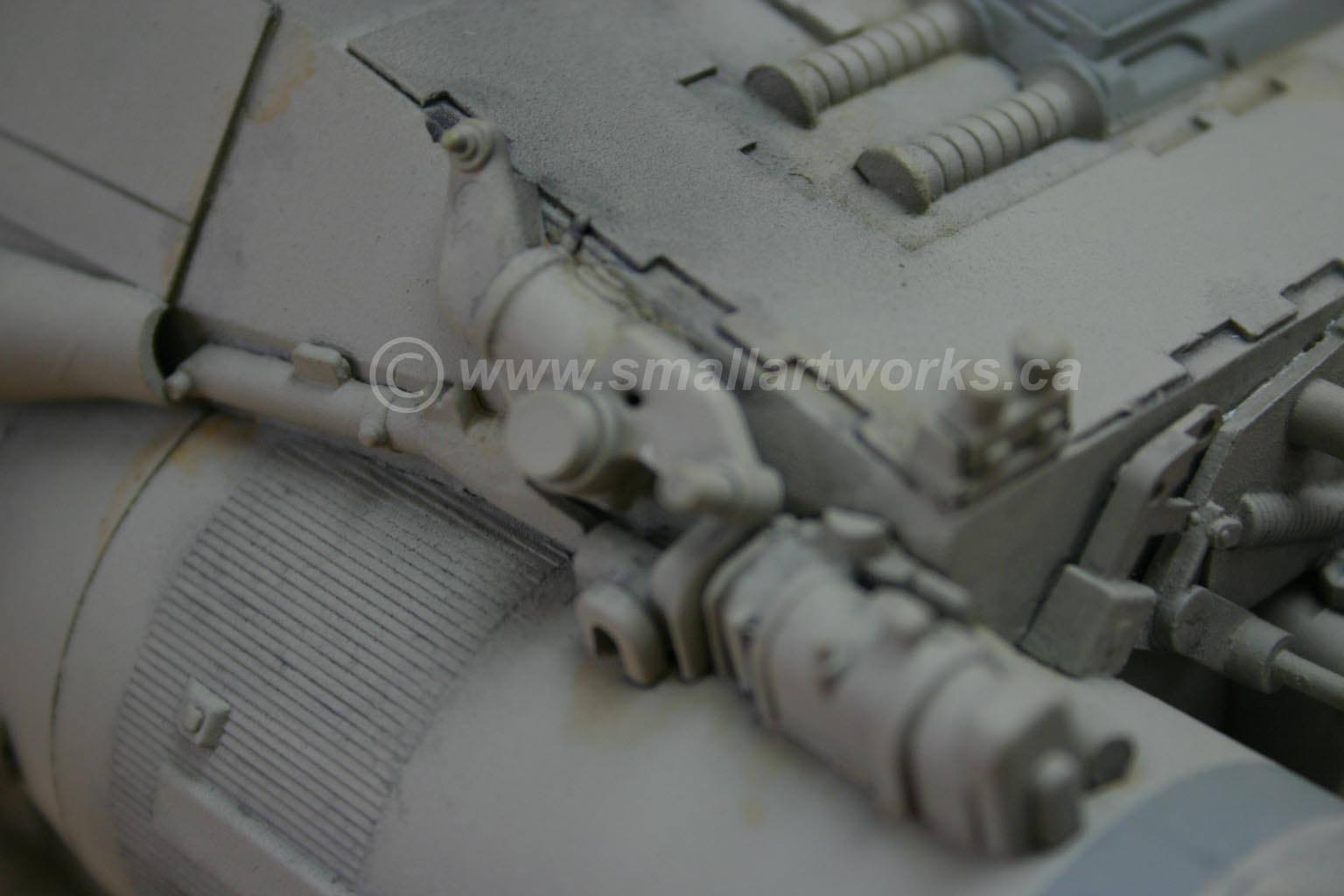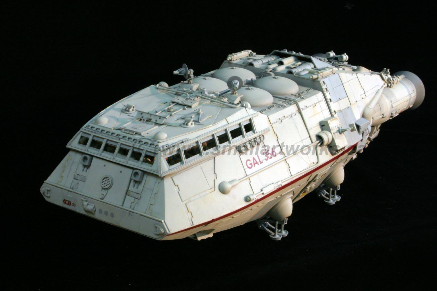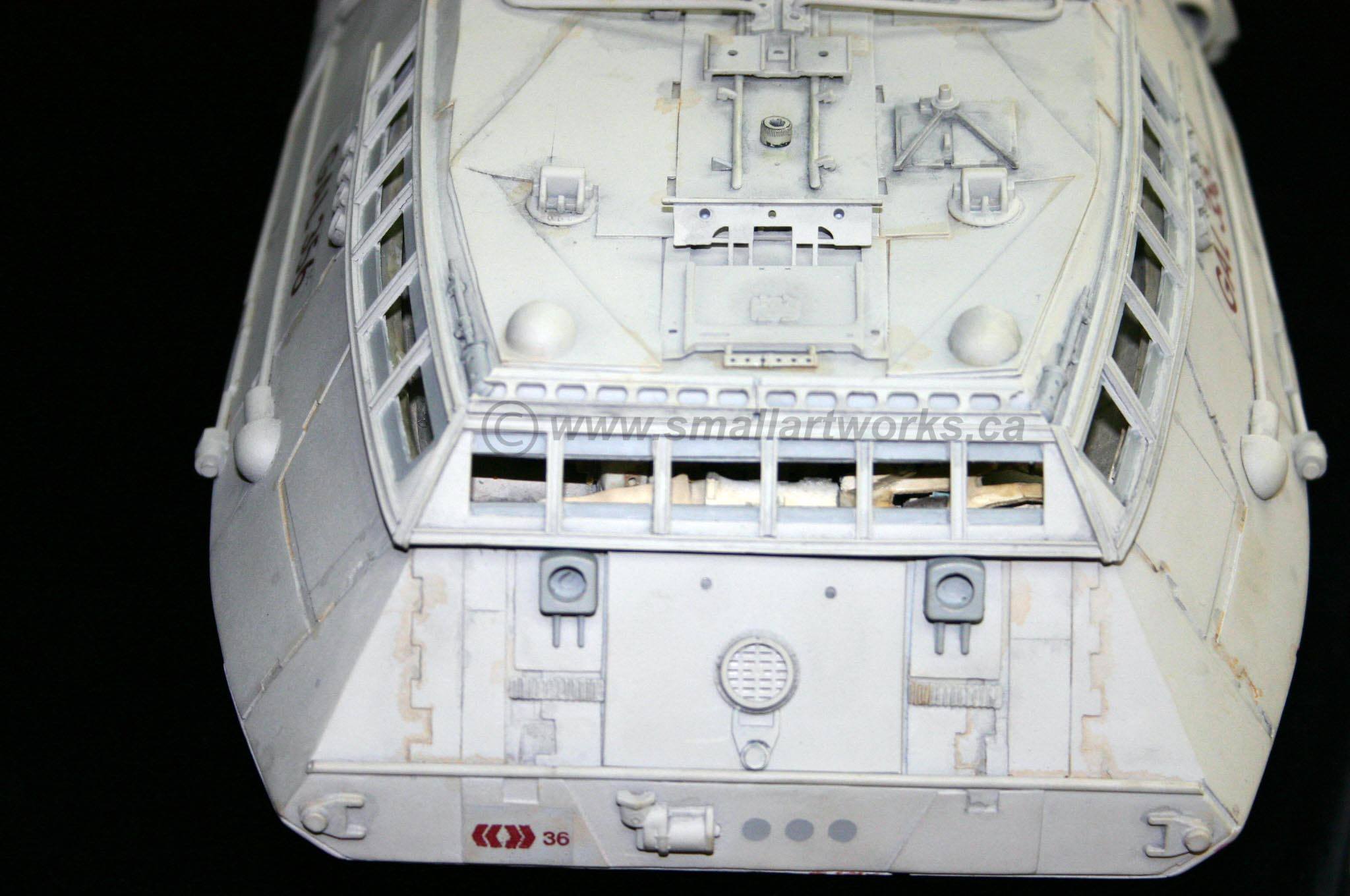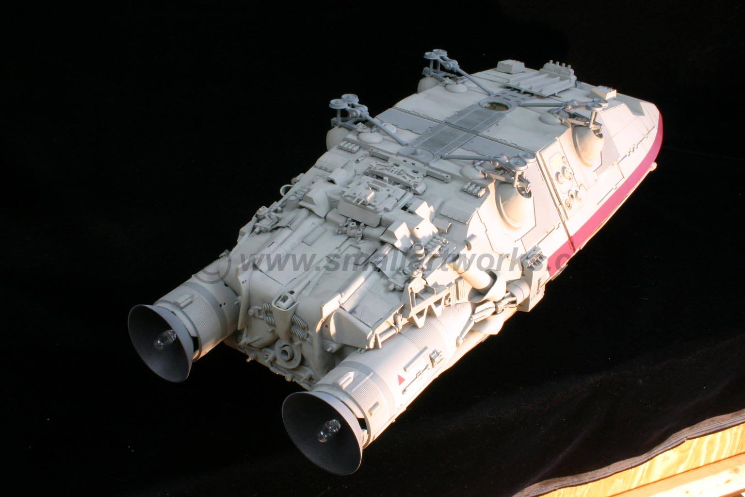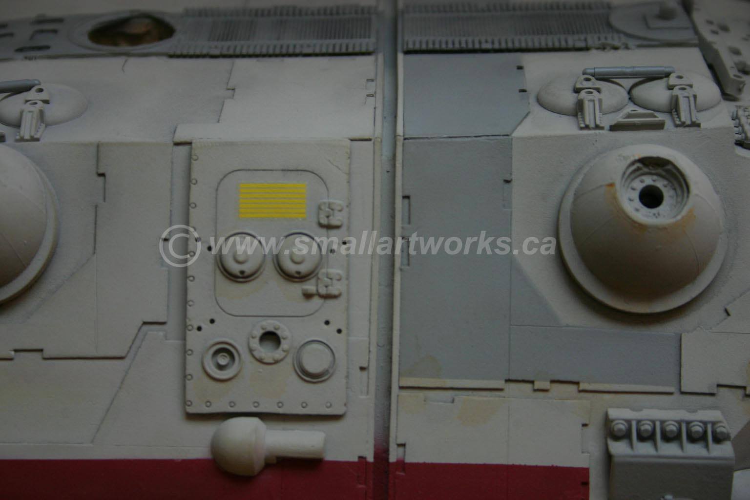 I shot these pictures of the original shuttle in 2008. It was carved from urethane foam clad in sheet plastic and detailed with hundreds of model kit parts. The model was restored a few years earlier by Ed Miarecki who had to re-dress it and repaint it after it had been used in Buck Rogers with a different paint scheme. Several parts on the model are not likely original as a result. However, these are by far the most extensive photos ever taken of the original model. Nobody else has shot it in this much detail at that time. Enjoy.