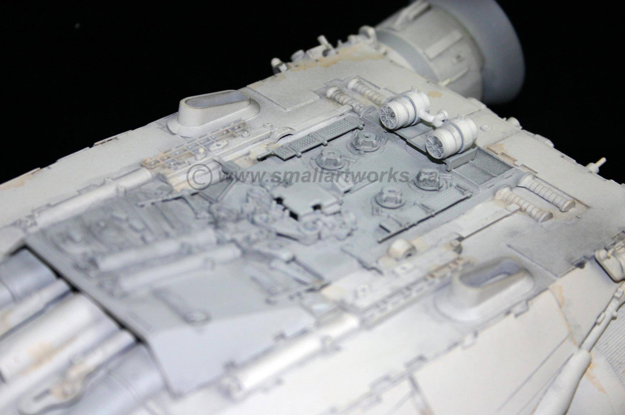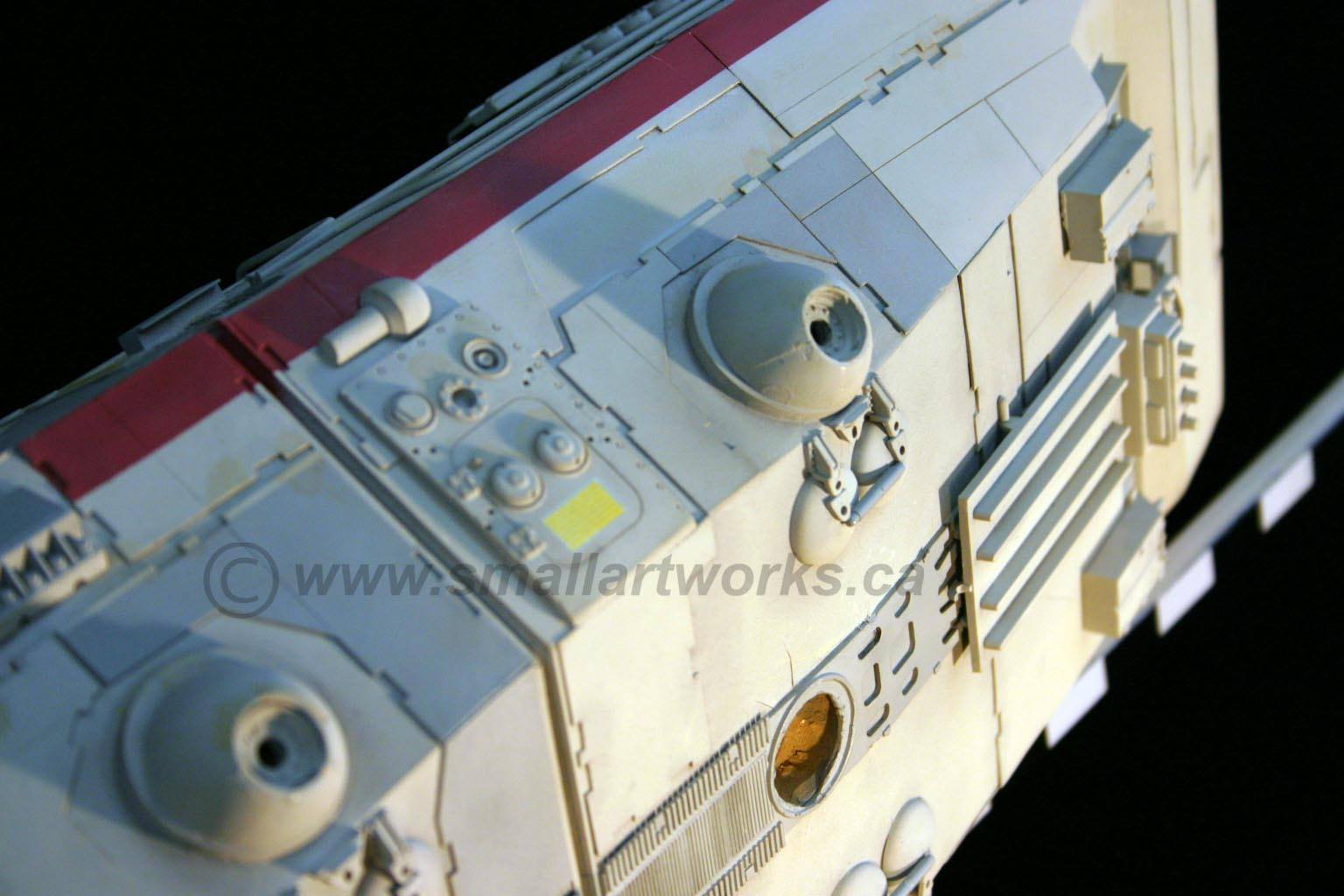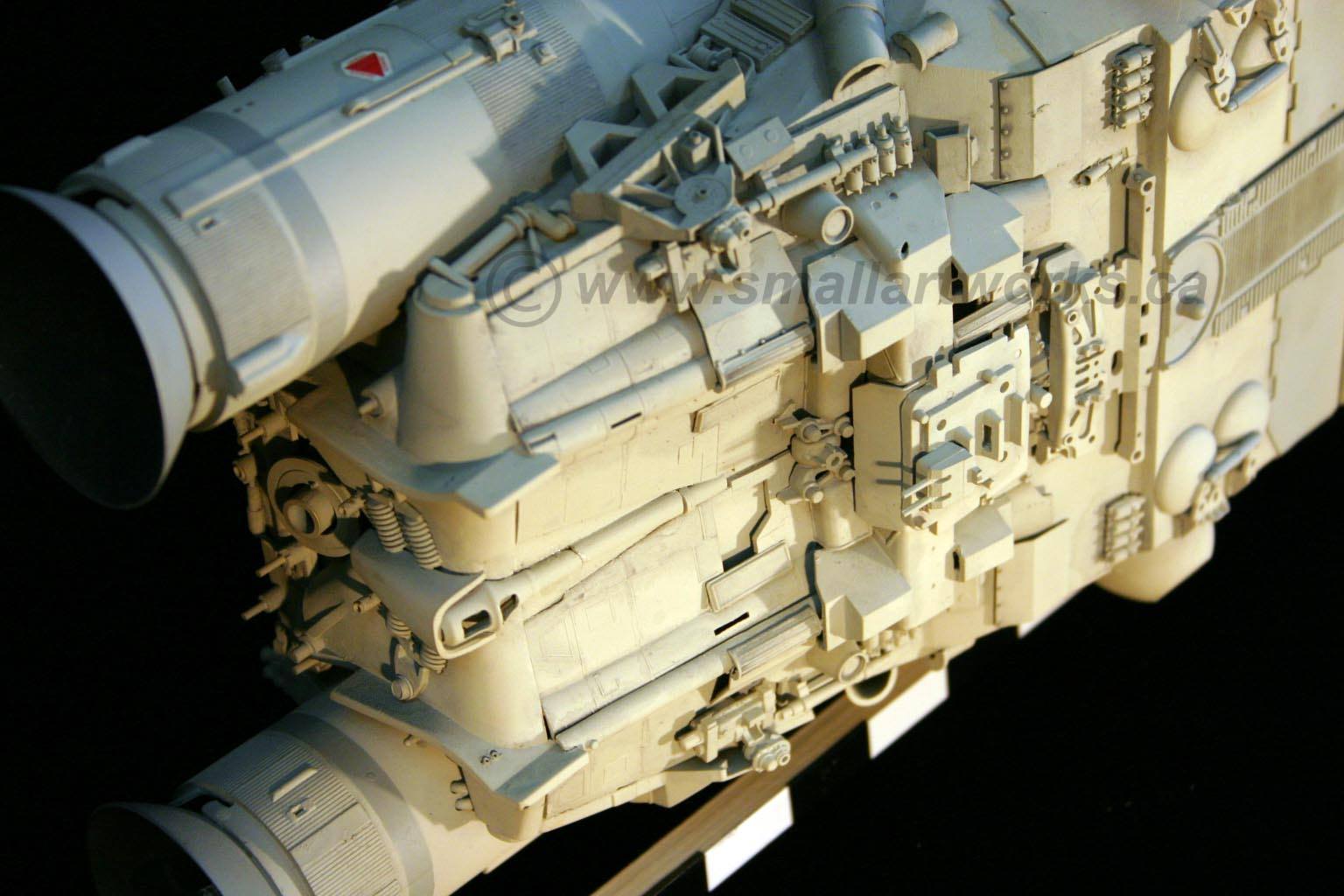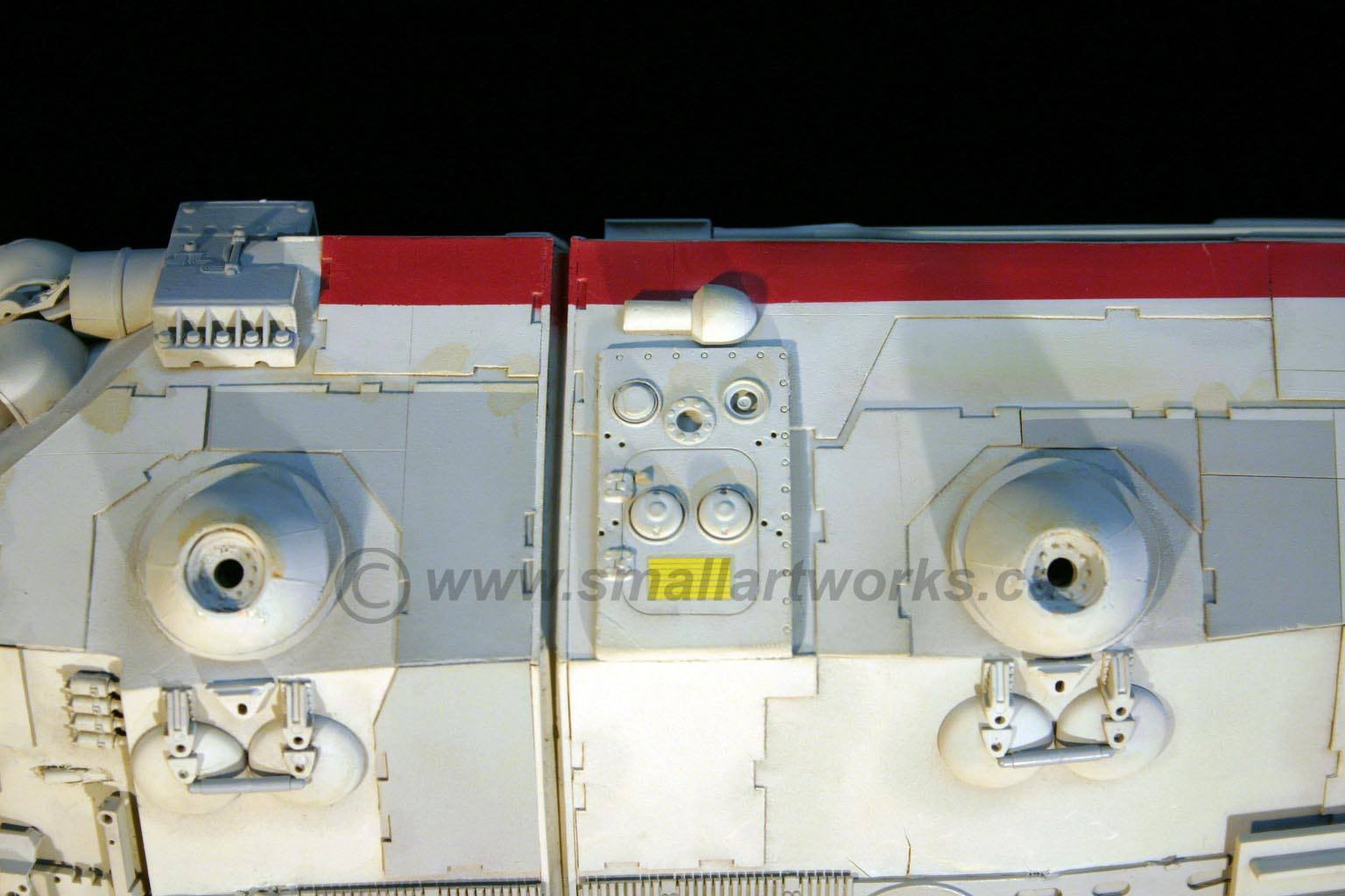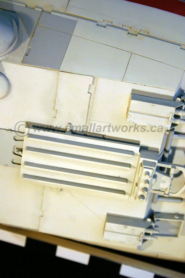 I shot these pictures of the original shuttle in 2008. It was carved from urethane foam clad in sheet plastic and detailed with hundreds of model kit parts. The model was restored a few years earlier by Ed Miarecki who had to re-dress it and repaint it after it had been used in Buck Rogers with a different paint scheme. Several parts on the model are not likely original as a result. However, these are by far the most extensive photos ever taken of the original model. Nobody else has shot it in this much detail at that time. Enjoy.