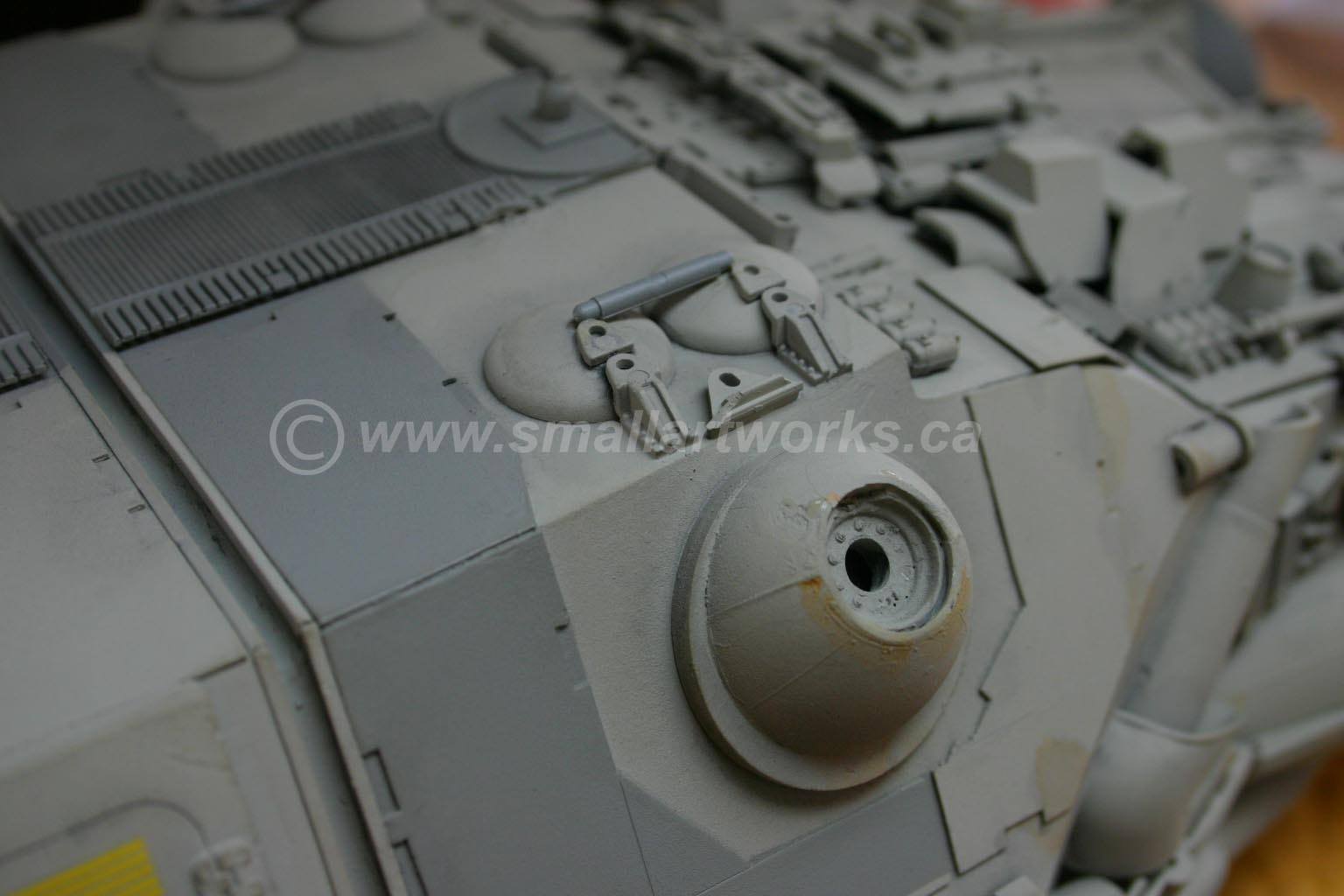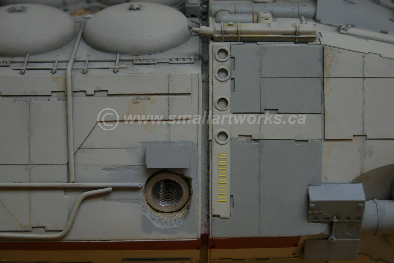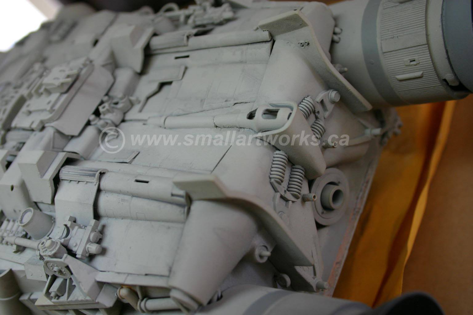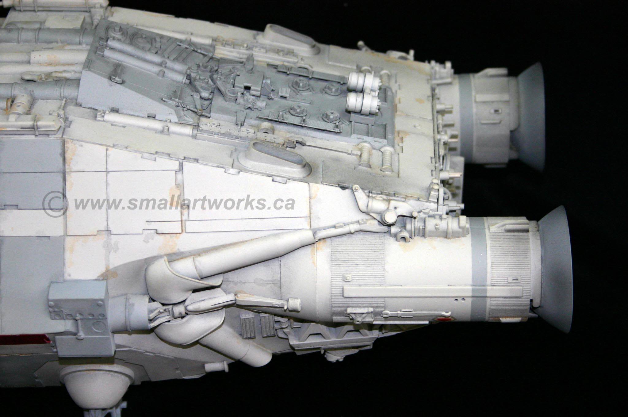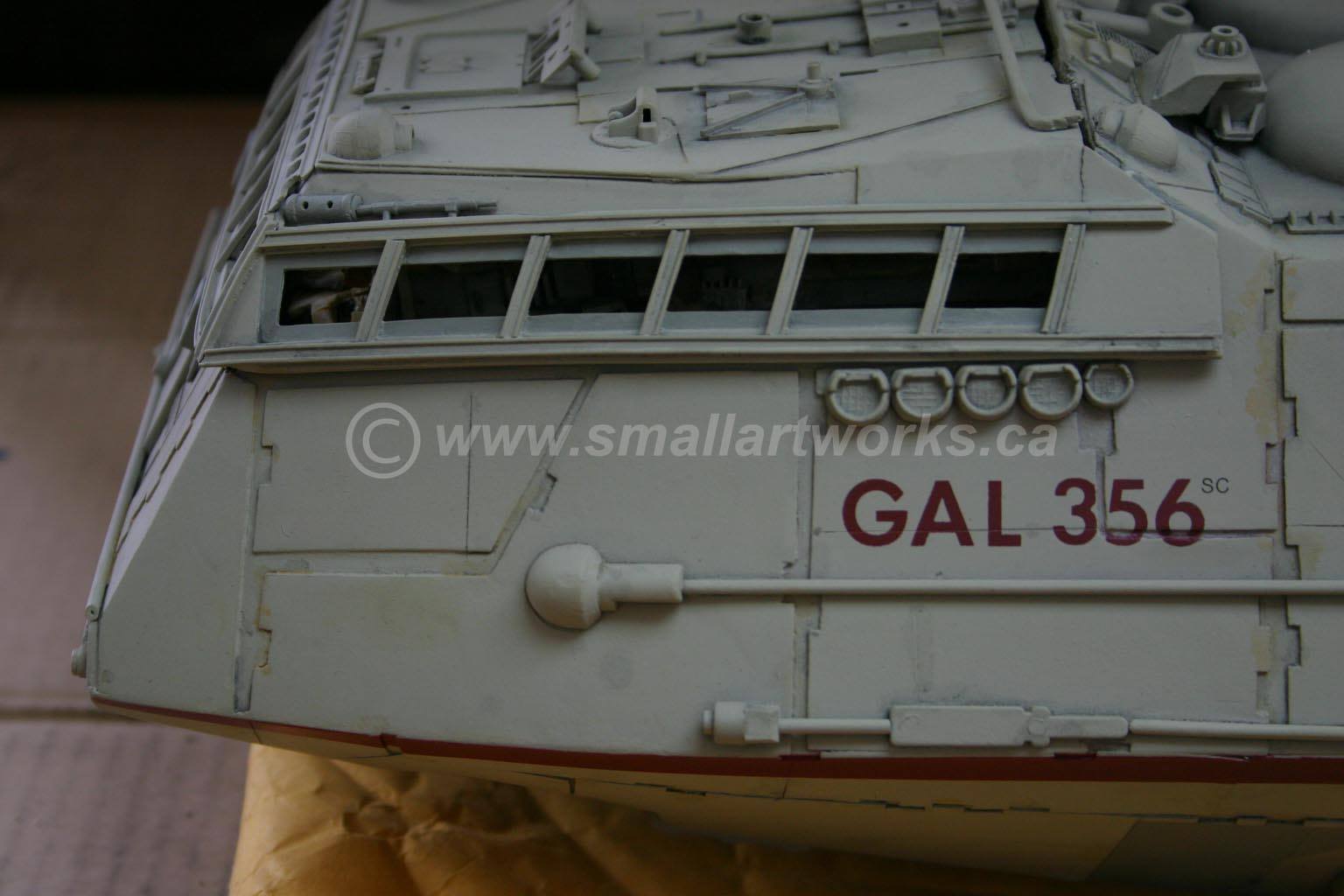 I shot these pictures of the original shuttle in 2008. It was carved from urethane foam clad in sheet plastic and detailed with hundreds of model kit parts. The model was restored a few years earlier by Ed Miarecki who had to re-dress it and repaint it after it had been used in Buck Rogers with a different paint scheme. Several parts on the model are not likely original as a result. However, these are by far the most extensive photos ever taken of the original model. Nobody else has shot it in this much detail at that time. Enjoy.