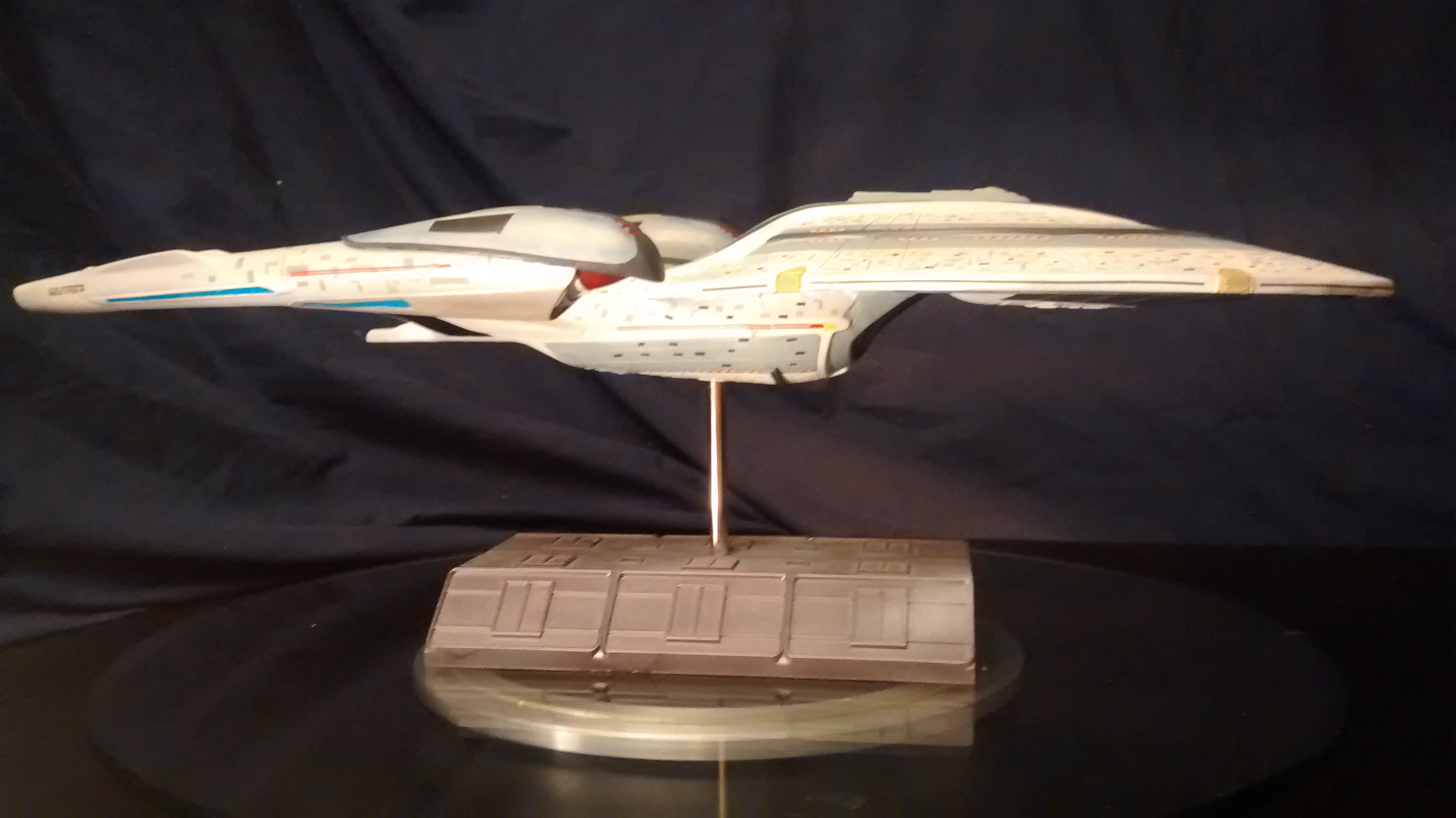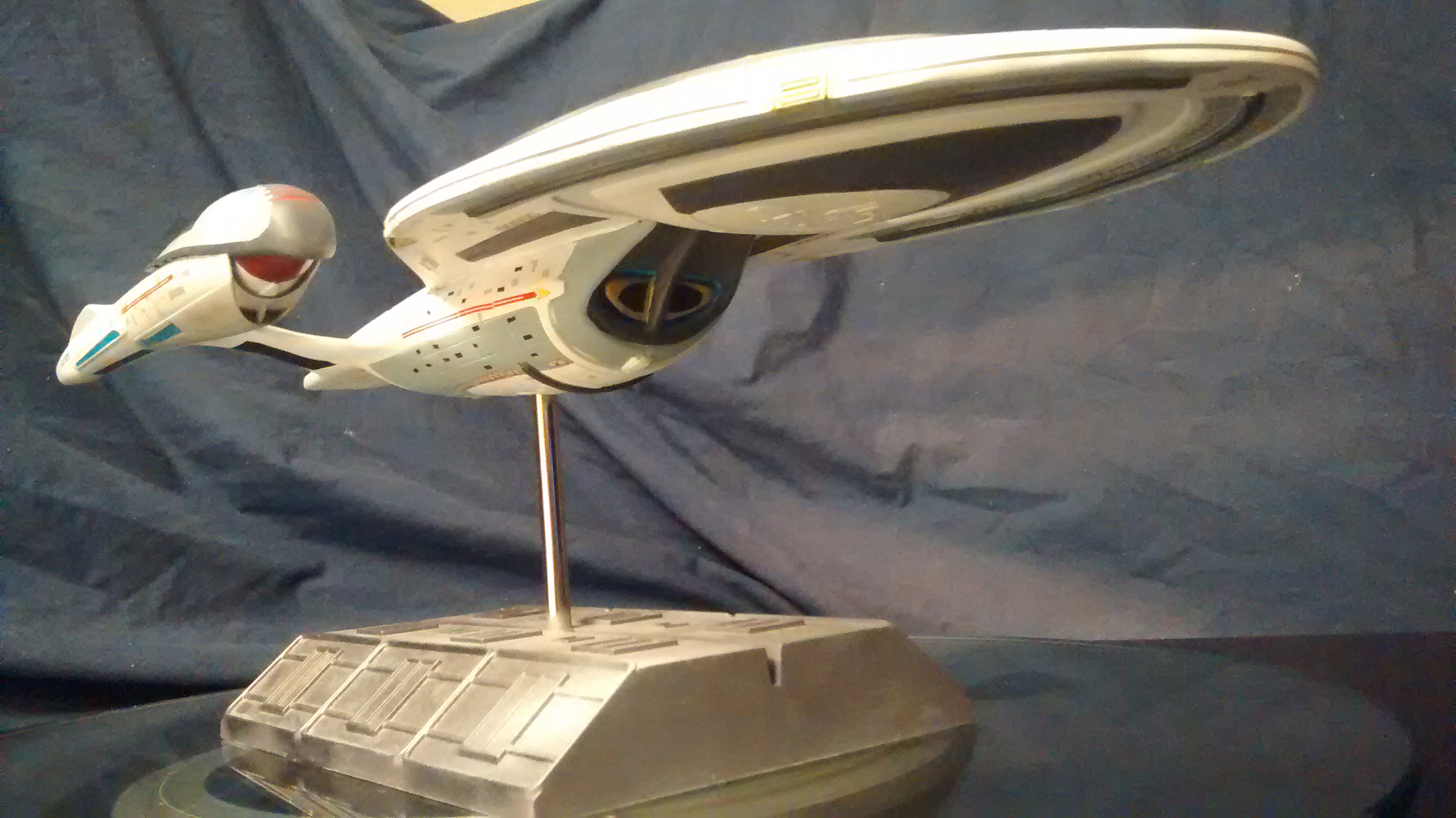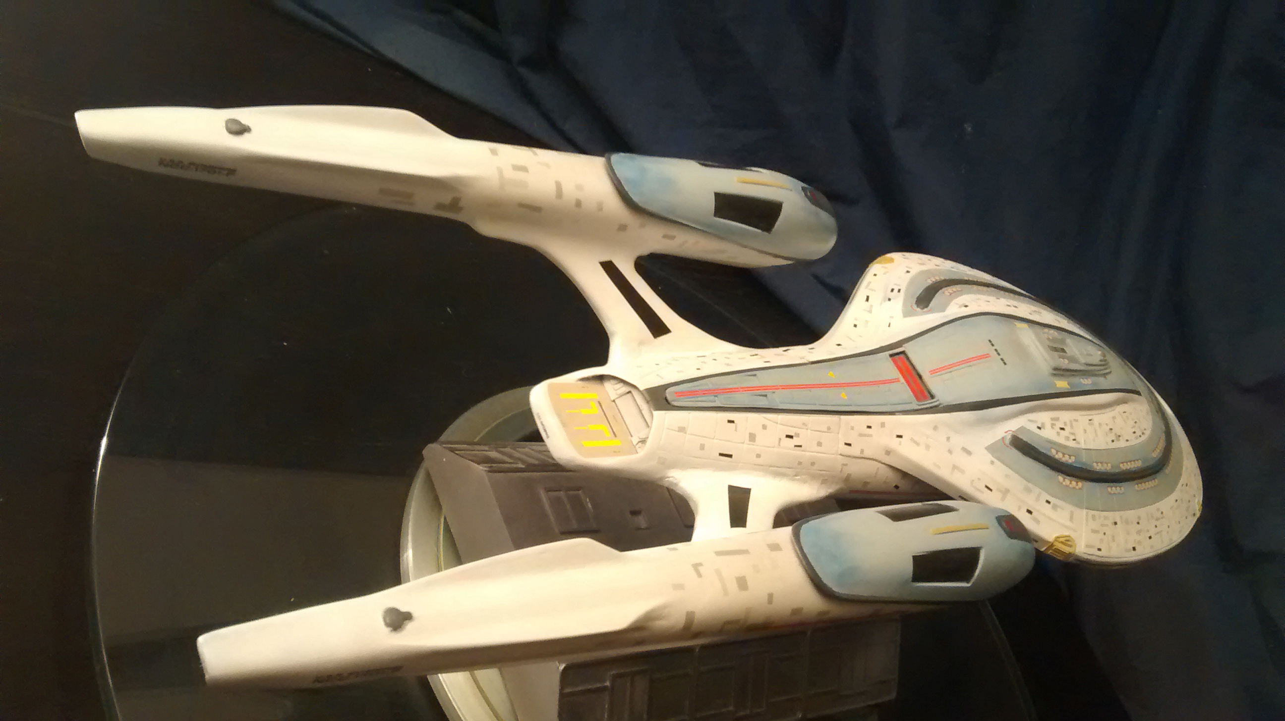 I thought I would submit some images of my latest kit bash. I have designated it the Starfleet Quasar Class- USS Enterprise NCC-1701-F. She is an early 25th Century Exploration Vessel. The bash consists of a Revell 1/677 USS Voyager, Revell 1/500 JJ-Prise, and an AMT 1/1400 Enterprise E. A lot of the parts have been modified and re-sculpted. She is scaled to be 1/1400 and at almost 27″ long she is a biggie. I wanted this ship to the biggest Federation Ship to date. Mainly because she is an exploration vessel but also so she has some teeth in unknown hostile situations.