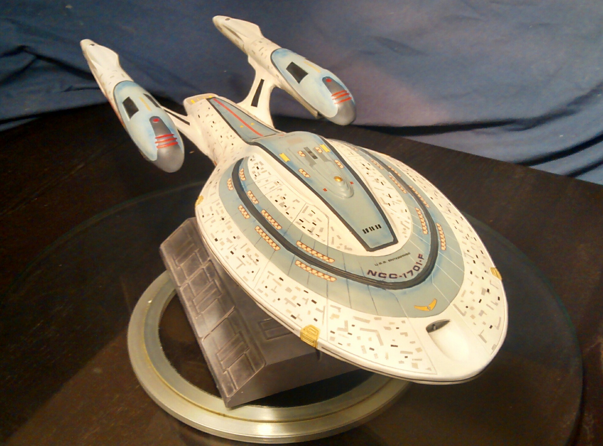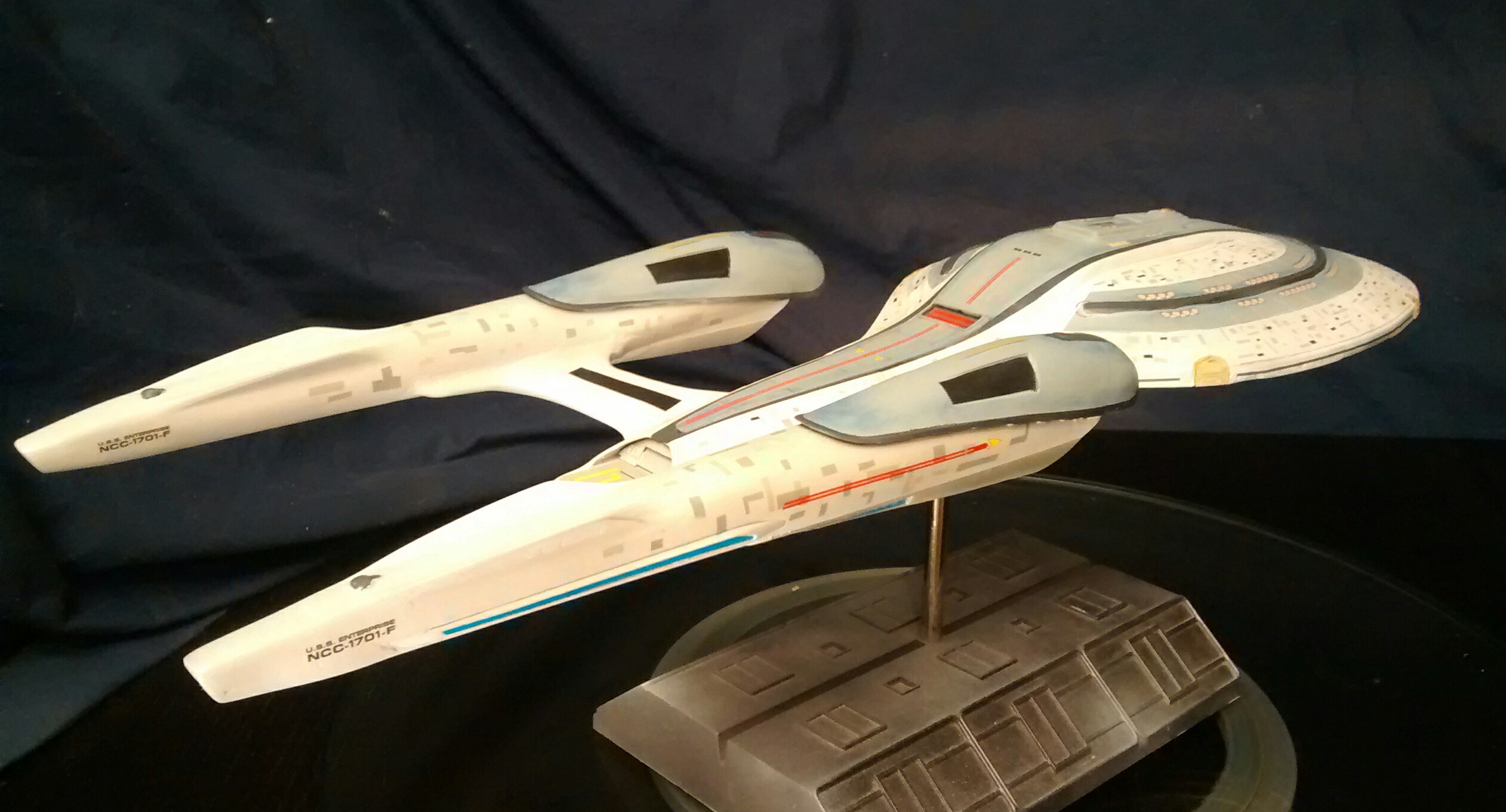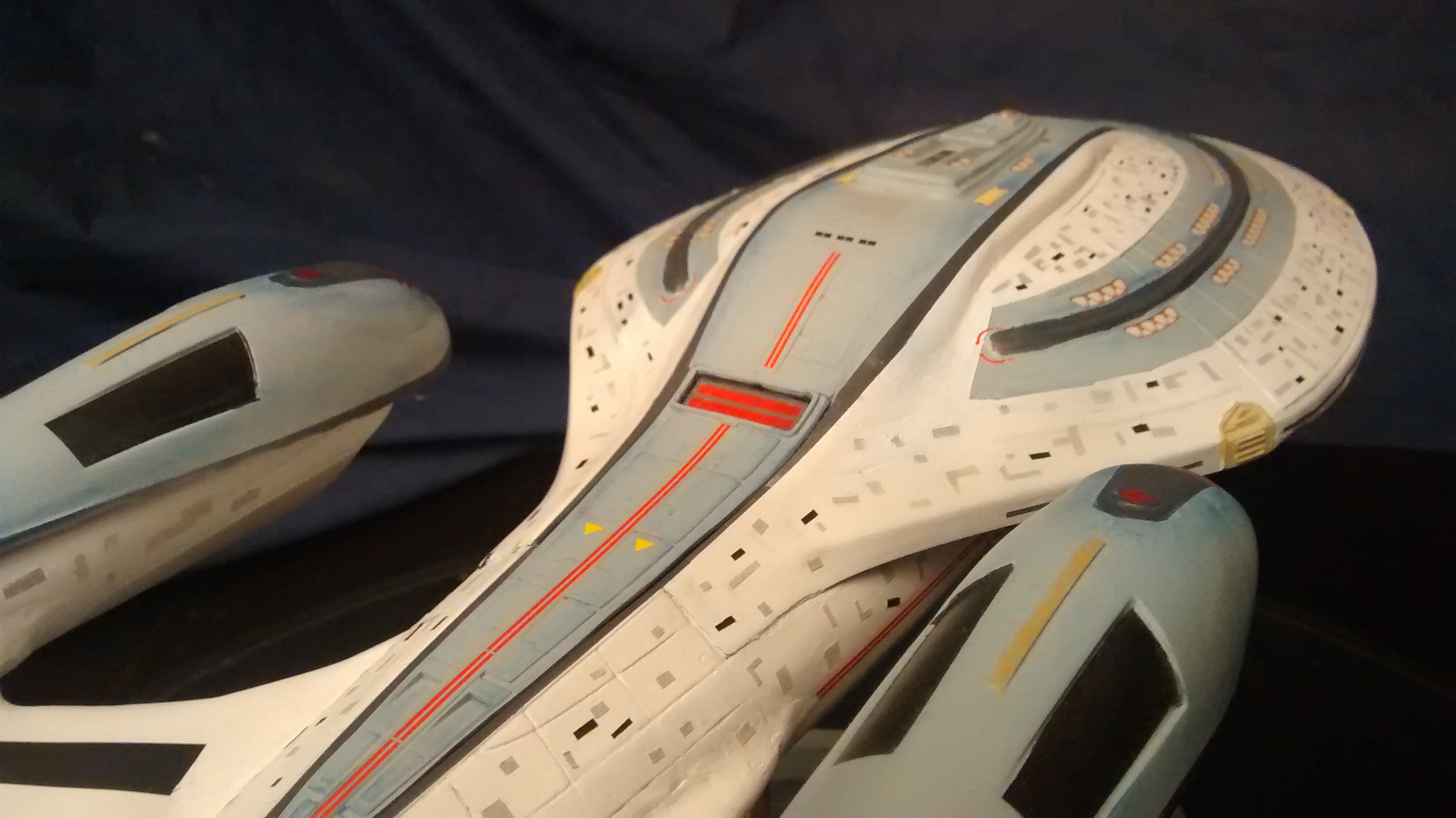 I thought I would submit some images of my latest kit bash. I have designated it the Starfleet Quasar Class- USS Enterprise NCC-1701-F. She is an early 25th Century Exploration Vessel. The bash consists of a Revell 1/677 USS Voyager, Revell 1/500 JJ-Prise, and an AMT 1/1400 Enterprise E. A lot of the parts have been modified and re-sculpted. She is scaled to be 1/1400 and at almost 27″ long she is a biggie. I wanted this ship to the biggest Federation Ship to date. Mainly because she is an exploration vessel but also so she has some teeth in unknown hostile situations.