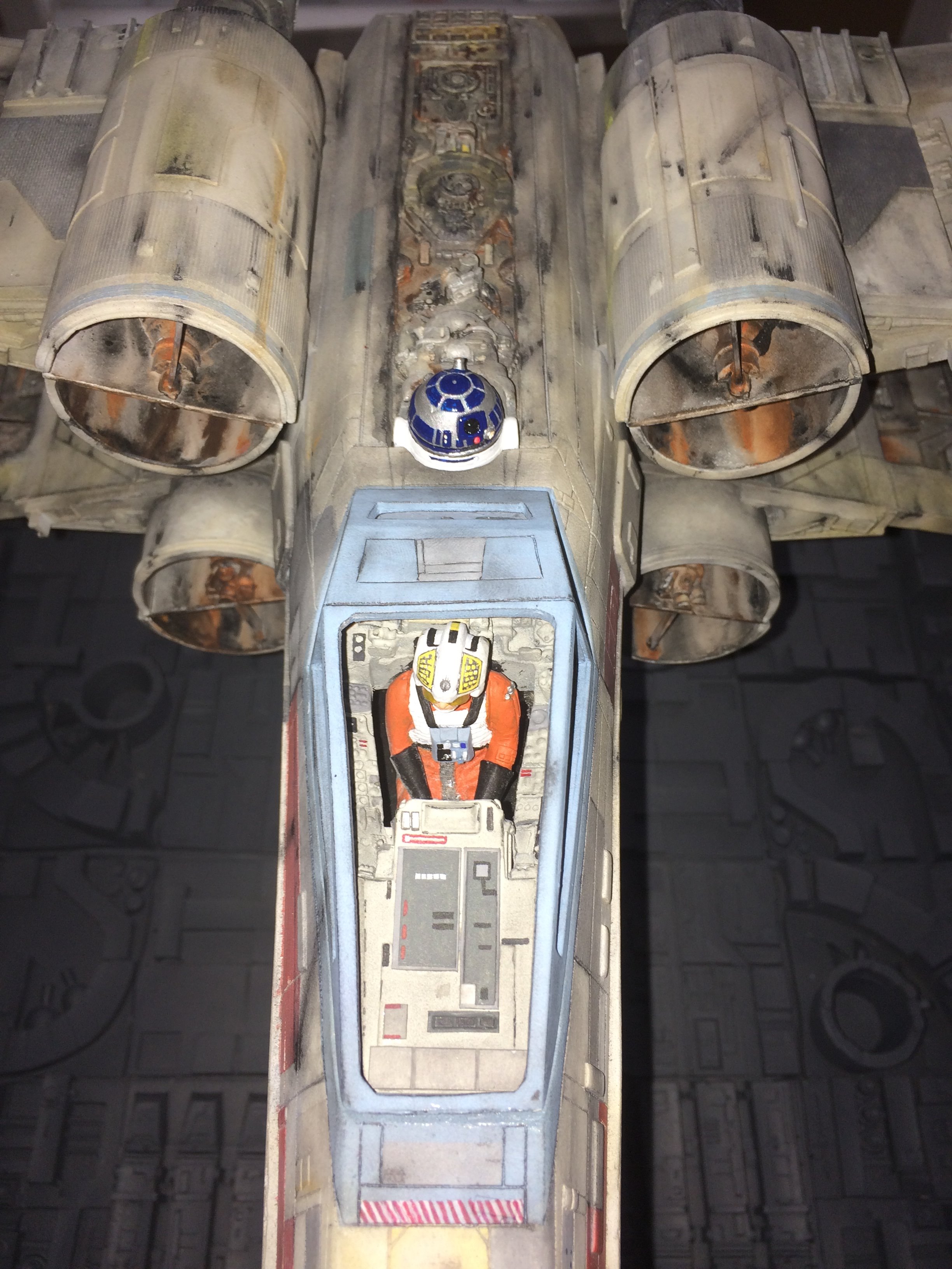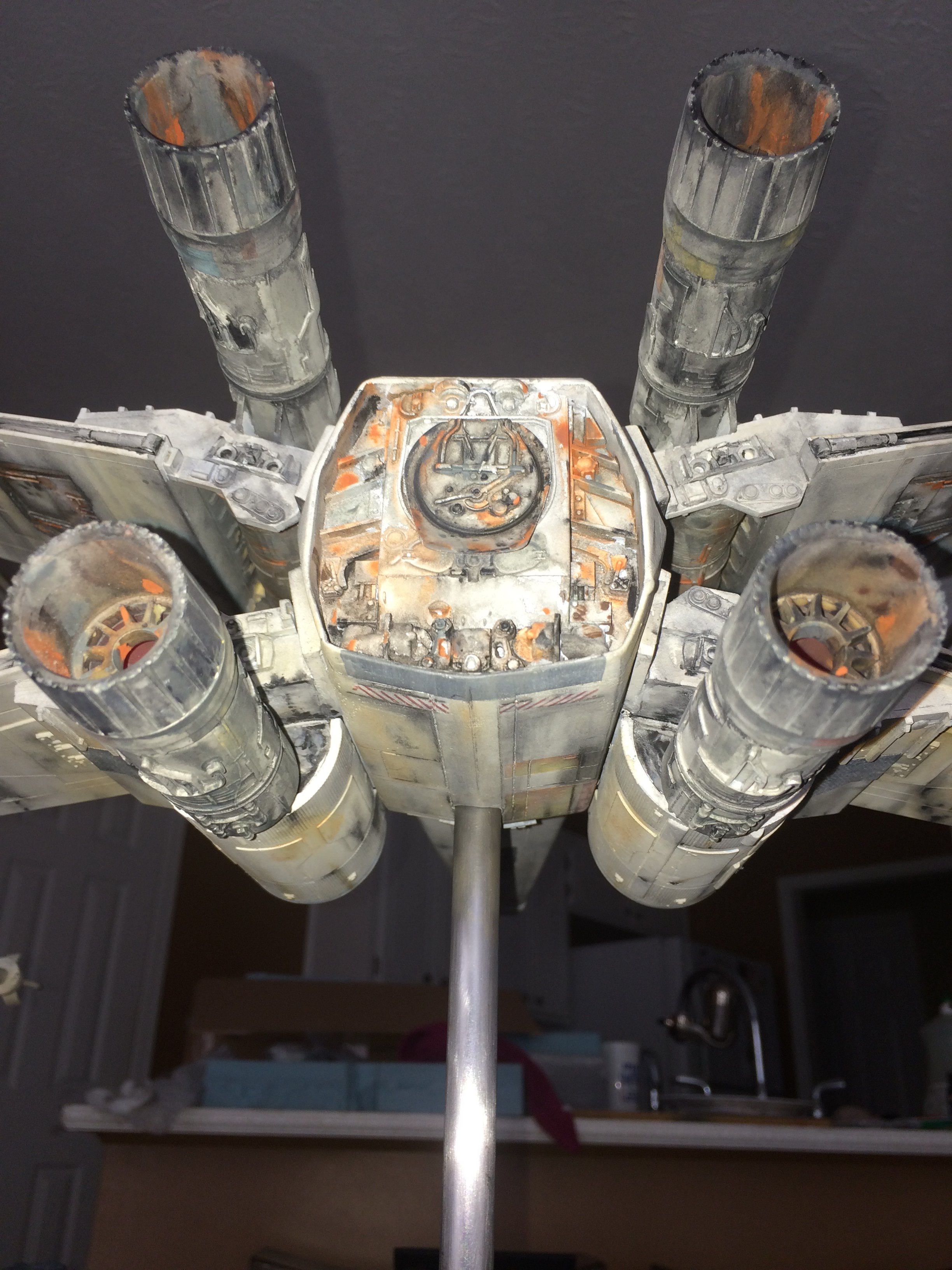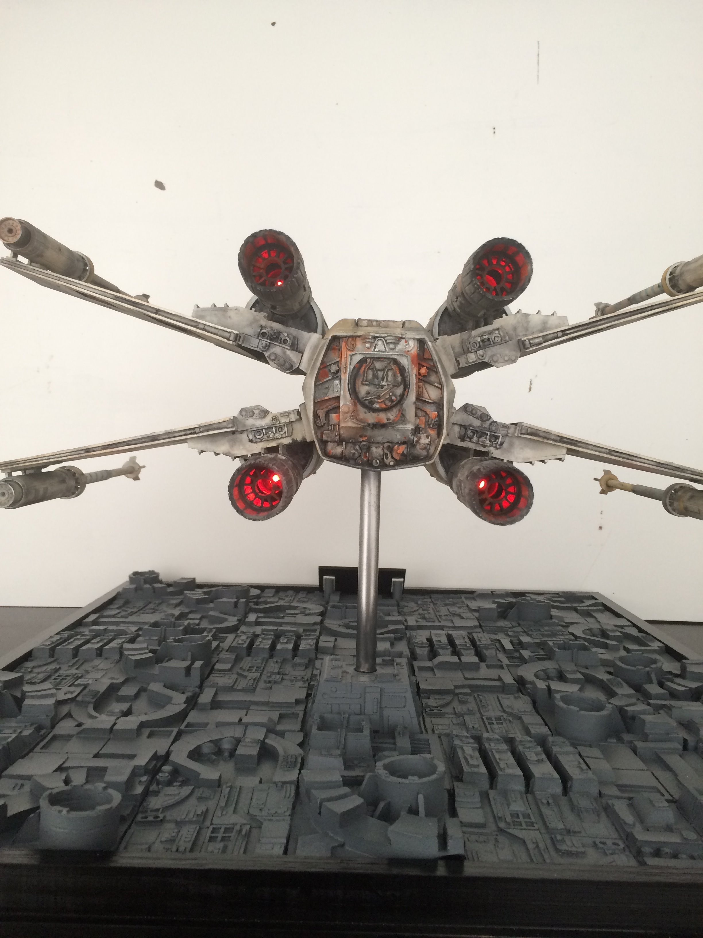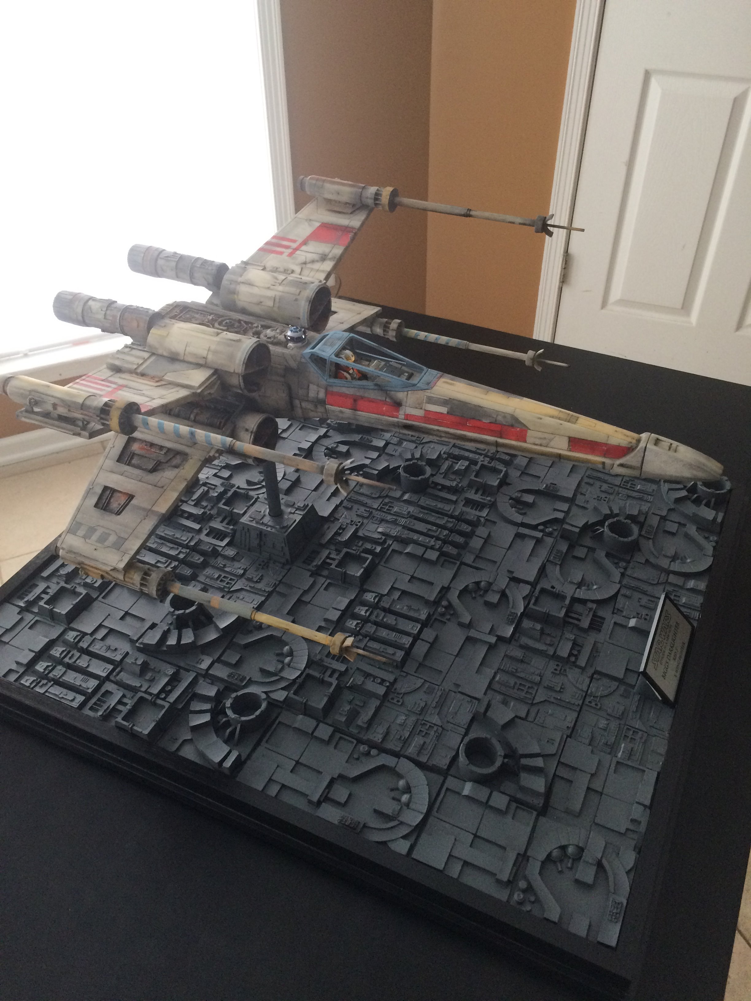 This was a commissioned build for famed Hollywood FX artist Greg Nicotero. He and I had talked about doing the SS scale paint scheme from the original 22″ new hope model (Biggs), but we both agreed that the 4 foot model was much more eye catching, with it’s weathering much more aggressive! Although the two different sized studio models don’t even come close to the same paint scheme, I was given artistic leeway to put the magic pixie-dust on it!