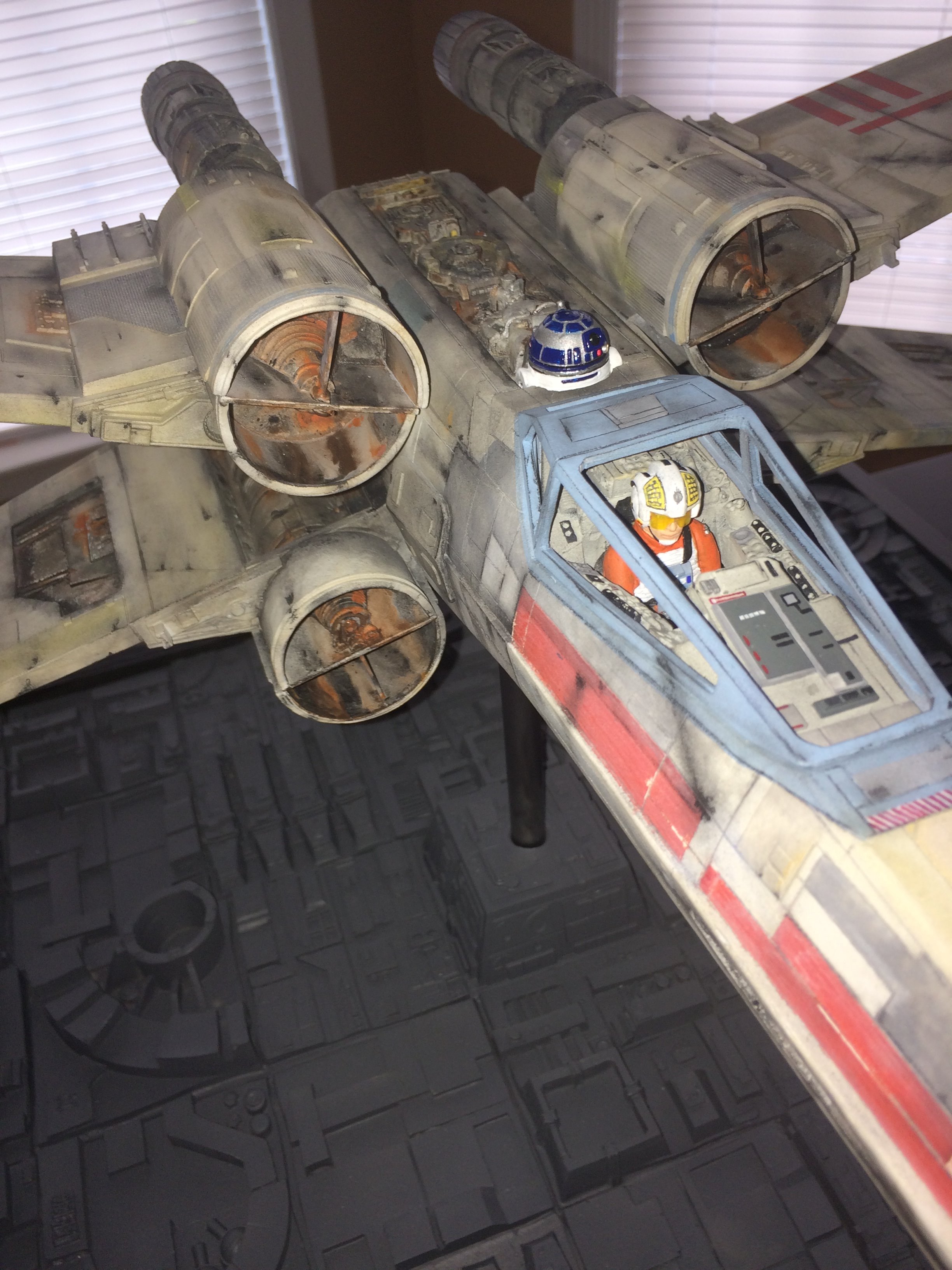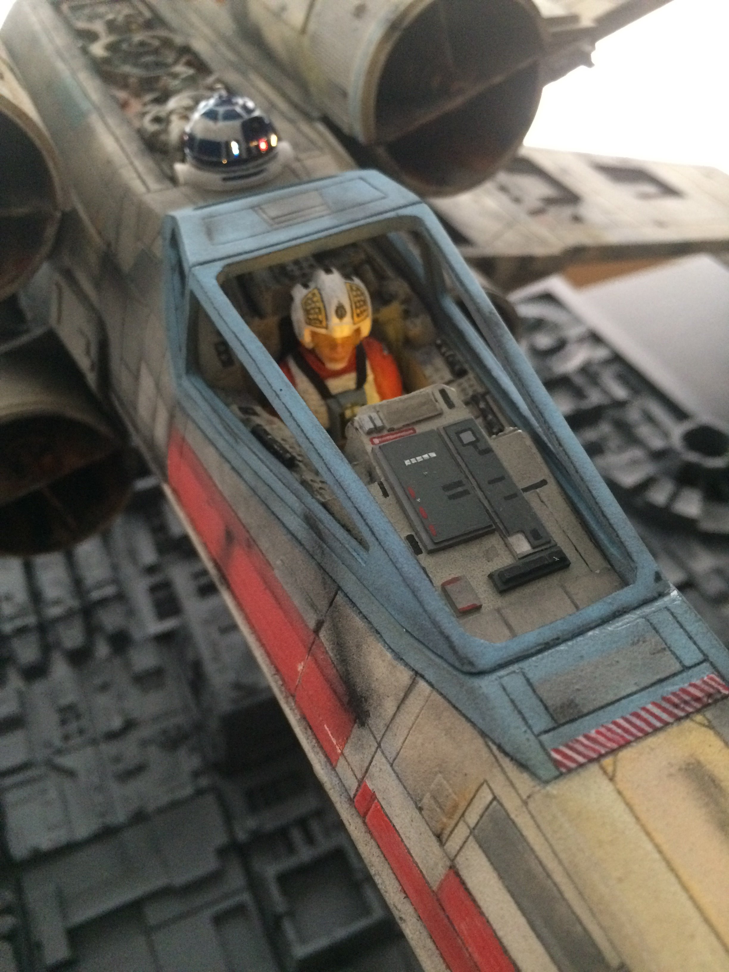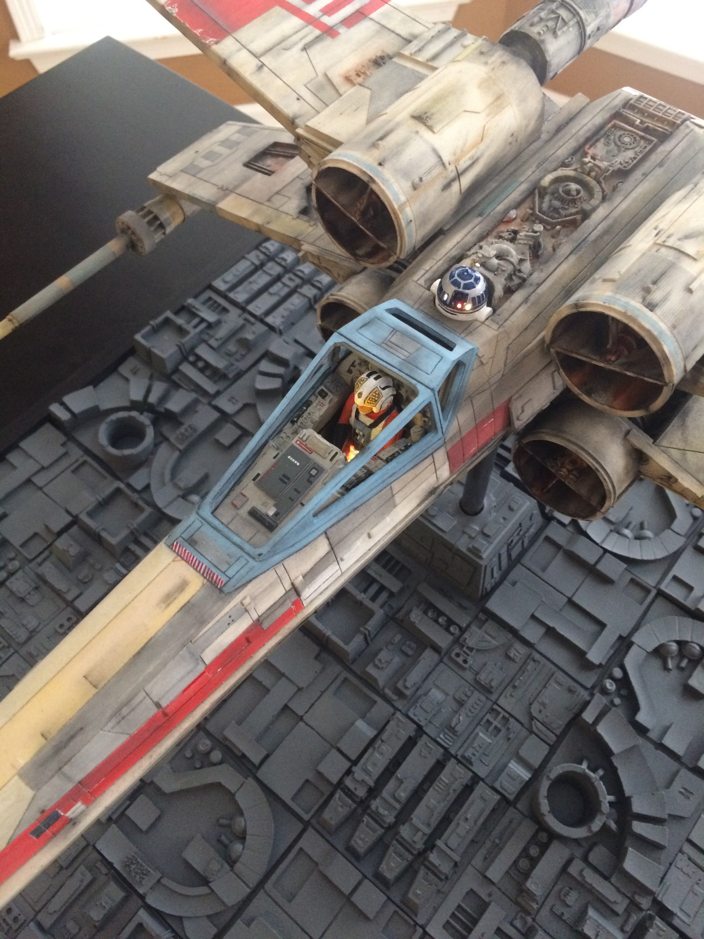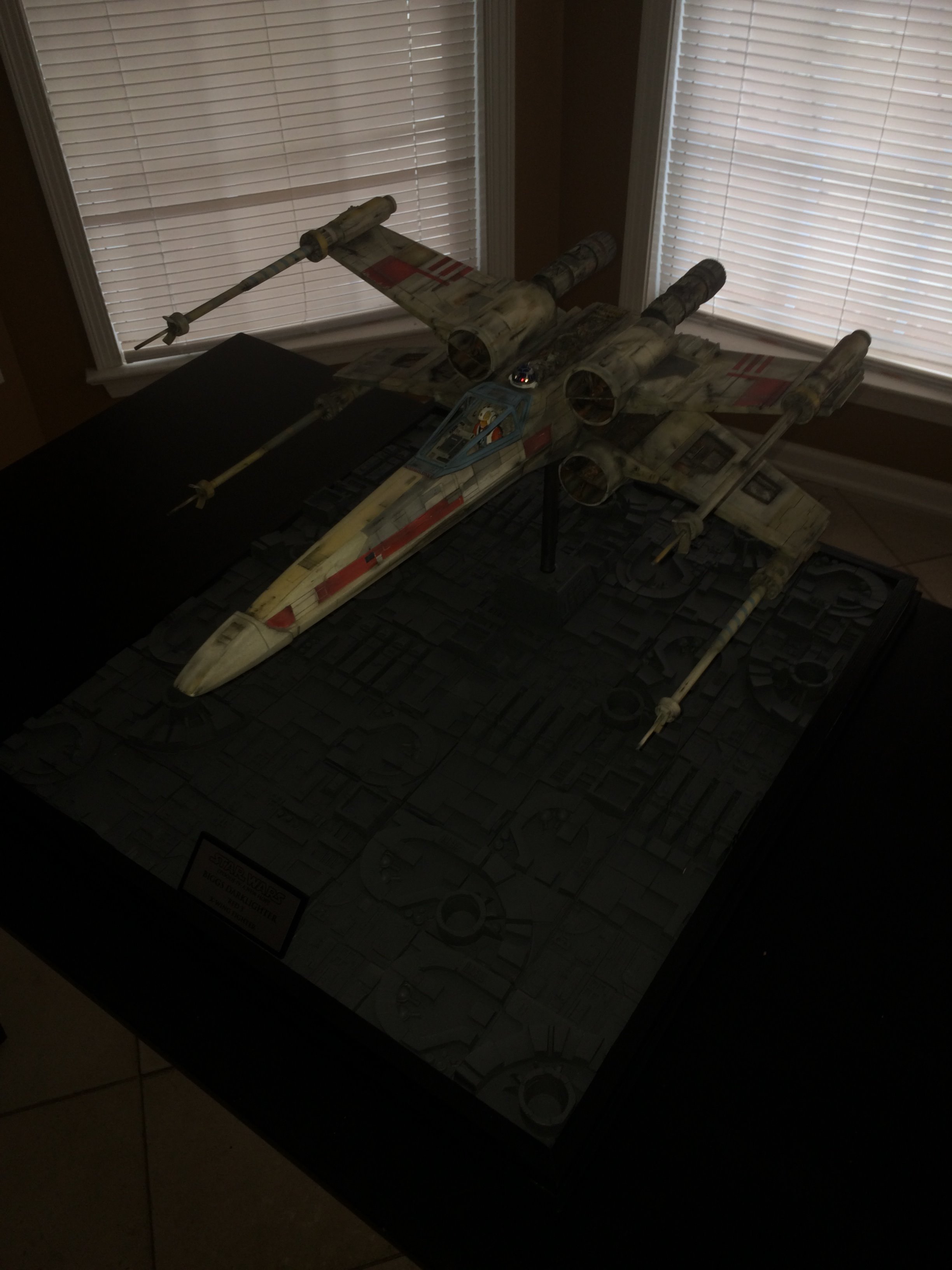 This was a commissioned build for famed Hollywood FX artist Greg Nicotero. He and I had talked about doing the SS scale paint scheme from the original 22″ new hope model (Biggs), but we both agreed that the 4 foot model was much more eye catching, with it’s weathering much more aggressive! Although the two different sized studio models don’t even come close to the same paint scheme, I was given artistic leeway to put the magic pixie-dust on it!