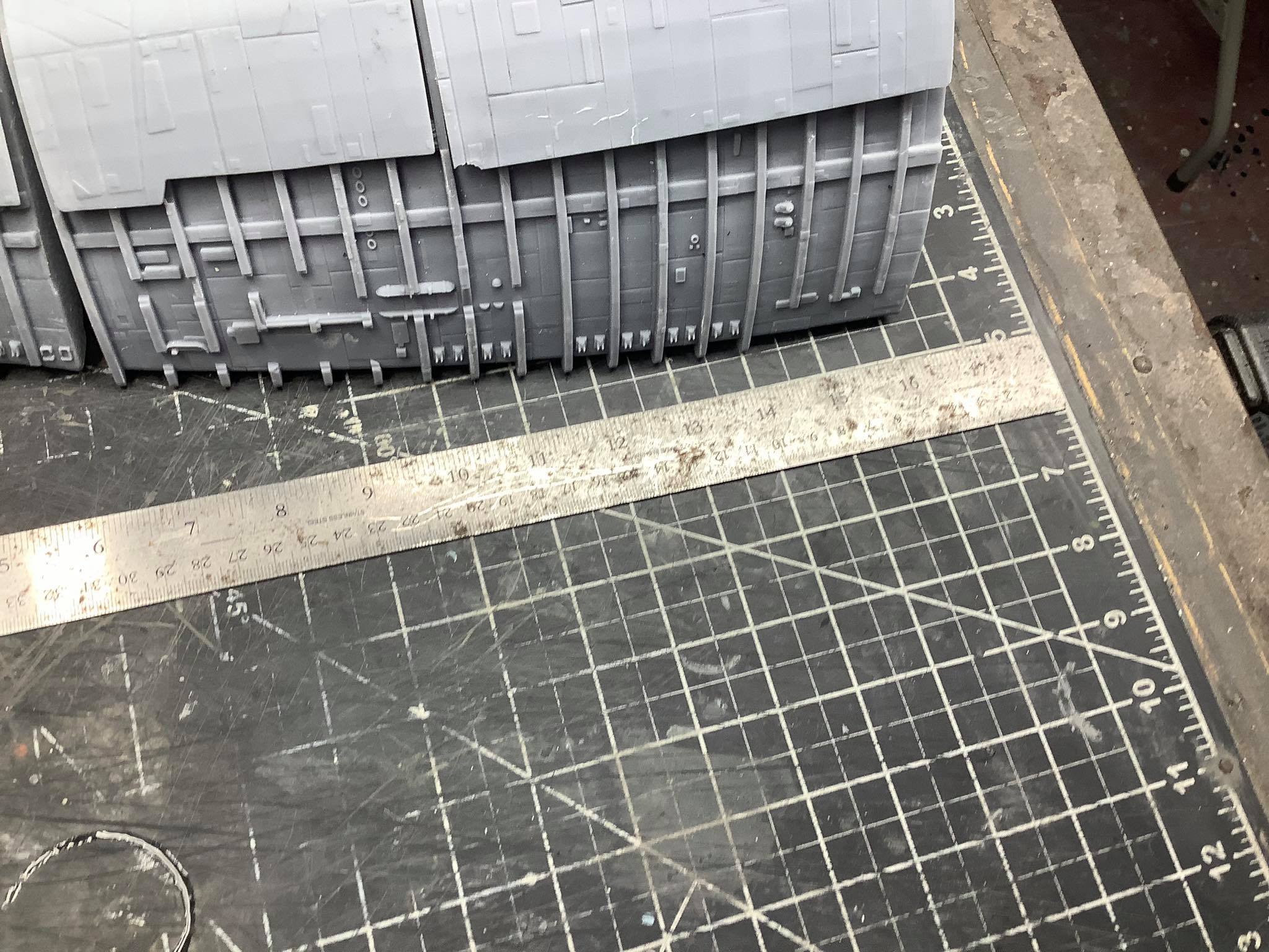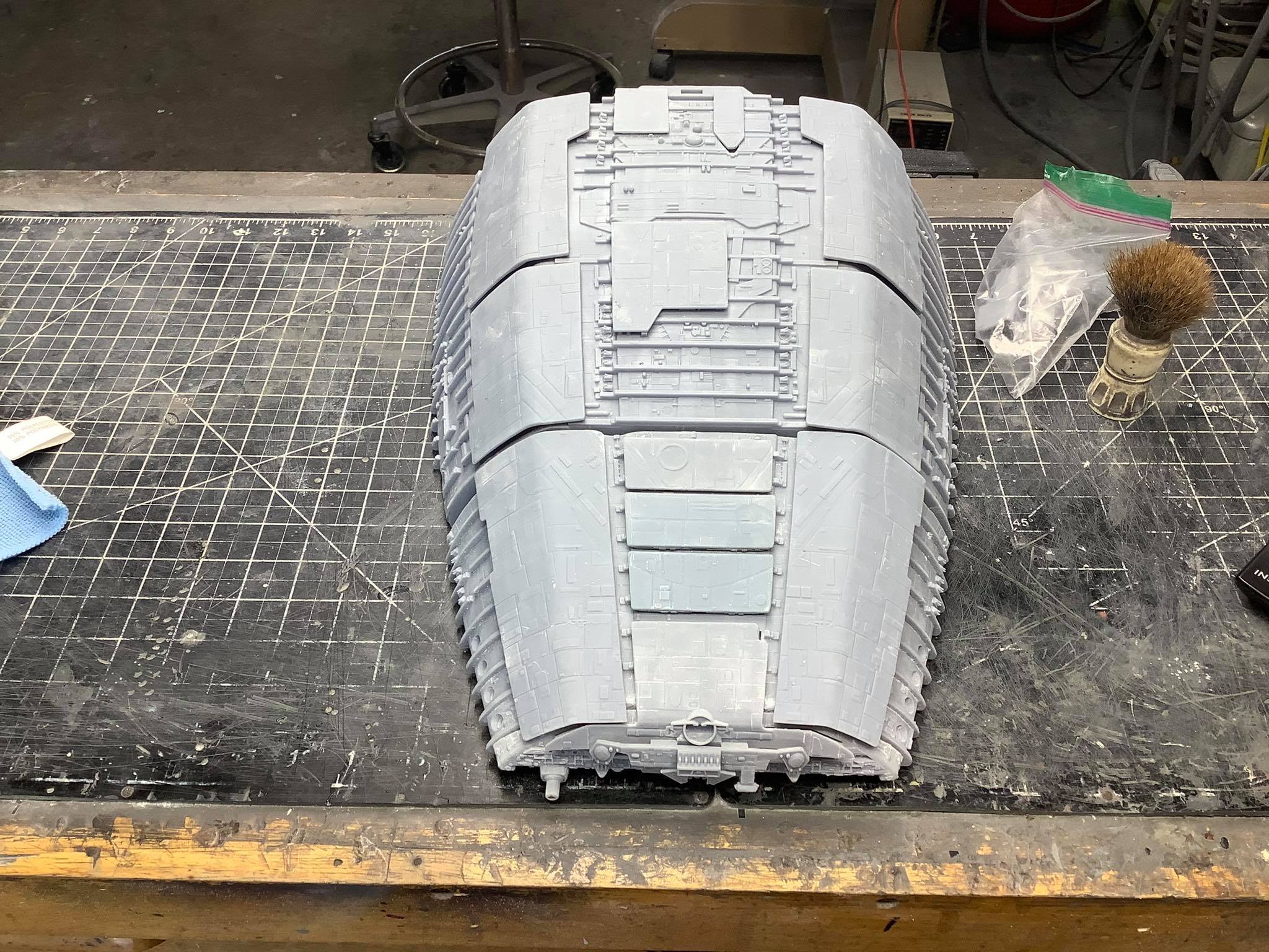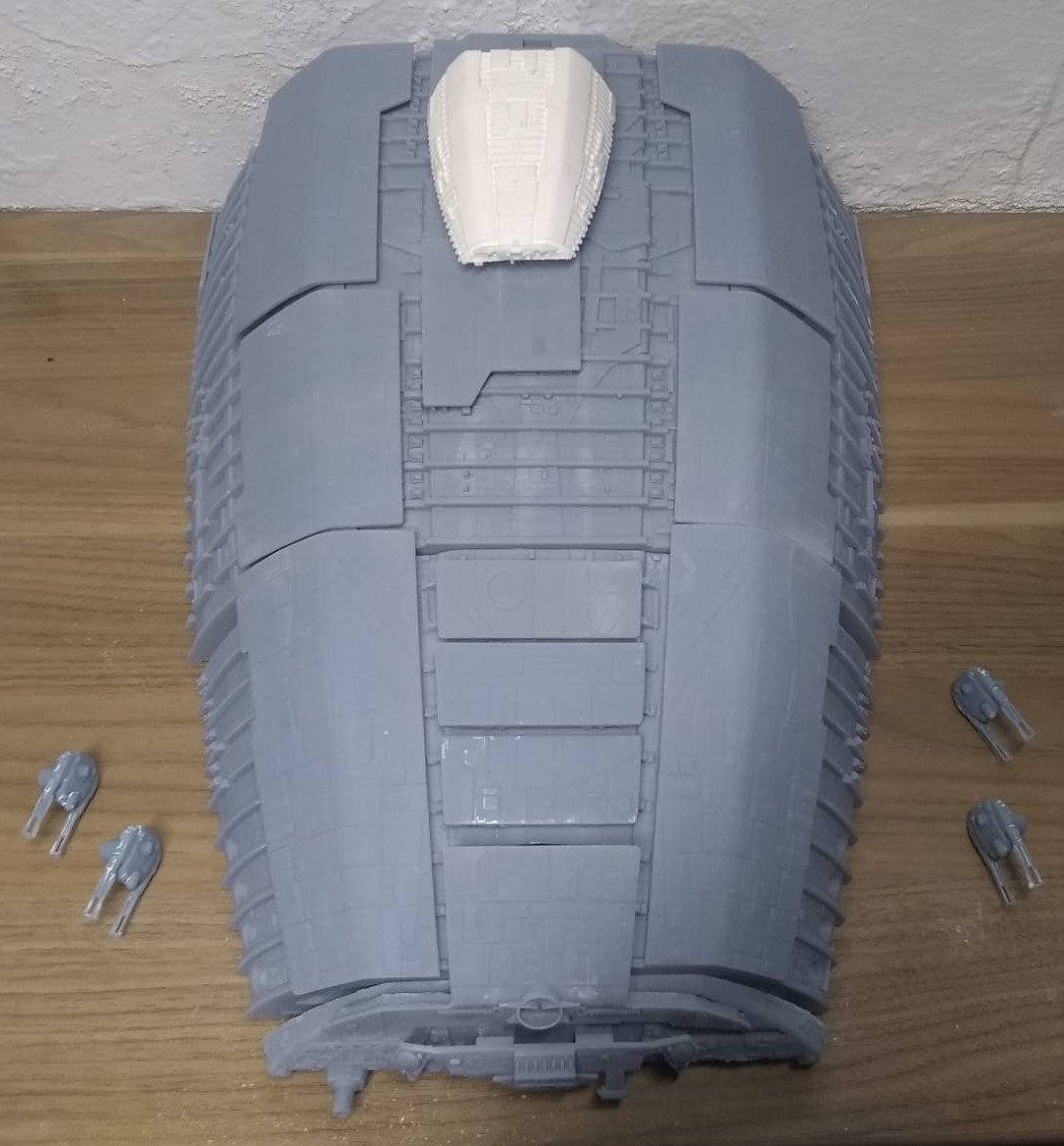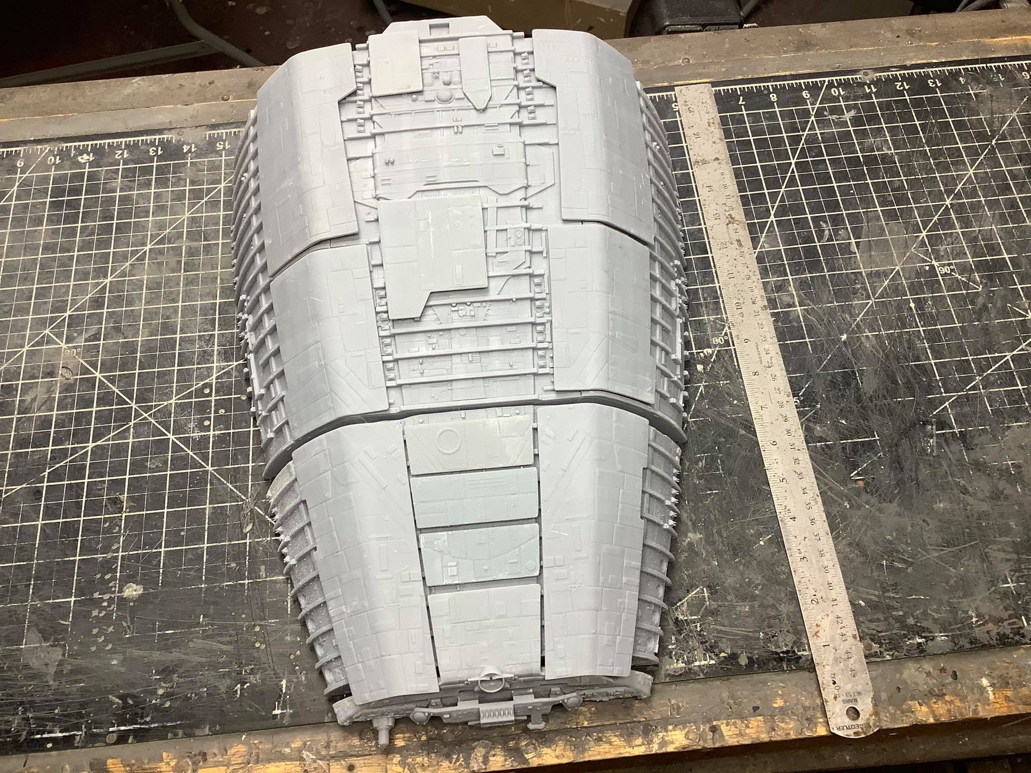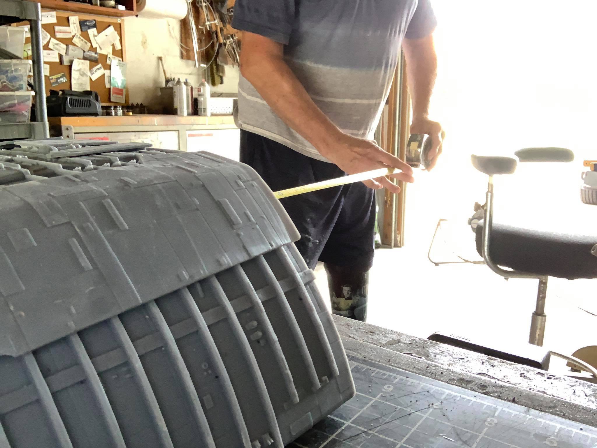 Below are some images. The photos on the brown table top (with the old Timeslip kit head shown for size reference) are taken by me. The photos on the cutting mat, and with Simon in the pictures, are taken by Simon Mercs. These photos are representative of the size and detail level that would be present in the kit, but there are obvious issues we had with the print, that are visible between some of the parts where they fit. These images are also not representative of the way the kit will be laid out for the G&T production. Going beyond , the armor plates will come off of the final version the same way that Tony Celliers kit does. I hope these images prove as exciting for you to see as they were for me when I saw the gargantuan size of this beast after I printed the parts.