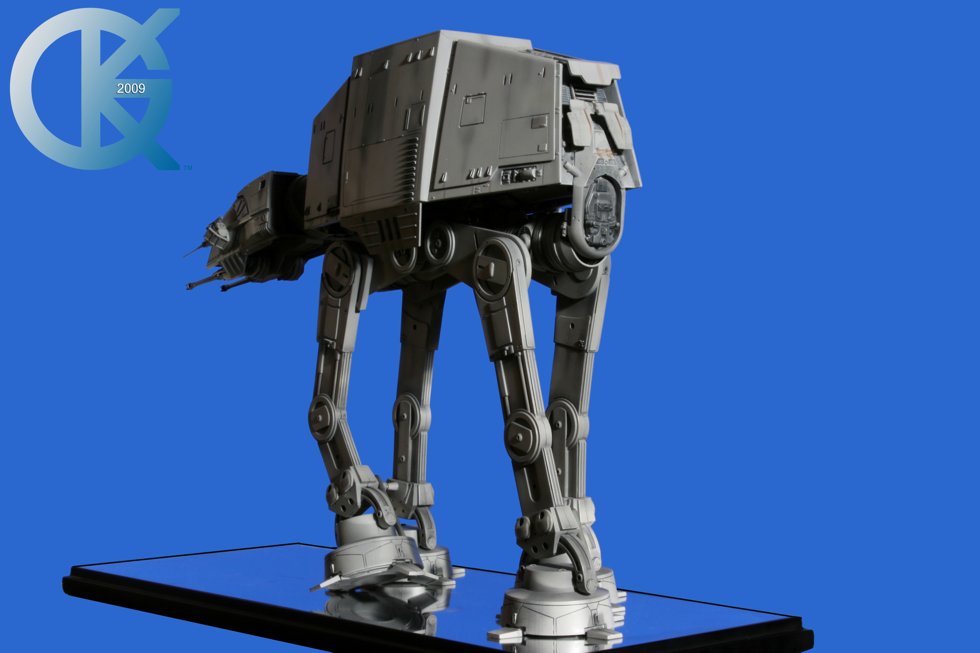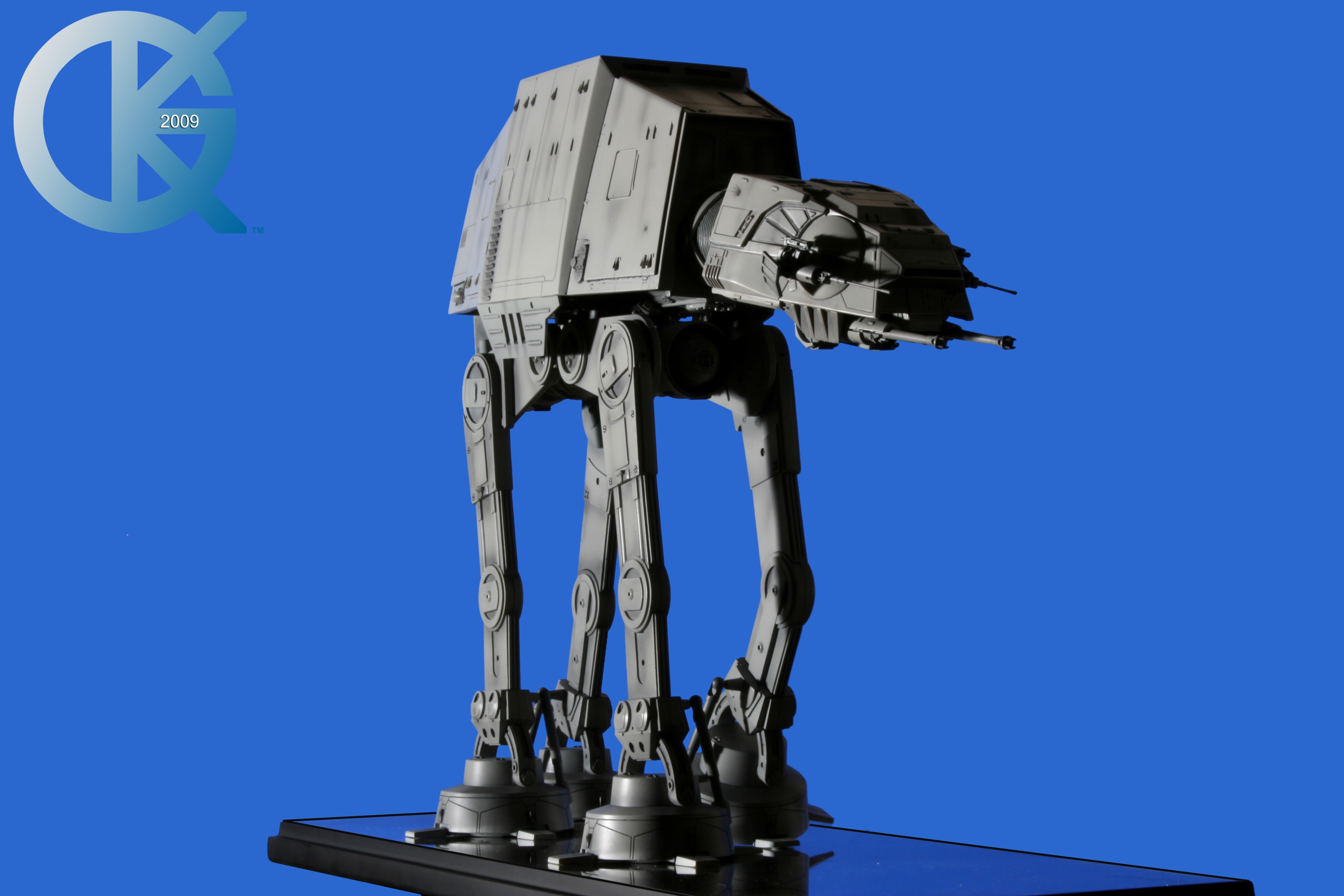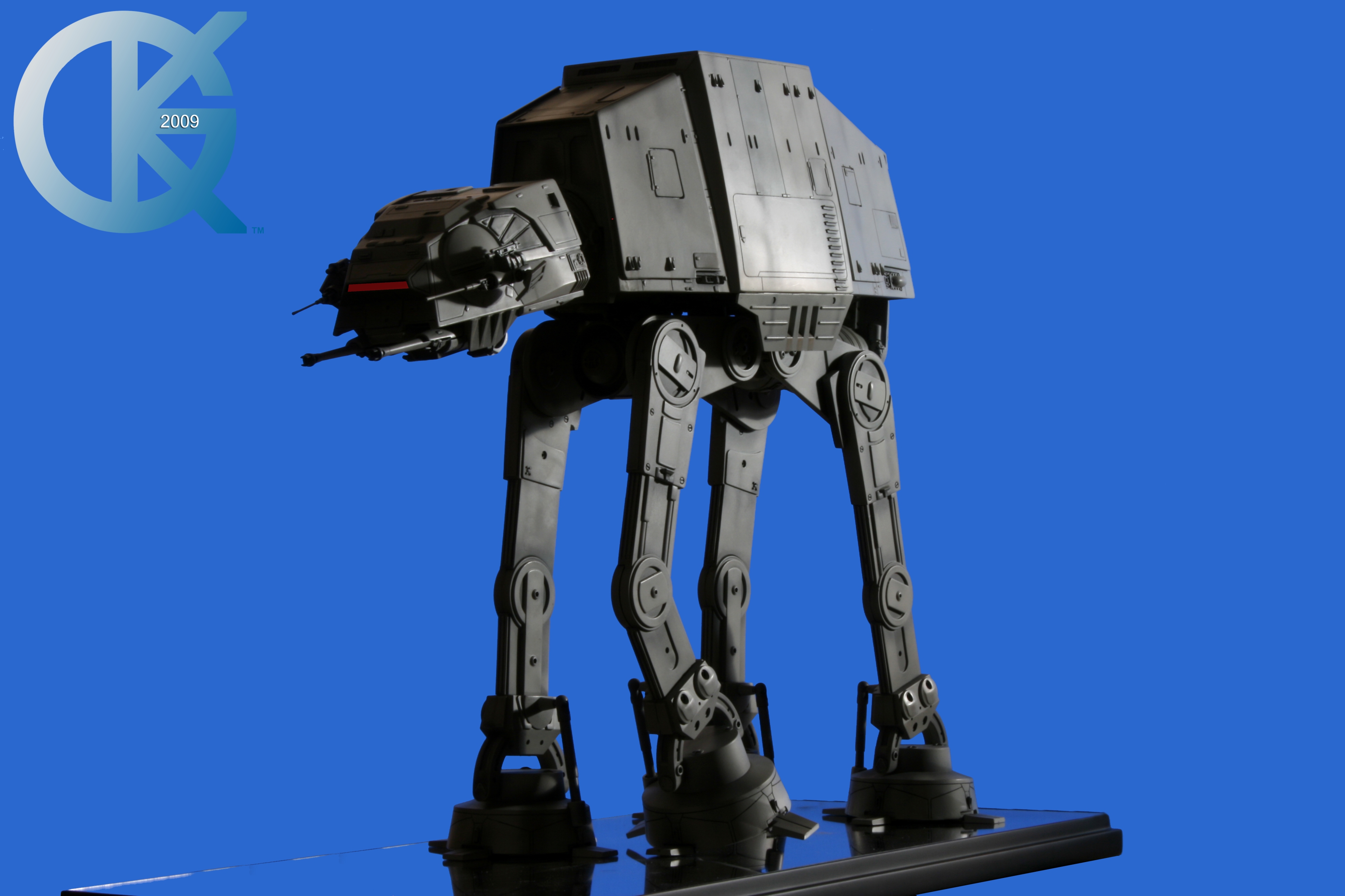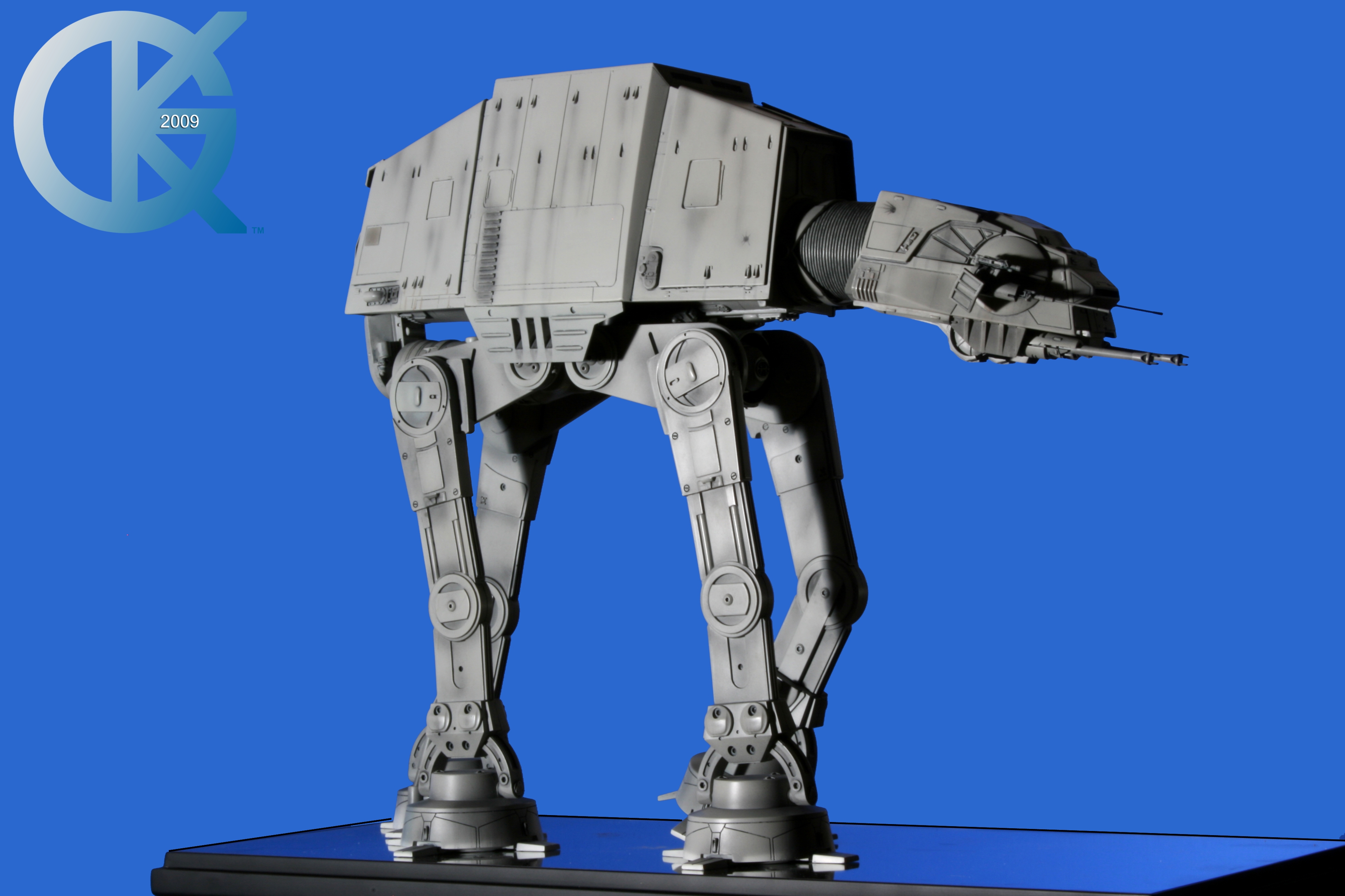 Shown here back on June 1, 2009, then sold to Hector Rosales on September 8, 2011,.. this excellent piece began life as the first Master Replicas studio scale AT-AT release back in 2004! I loved having this piece in the collection. Though not lit, it really showed well. I took Blue Screen Photos of the AT-AT with a blue screen draped table, making the table disappear as I idealized the blue screen effect for all to utilize the model itself in composites. I even removed the mirrored base in one photo just for fun..lol. This is exactly how it looked straight from the packaging. Since it didn’t come with a lighting option for the front head window, I couldn’t resist “Photoshopping” the ominous looking “red glowing color” into the single eye view port as it was seen in The Empire Strikes Back. That stated, this replica is of the original 19-inch high filming miniatures as seen in The Empire Strikes Back and measures approximately 23-inches x 9-inches x 19-inches. It came with an acrylic cover that finished the model display nicely. I am in hopes Hector loves this piece even today. Due to it’s rarity, it is valued today (2020/02) up to, and possibly over $5,000 USD. A great investment this continues to be.