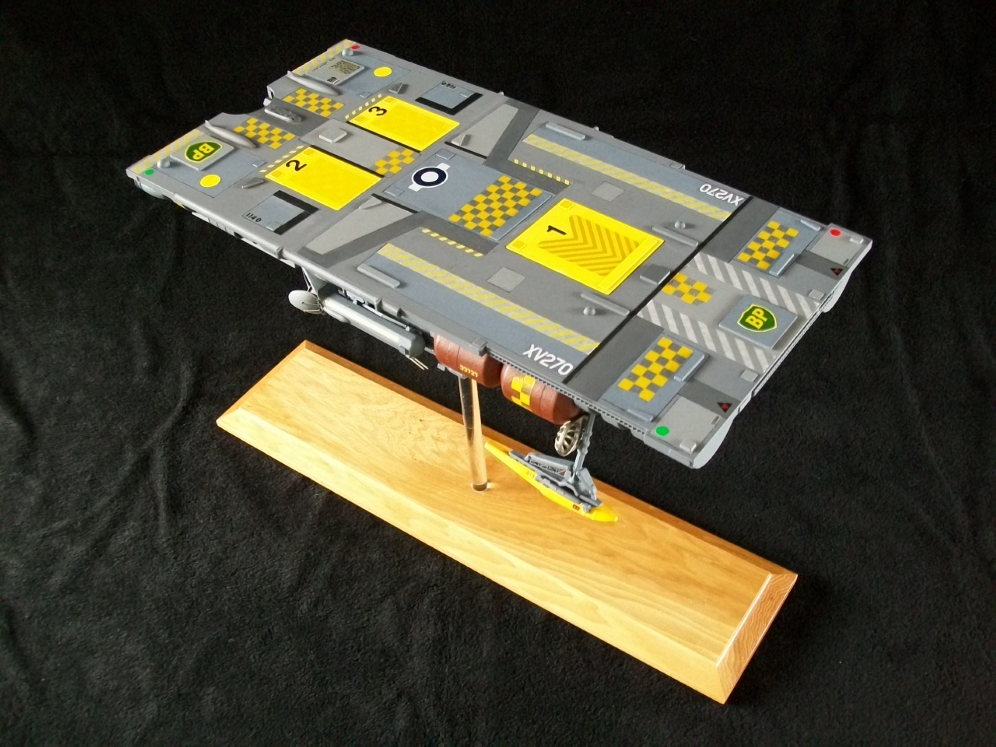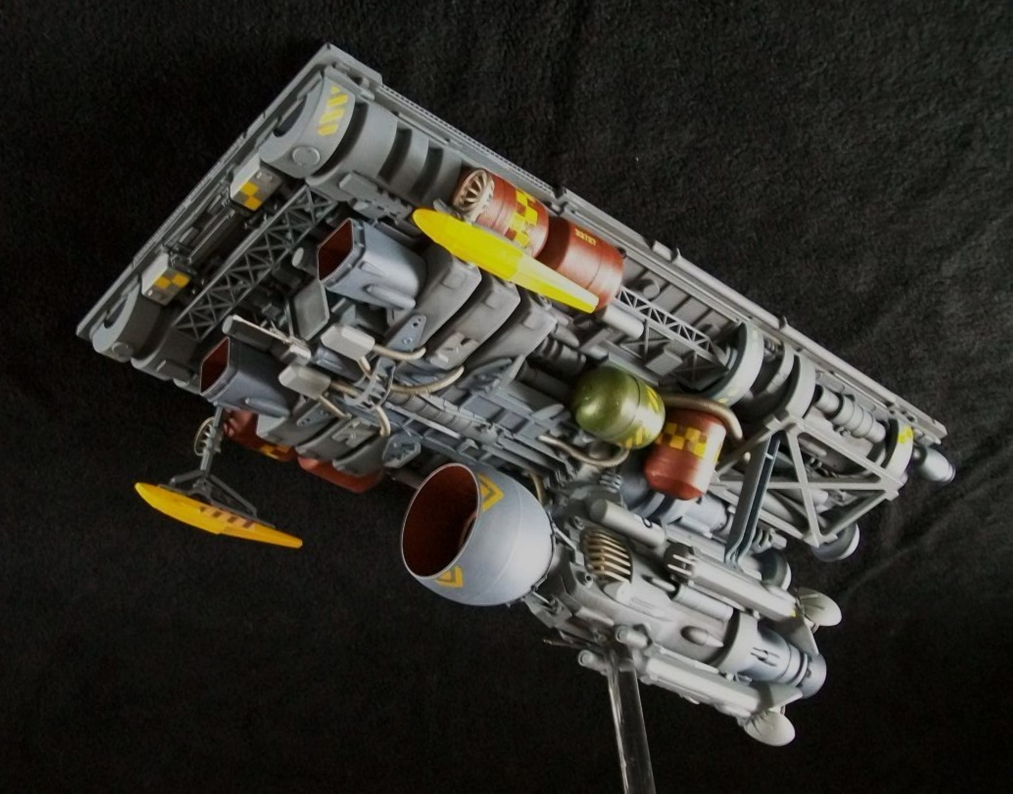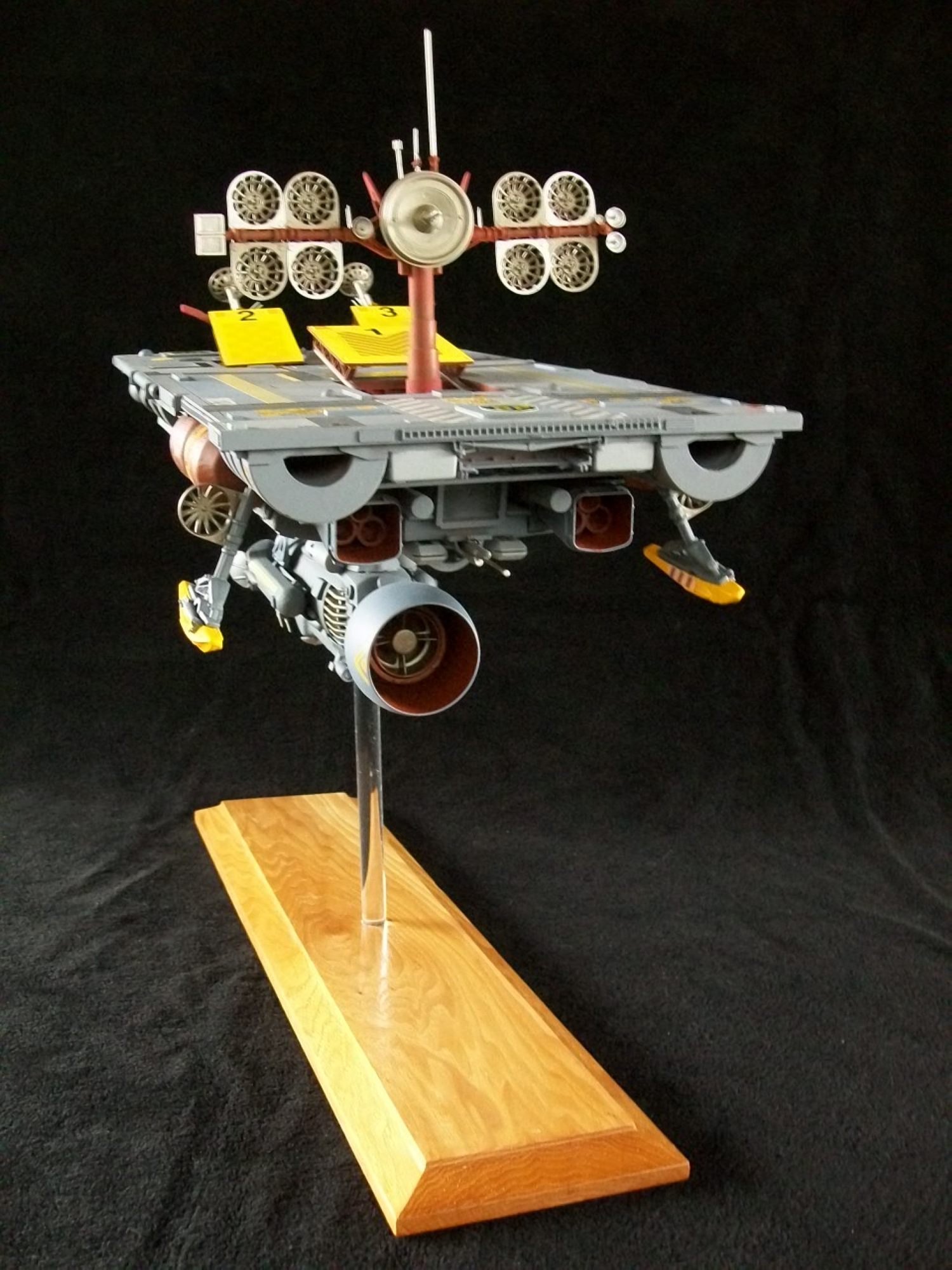 This most recent project was inspired by the “flattop” ship (a background rag tag fleet vessel) from the original Battlestar Galactica, as well as the ship from Moebius’s strip “It’s a Small Universe”. I liked the contrast between the flat, smooth surface with the very intricate underside. I began with a perspex plate (traced from the Moebius strip in AutoCAD , lazer cut to 17″ x 8″) and then followed many an evening of arranging and deconstructing many shapes, the traditional Kinder eggs and the newly discovered Zaini eggs, contact lens cases, greeblies, and nurnies. I didn’t have the luxury of an endless supply of parts like the big shops do so I had to be creative. Eventually a suitable configuration was established and painting began. No special techniques but I went totally “Foss” with the upper deck. I used paint, transfers and assorted tapes on the surface. A logical reason for the flattop was necessary, so I came up with the idea of having sensor arrays which retract under the deck when not in use.
