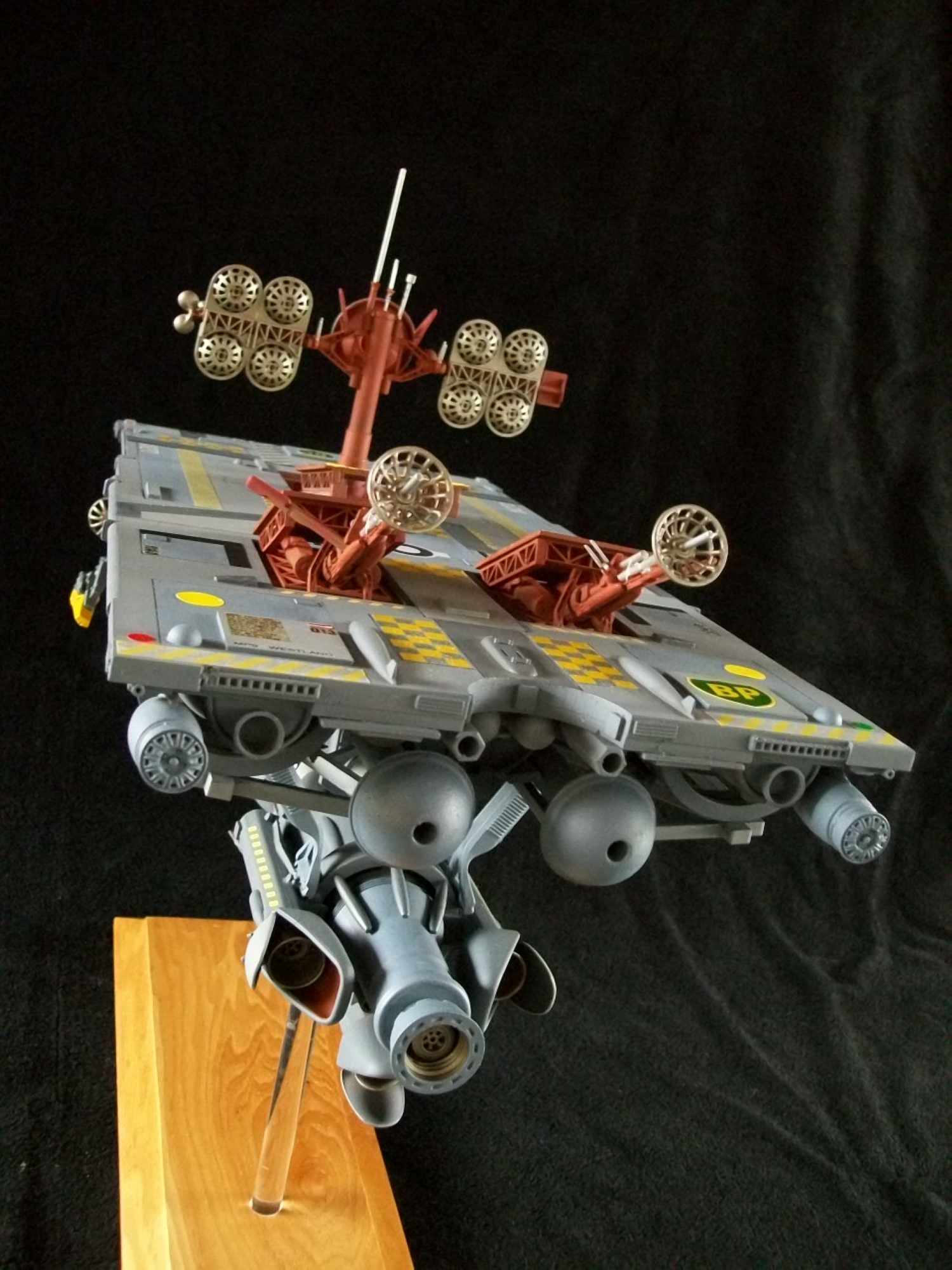 I needed a back story to the model. I thought maybe another Galactica ship, or slap a Weyland-Yutani logo on it and make it part of the Alien universe. Eventually I decided on making it part of my fake TV series “Space: 2019” (see previous post), as the guest model in the SE01-EP13 “Collision Course”. The HMCSS (Her Majesty’s Commercial Space Ship) Gibraltar, owned by the British Petroleum Corporation, is out surveying the solar system for asteroids and other possible resources for mining. The ship discovers a large rogue asteroid which will impact Earth with devasting results. The remainder of the episode is trying to stop it…. For more info feel free to visit The Breakers Yard.