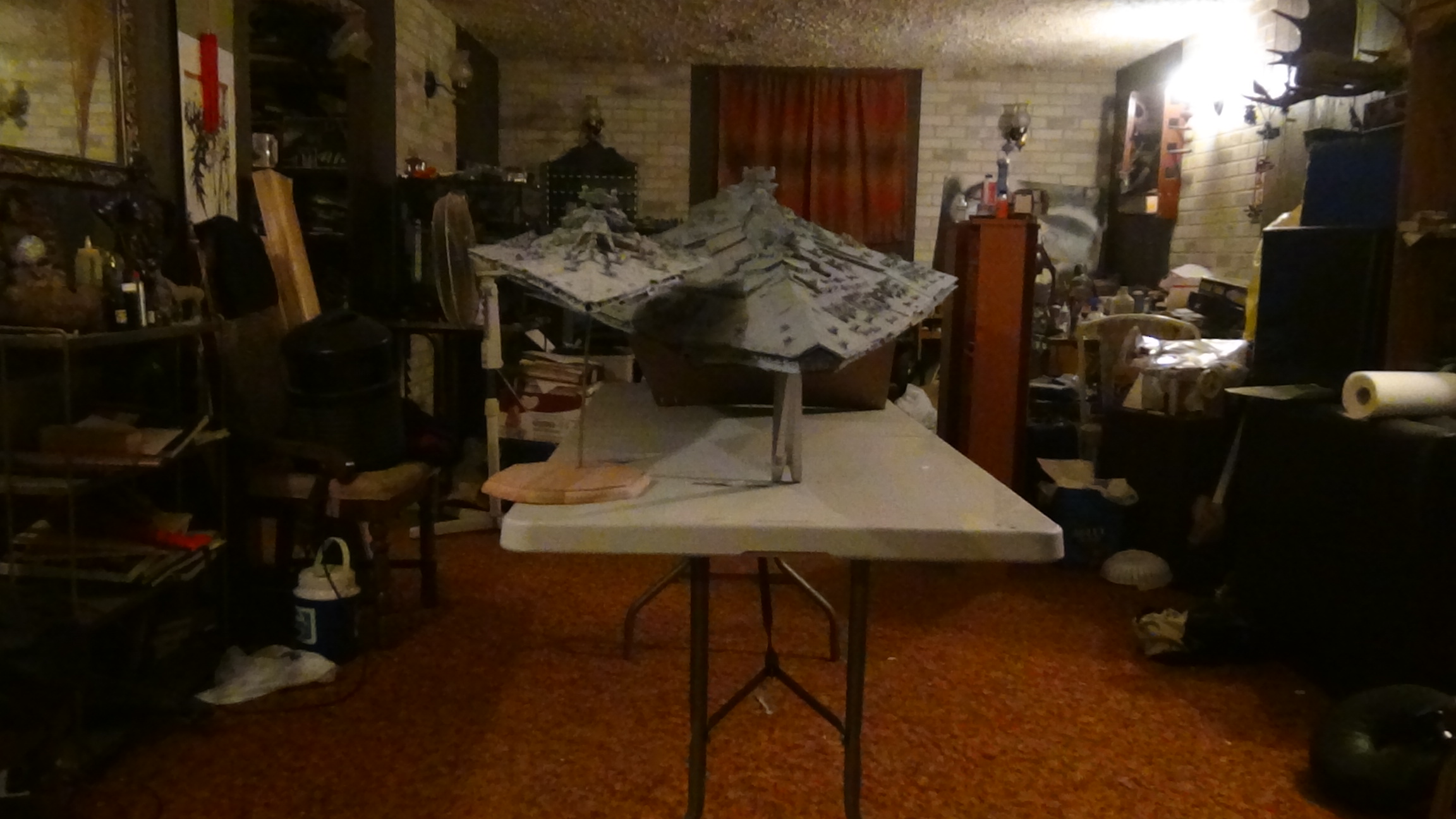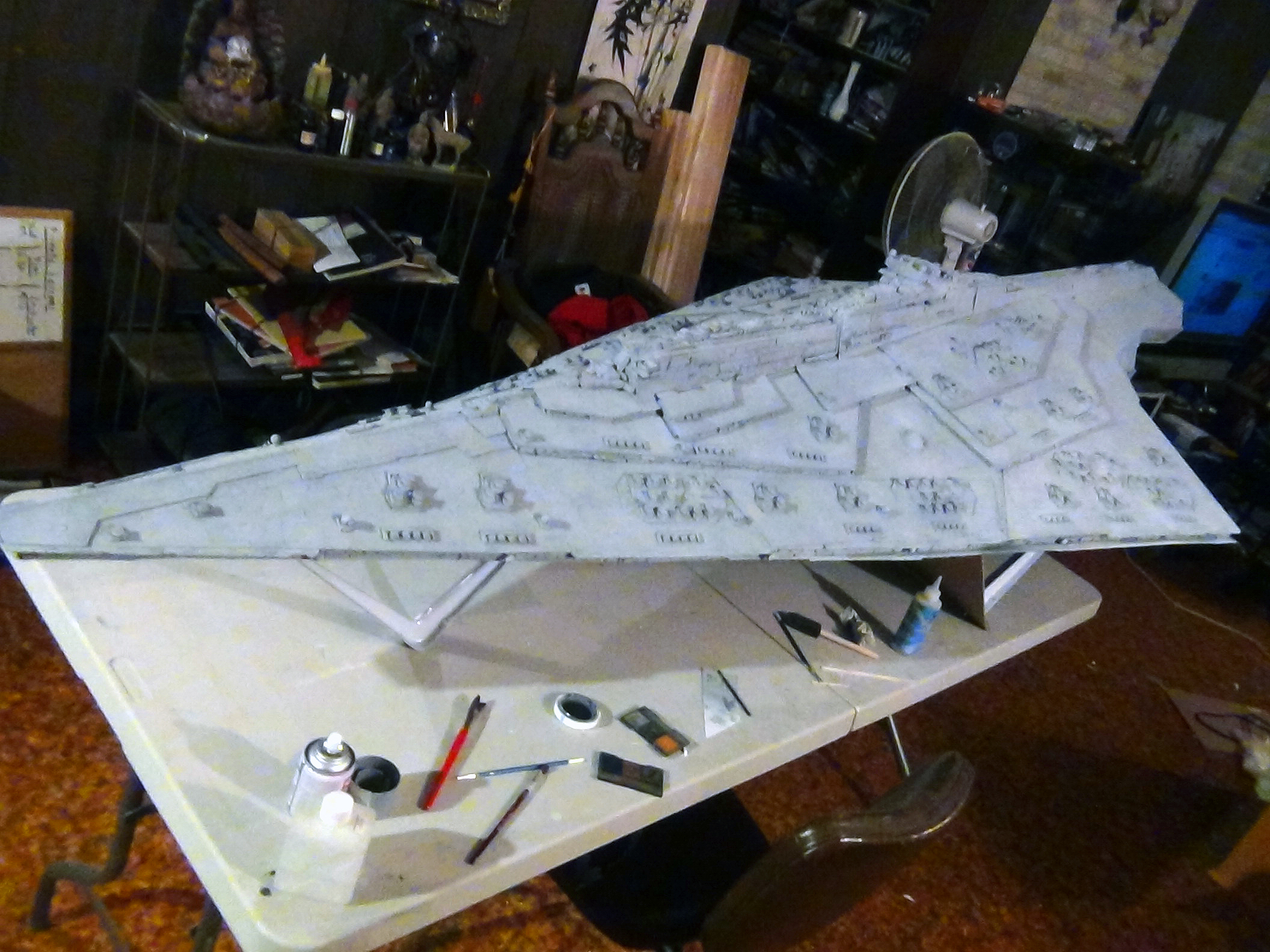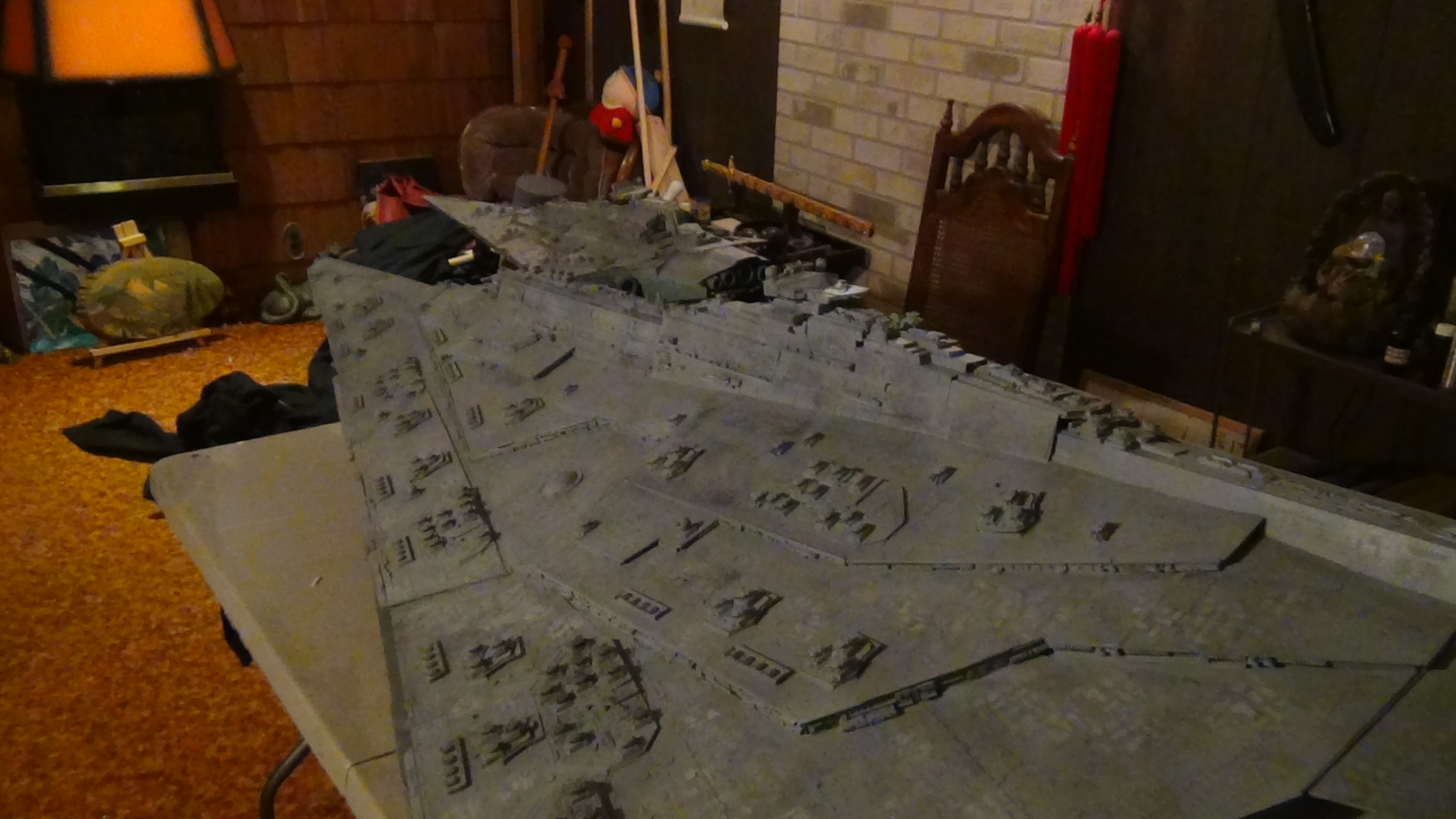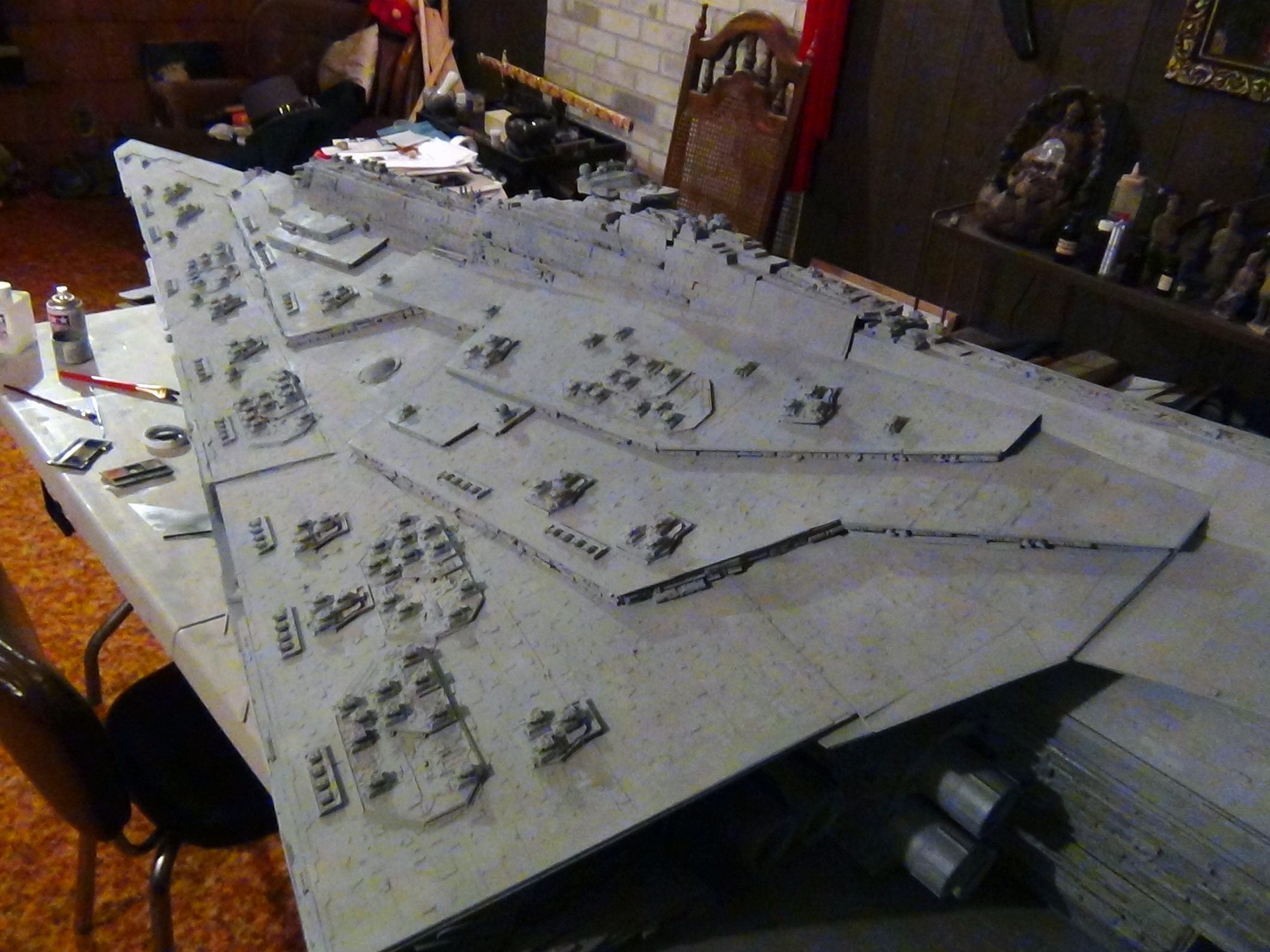 I do not know how many individual pieces make up the ASSERTOR. Possible 10’s of thousands. 95% of it was carved with an exacto knife and a dremel.The Wash did not work out well and you will see some spots where it is to heavy. The Tiling fades with time into the undercoat.