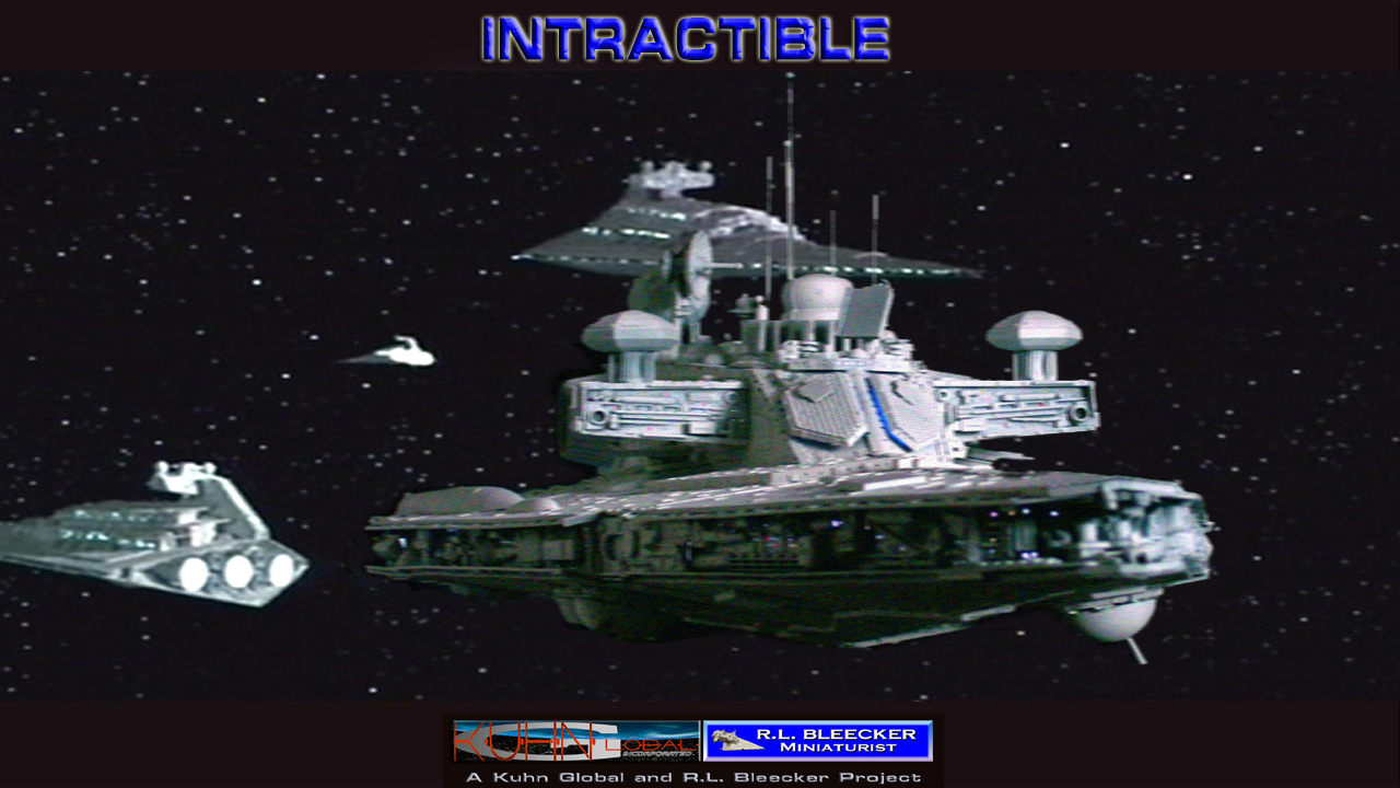 Just a little less than half the size of an Imperial Star Destroyer, the newest Imperial Cutter “INTRACTIBLE” goes into action for her first space trails. Built as a major offensive weapon, the Intractible houses major jamming components, in that when she jumps into a hostile system, moments before the other attacking Imperial Forces, she is able to literally jam all electronic signals… not only communication, but navigation as well…. temporarily ceasing productive function aboard any vessel within range of her highly radio-active transmitting dishes and panels! Needless to say, leaving any opposing force quite helpless for crucial moments in the start of a battle.