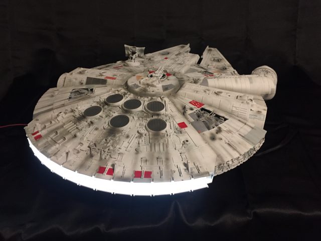 Hasbro releasing this toy was a dream come true, the proportions are spot on, it is almost the same size as the ILM model just shy of a few inches. I got this for Christmas a few years ago and worked on it off and on. The reason this took so long to do was because I started working freelance for a group of Toy Designers and sculpted a doll that is being released by Spinmaster toys this fall. I sculpted the one prototype until I worked on what ended up becoming the production sculpt for 4 variants of the doll. When the work on the doll wrapped up last November I went to work on the Falcon, realizing my dream of having built a studio scale Millennium Falcon. I bought a few items from Shapeways that were 3D printed, the ESB cockpit cone and the Quad-Lasers. I scratched and bashed the rest of the detailing that was missing as well as used Randy Cooper’s Photo-etched pieces that he designed. I built a housing for an LED strip to go into the back for the Hyperdrive engine. This could be a bone of contention, but the glow of the engine is white, not blue. I cannot understand why people make it blue, it’s not! To create the damage on the hull I simply used a solder gun and melted the hull while being careful not to go through the hull. For the paint I mixed my own colors for the hull. I got Testors light grey and mixed it with white to get a lighter grey and added paint thinner to the mix so it would go through my airbrush without clogging up. The other colors are Testors Acryl paints. I also used powdered pigments to add some rust and streaking to the hull.