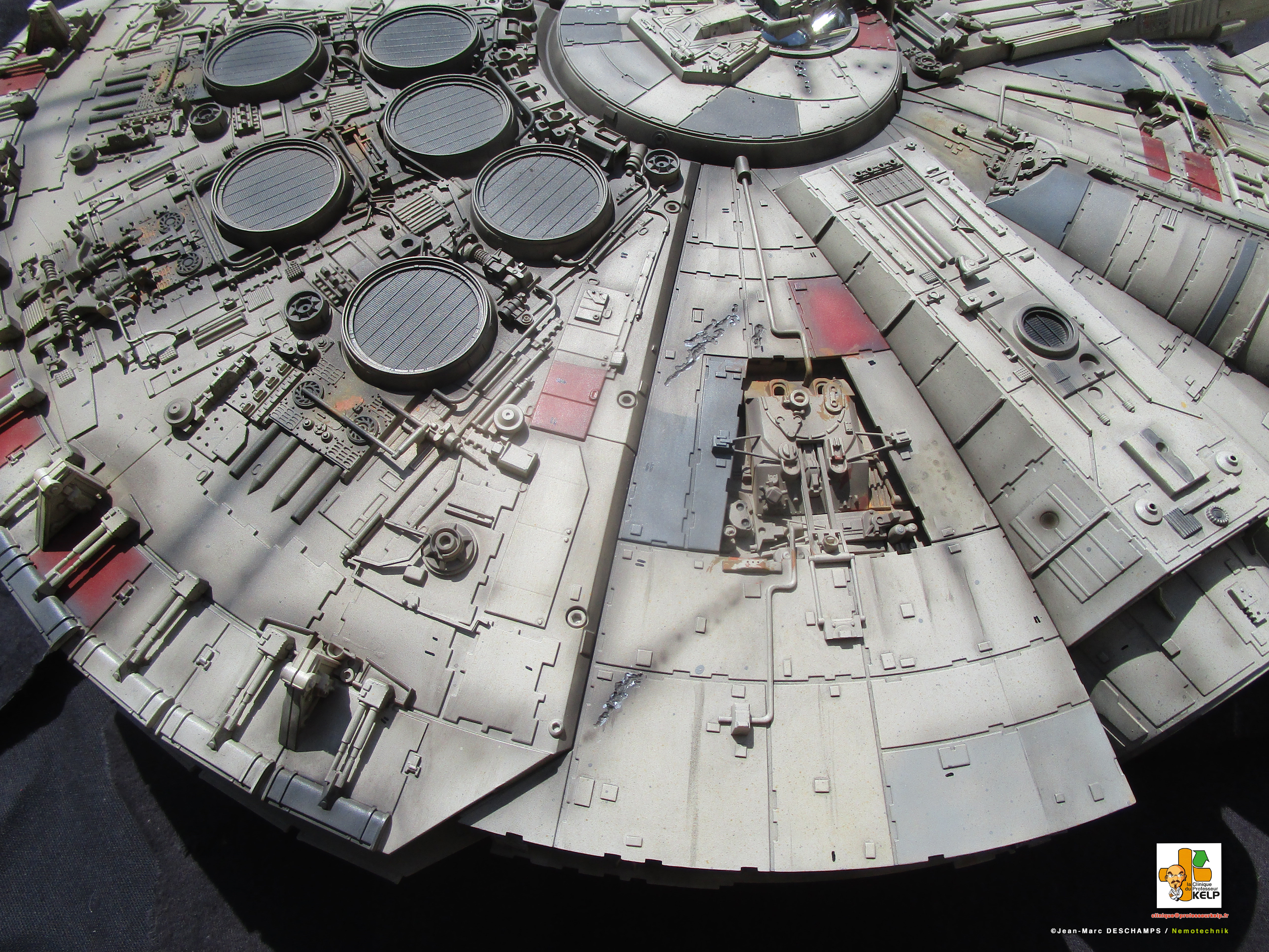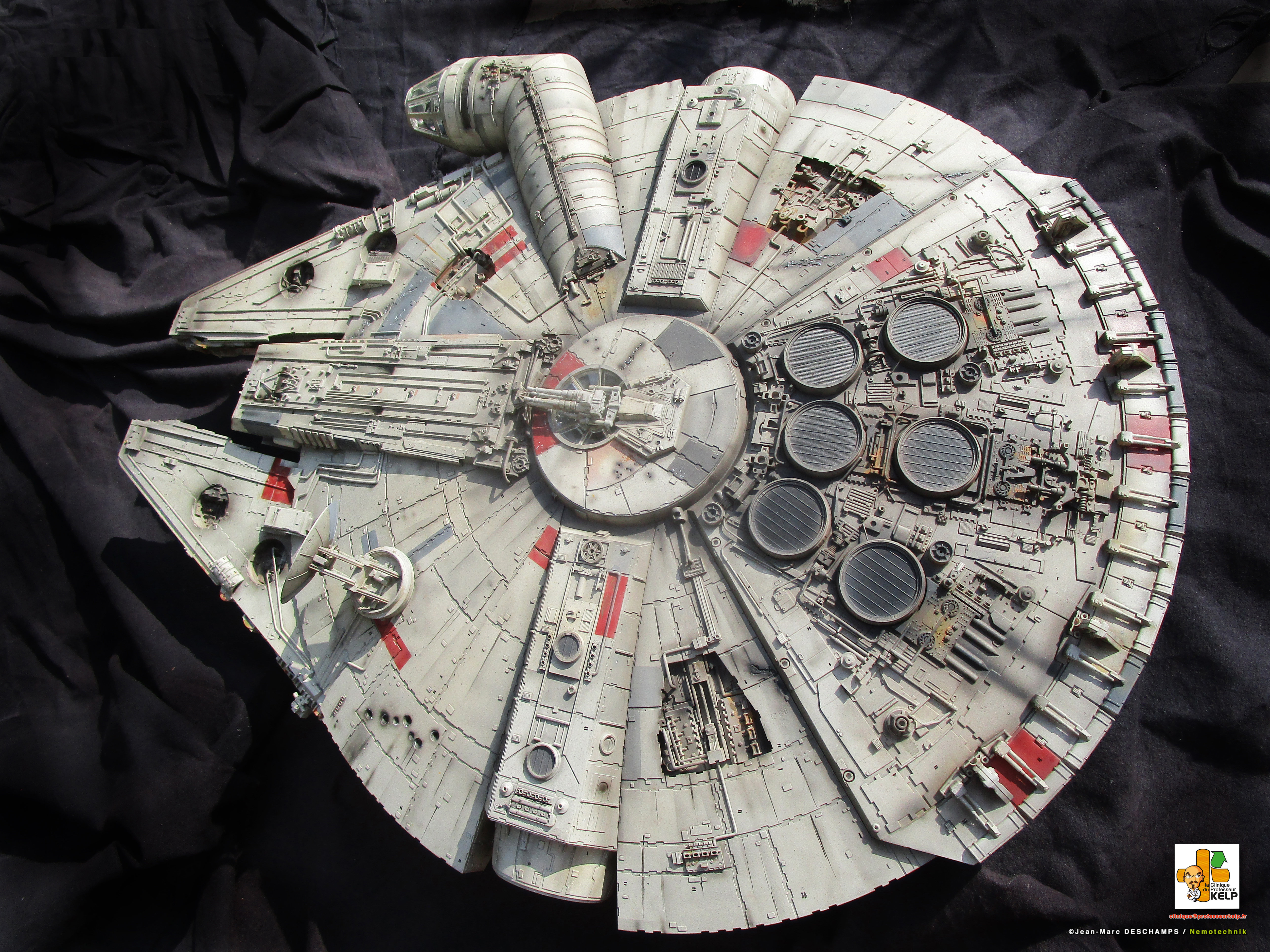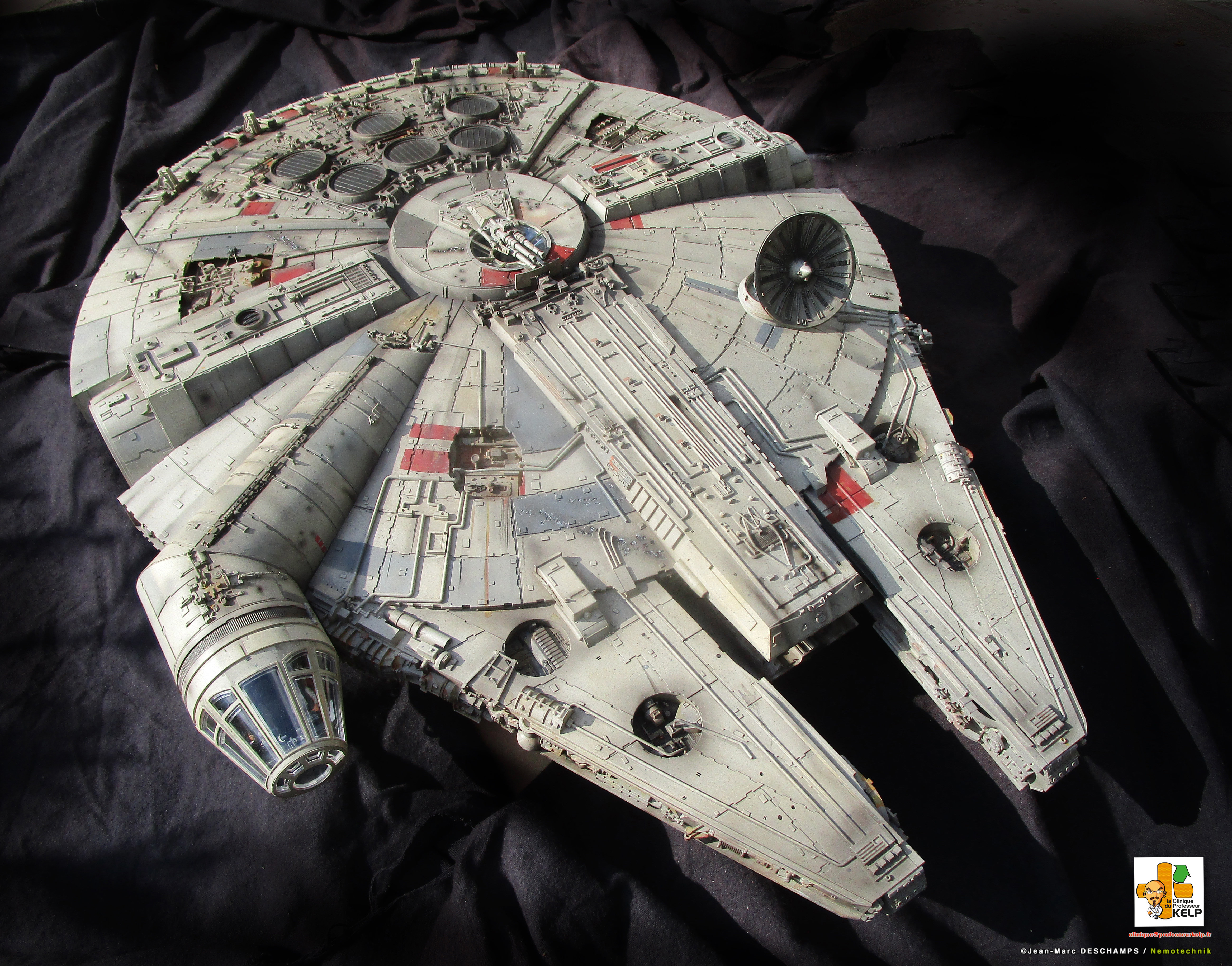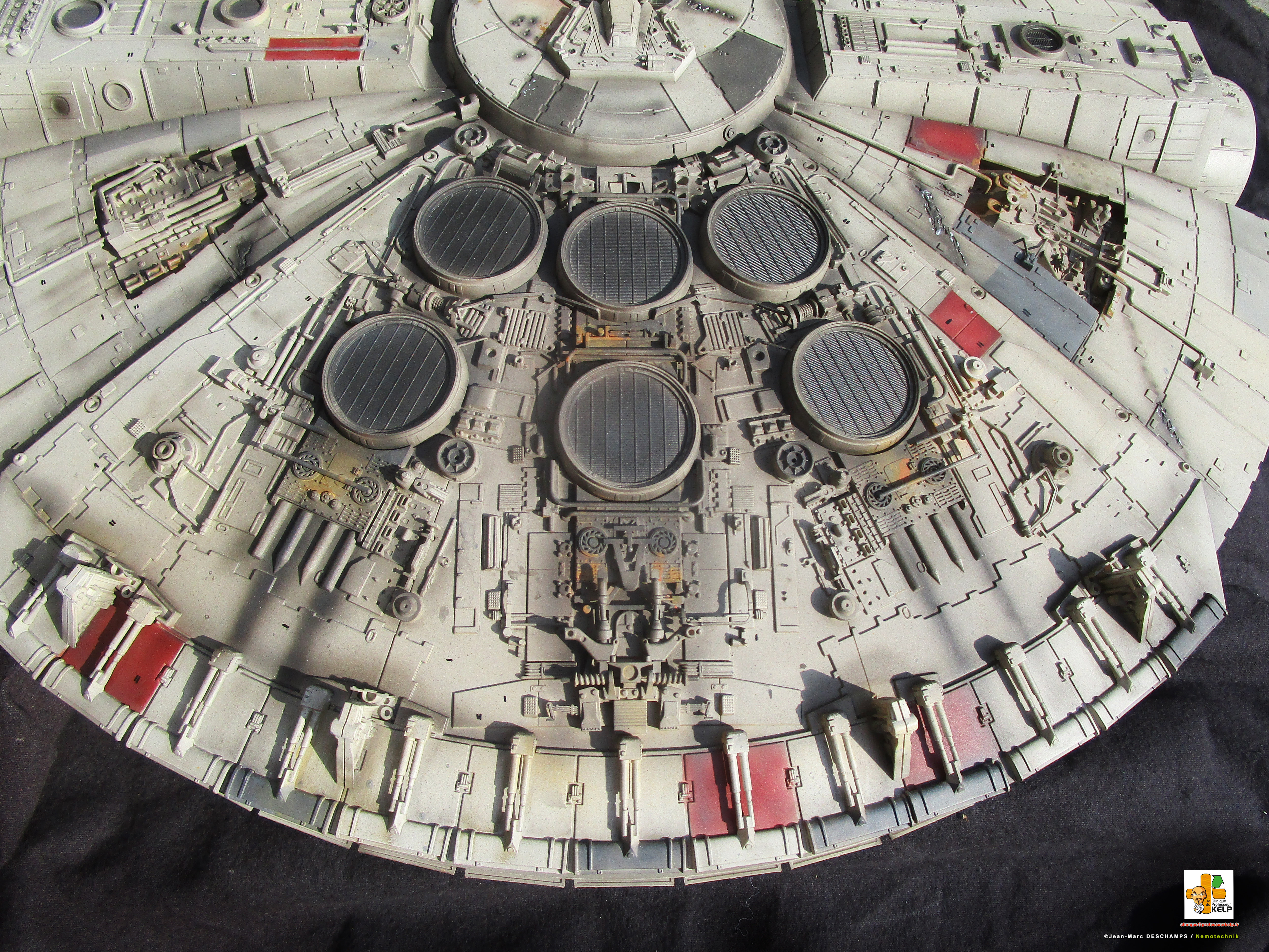Gentlemen, I have the pleasure to present you my paint job on a DeAgostini Millennium Falcon for a customer named Paul Schach, who became a close friend. Paul wanted his baby paint a little bit more contrasted than the original model. I improved the replica by dremeling all the laser impacts and by adding resin figures in the cockpit. Purists and Empire sympathizers may say the figures characters are those from Star Wars ANH and not ESB from this Millennium comes. As the customer would reply, it’s Star Wars anyway, and if there are windows on the cockpit, it is to prevent air leaking!