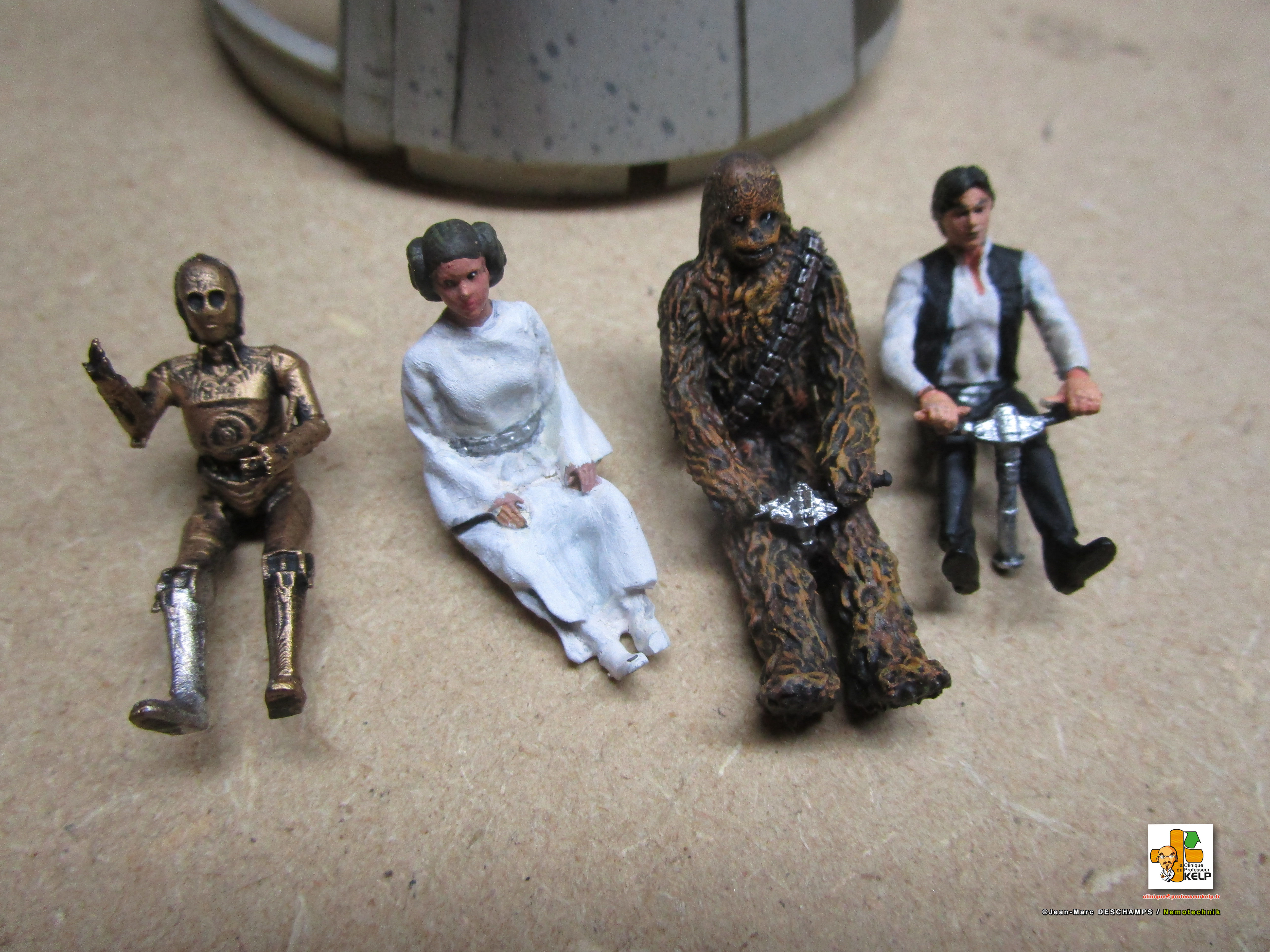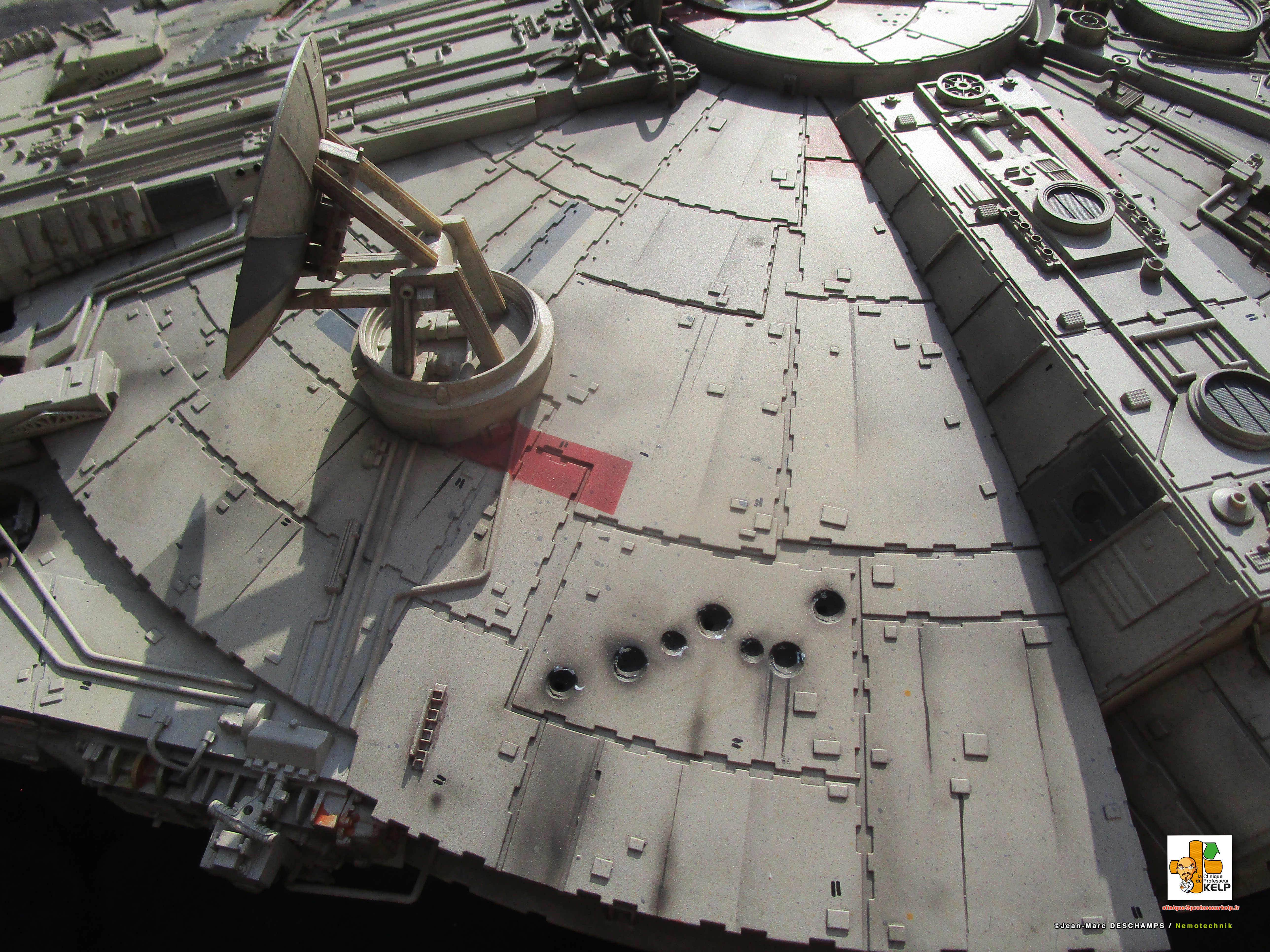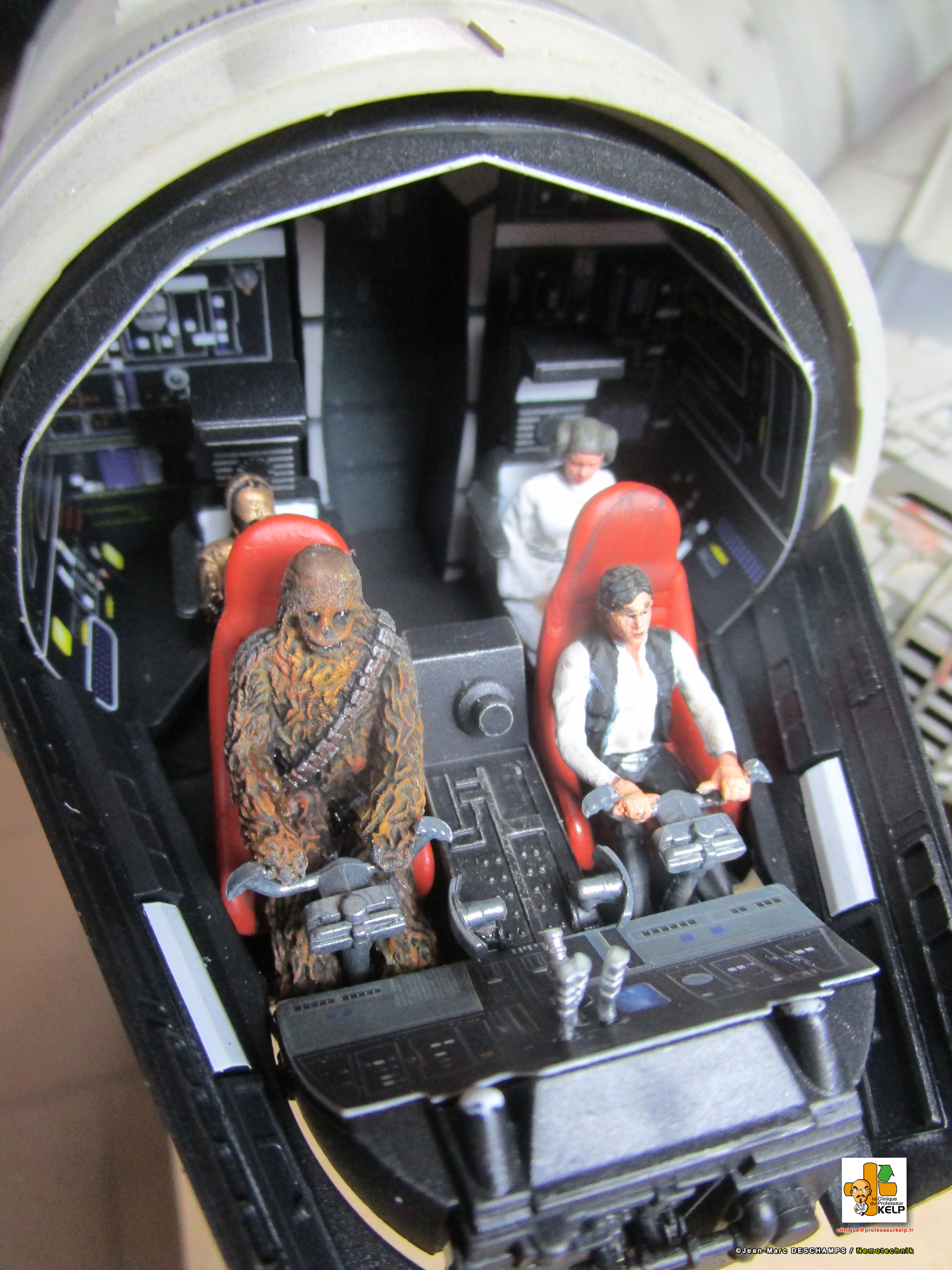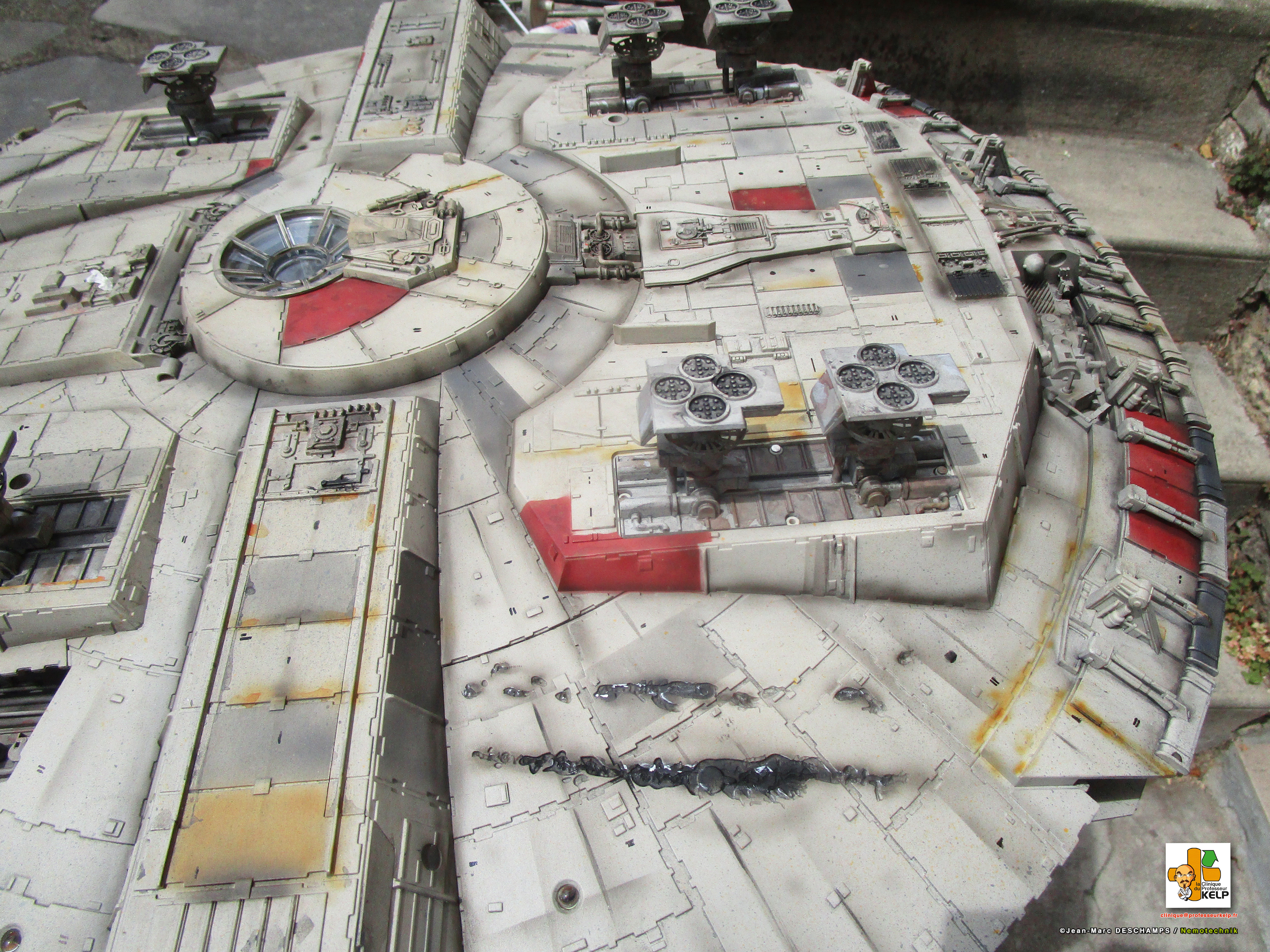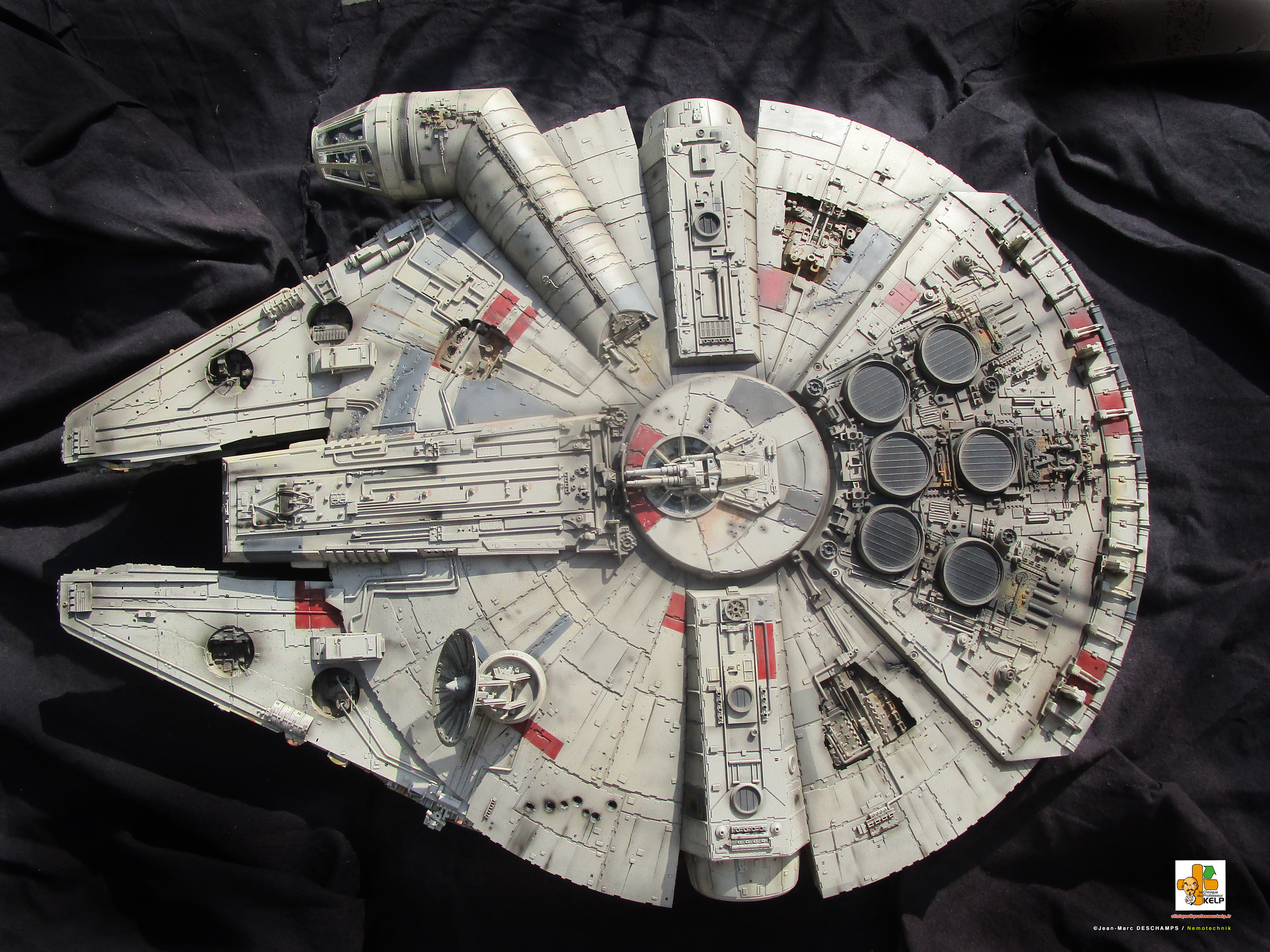 Gentlemen, I have the pleasure to present you my paint job on a DeAgostini Millennium Falcon for a customer named Paul Schach, who became a close friend. Paul wanted his baby paint a little bit more contrasted than the original model. I improved the replica by dremeling all the laser impacts and by adding resin figures in the cockpit. Purists and Empire sympathizers may say the figures characters are those from Star Wars ANH and not ESB from this Millennium comes. As the customer would reply, it’s Star Wars anyway, and if there are windows on the cockpit, it is to prevent air leaking!