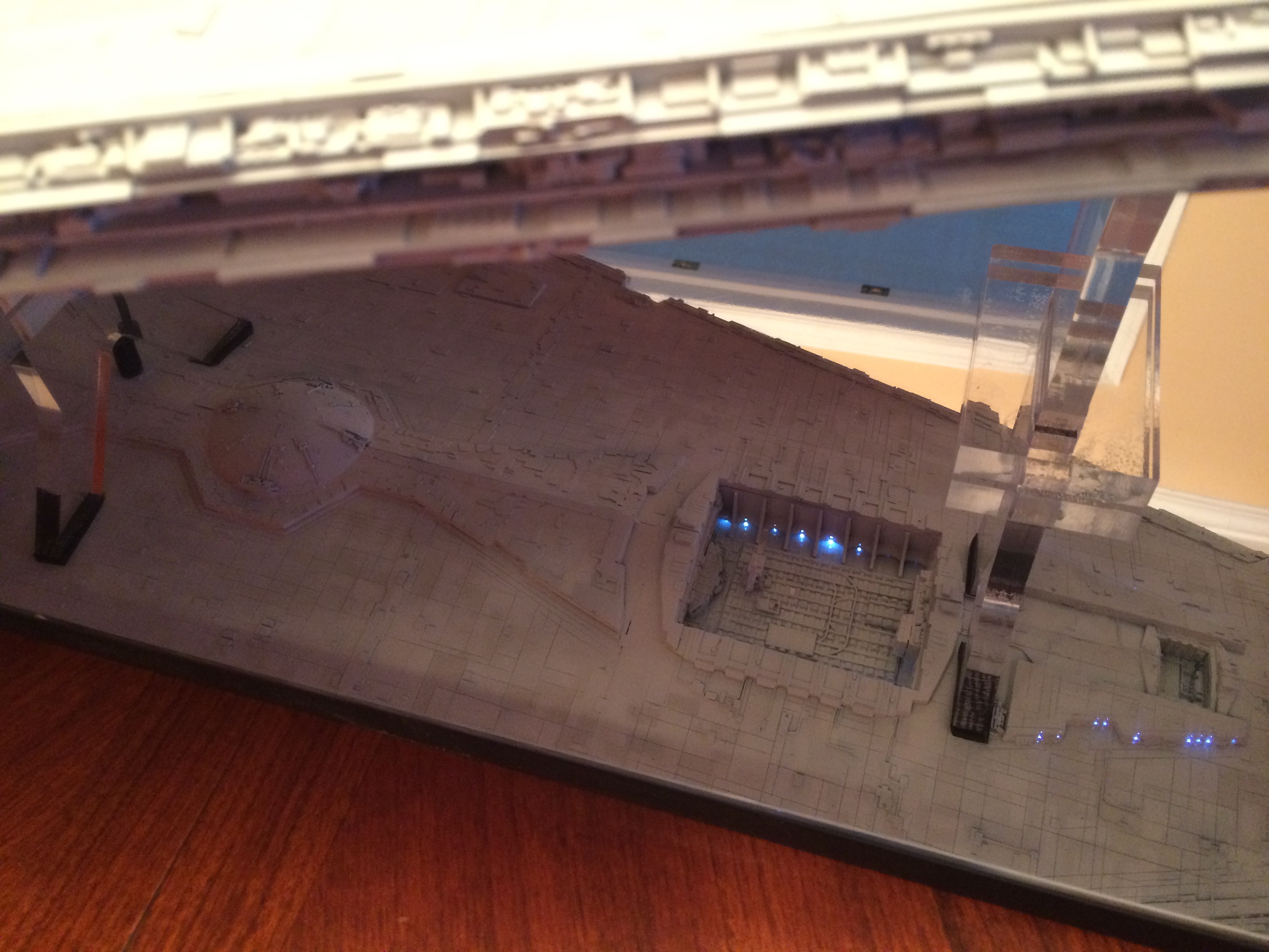 This is the Star destroyer Avenger that is produced by Randy Cooper. The model is definitely not for the beginner. I did make my own interior frame out of 1/2 inch plywood to help support all that resin. It measures about 37” long, has close to a 1000 strands of fiber optics and 20 LED lights inside. I initially painted it black and then airbrushed 4 different shades of white and grey to help give it more dimension without having to do a black wash. The top super structure is removable and held on with magnets in case I need to get back inside. Panels where done with stencils made with frisket. The display stand was made from 1/2 inch clear acrylic for the supports, 1/2 inch MDF for the base and 1/8 inch mirrored acrylic on the bottom. It’s all powered by a 12 volt power supply. Hope you like it.