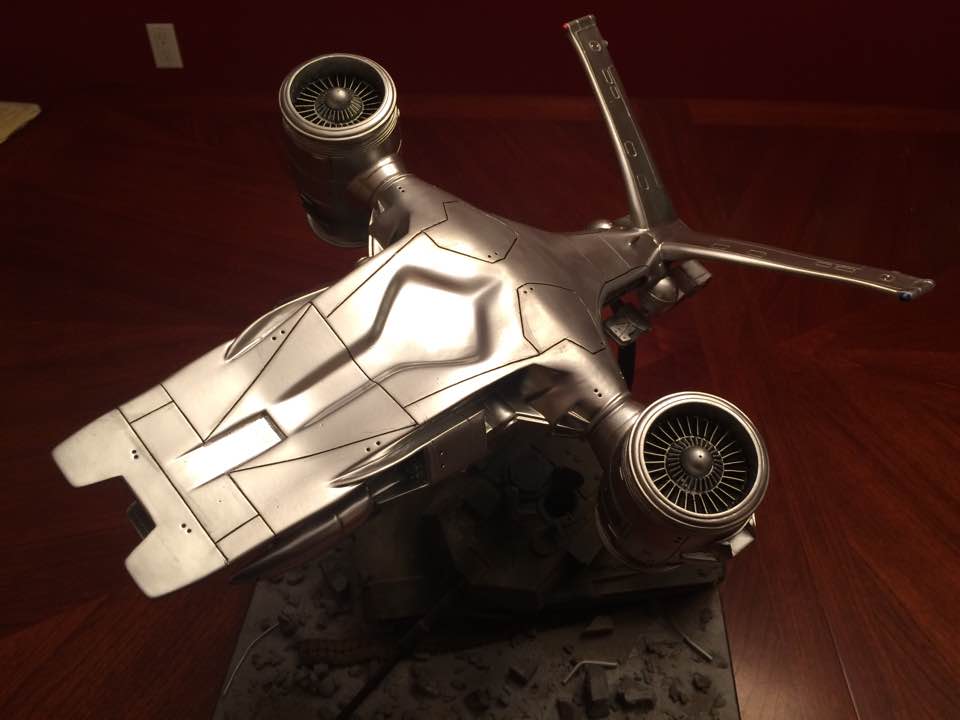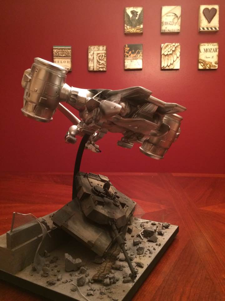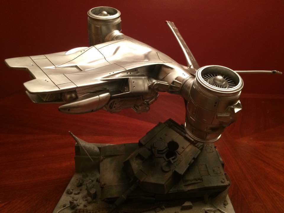 This is Horizons vinyl kit of the “Arial Hunter Killer” from Terminator II. It is stated that this one is 1/35 scale but it’s practically twice the size of the Pegasus kit that’s out there now, so I’m not sure which one is correct. It’s finished with chrome automotive lacquer sprayed over an automotive primer. Fortunately I found that when sprayed in light coats it did not react with the vinyl and turn it into a gooey mess. I mounted it onto a base made of MDF with a wrecked Abrams tank on it. The tank is an old Revell kit weathered with pastels and a little airbrushing. The kit didn’t provide and kind of stand so its entirely up to the builder on how to display it. All in all a fun kit to assemble while still providing a little challenge on the finishing. Hope you like it.