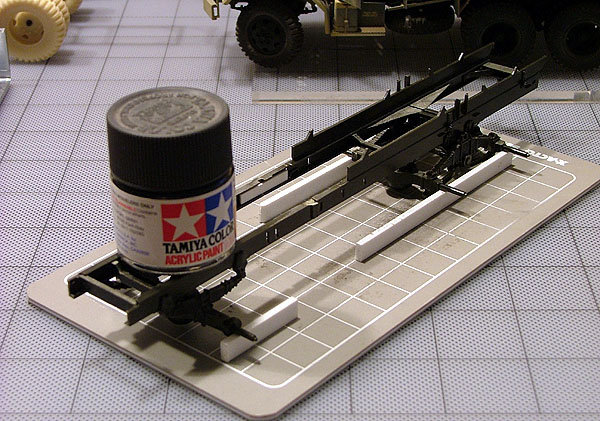 The are six photos showing the nitty-gritty of the gun truck conversion. I do conversions on both the AFV Club 2 1/2-ton Cargo Truck and Italeri 5-ton Cargo Truck model kits. I don’t have a preference with one over the other, but admit I like AFV Club’s parts and detail far more than Italeri’s. In modeling any wheeled AFV, I always start out with a grid sheet onto which I draw the truck’s critical measurements. This is the workbench that I build the model upon. It is critical for a 5-ton truck conversion because it has odd features that create a characteristic stance and if you don’t get it right, nothing else does on the miniature’s profile. A lot of gun truck conversions and miniatures fall short here. The M54 is a 11-12% scale-up of many of the sheet metal parts in the M35 2 1/2-ton cargo truck – the modelers make the mistake of thinking that you can use straight AFV Club parts for the conversion, unfortunately. Real Model, out of Europe, retails an incredibly expensive resin truck now – but the designer is an arrogant ass and can’t accept the fact that he’s made the same mistakes in basic research and design. $200 dollars plus is a whole lot of jack to spend on a resin kit that is inaccurate right out the gate…
