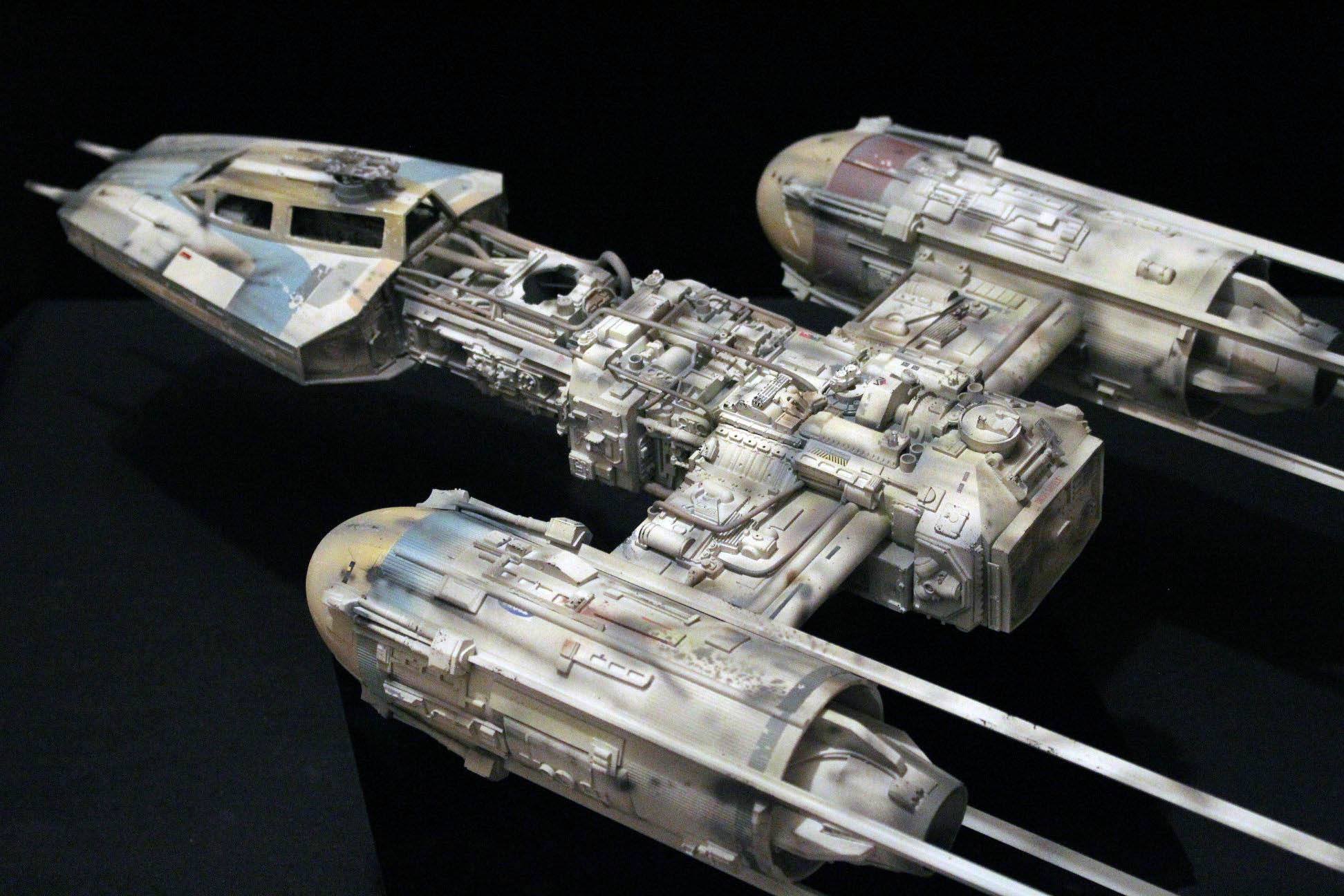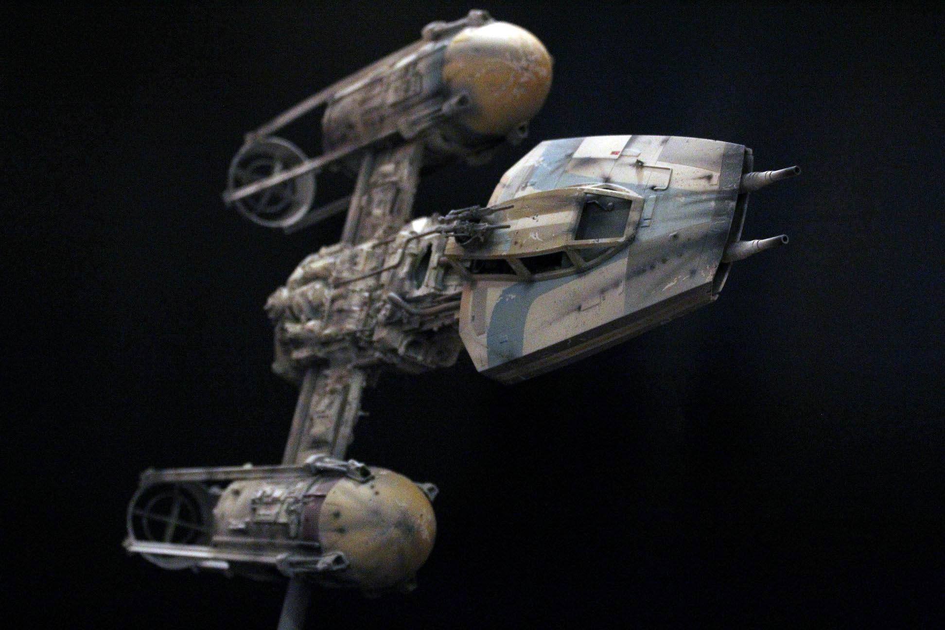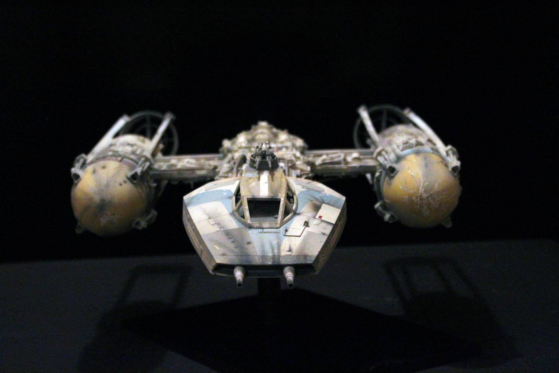 This is mixed media, one of a kind 1/24 Y-wing. The armature and cockpit were from Dave G’s open source files from the RPF. The engine fronts (the Eggs) were 3D printed by Nicholas Sagan. The greeblies were all 70’s era model kit parts either from resin or styrene. It isn’t 100% accurate to any of the studio scale original models, so I thought I’d add my own greeblies, pipe work, and paint job using archive X paints.