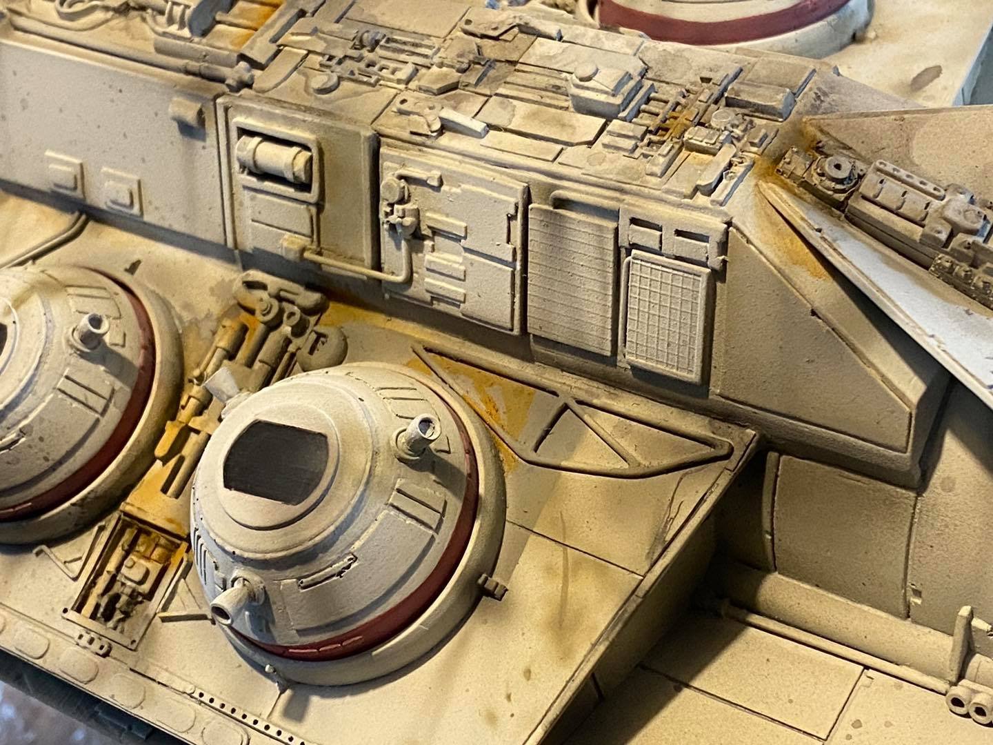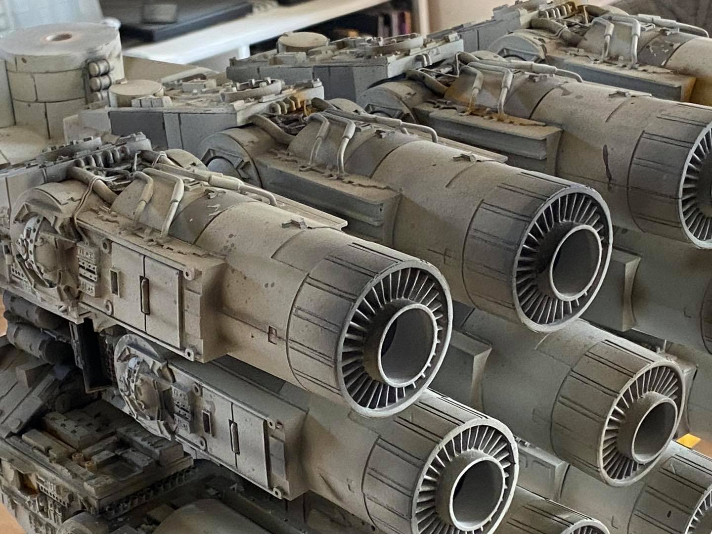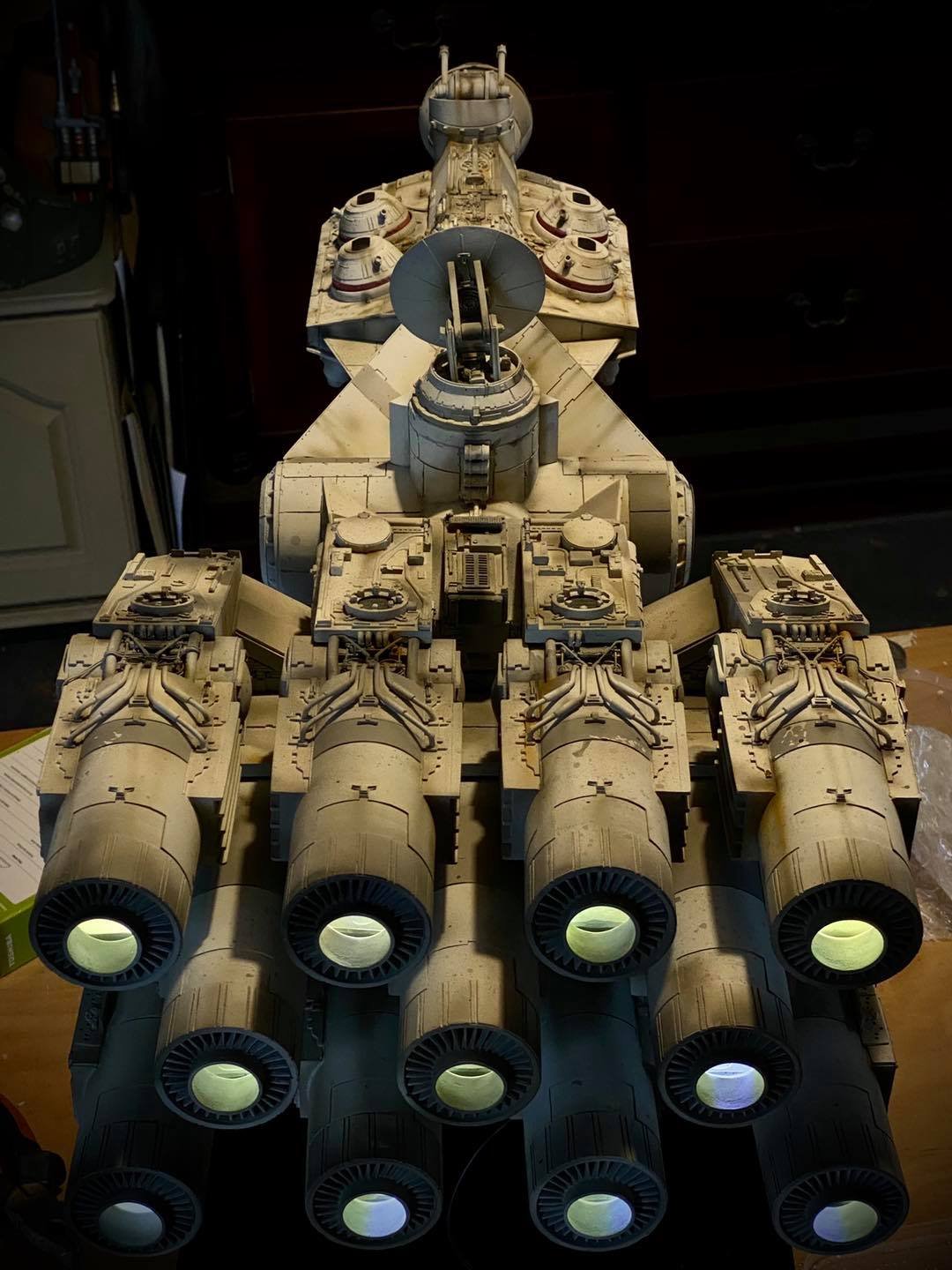 We are pretty much done with the 1/144 41” Blockade Runner dressed up as the ‘Pirate Ship’, which was the original design for the Millennium Falcon before Space 1999 got in the way lol. John Stuart (Jaitea) built the model for me from the Korbanth 1/144 Blockade Runner Kit, scratch building what was needed to change it into the “Pirate Ship Concept”, and then I finished it in Archive X paints.